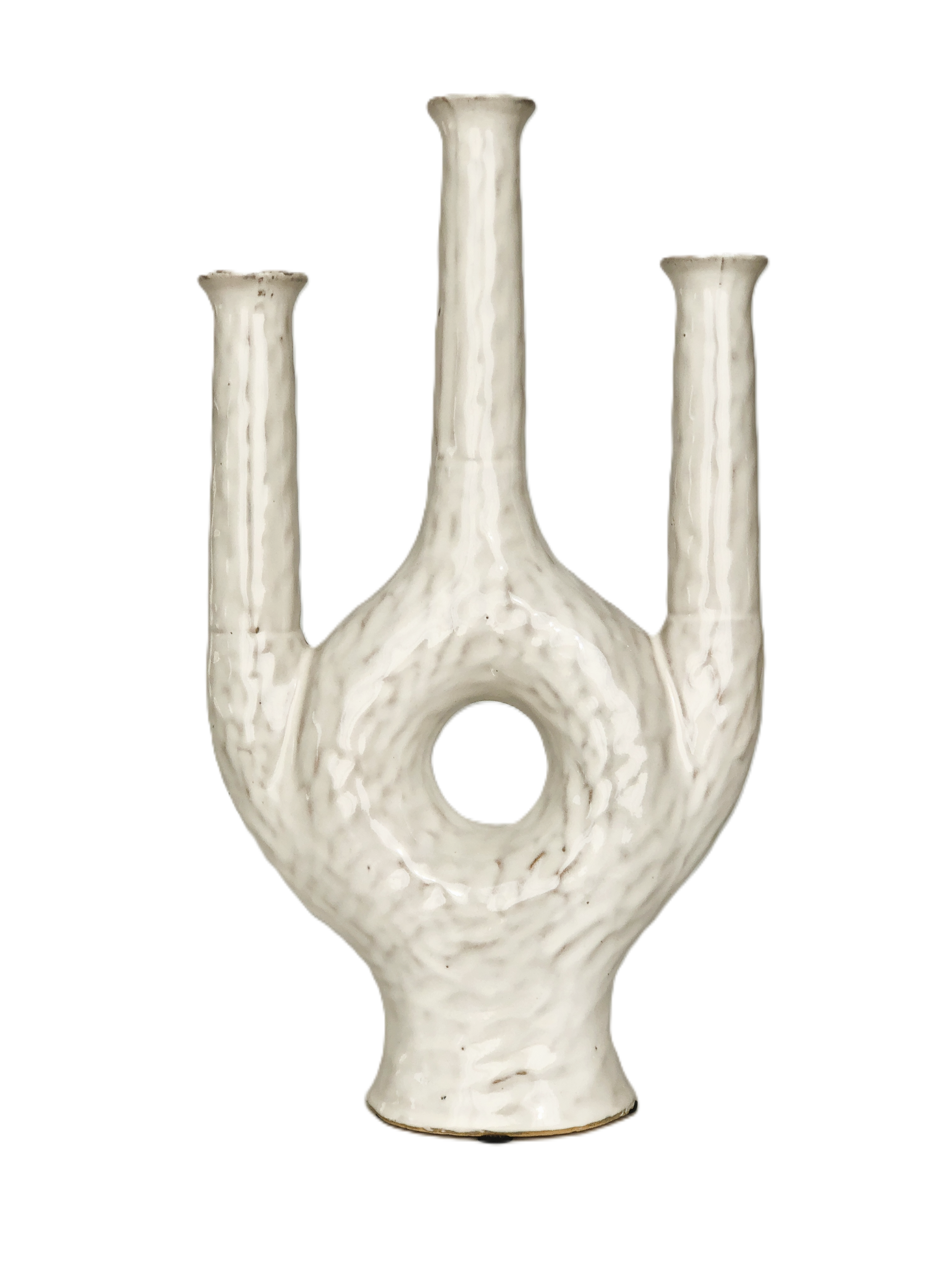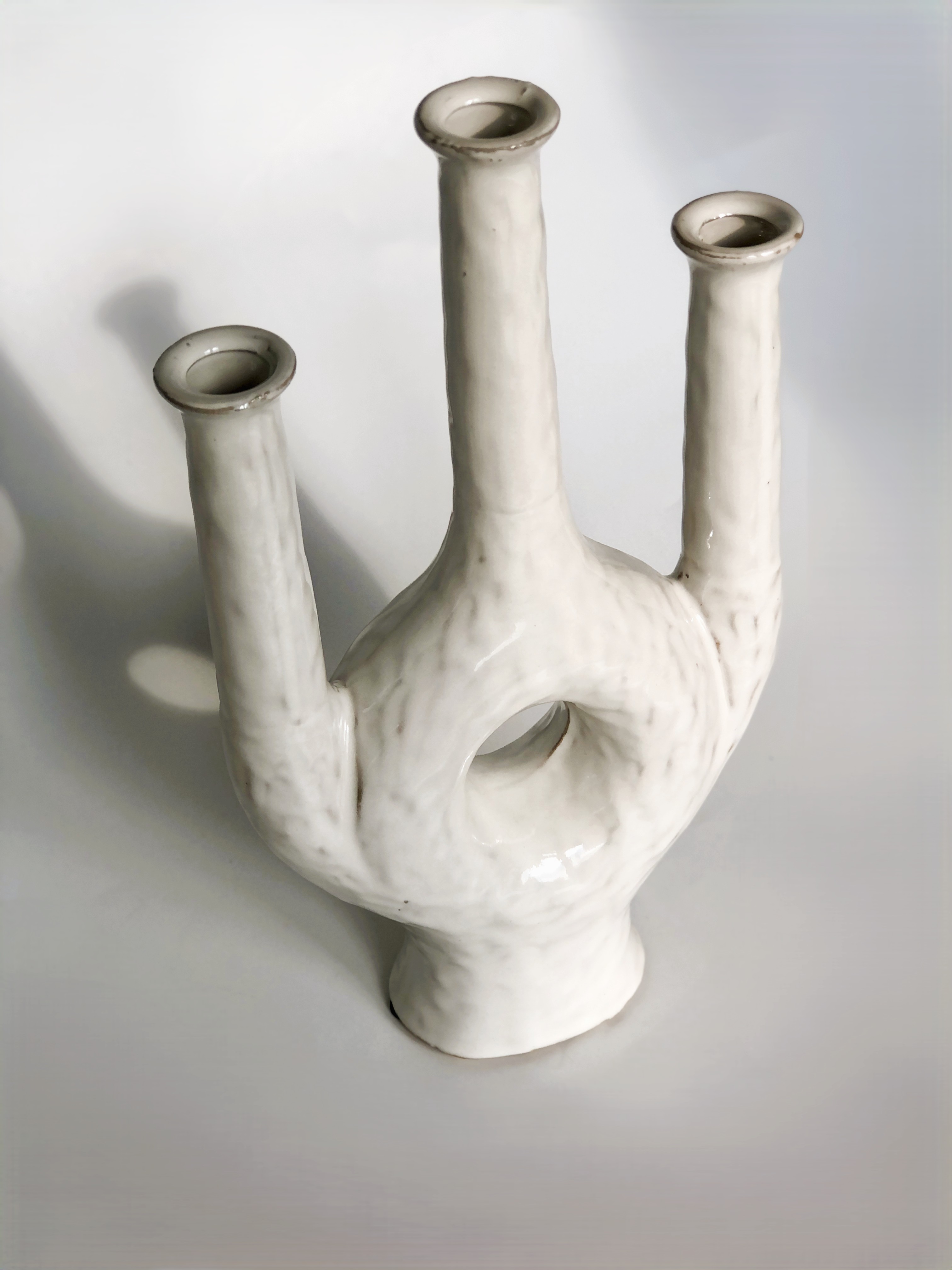 Wazon o oryginalnej formie, z wysokiej jakości ceramiki, ręcznie formowany i szkliwiony w odcieniu ciepłej bieli.