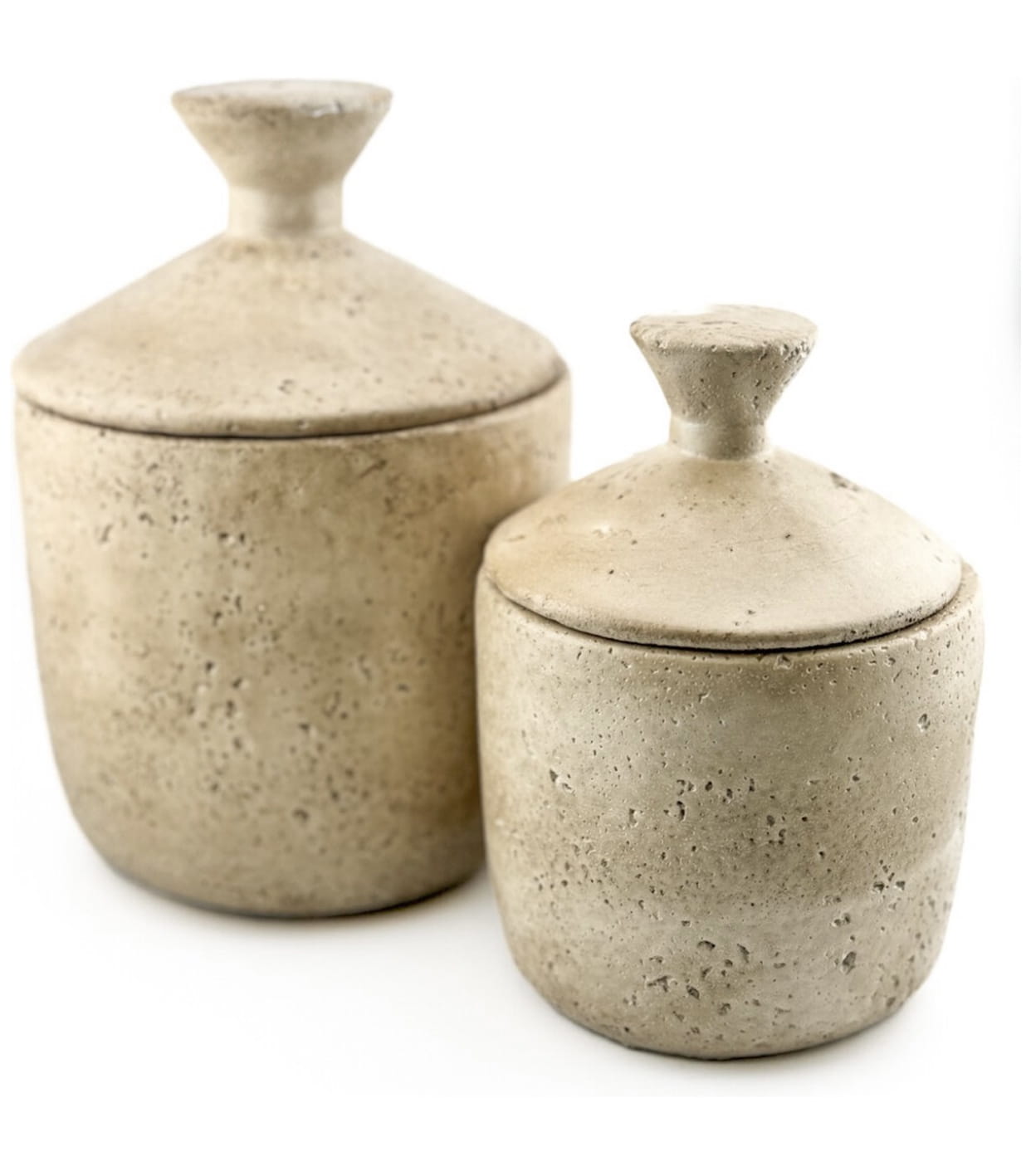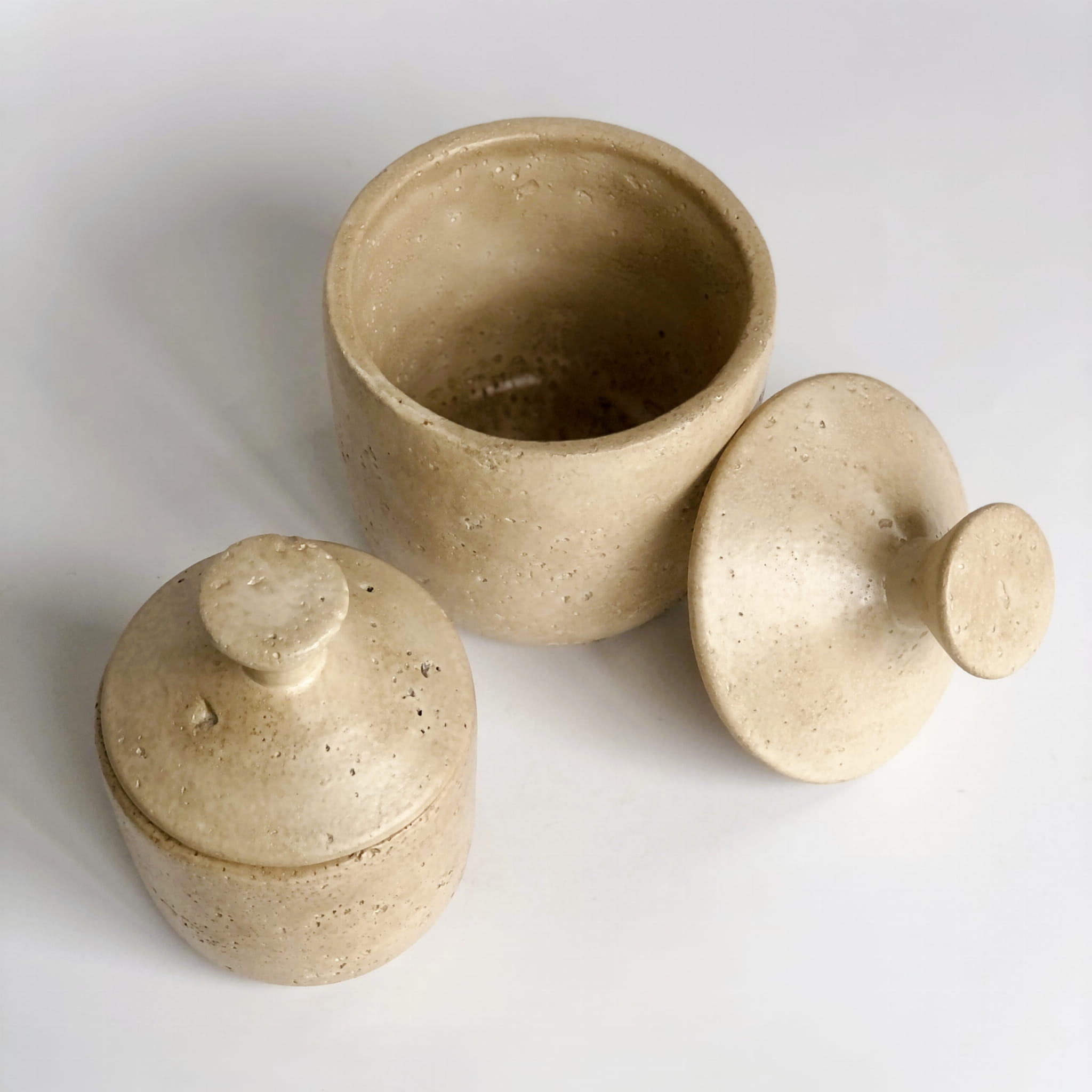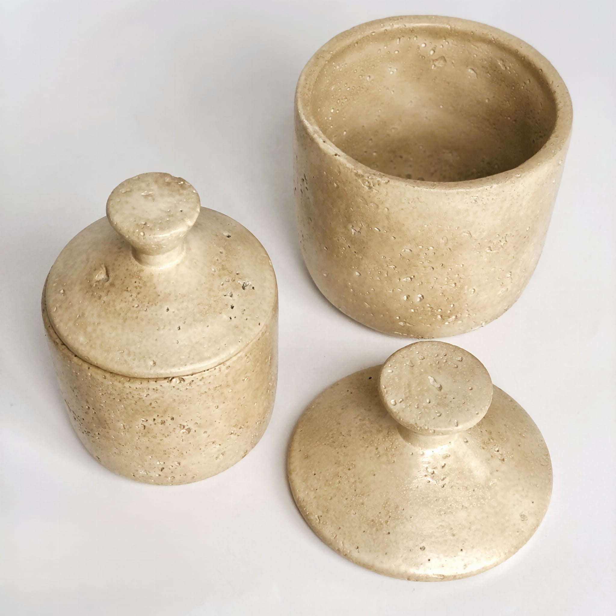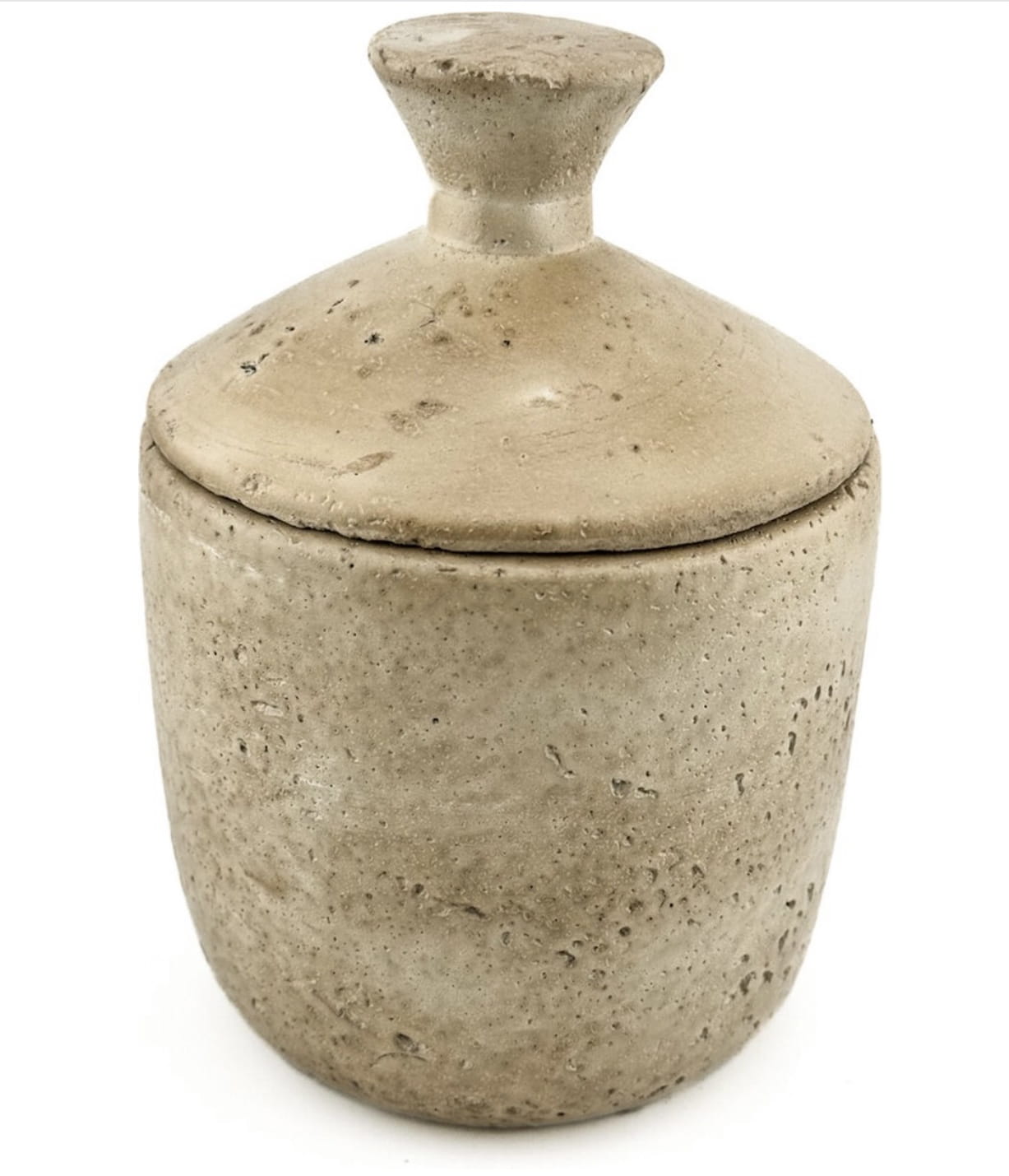 Pojemnik o niepowtarzalnym wyglądzie kamiennego naczynia z porowatą powierzchnią, naturalnymi wżerami i nieregularną fakturą.