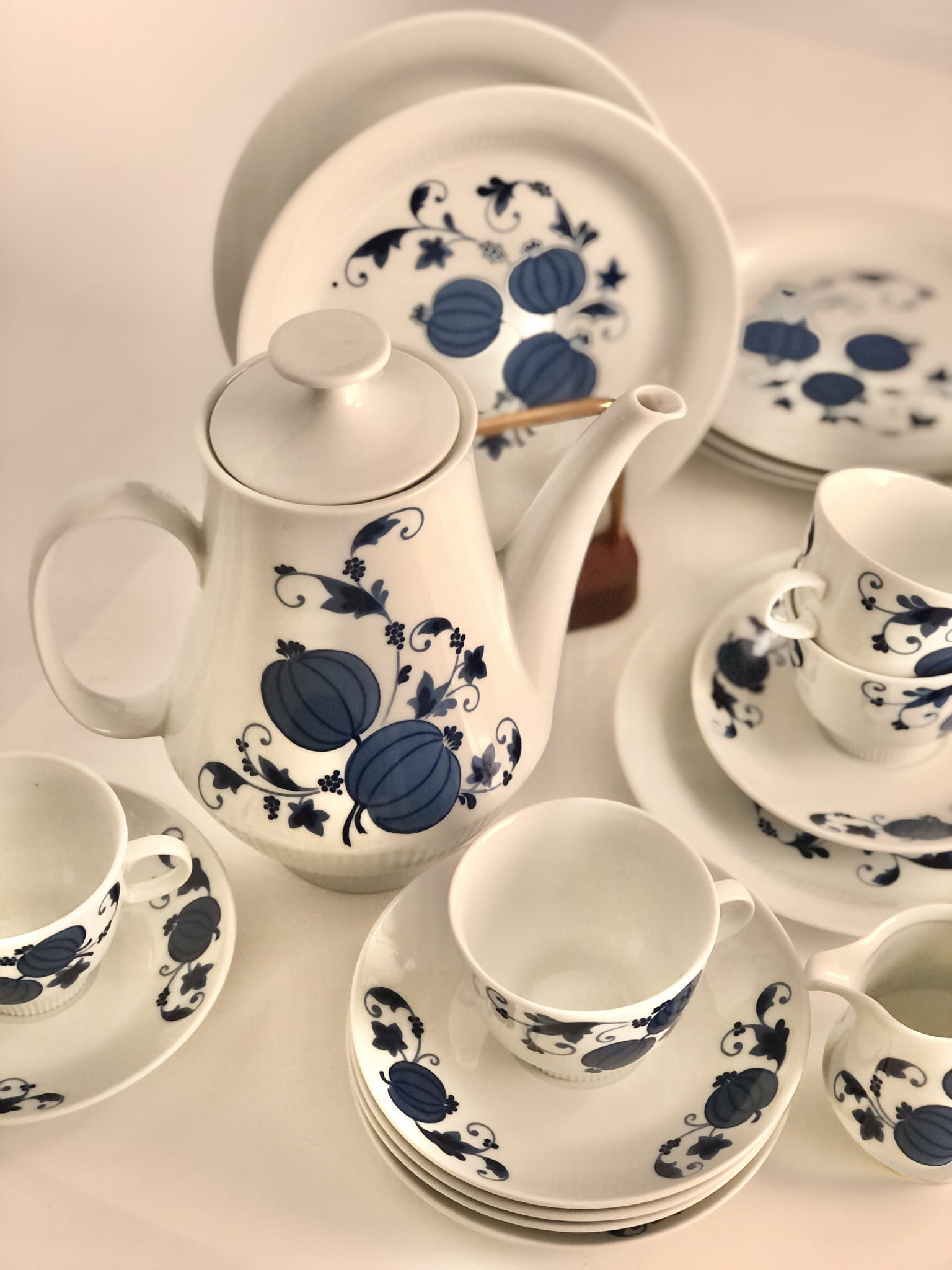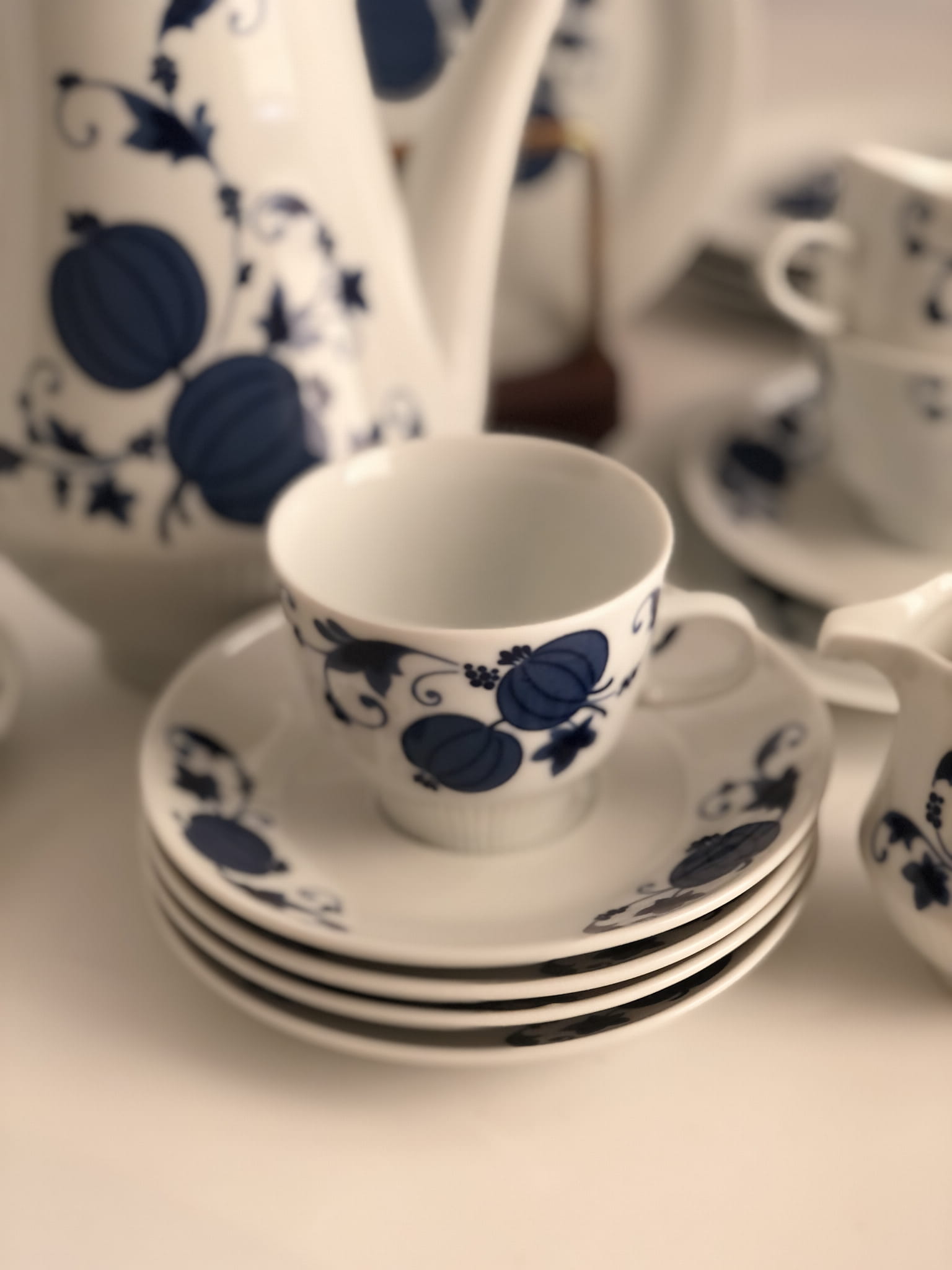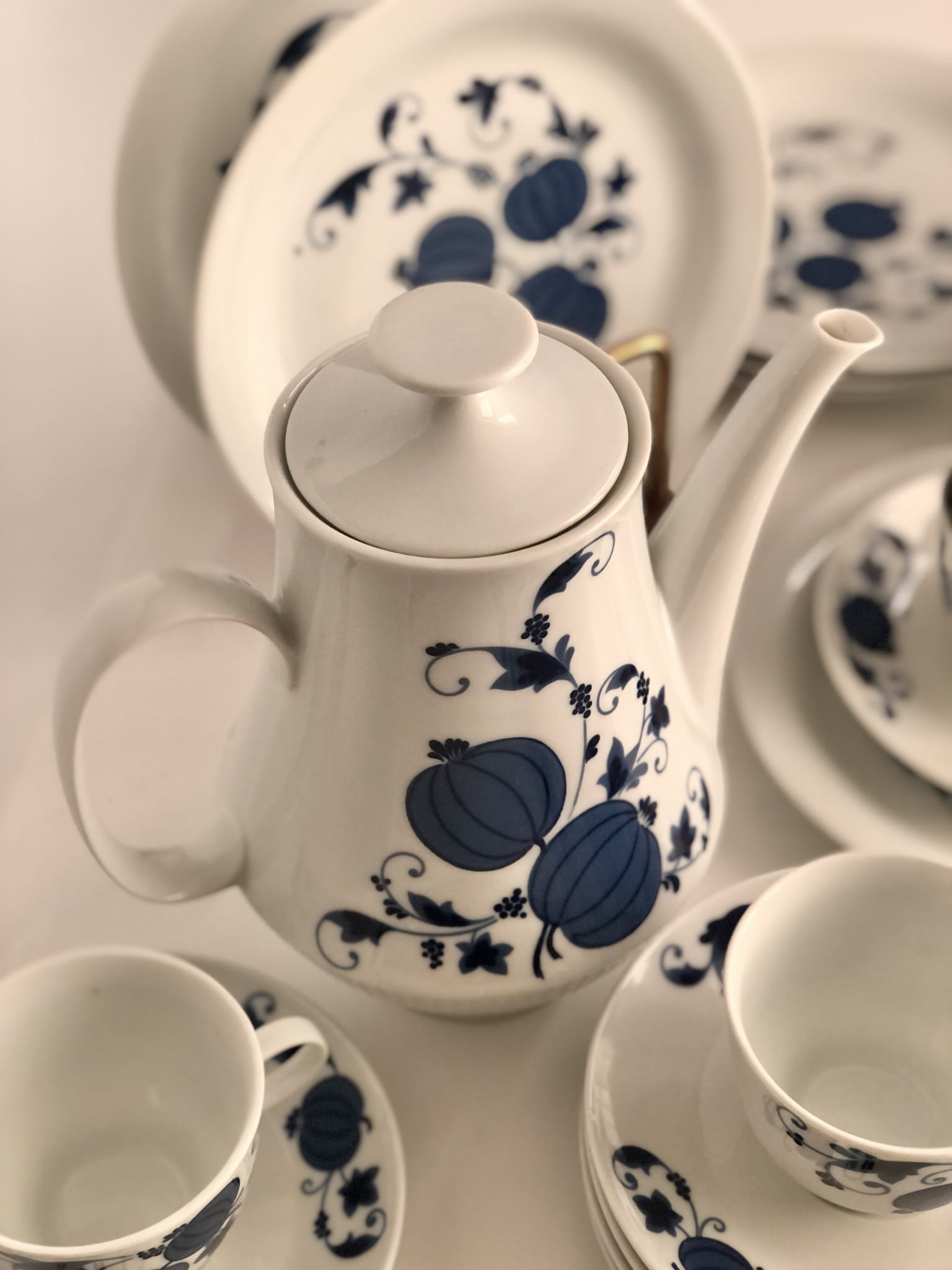 Uroczy zestaw do kawy lub herbaty w niebieskie zdobienia, powstał w zakładach porcelany Colditz w latach 70, XX w.