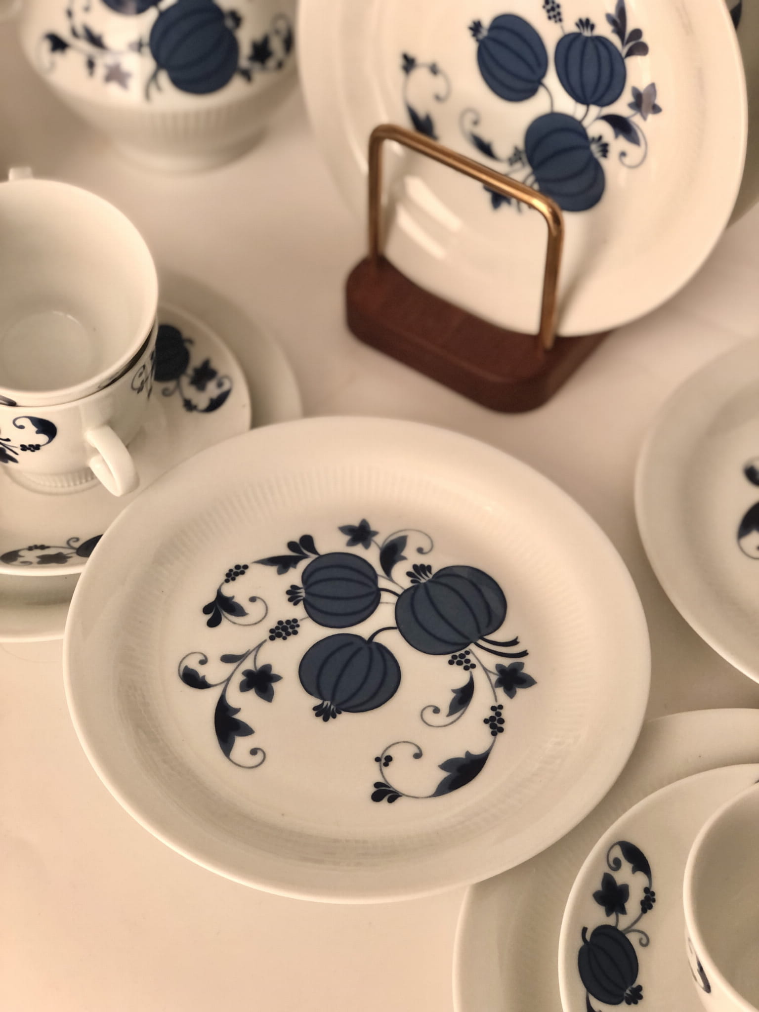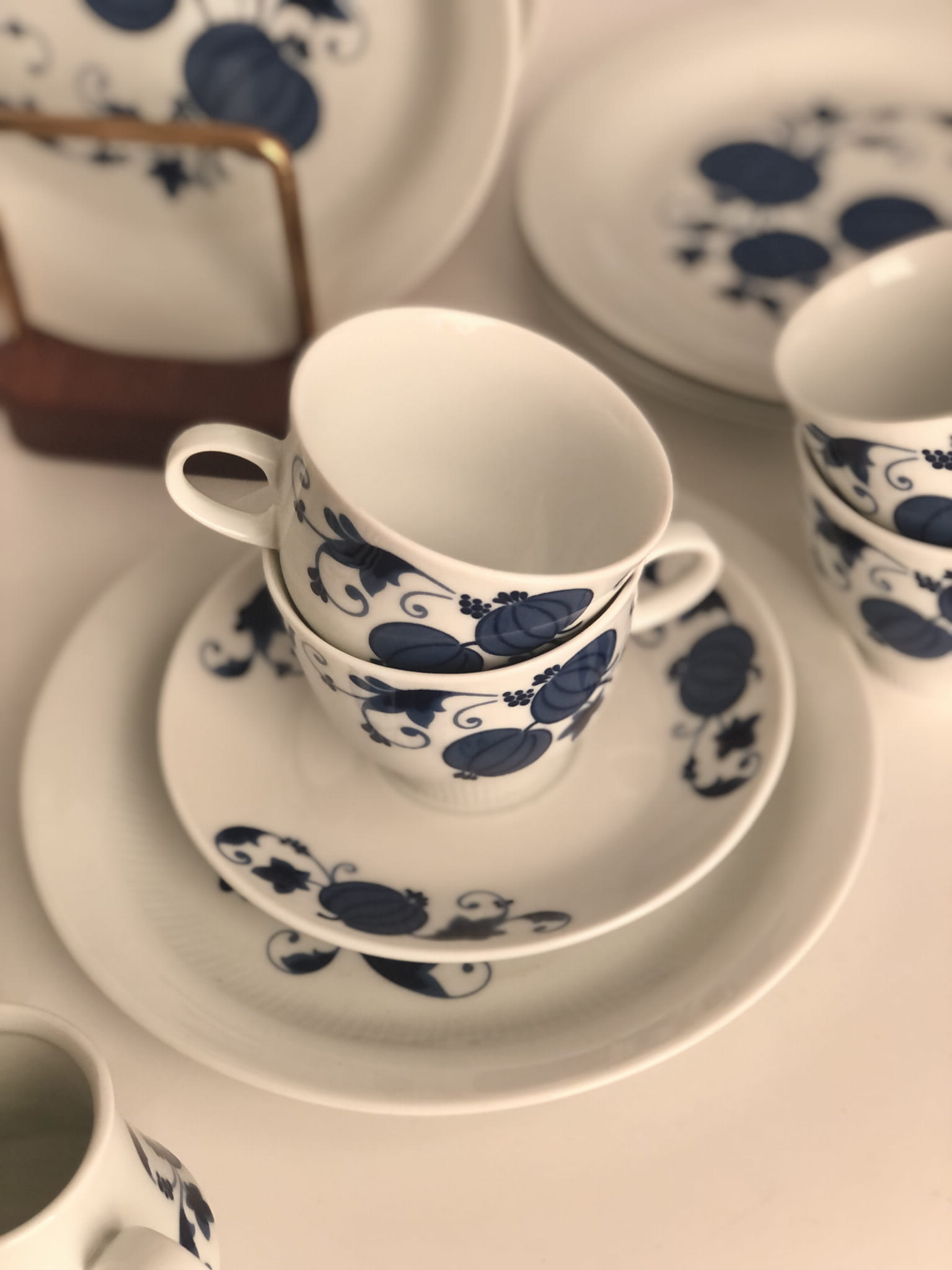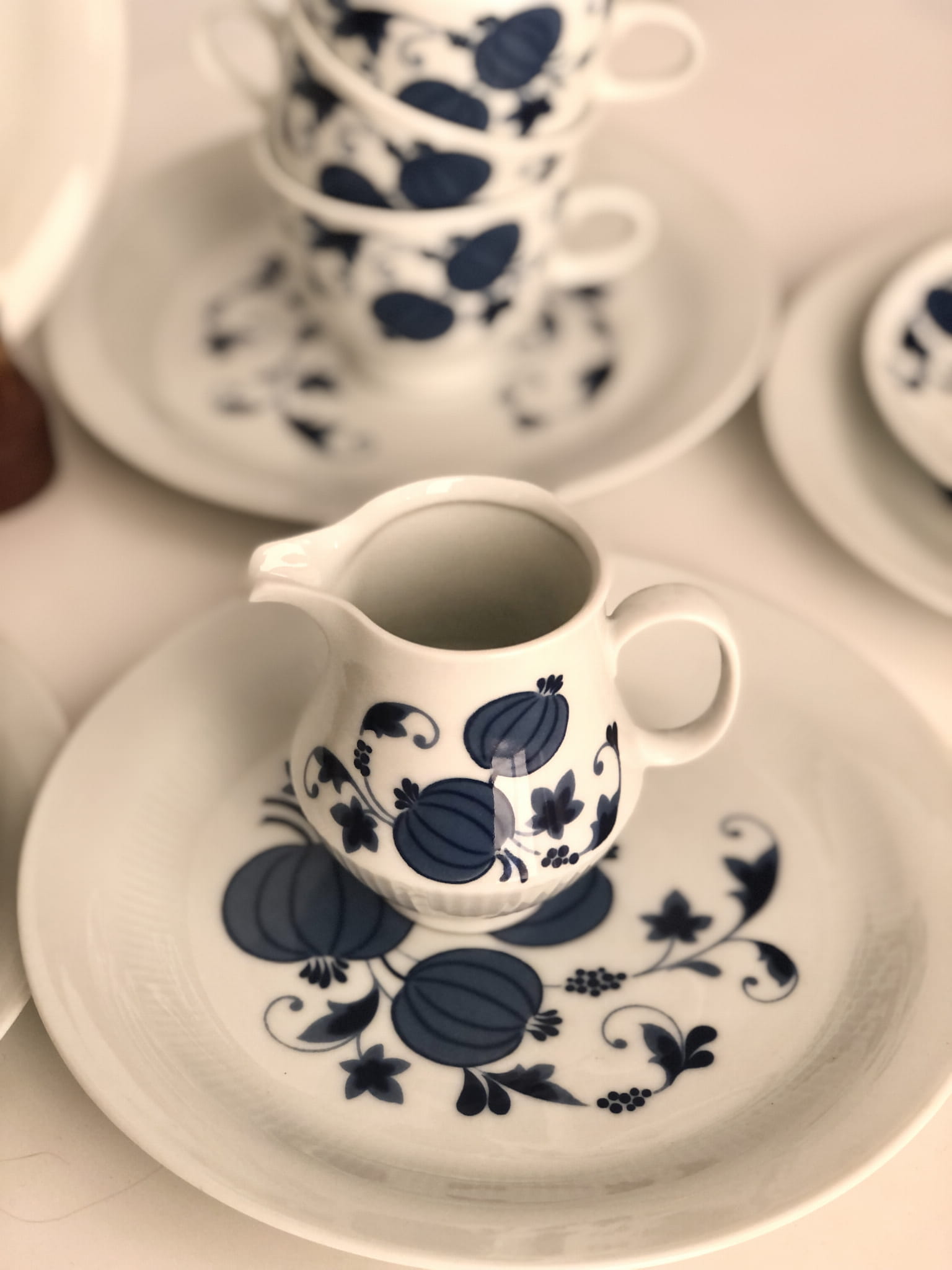 Uroczy zestaw do kawy lub herbaty w niebieskie zdobienia, powstał w zakładach porcelany Colditz w latach 70, XX w.