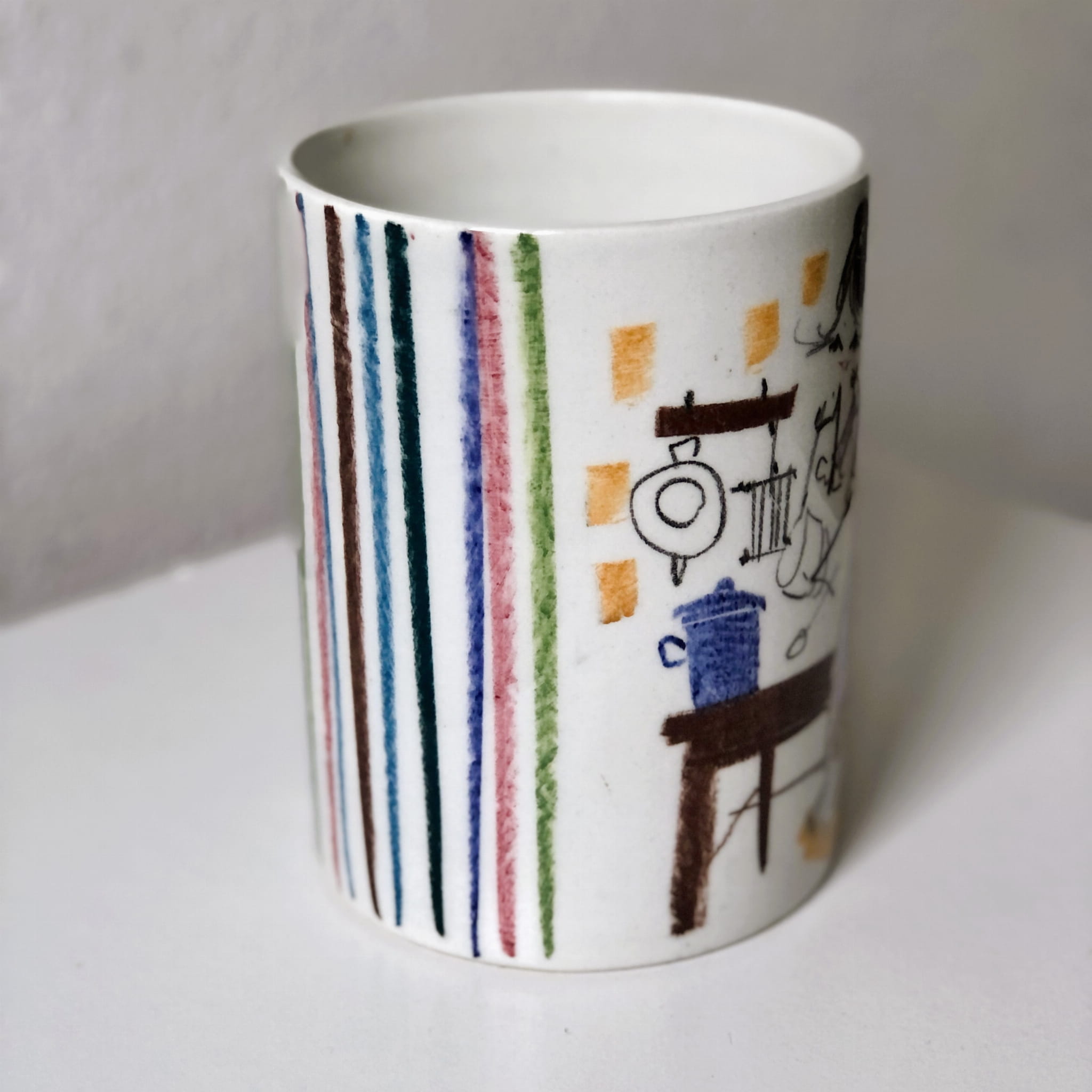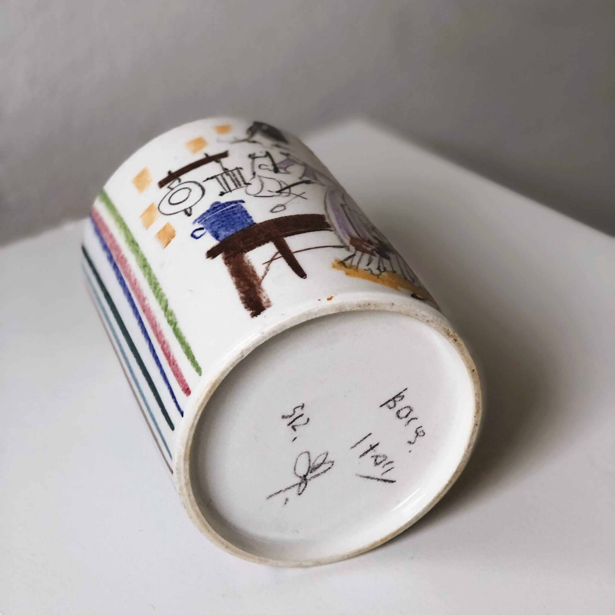 Włoska ceramika Melvia Sharps dla Quadrifoglio to charakterystyczna, artystyczna produkcja z lat 60.–80. XX wieku, rozpoznawalna właśnie po „kredkowym”, szkicowym stylu ilustracji.