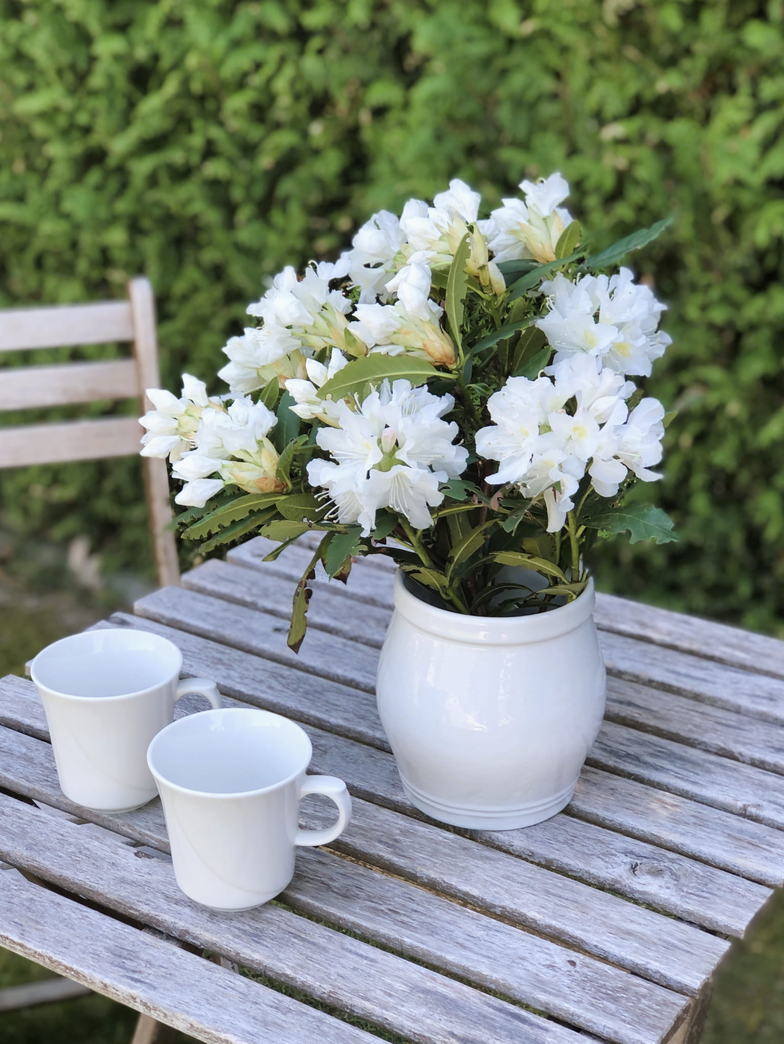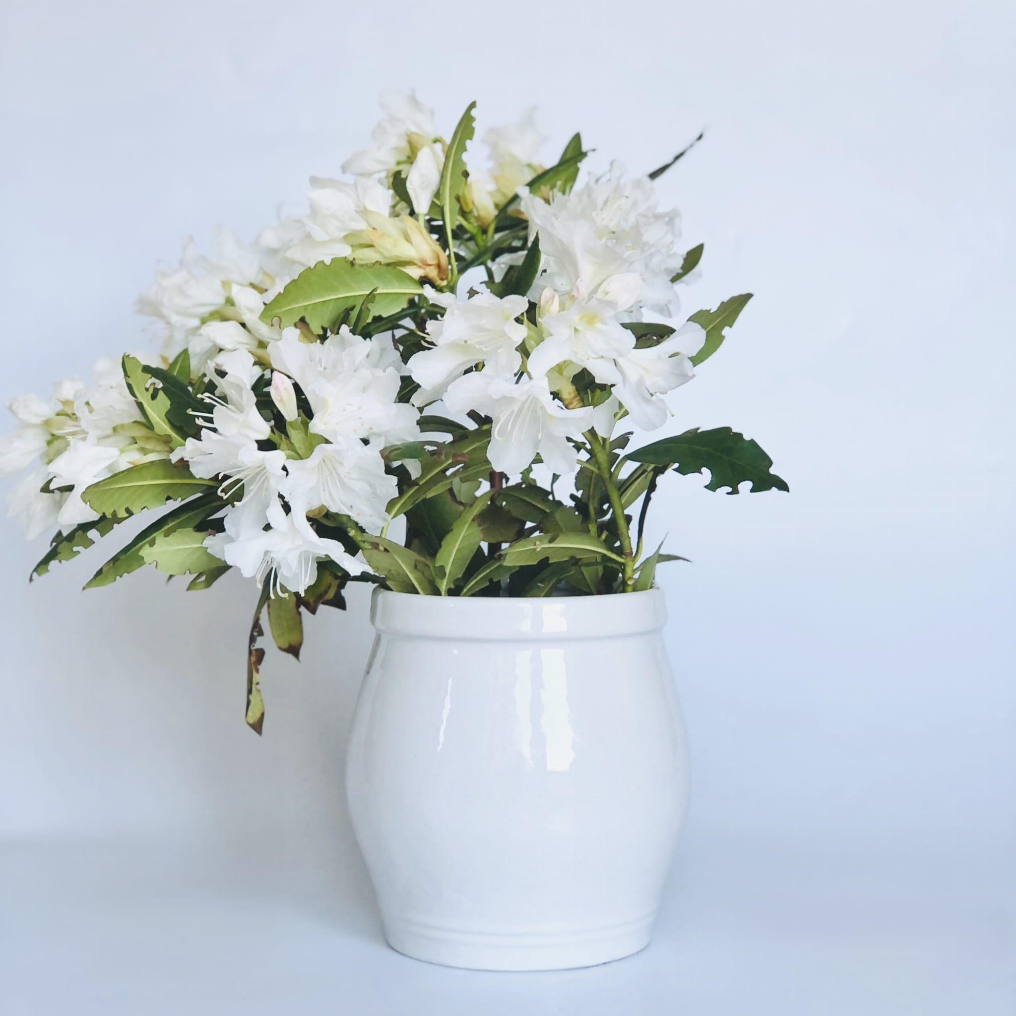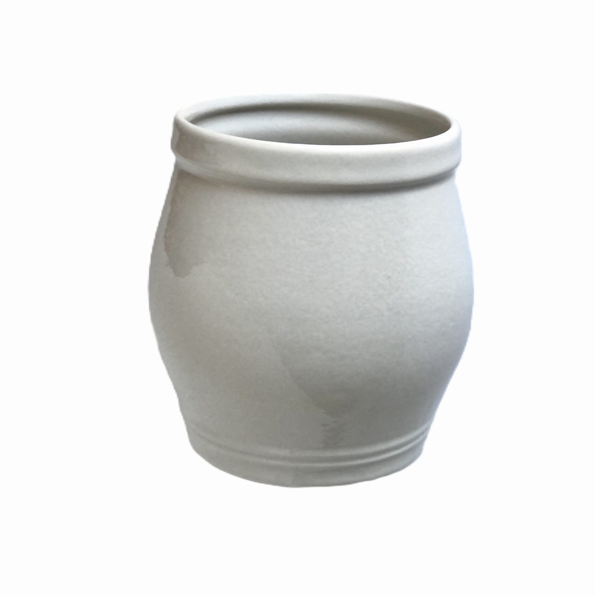 Naczynie wykonany z kamionki, szkliwione w kolorze bieli. Naczynie może posłużyć jako donica, wazon lub pojemnik do przechowywania.