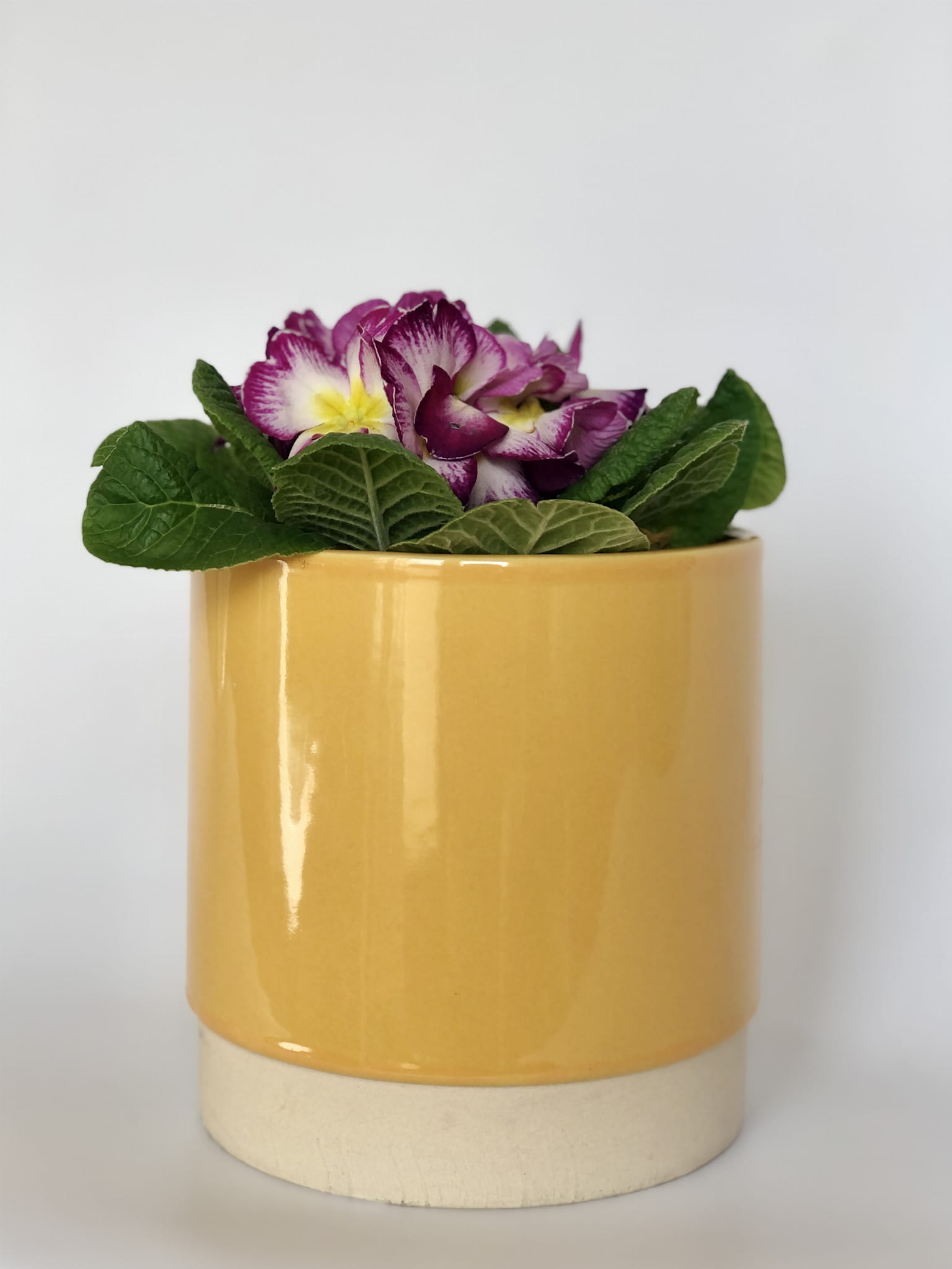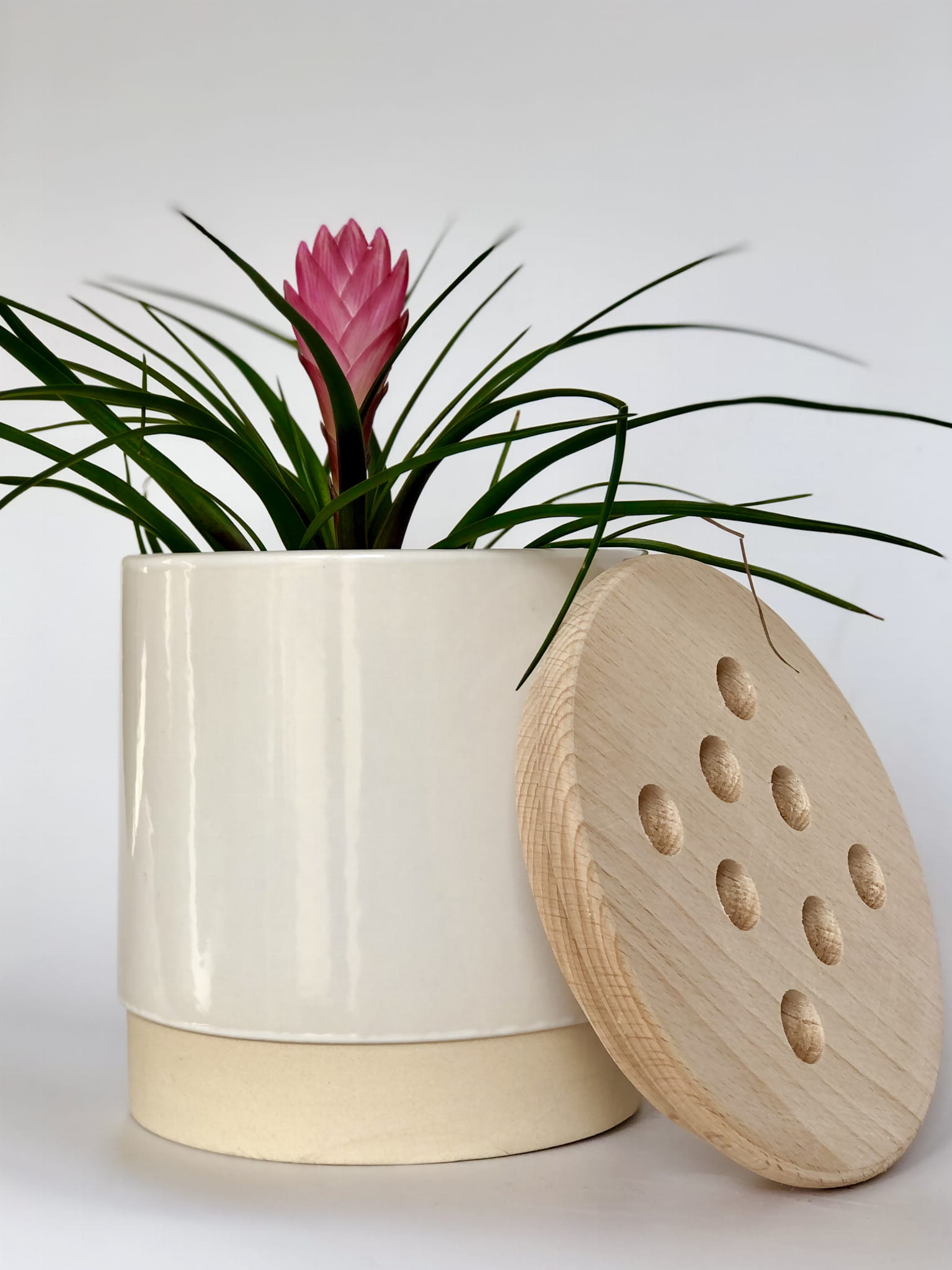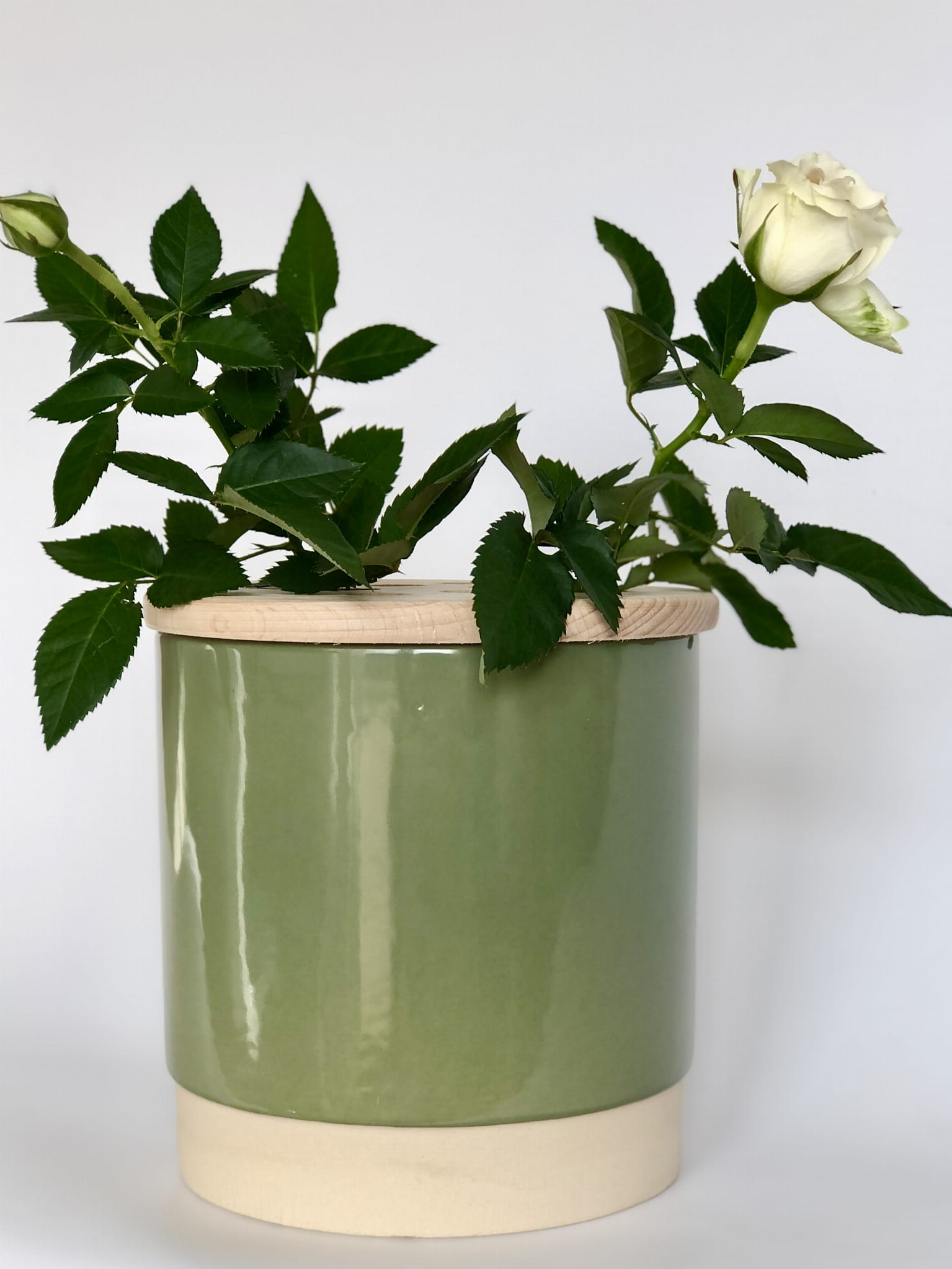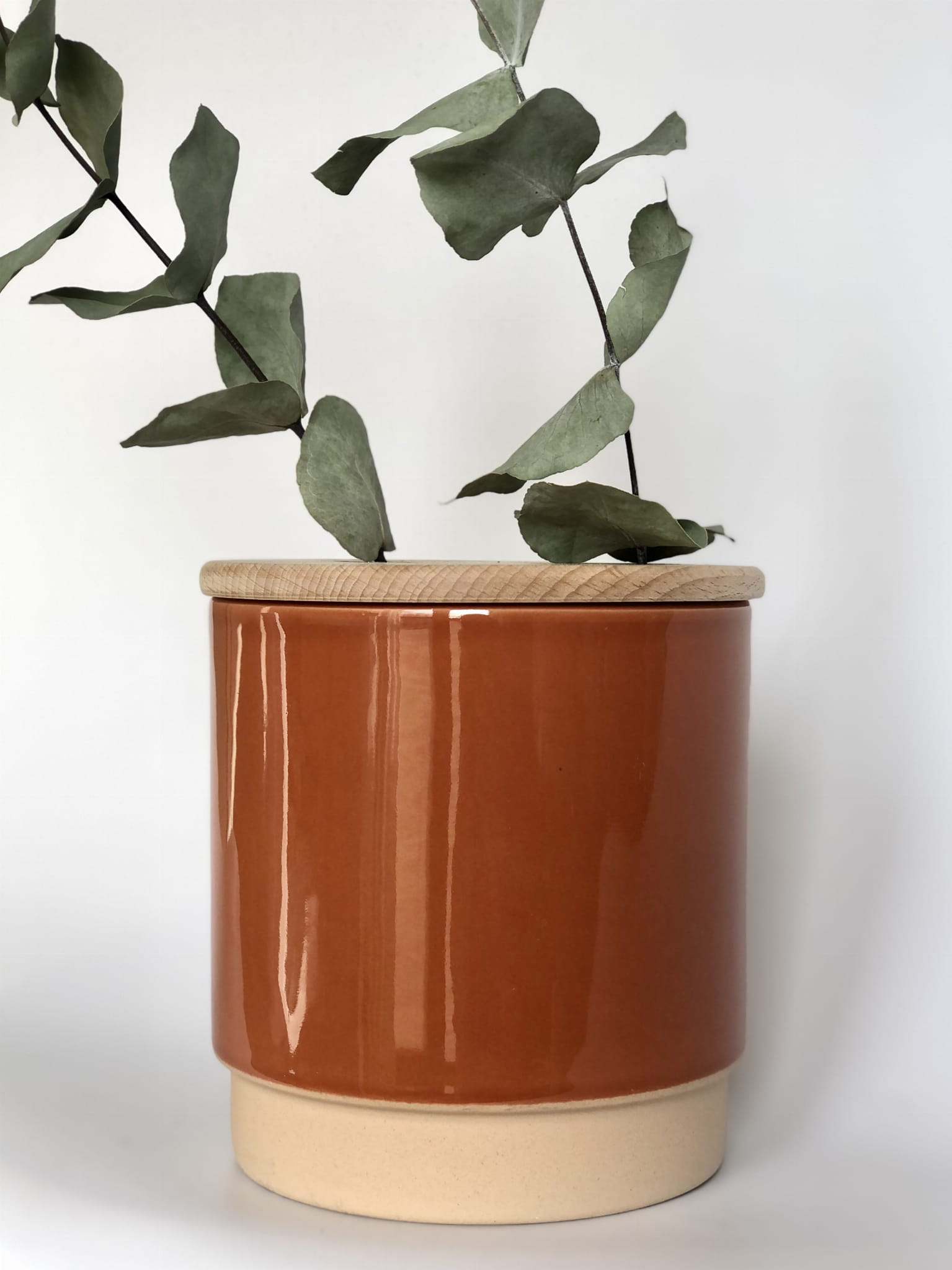 Ceramiczna i szkliwiona osłonka Eno w trzech kolorach z drewnianym wieczkiem.