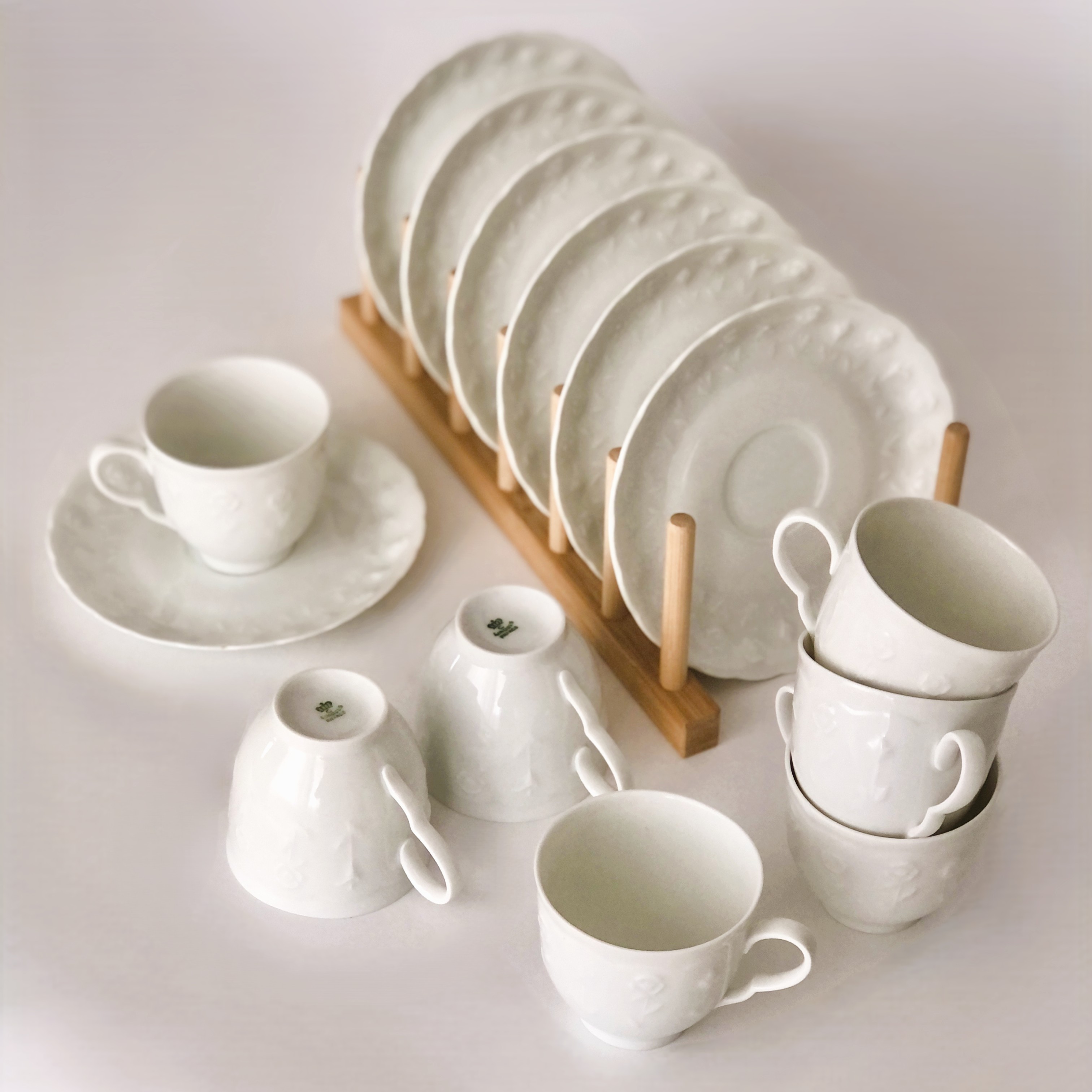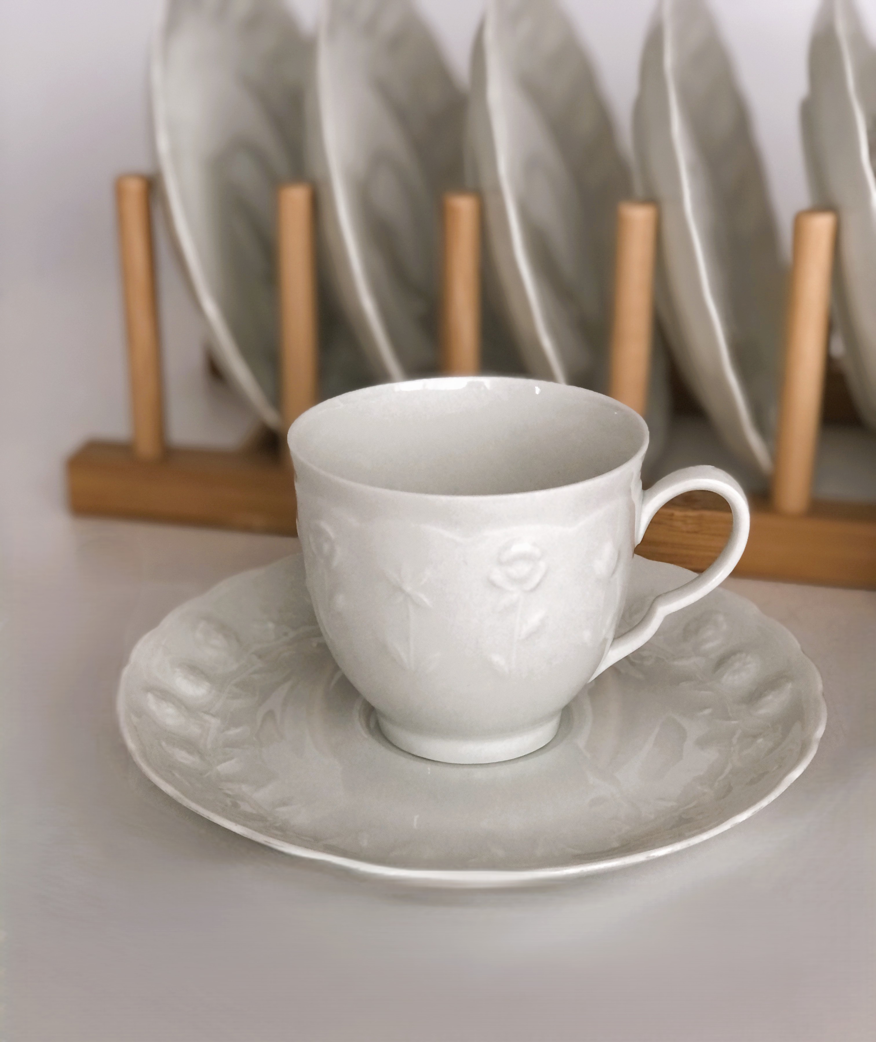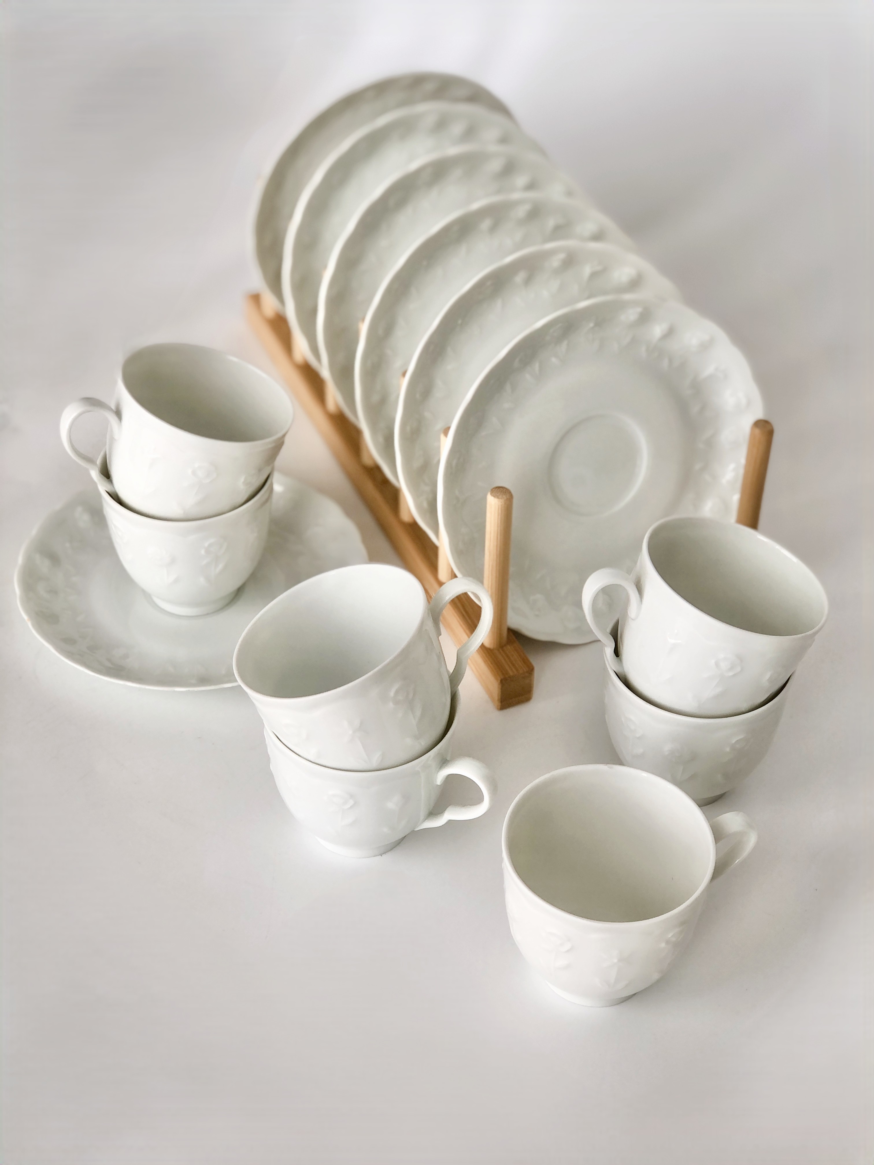 Zestaw małych, filigranowych filiżanek ze spodkami, wykonany ze śnieżnobiałej porcelany, zdobiony w minimalistyczny motyw delikatnych kwiatów.