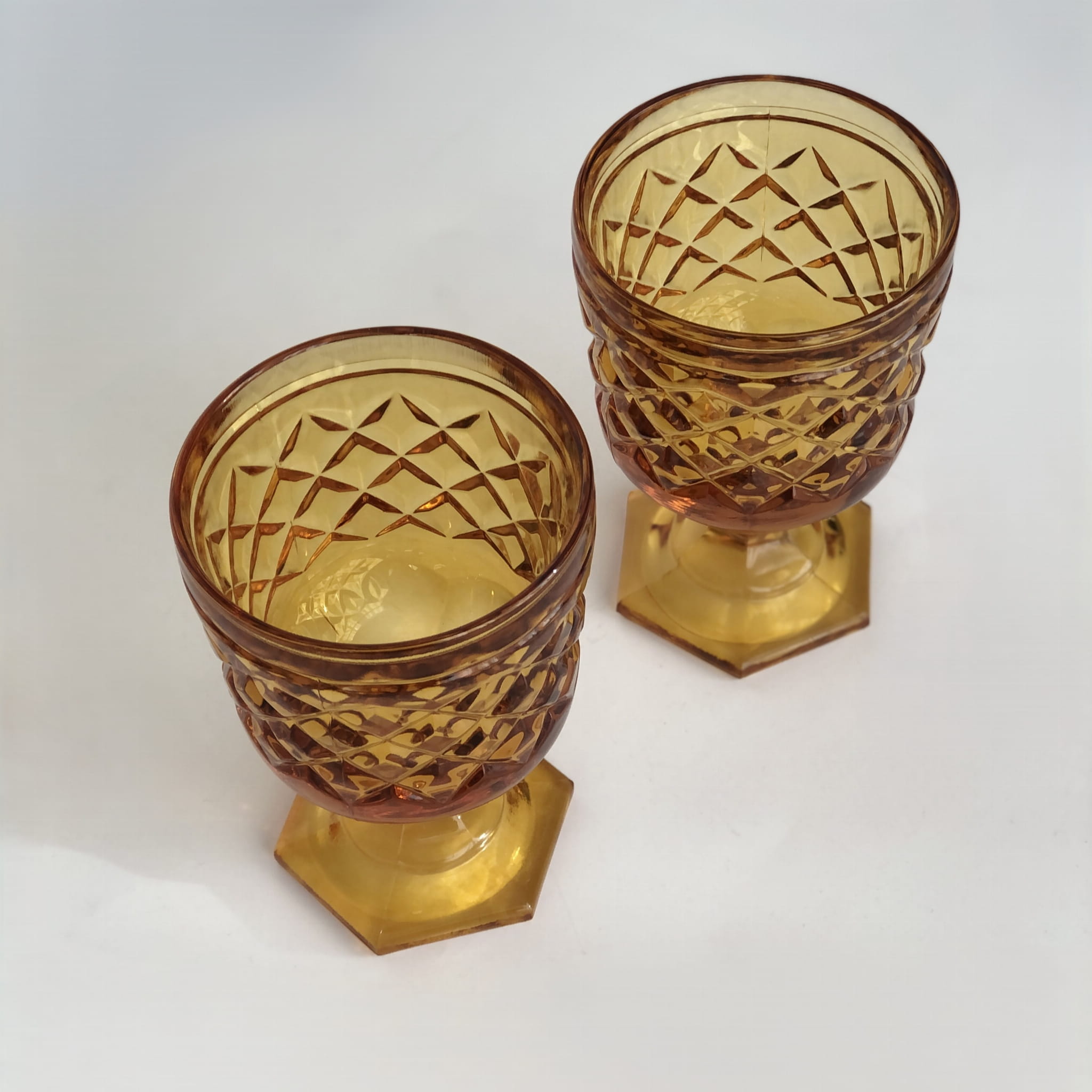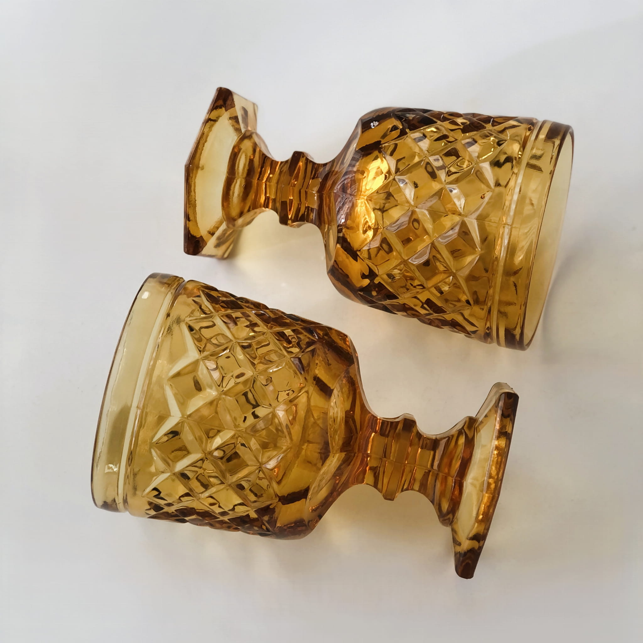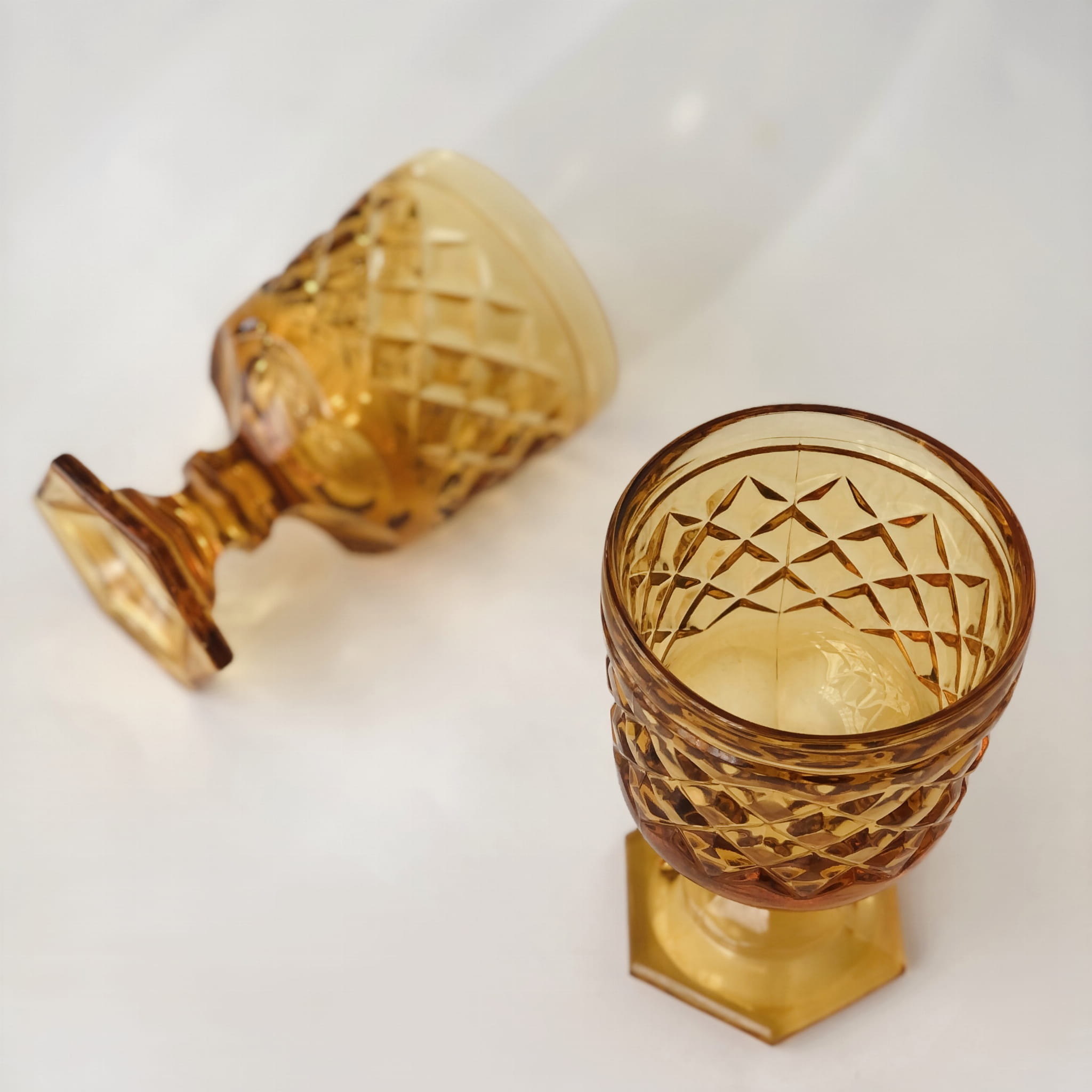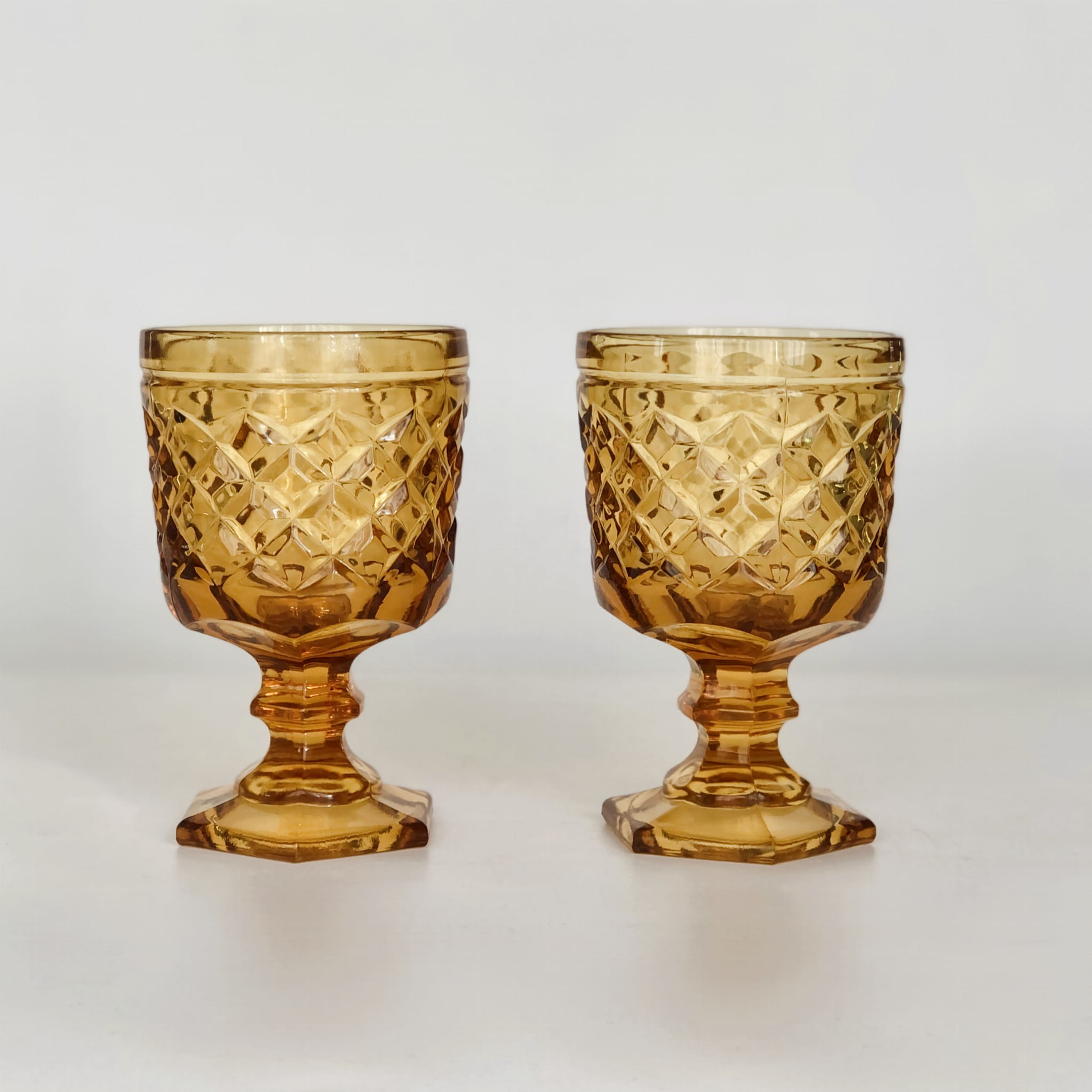 Te bursztynowe kielichy na sześciokątnej podstawie z Indiana Glass odzwierciedlają ponadczasową elegancję szkła vintage.