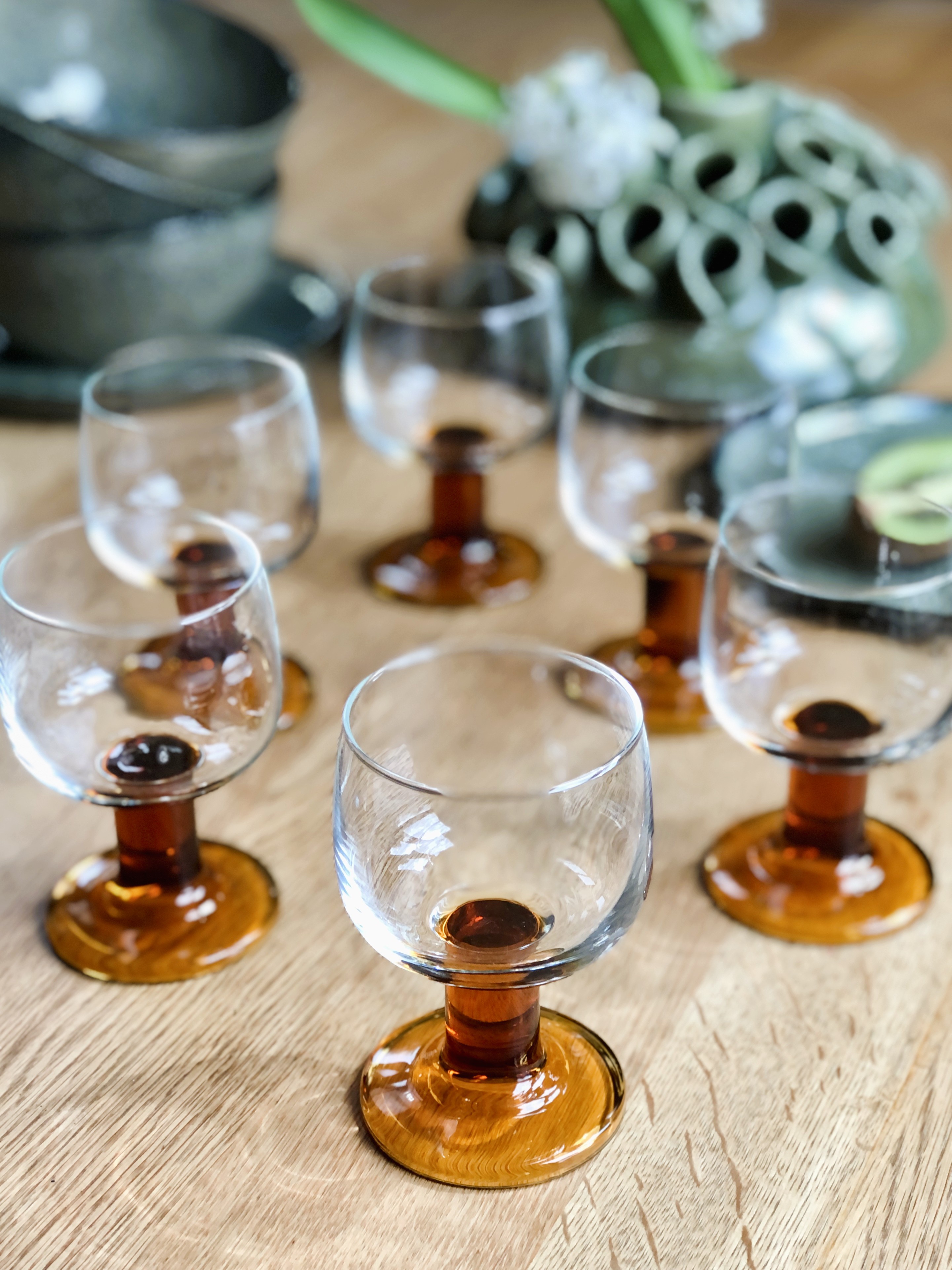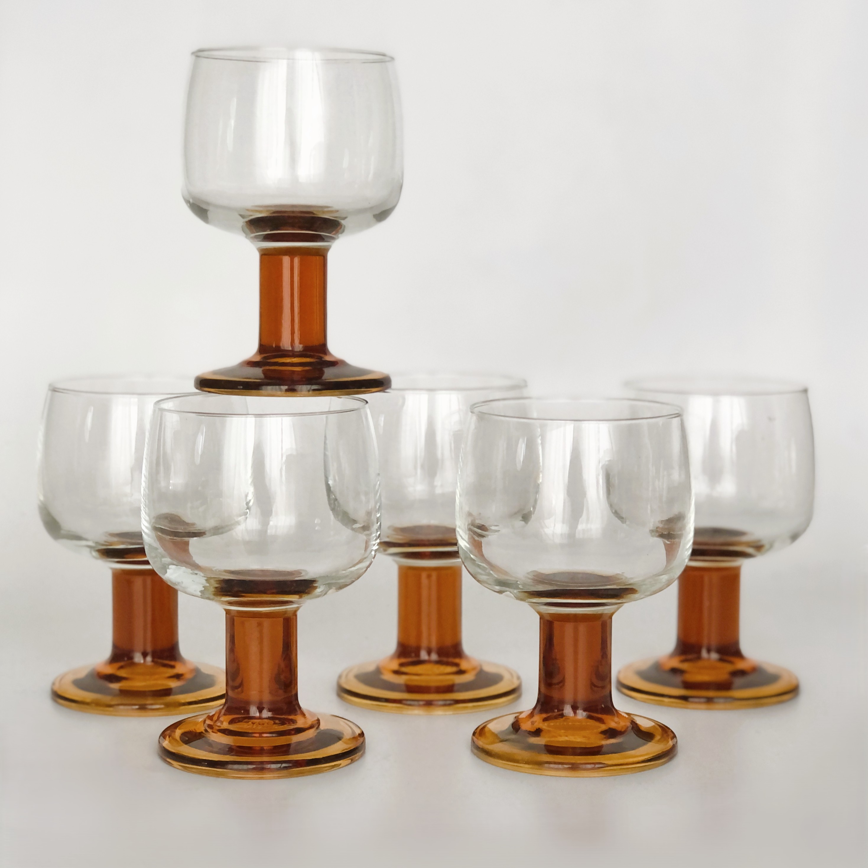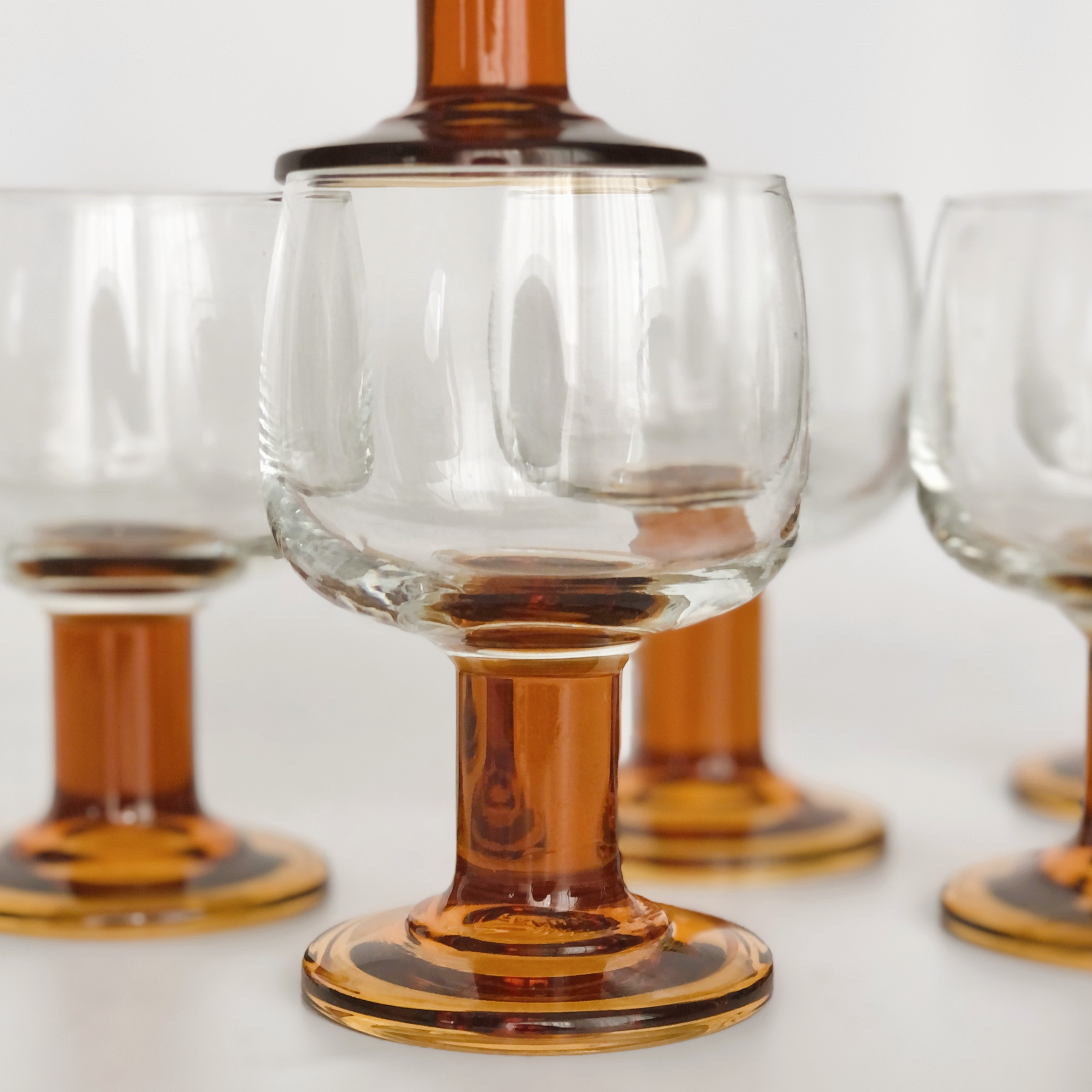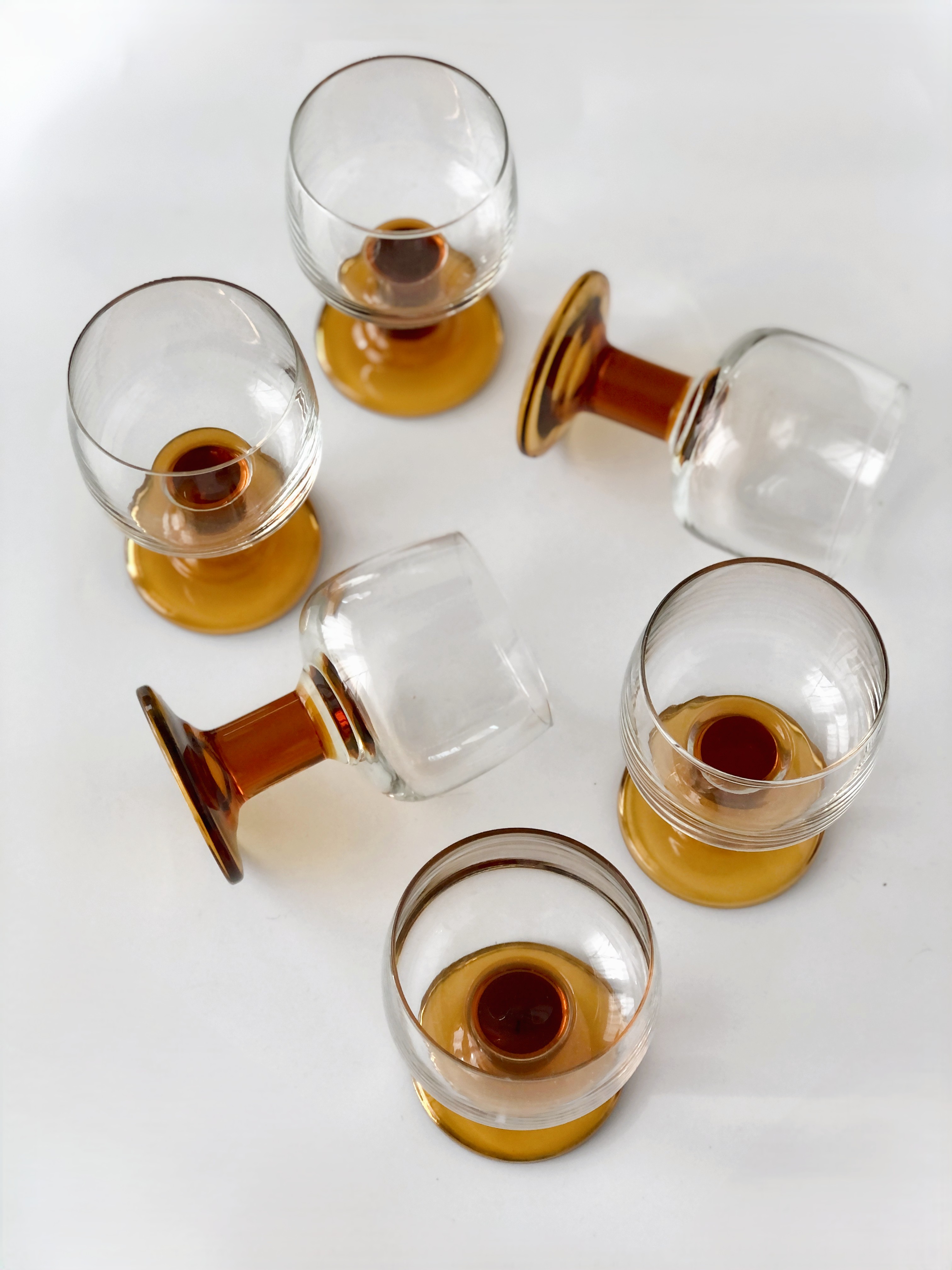 Kieliszki vintage na bursztynowej nóżce - Francja lata 70, zestaw 6 sztuk.