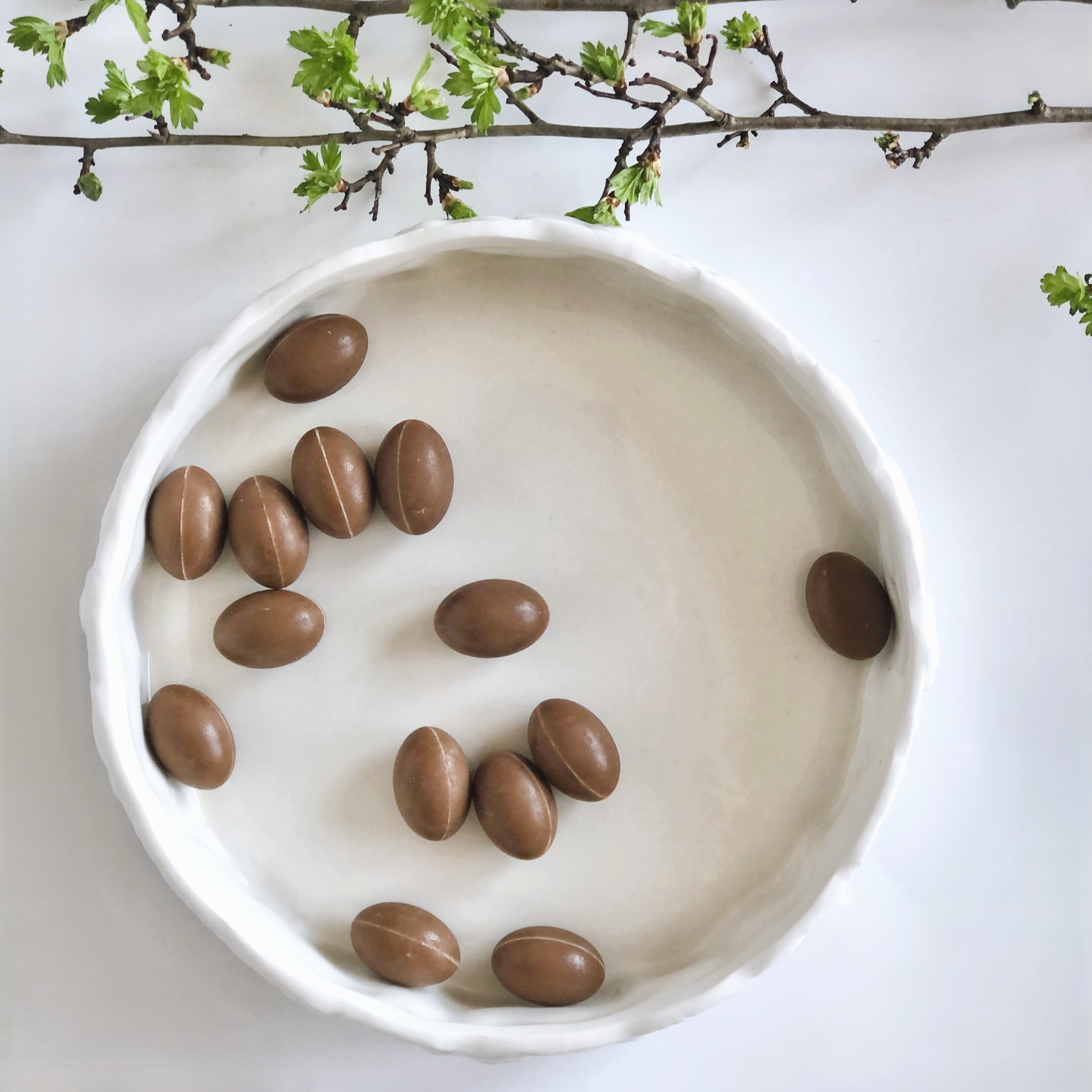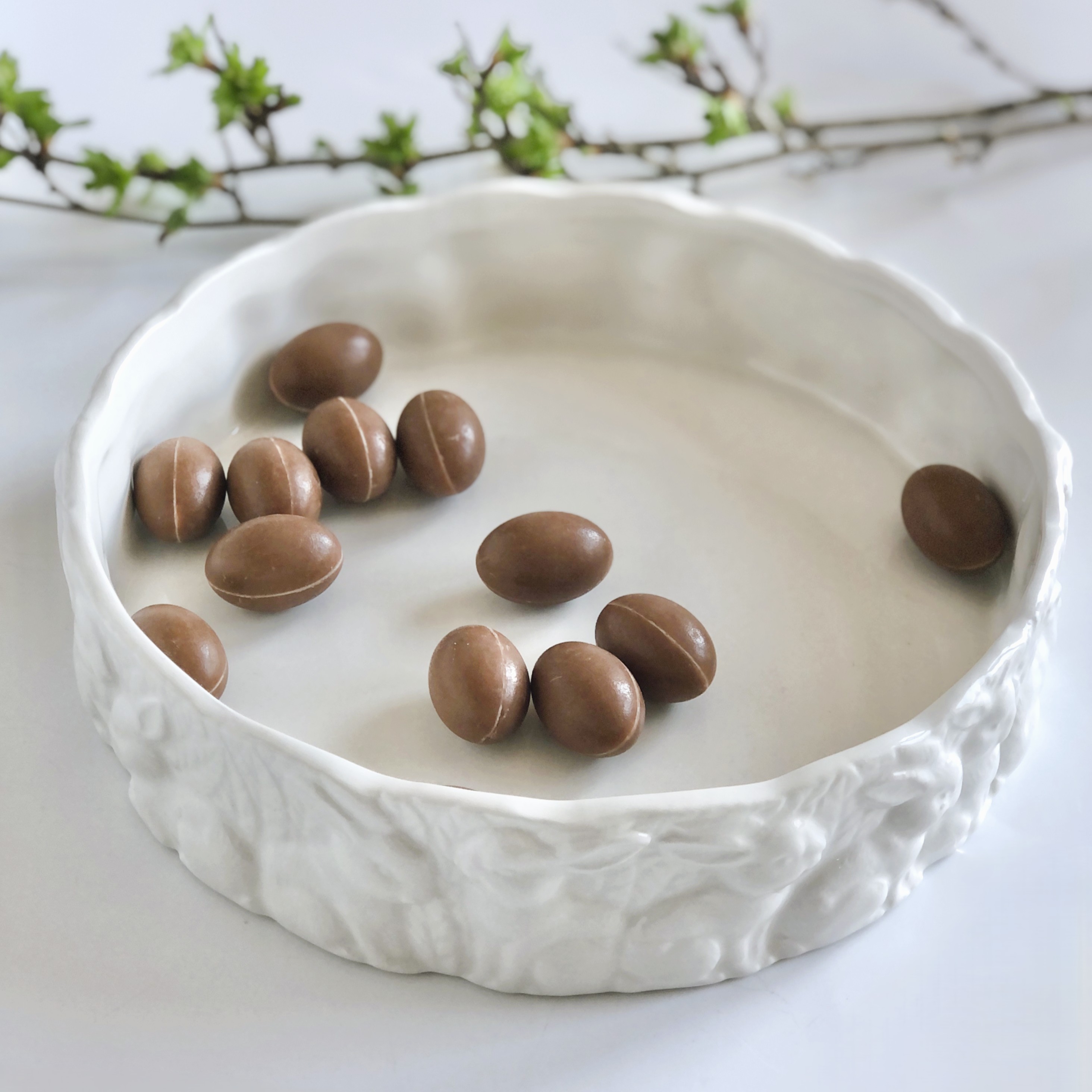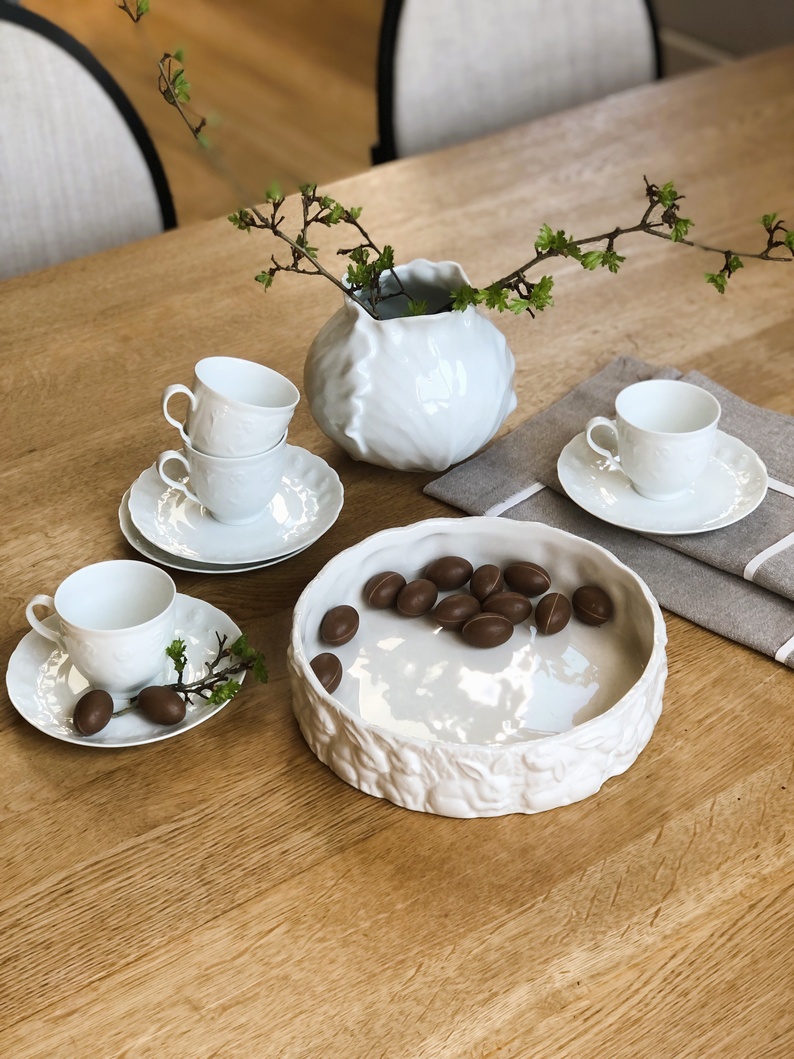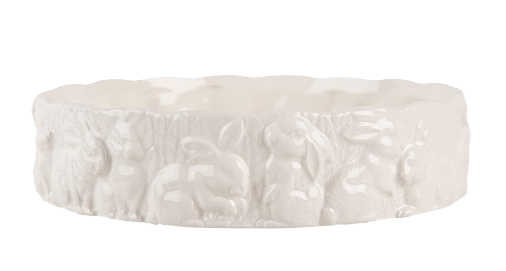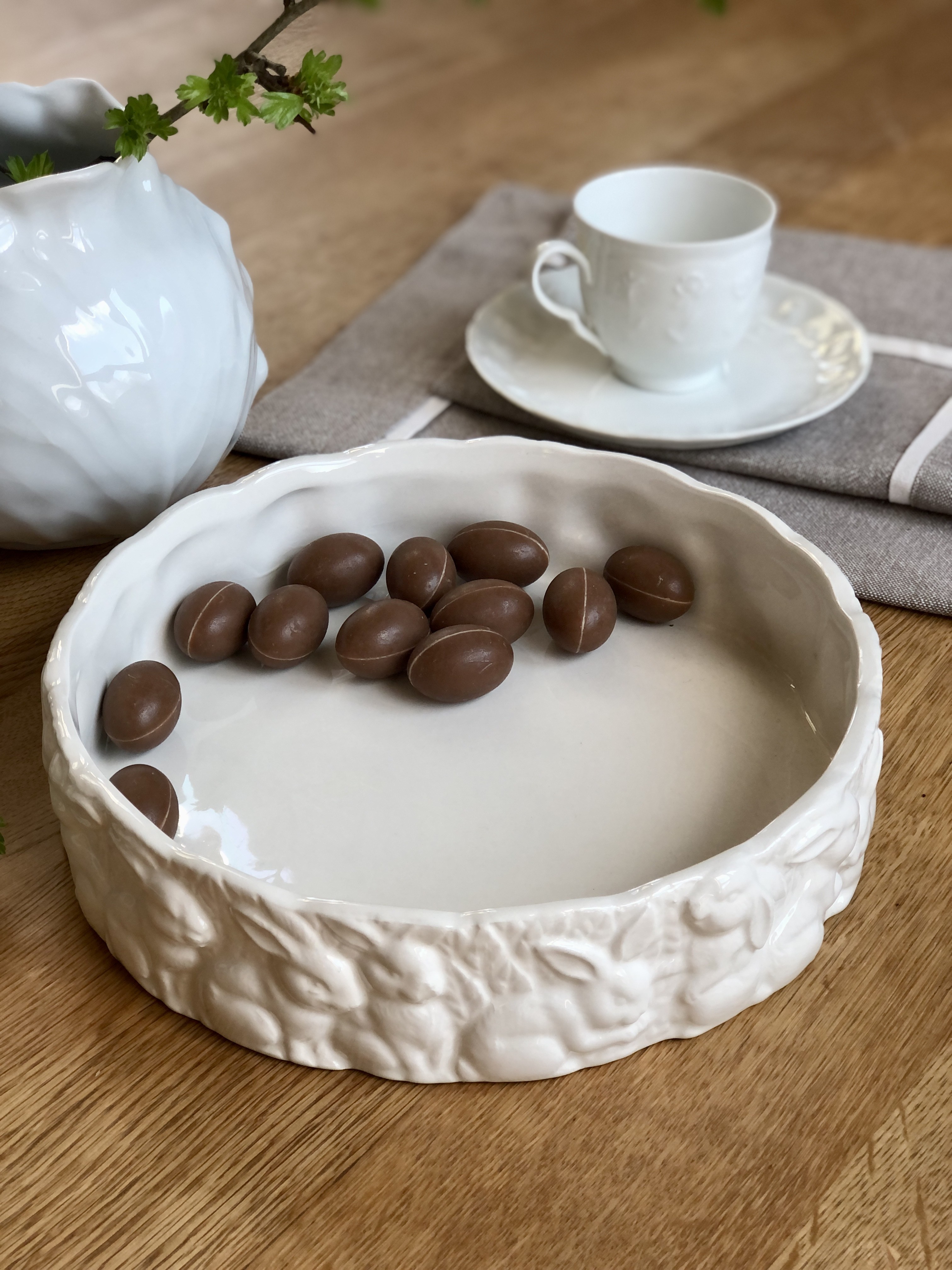 Dekoracyjna misa w uroczy relief z królikami. Ciepły odcień bieli.
