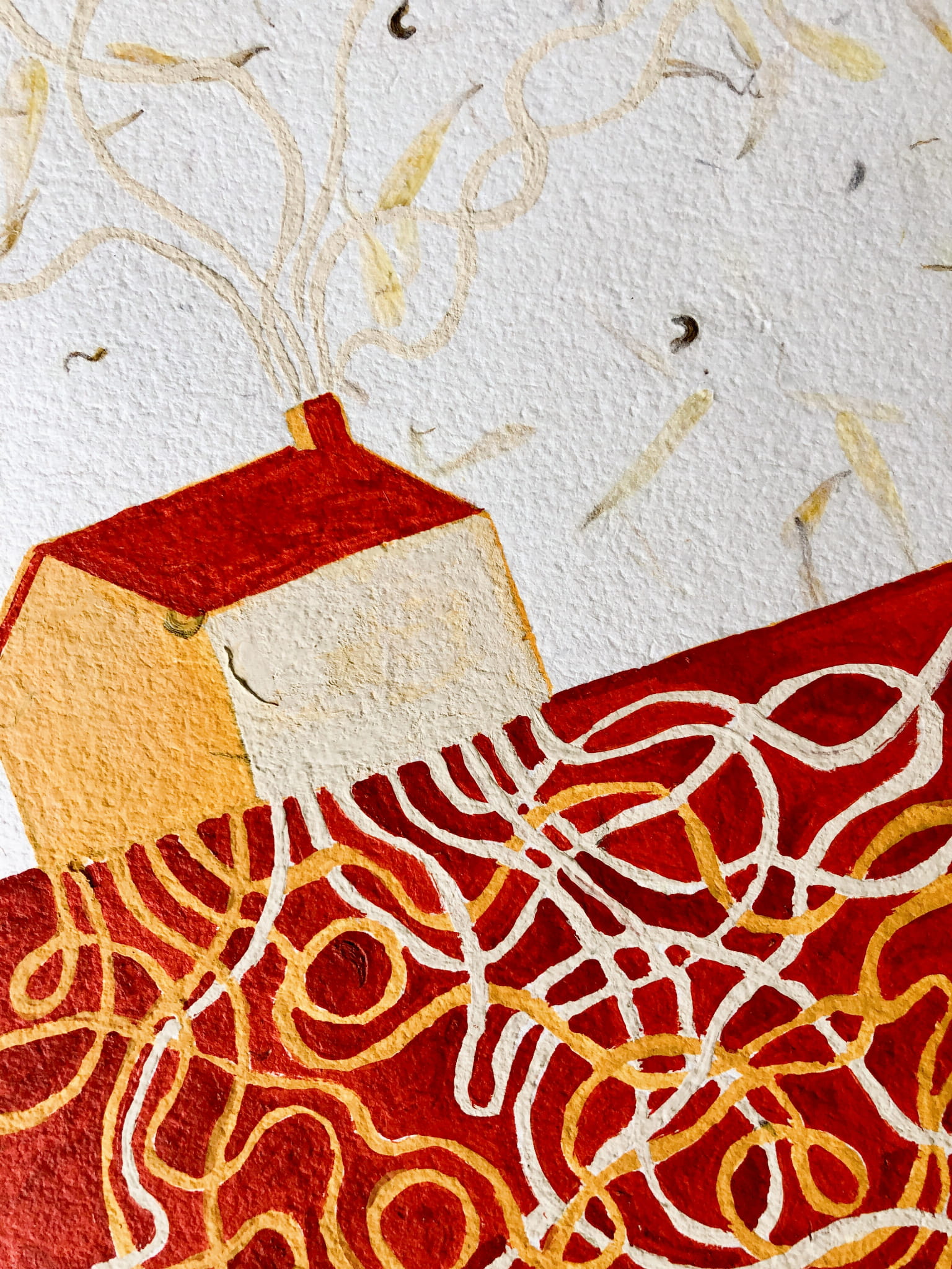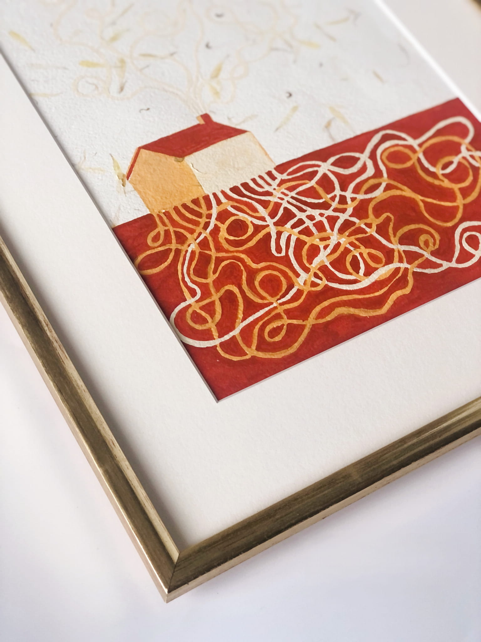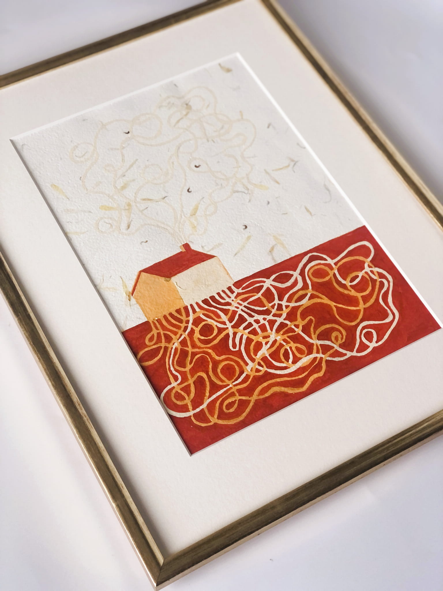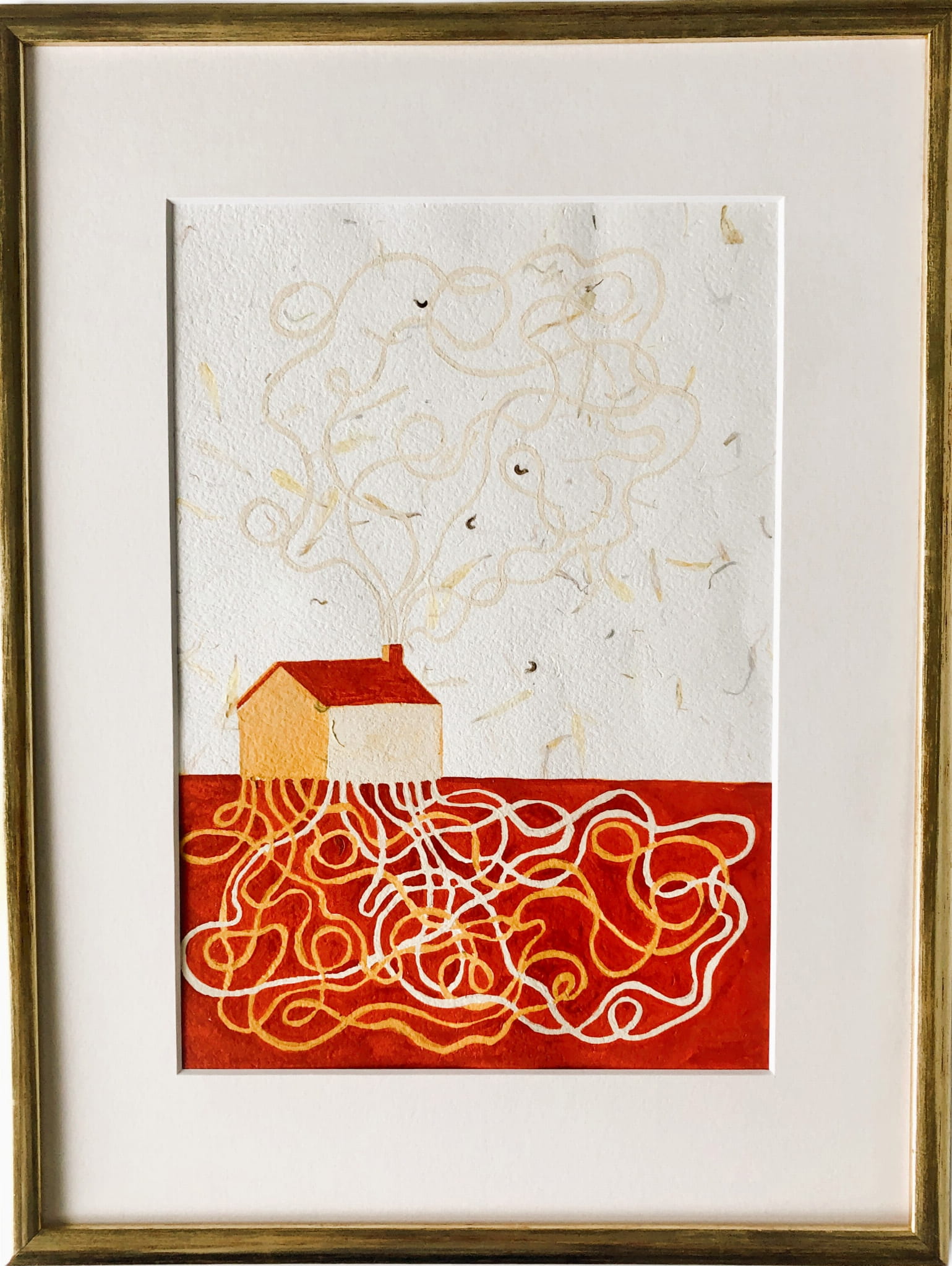 Obraz "DOM" - farby wodne Ecoline na papierze czerpanym z nagietkiem