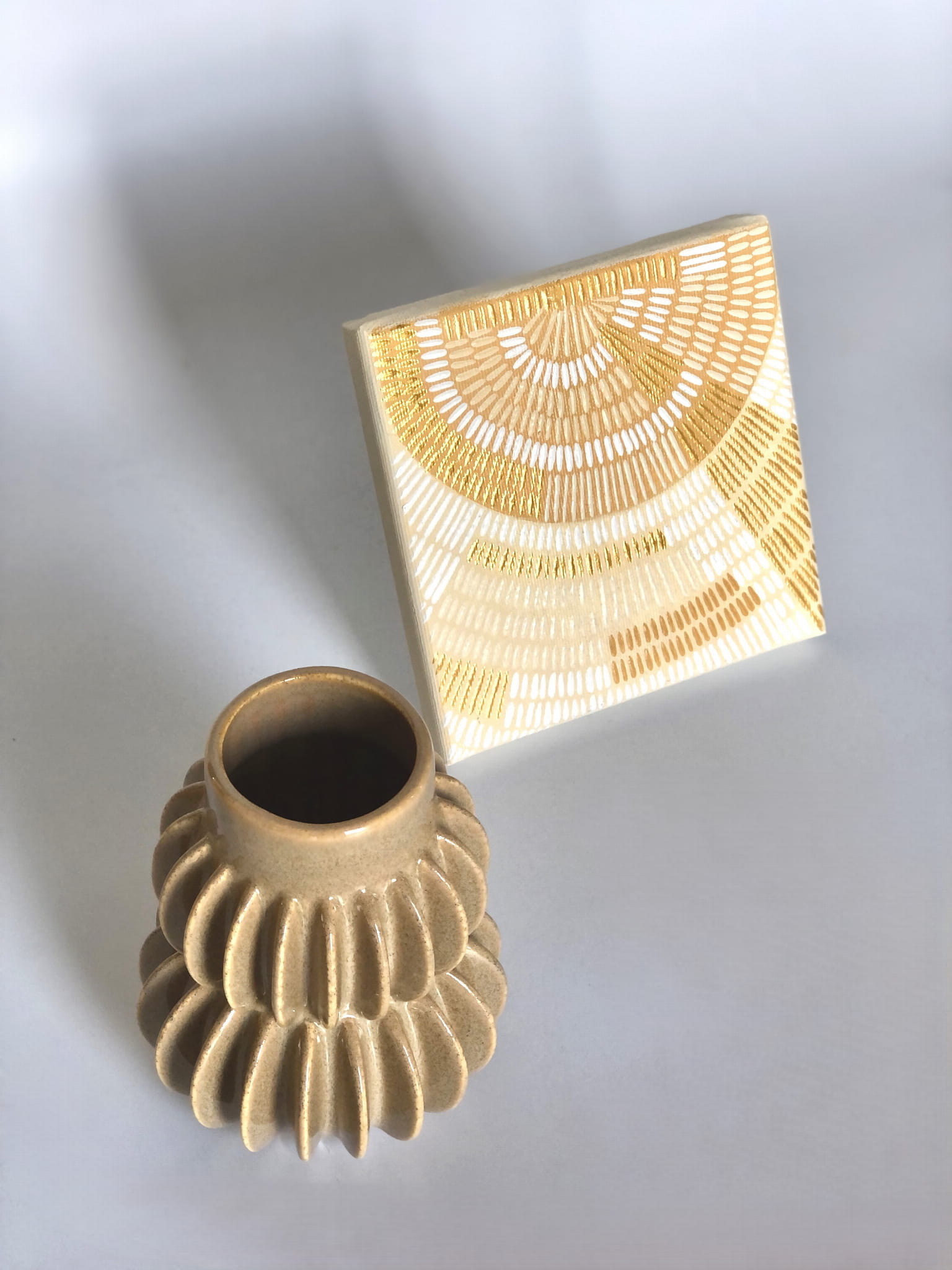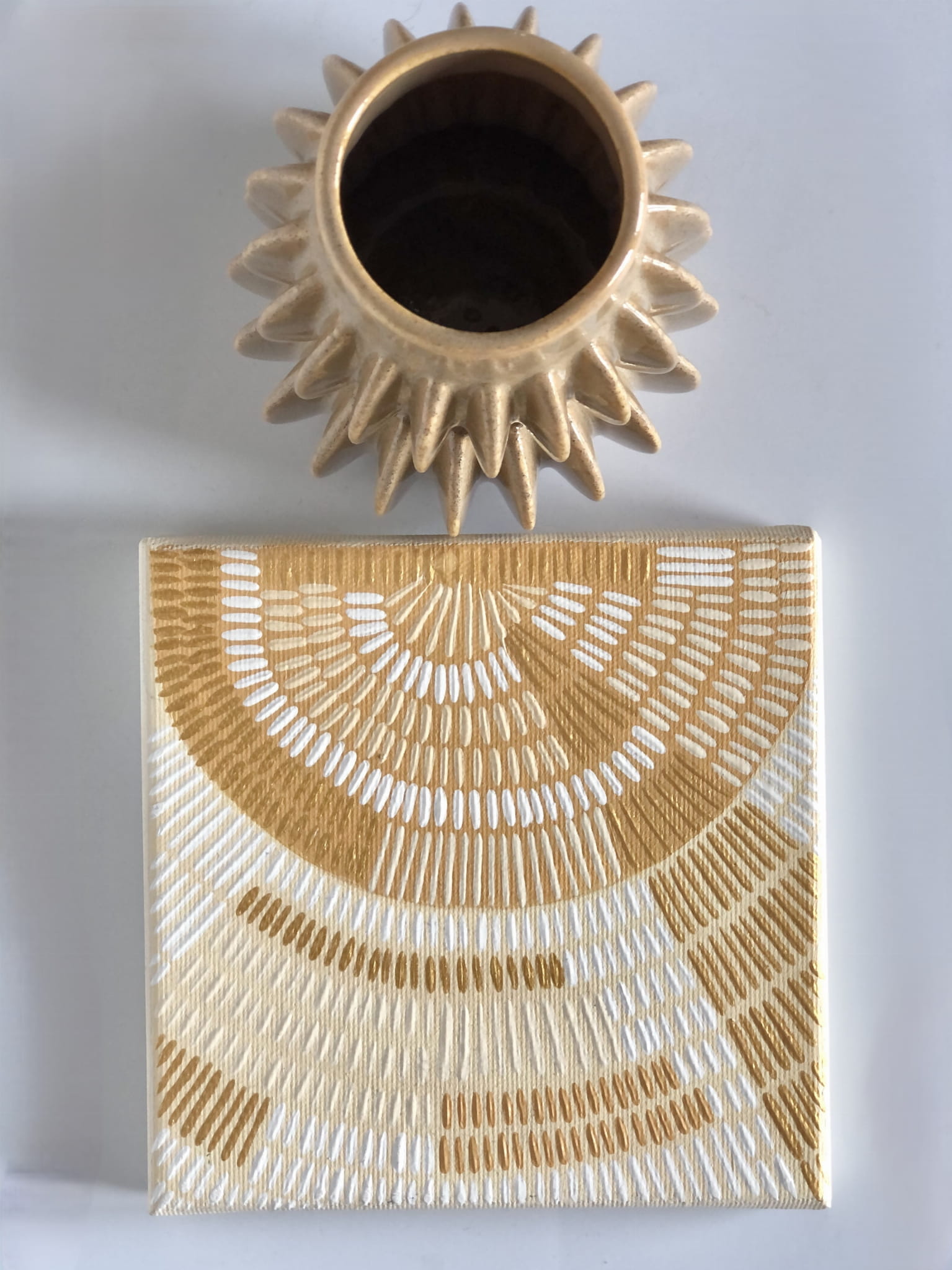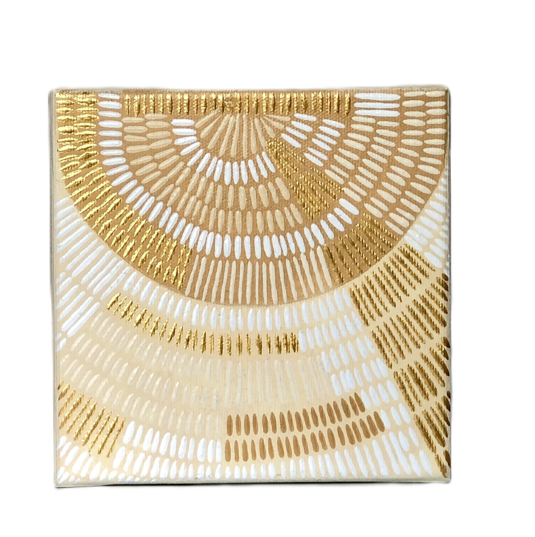 Obrazek to minimalistyczna abstrakcyjna kompozycja, namalowana przez artystkę Paulinę Kuźmińską metodą drobnych kreseczek w odcieniach beżu, bieli i złota