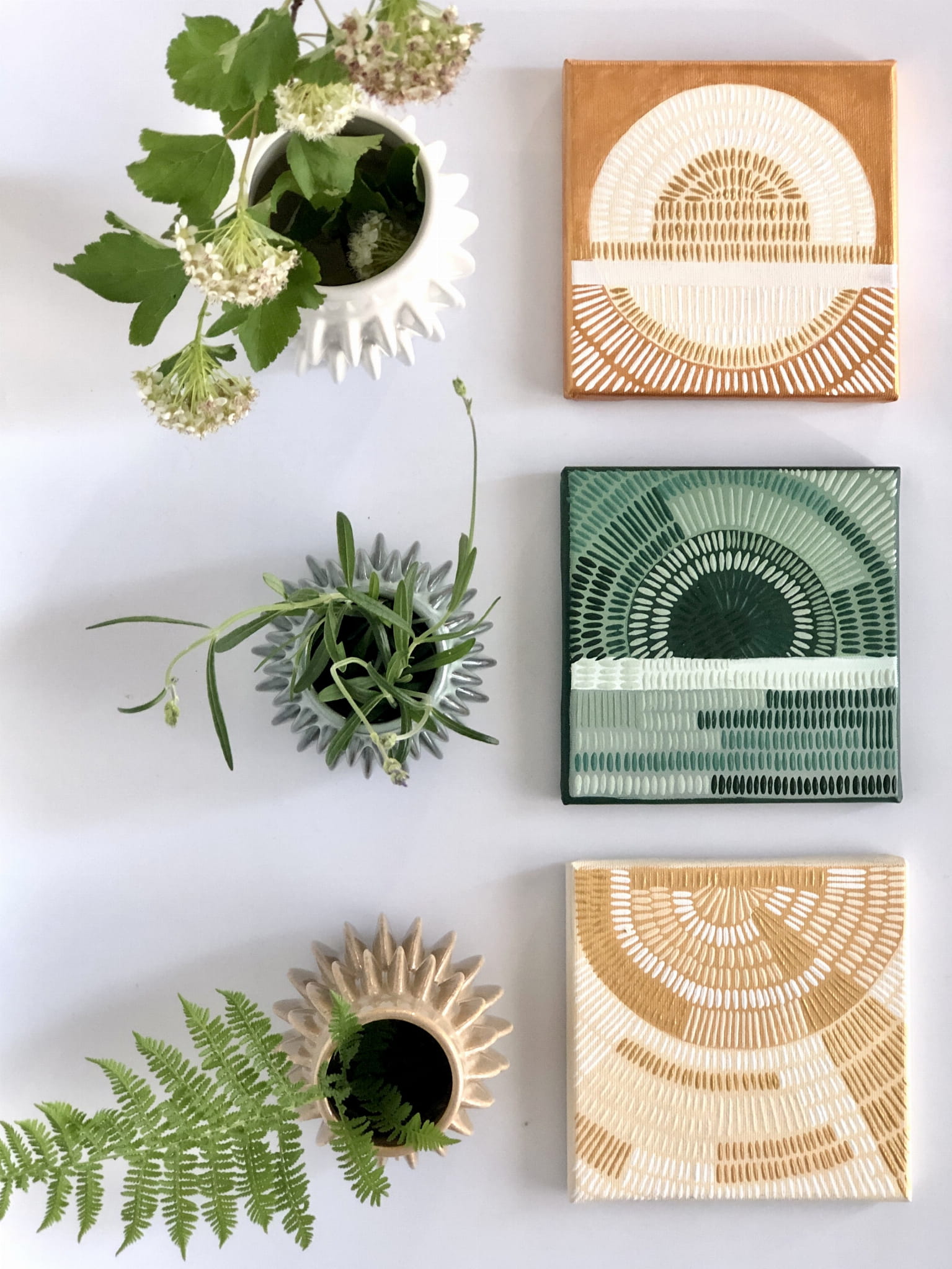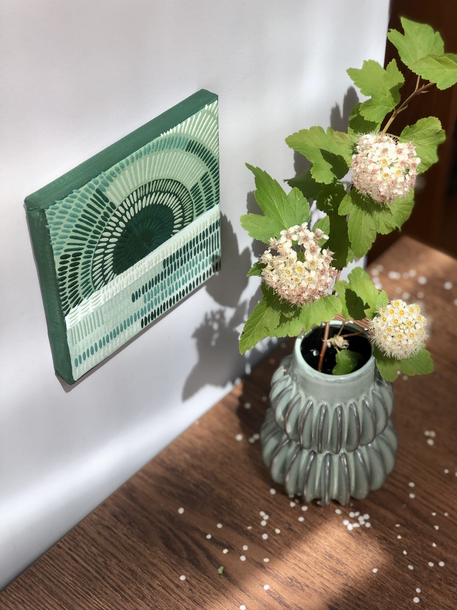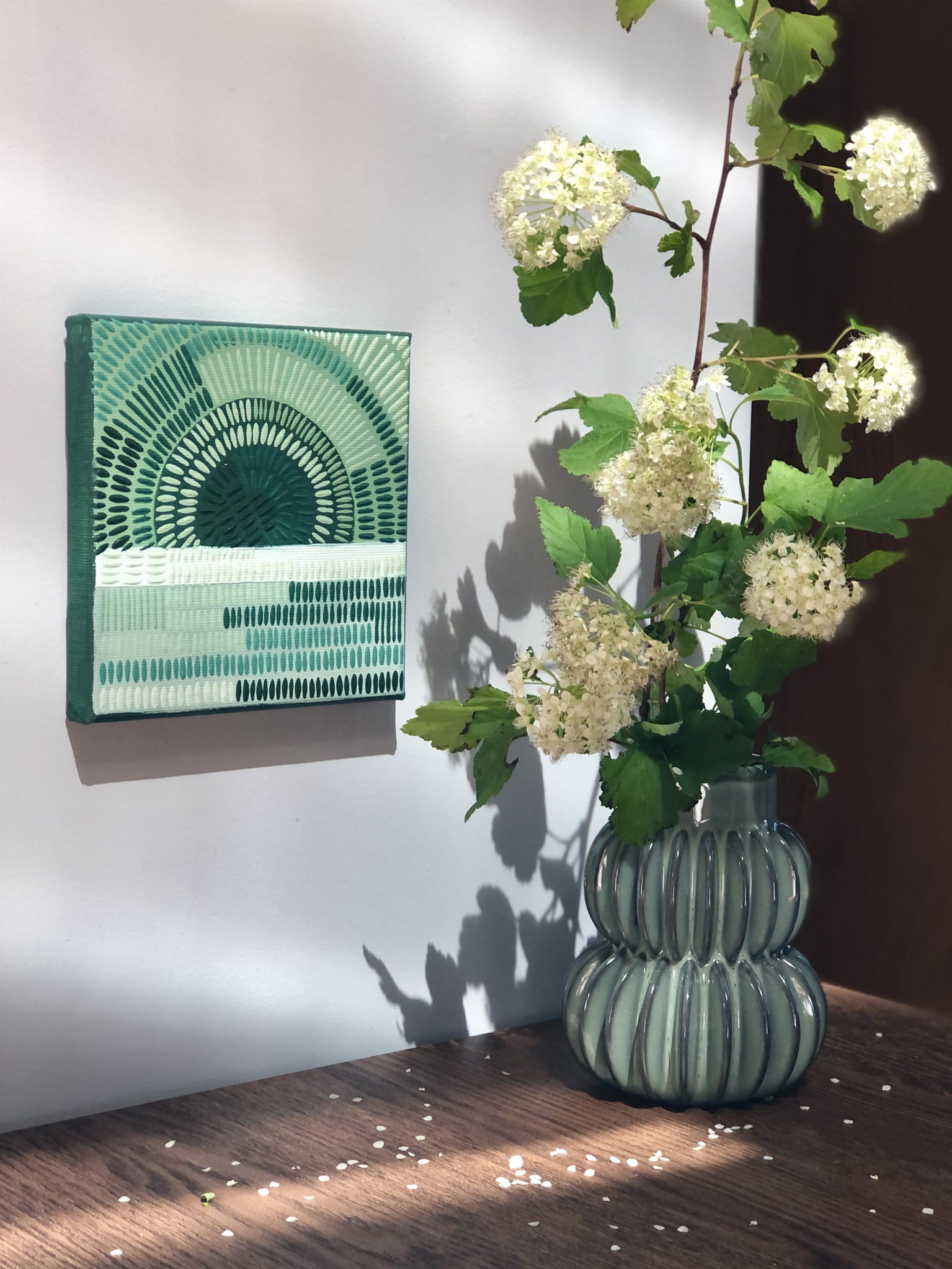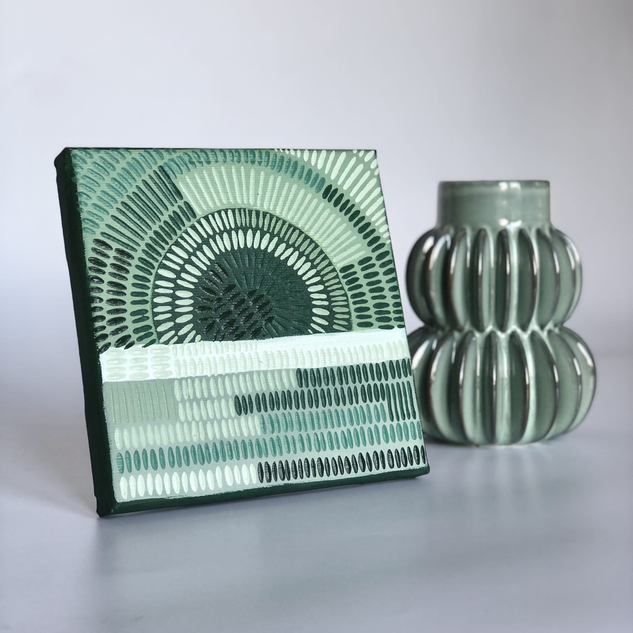Obrazek to minimalistyczna abstrakcyjna kompozycja, namalowana przez artystkę Paulinę Kuźmińską, metodą drobnych kreseczek w odcieniach zieleni.