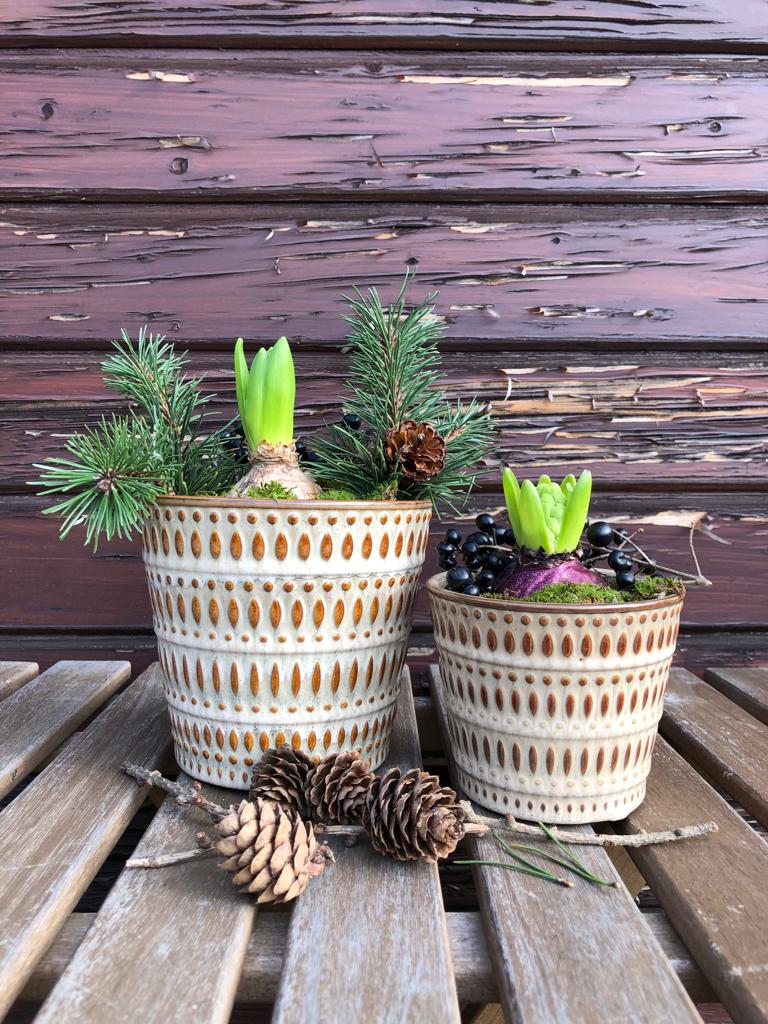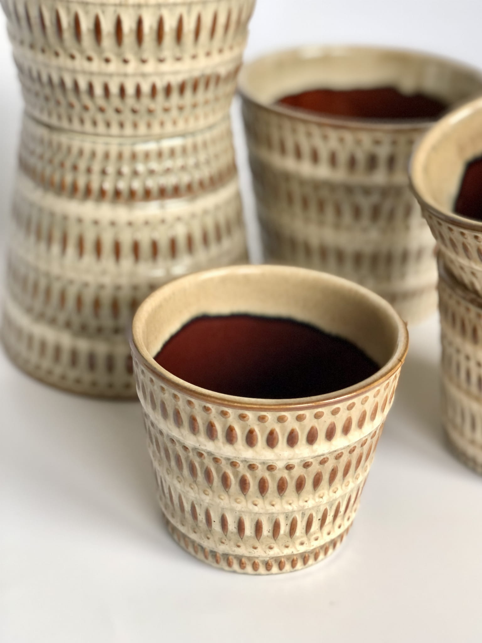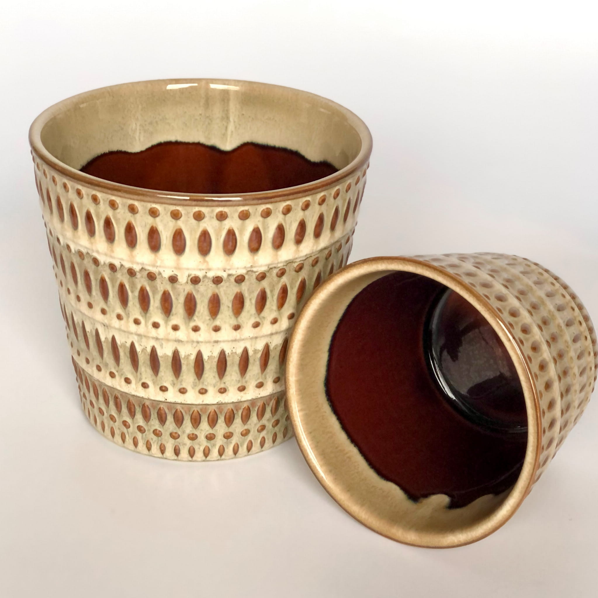 Wykonana z ceramiki w kolorze brązu i beżu z delikatnymi tłoczeniami na zewnątrz.