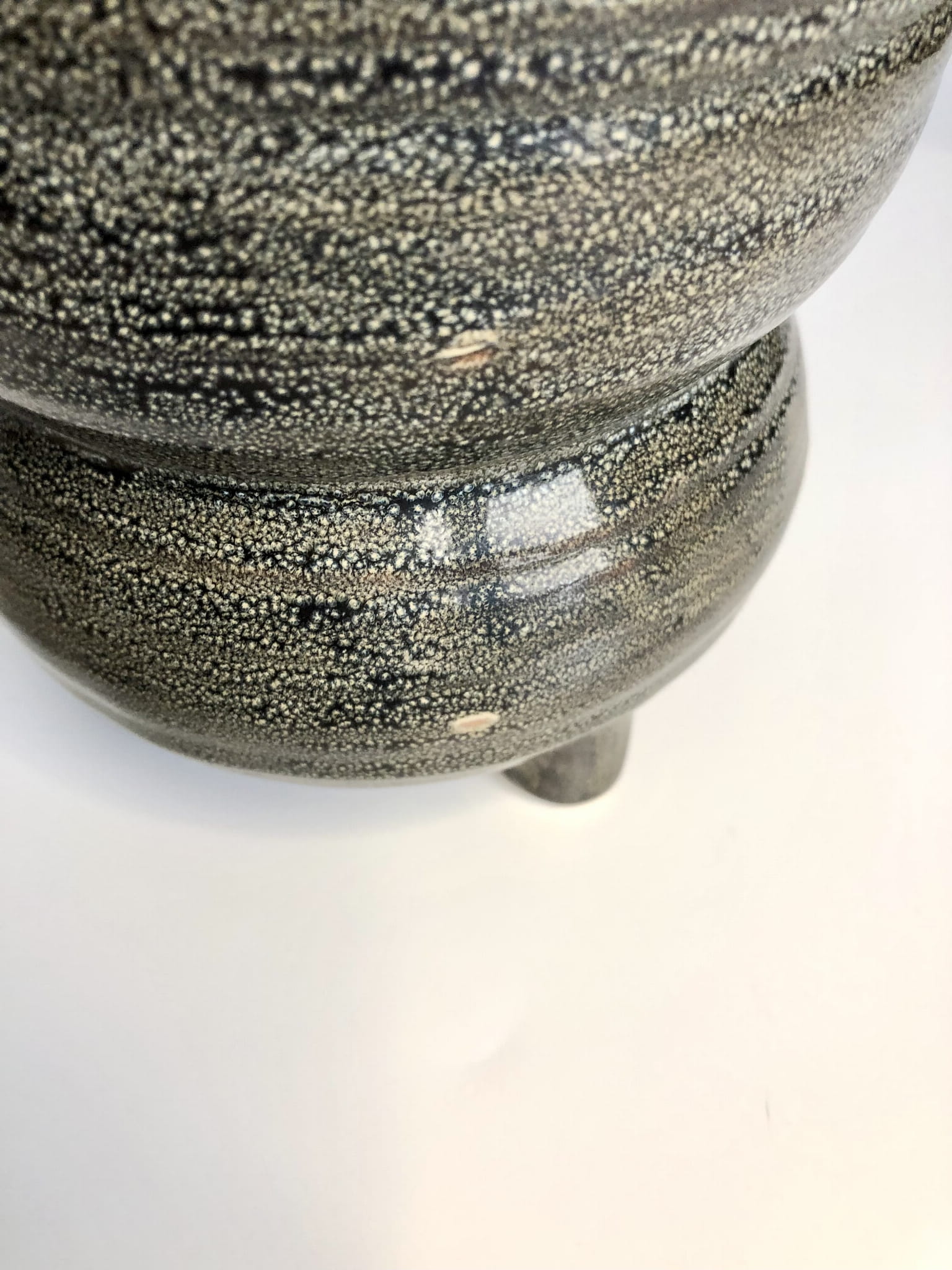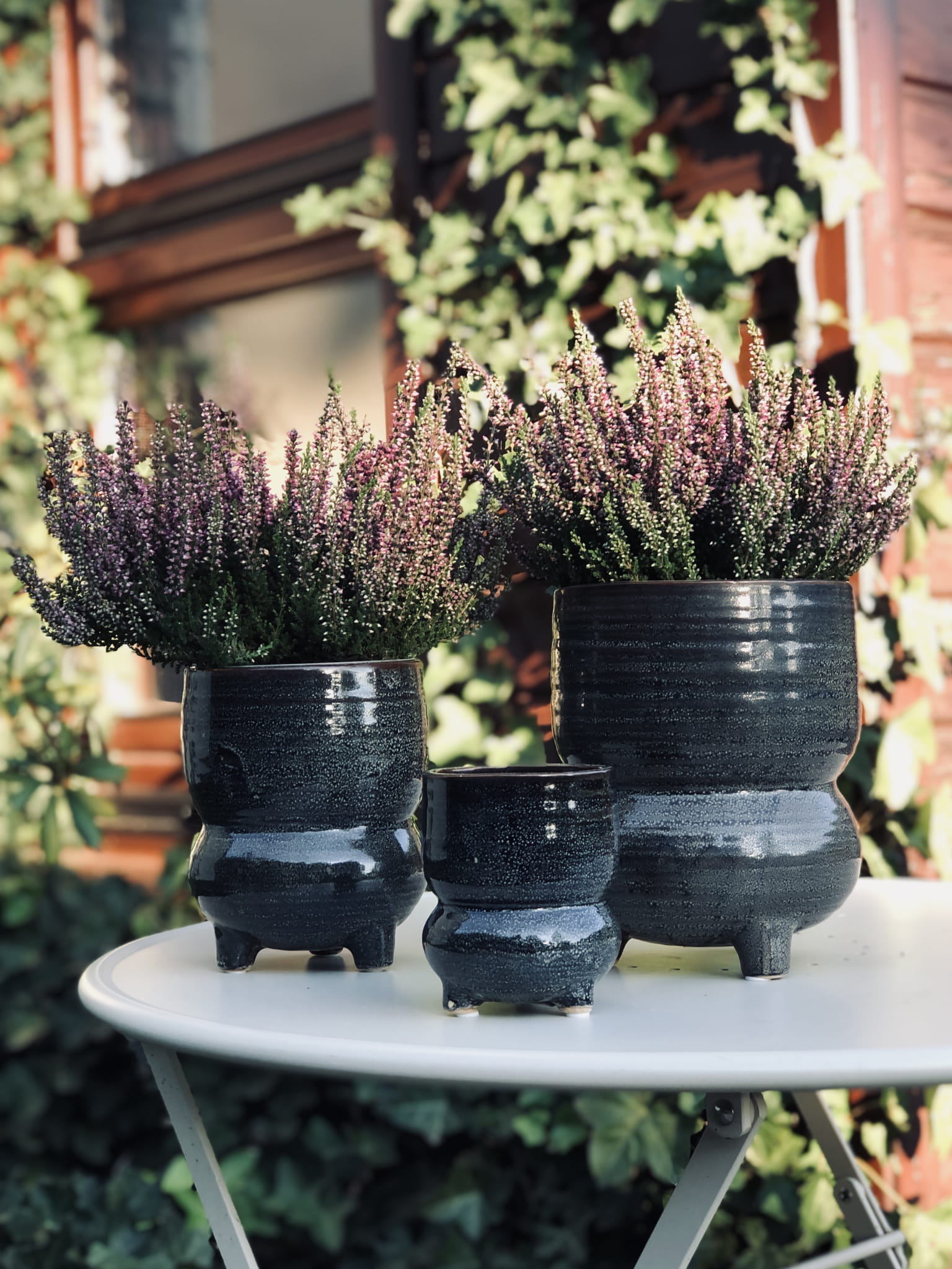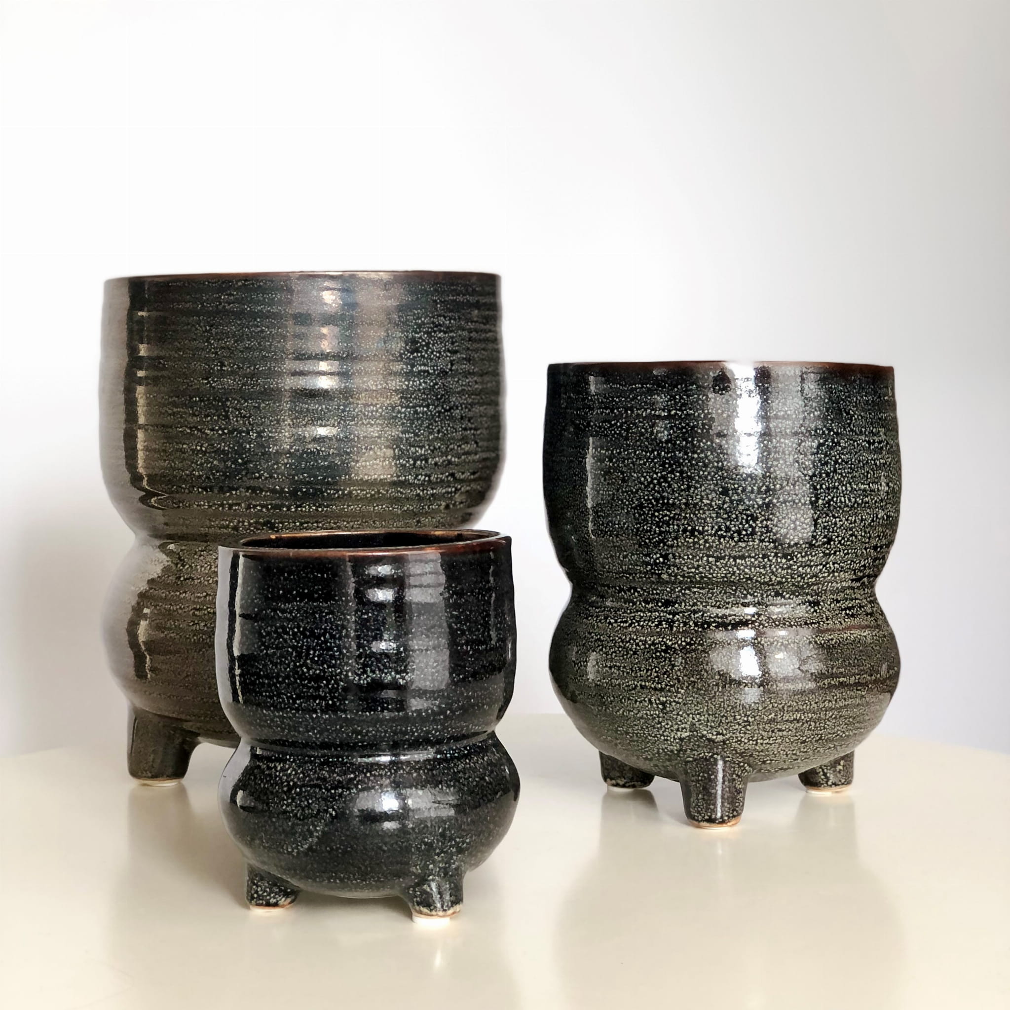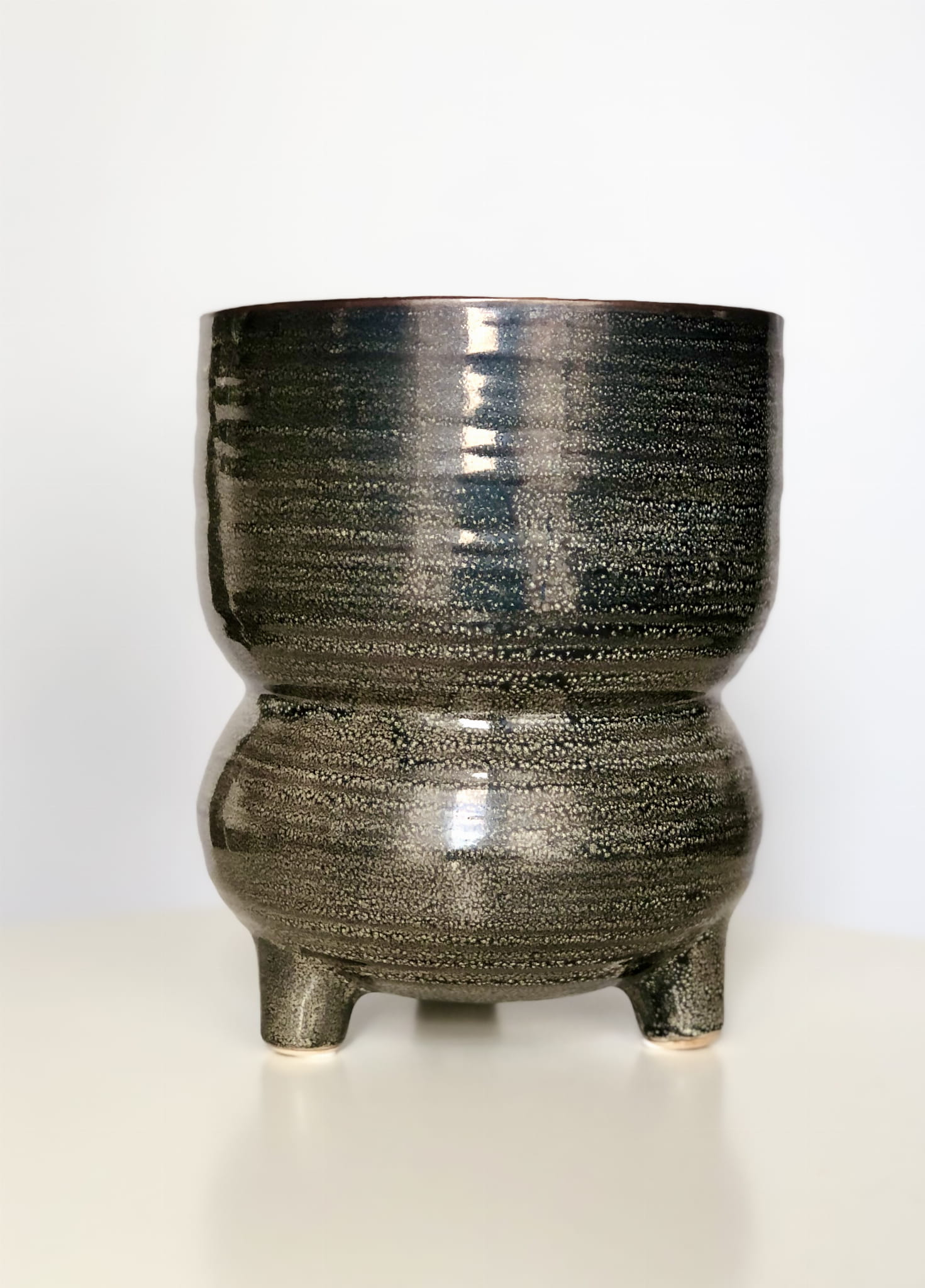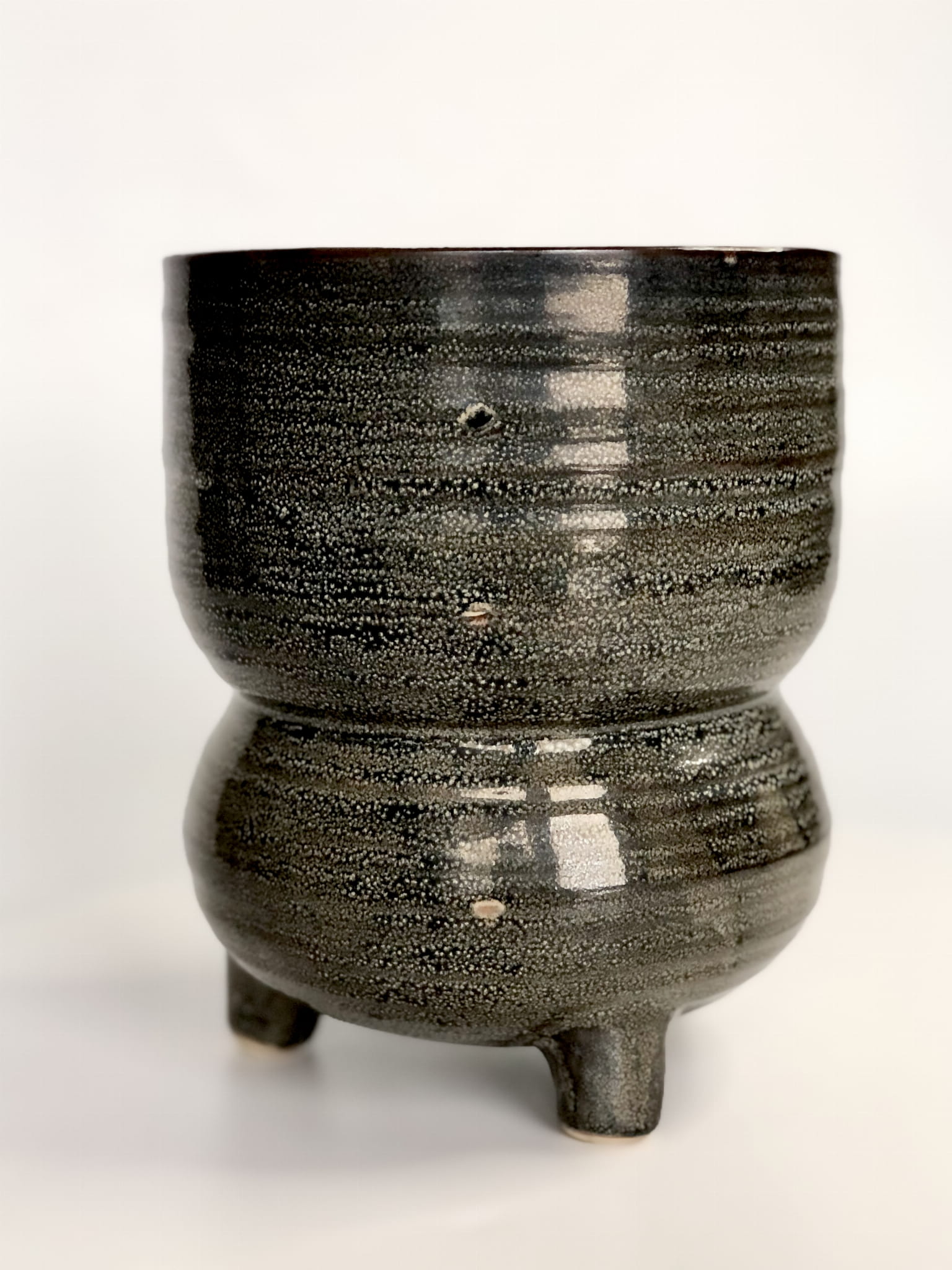 Osłonka na nóżkach w kolorze grafitowo-czarnym rozmiar L. Ręcznie formowana i szkliwiona, o ciekawym kształcie.