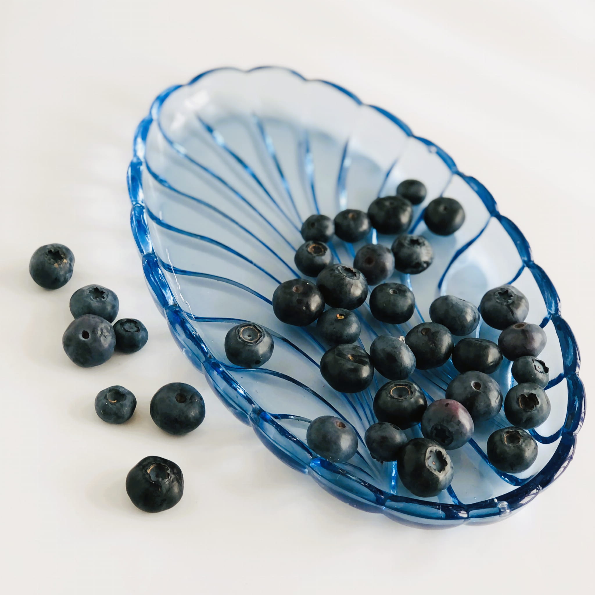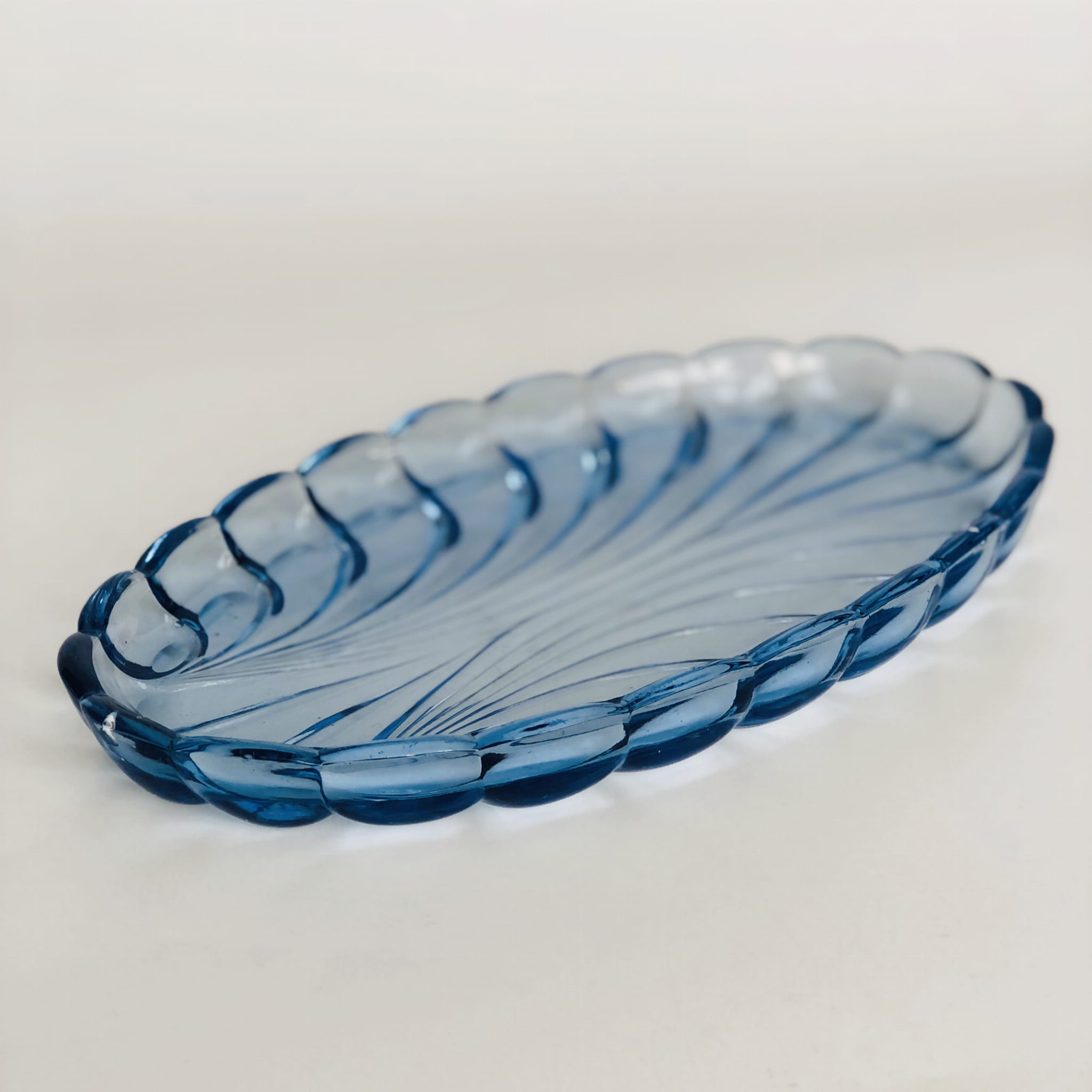 Patera, taca muszla, niebieskie szkło, Huta Ząbkowice