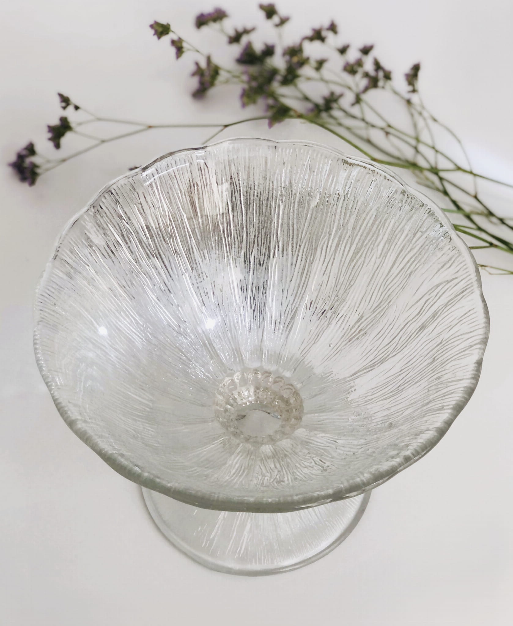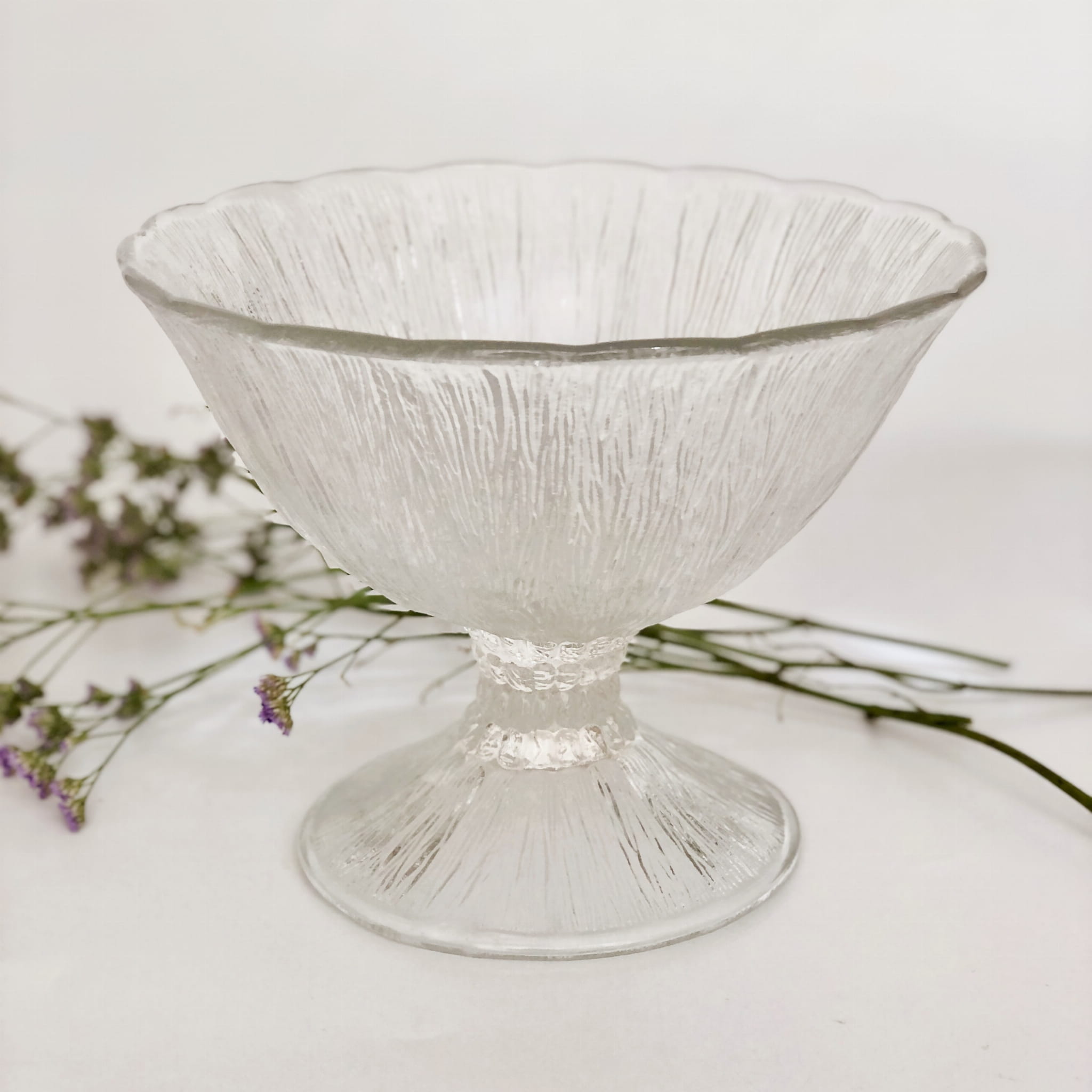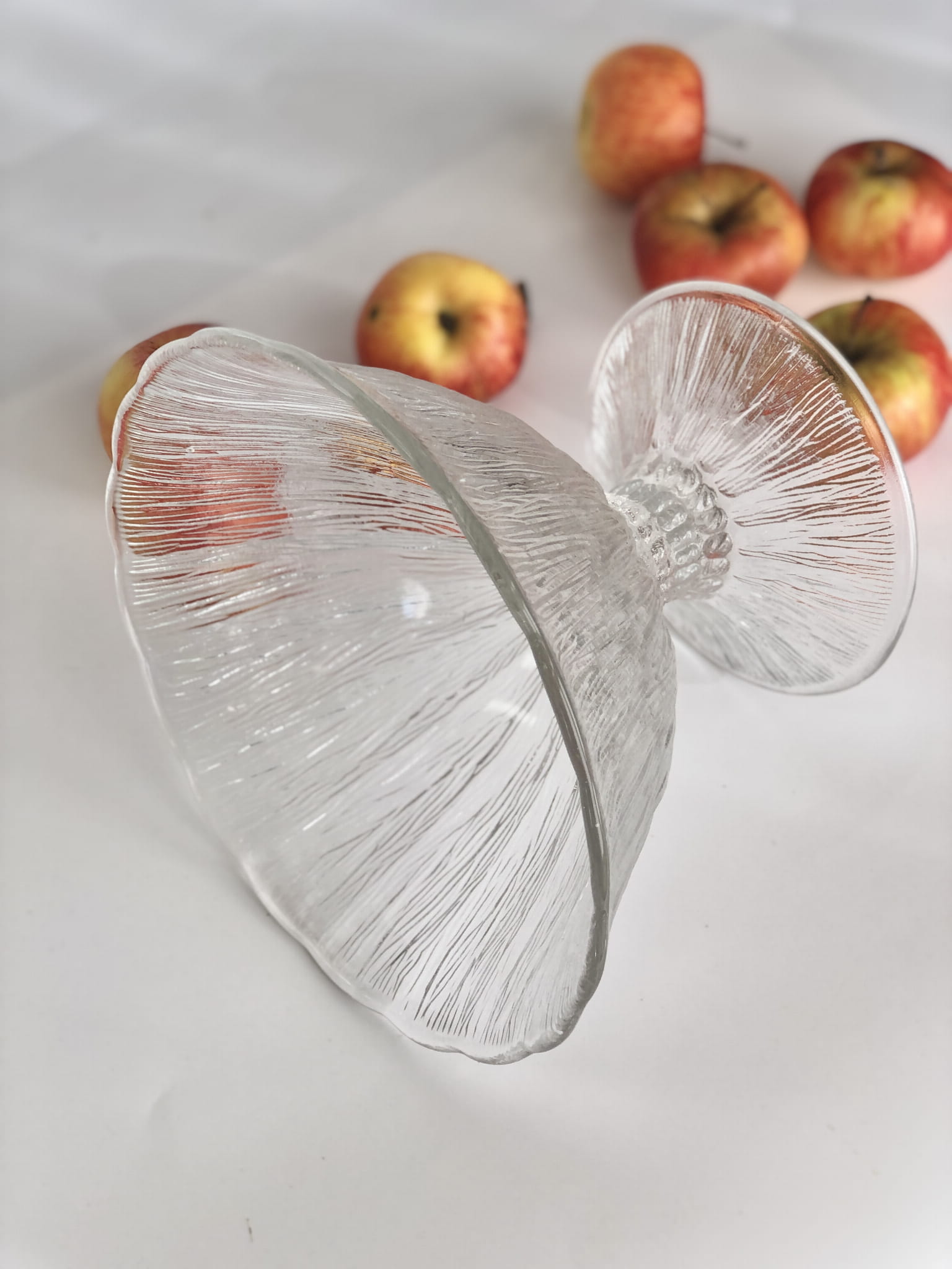 Patera "Cora" na stopie, Huta Ząbkowice. Szkło transparentne, sodowe, prasowane.