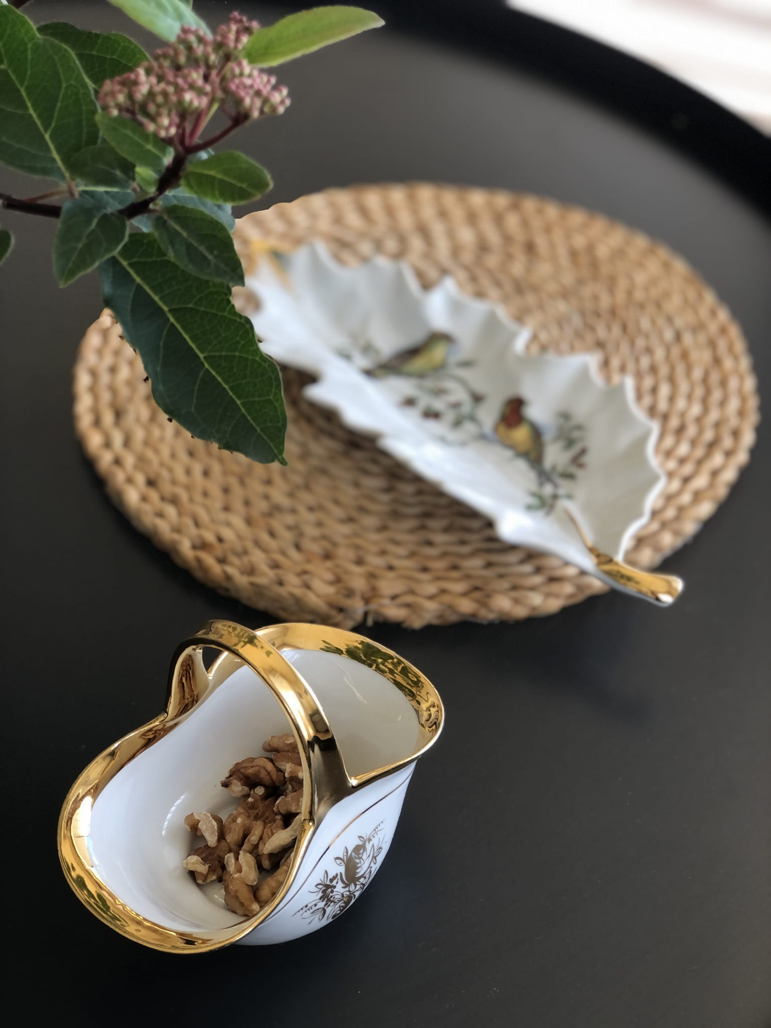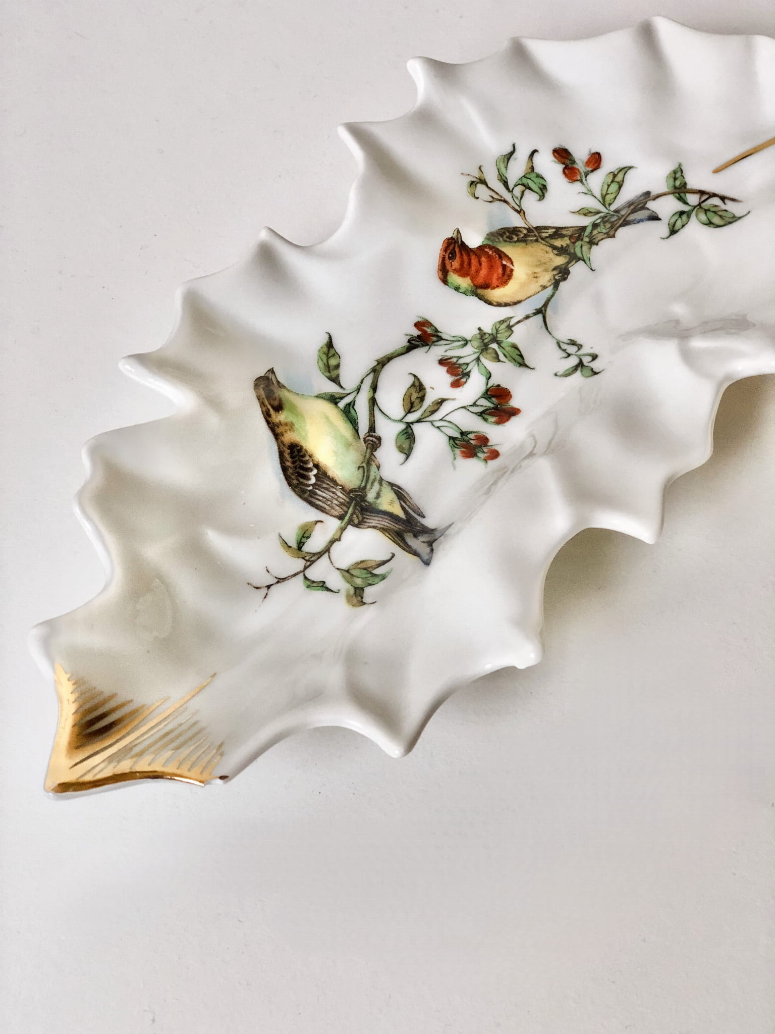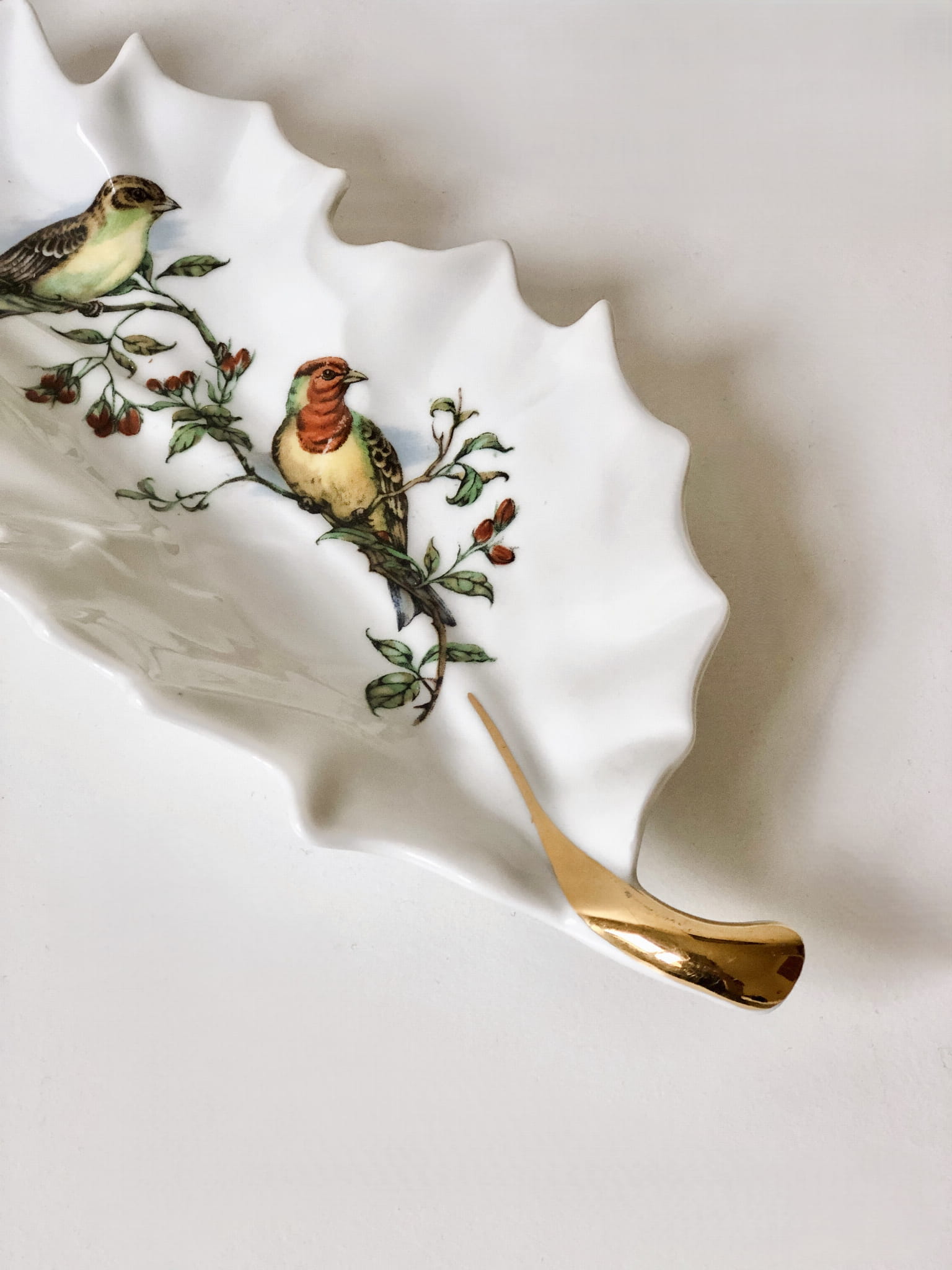 Bardzo oryginalna patera na drobiazgi w kształcie liścia, ozdobiona motywem ptaków (często opisywanych jako kolibry) na gałązkach z owocami.