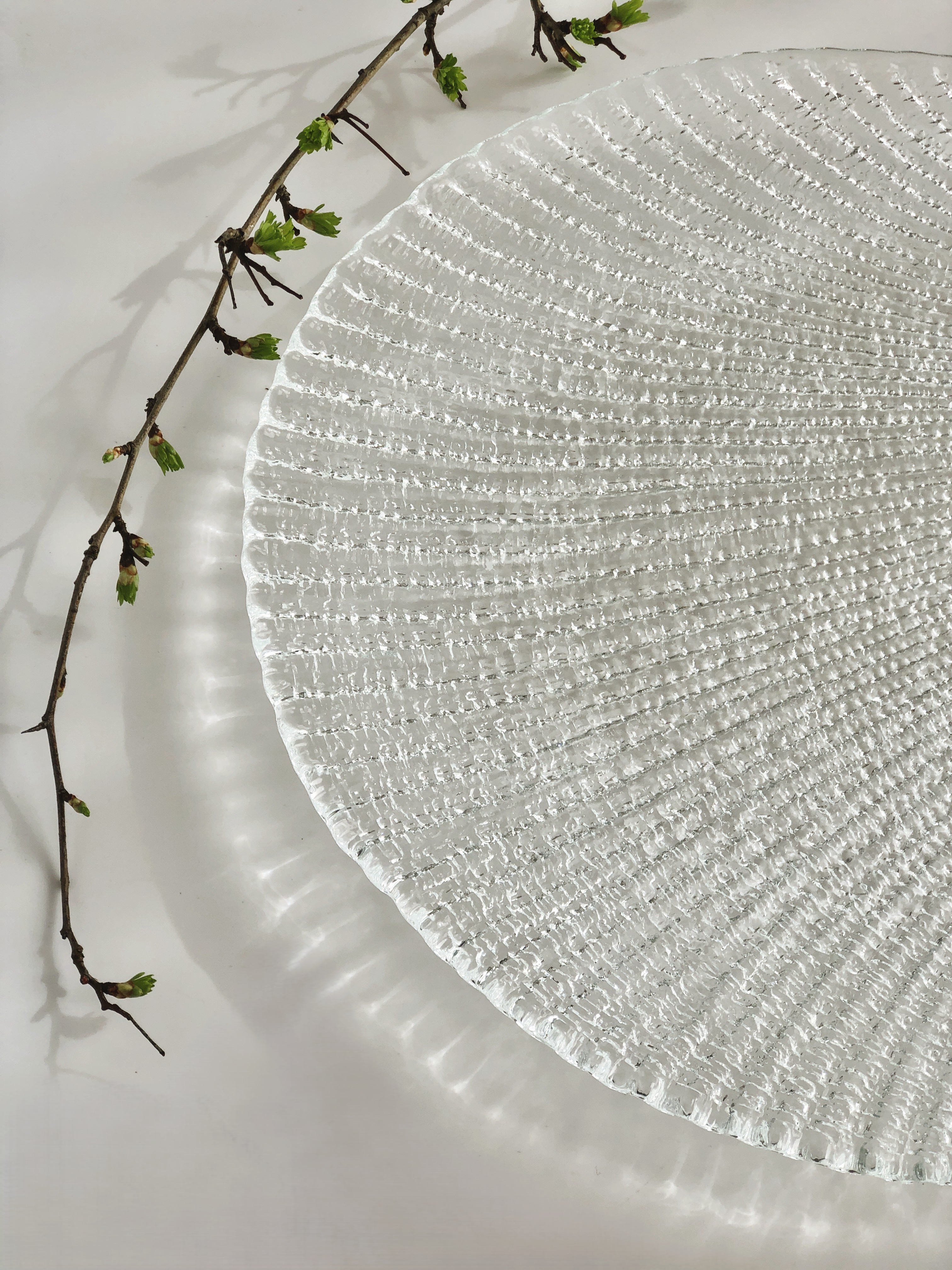 Duża patera, model rzadko występujący. Szkło transparentne, sadowe, prasowane.
