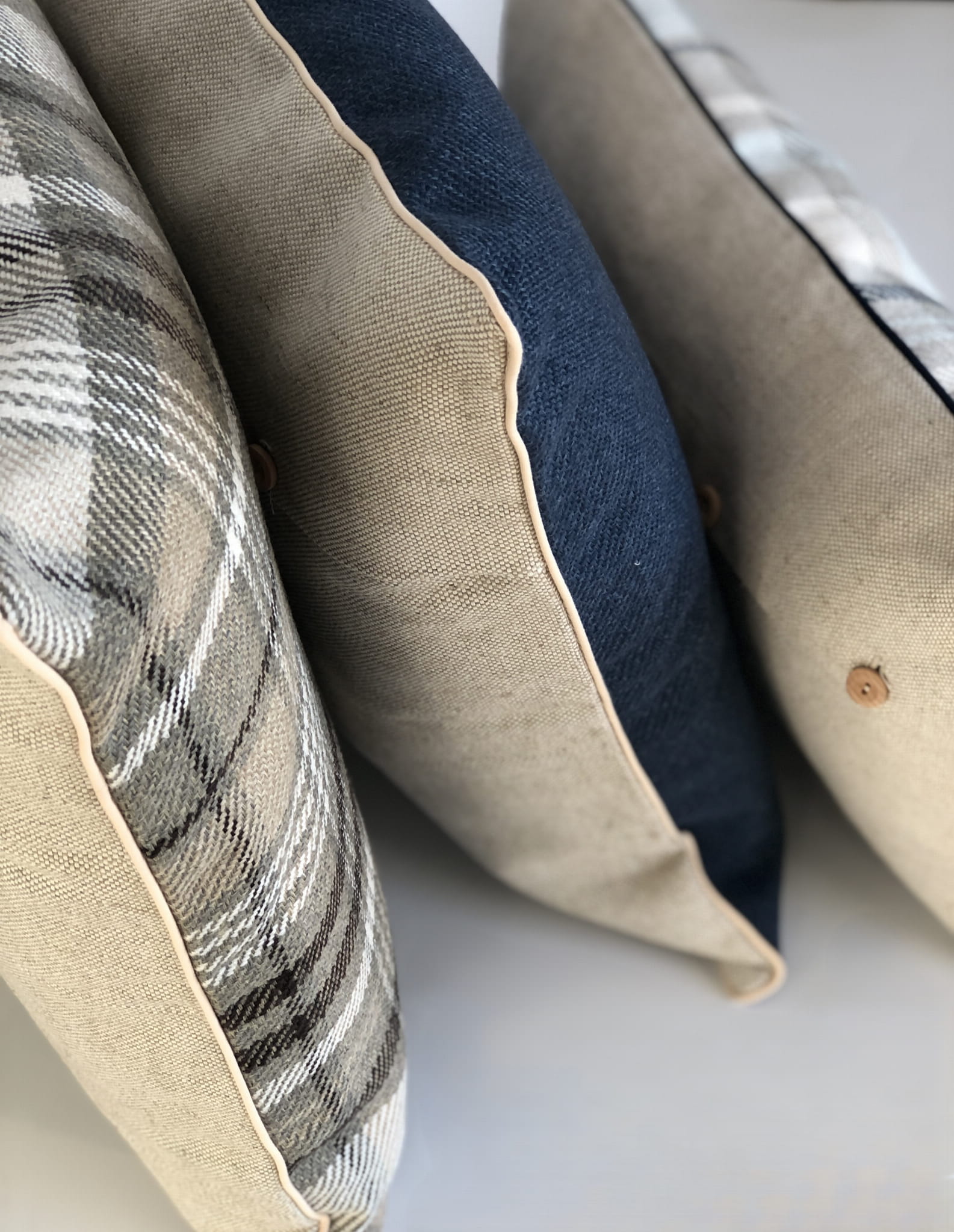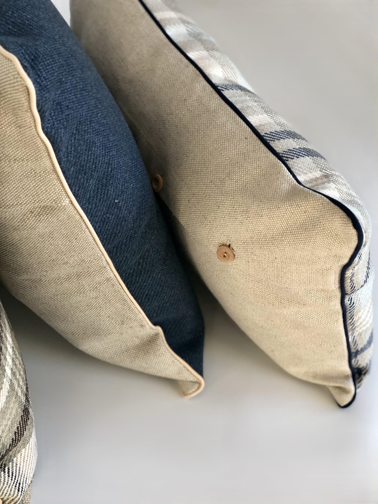Poduszka obszyta jest kremową, bawełnianą wypustką i zapinana na drewniane guziczki.