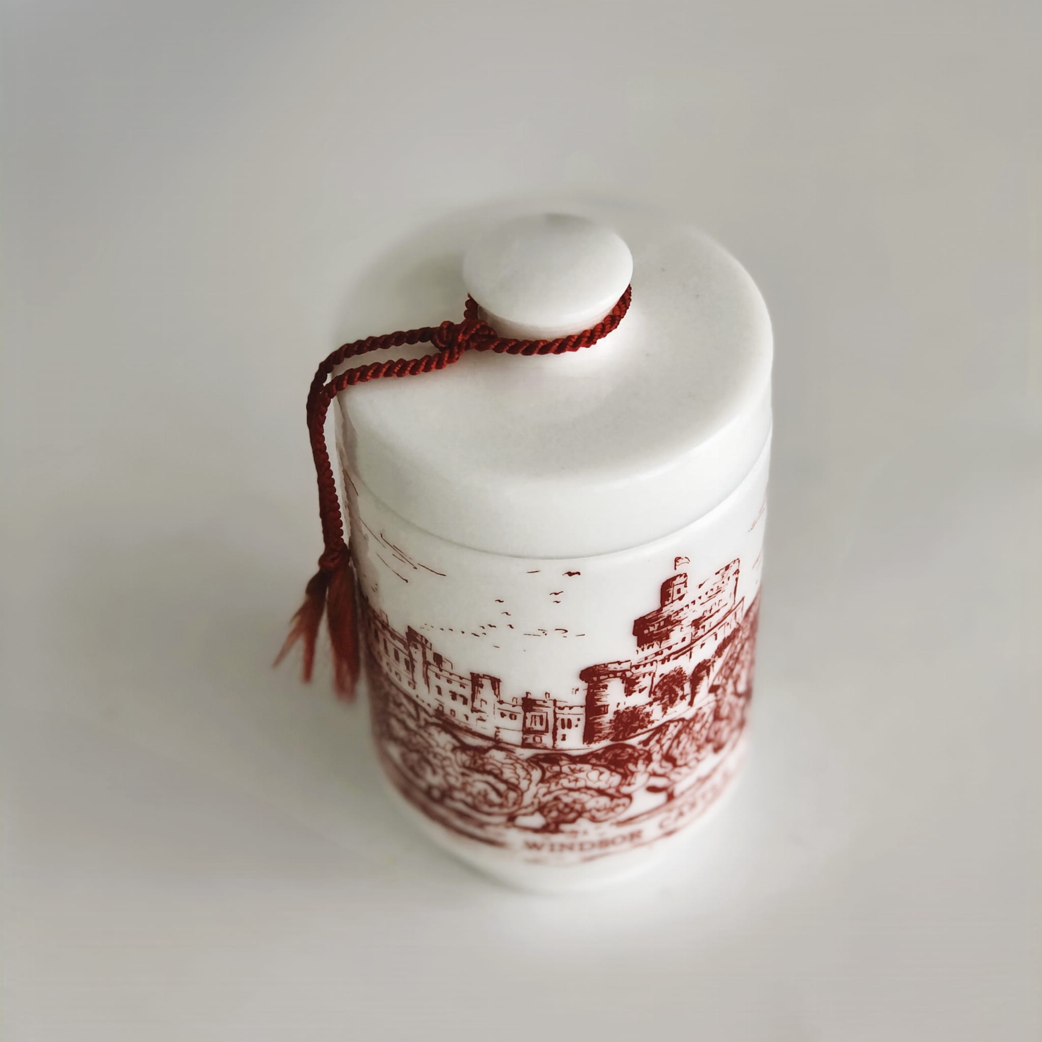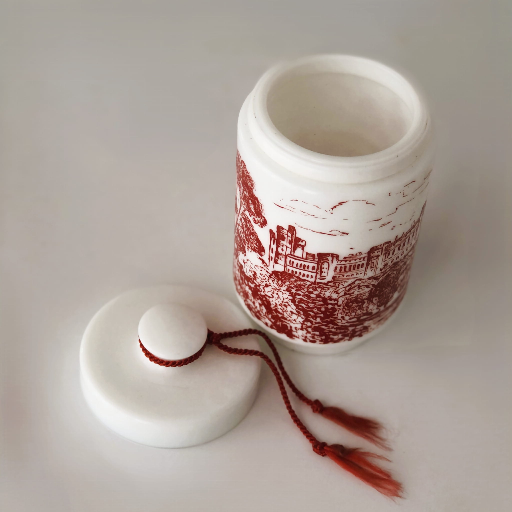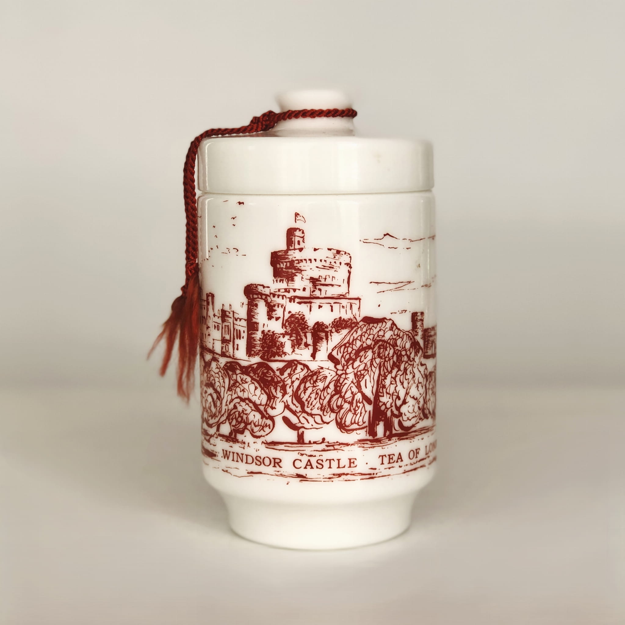 Stylowy pojemnik ze szczelnym zamykaniem oraz dekoracyjnym czerwonym nadrukiem Zamku Windsor. Wyprodukowany w Belgii w latach 70. XX w.