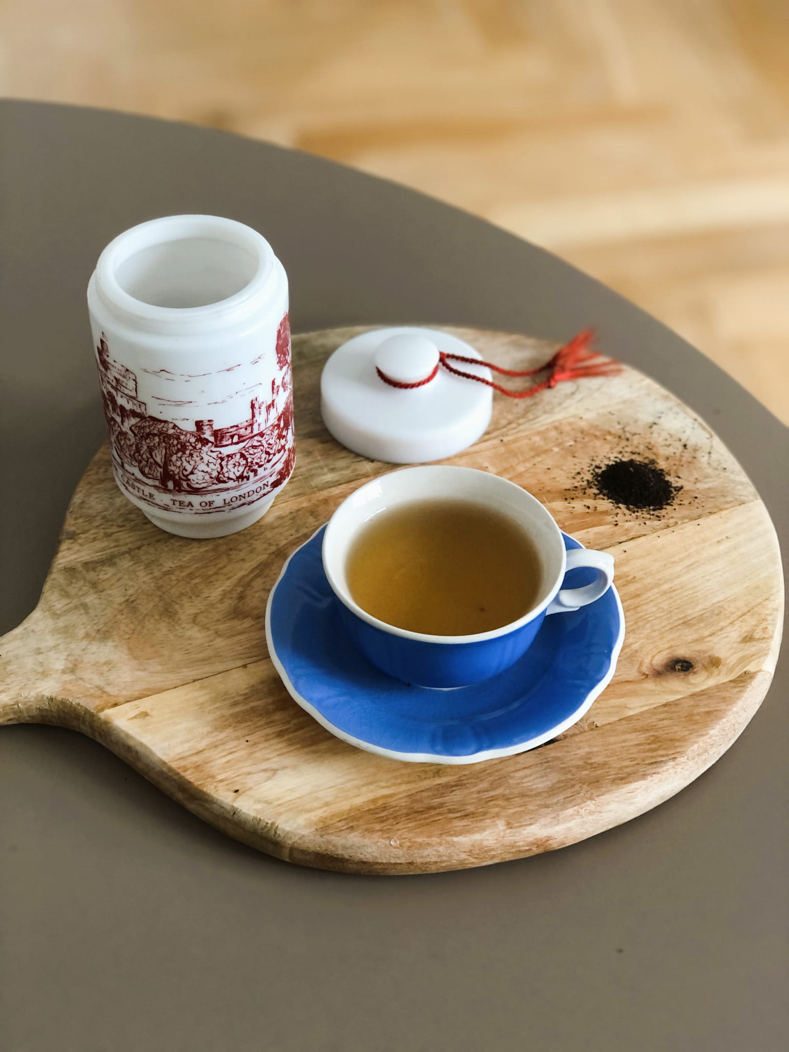 Pojemnik na herbatę, mleczne szkło z czerwonymi zdobieniami.
