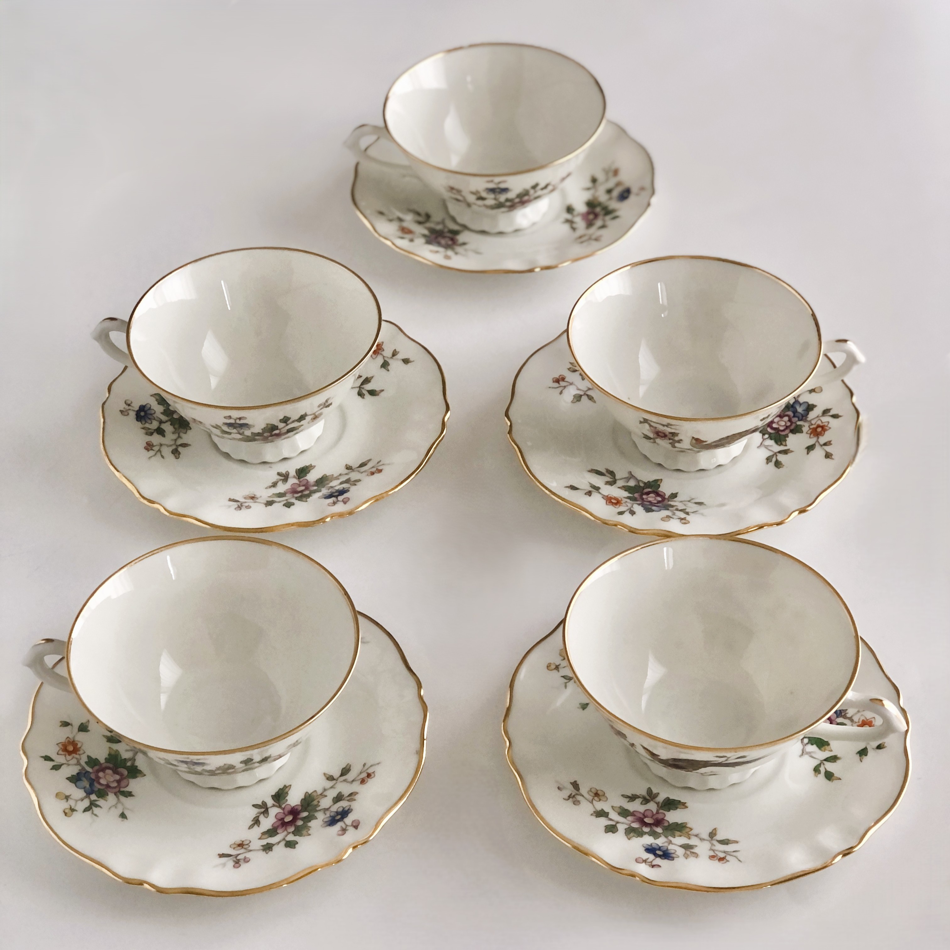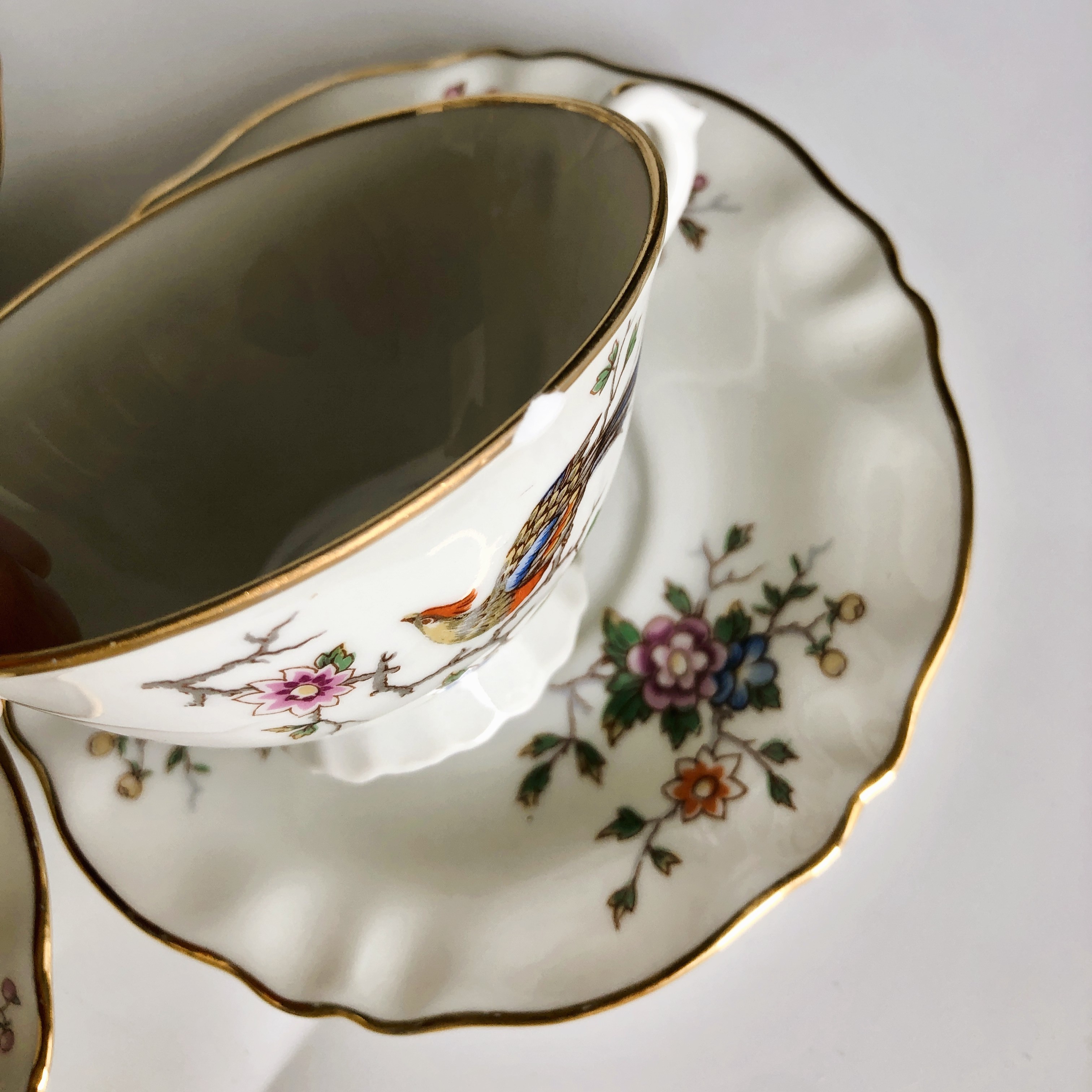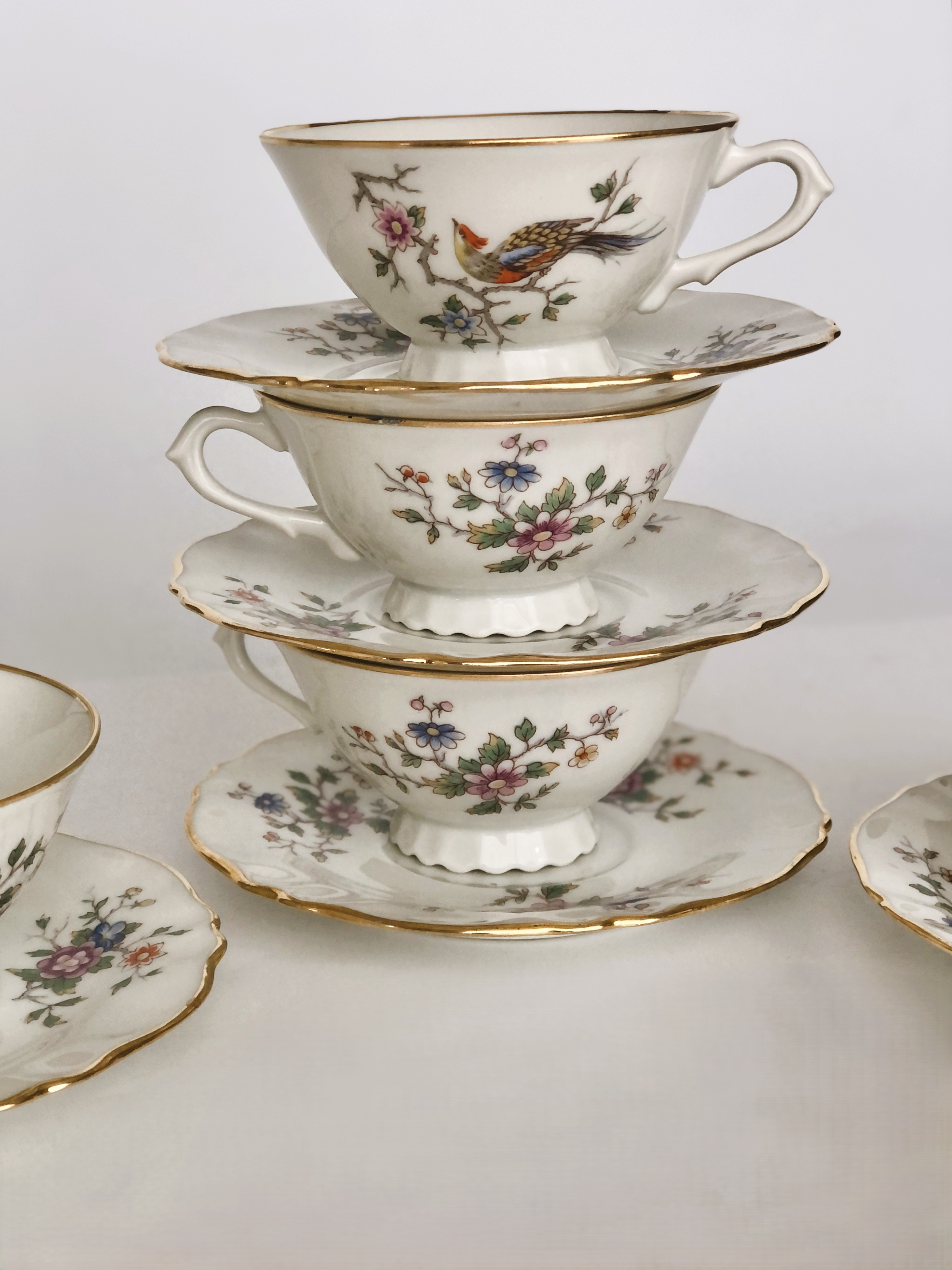 Filiżanki z wysokiej jakości porcelany z Limoges (mieszanka kaolinu, skalenia i kwarcu) biała, gładka o eleganckiej powierzchni z motywem tzw "rajskiego ptaka" oraz złoceniami zachowanymi w bardzo dobrym stanie.