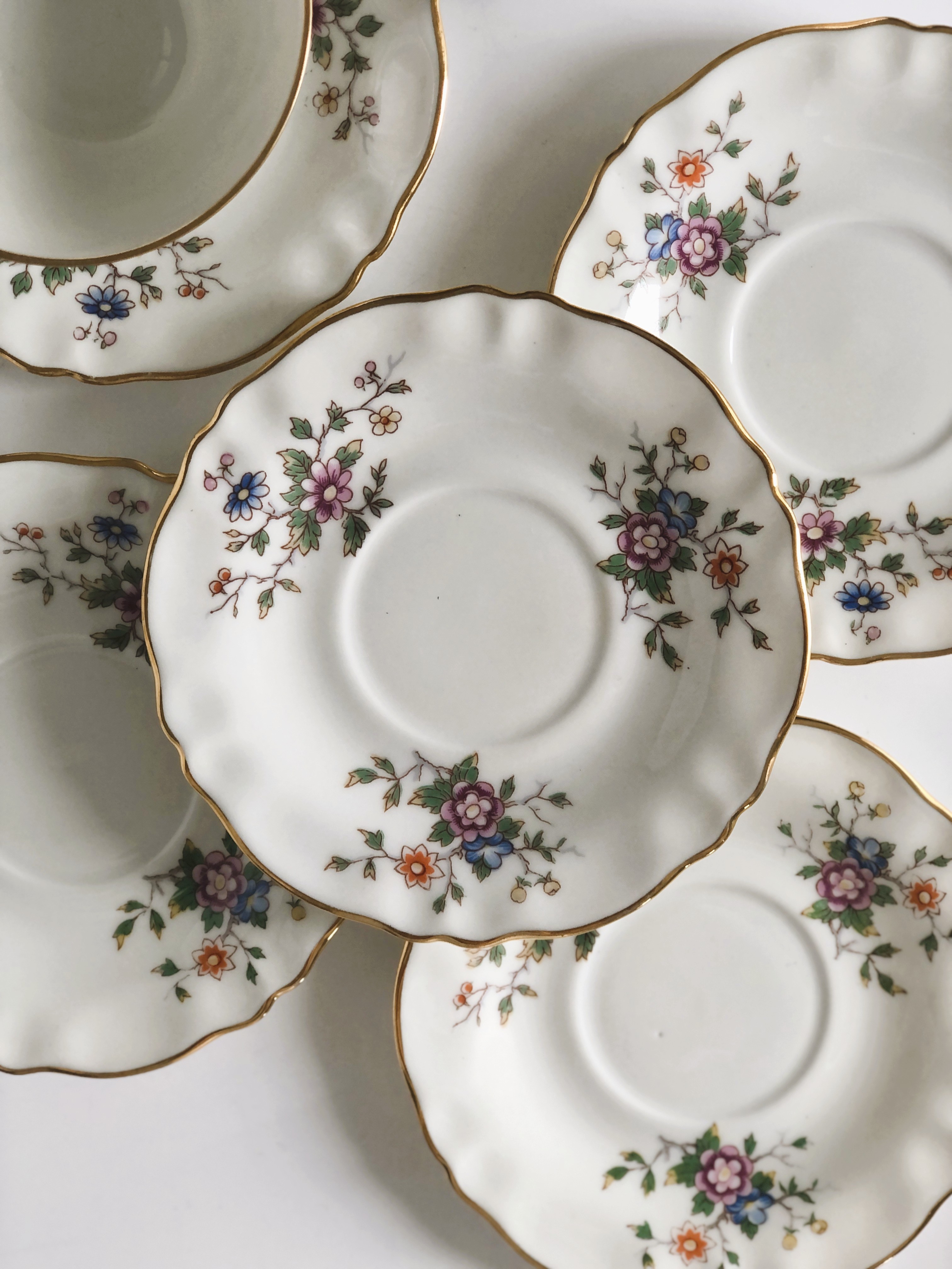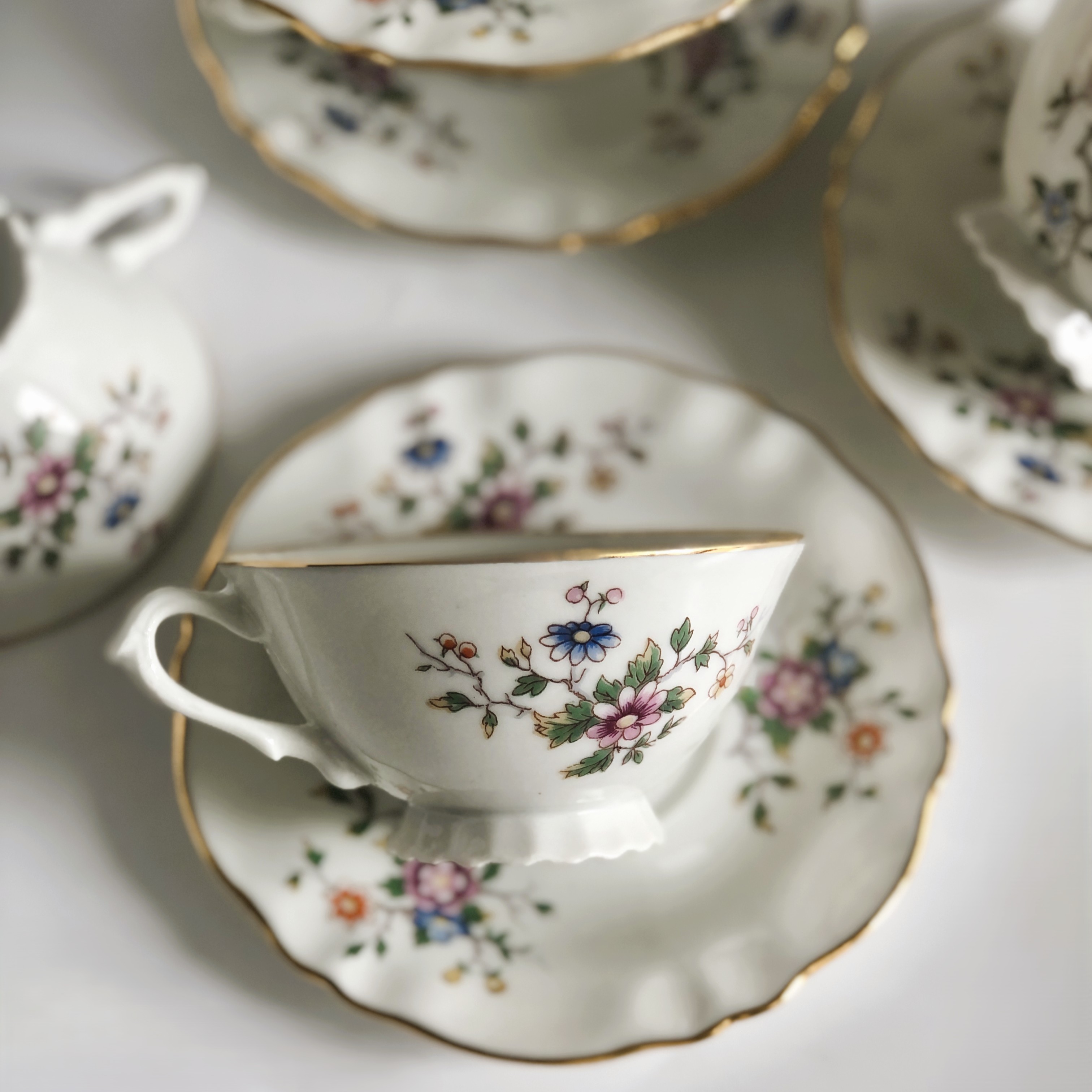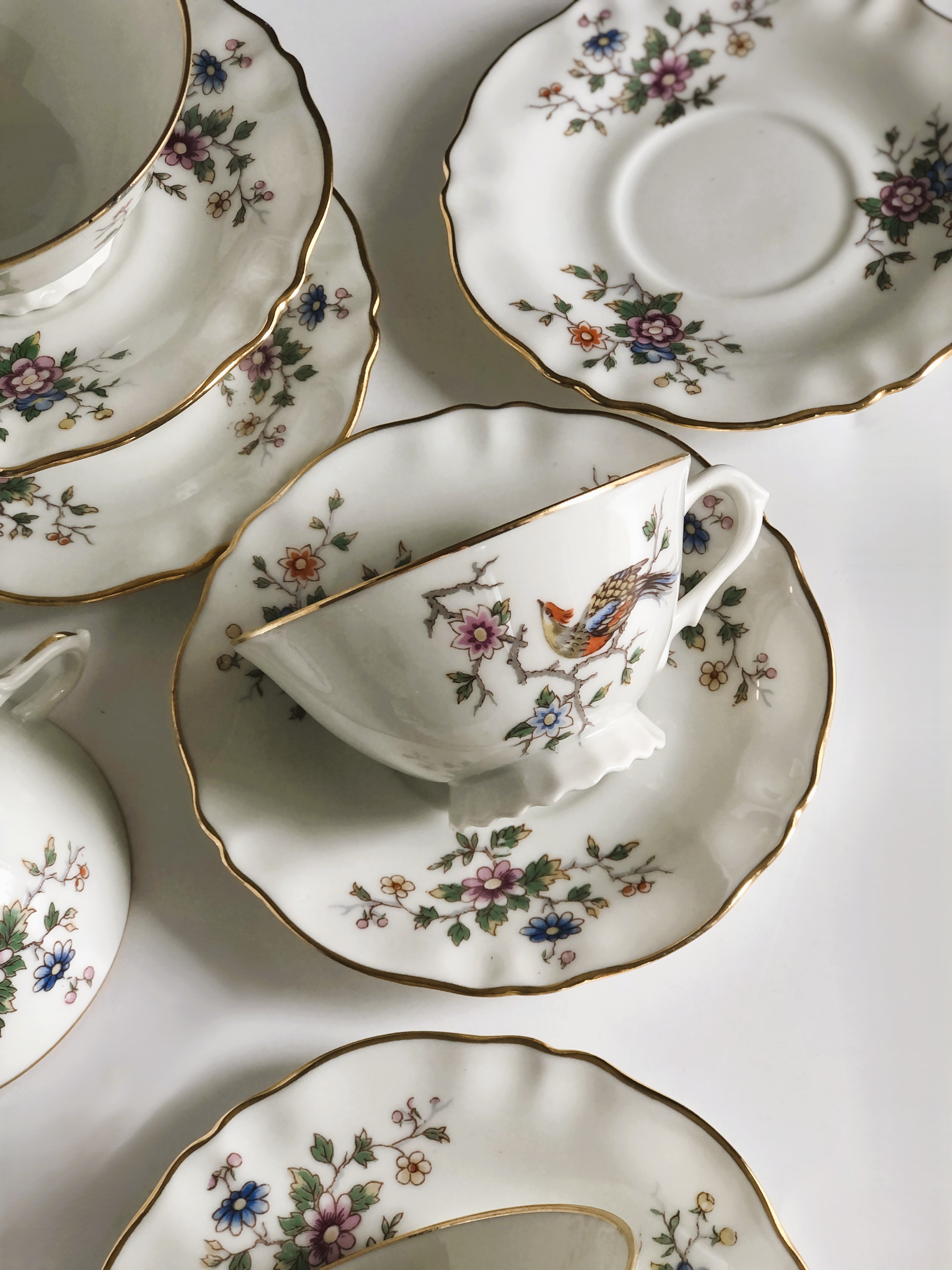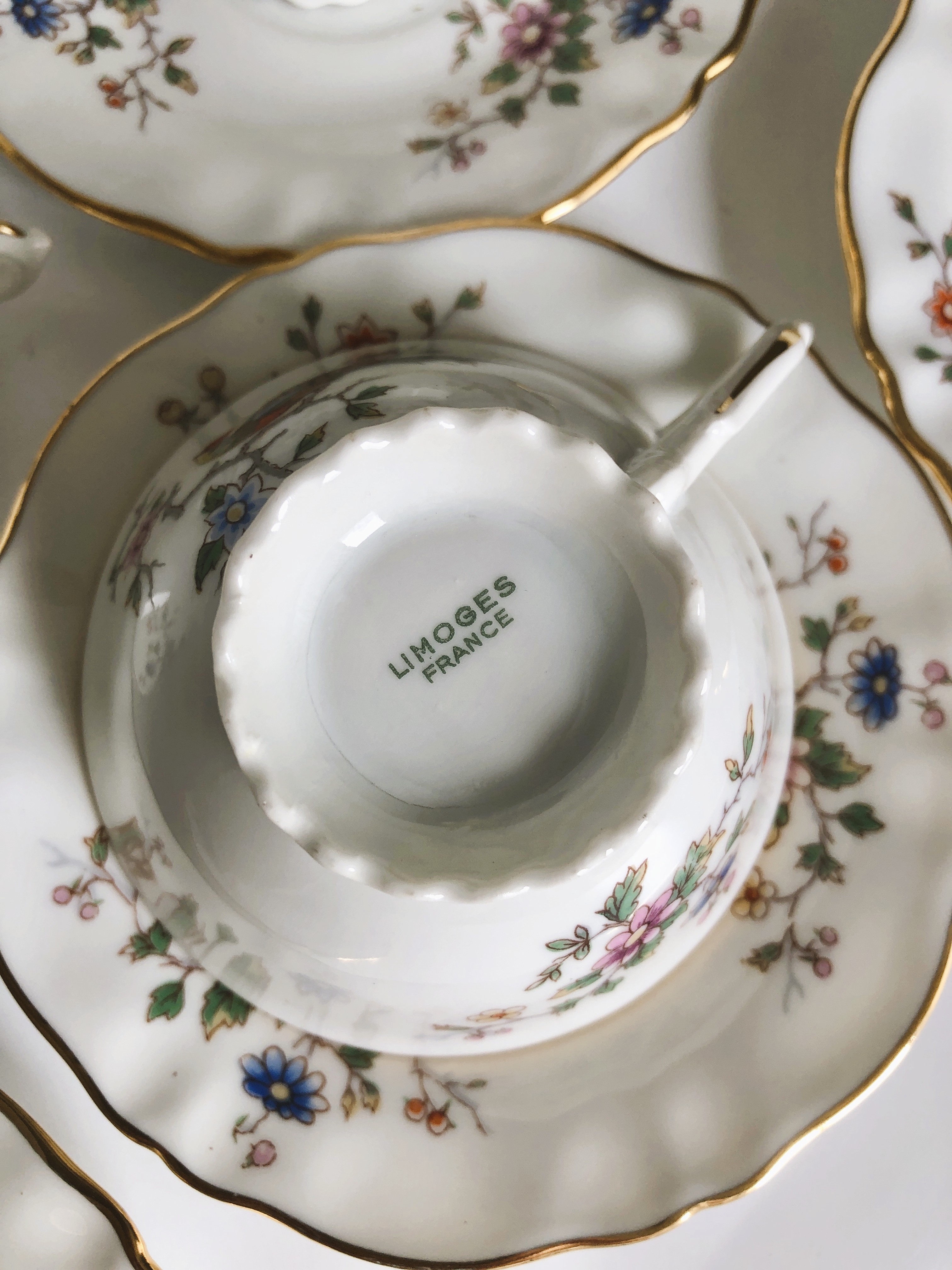 Filiżanki z wysokiej jakości porcelany z Limoges (mieszanka kaolinu, skalenia i kwarcu) biała, gładka o eleganckiej powierzchni z motywem tzw "rajskiego ptaka" oraz złoceniami zachowanymi w bardzo dobrym stanie.
