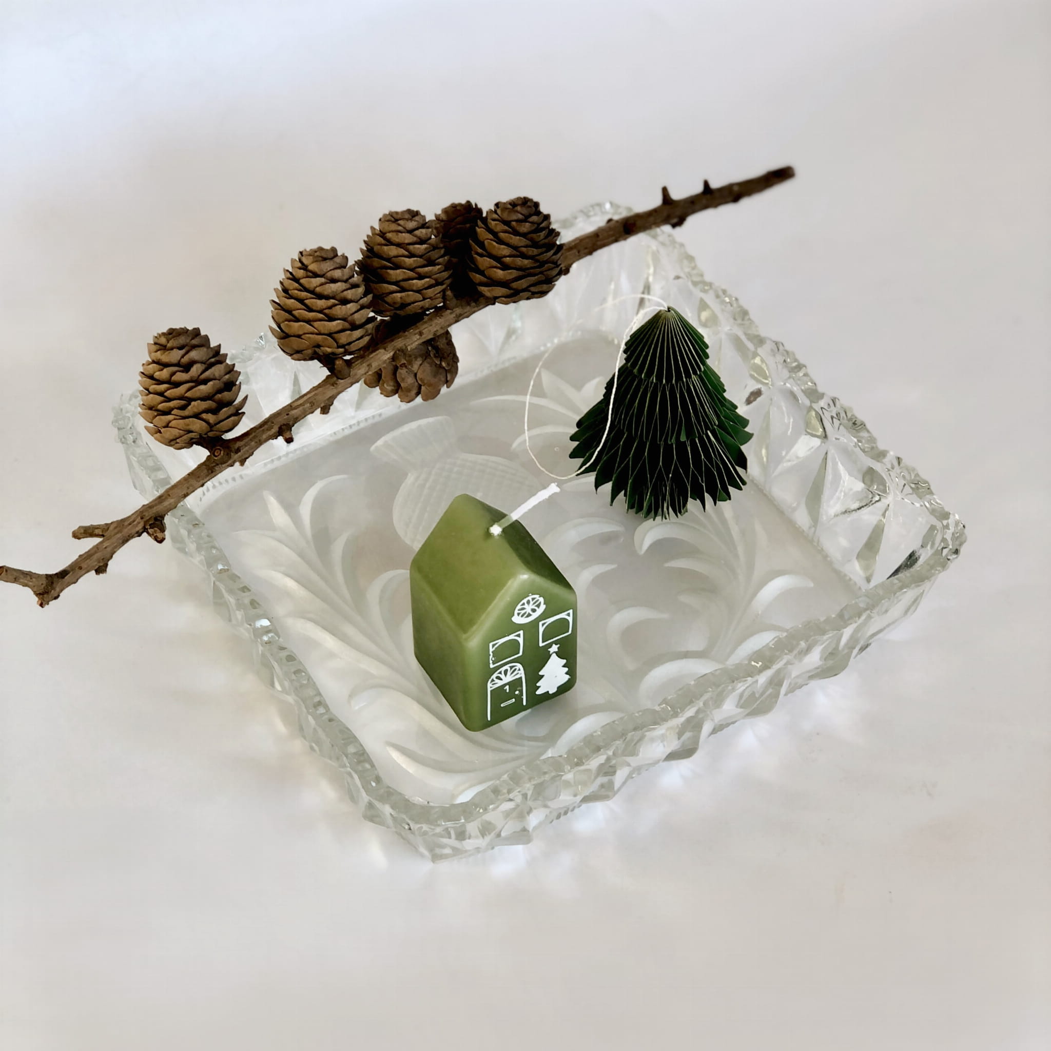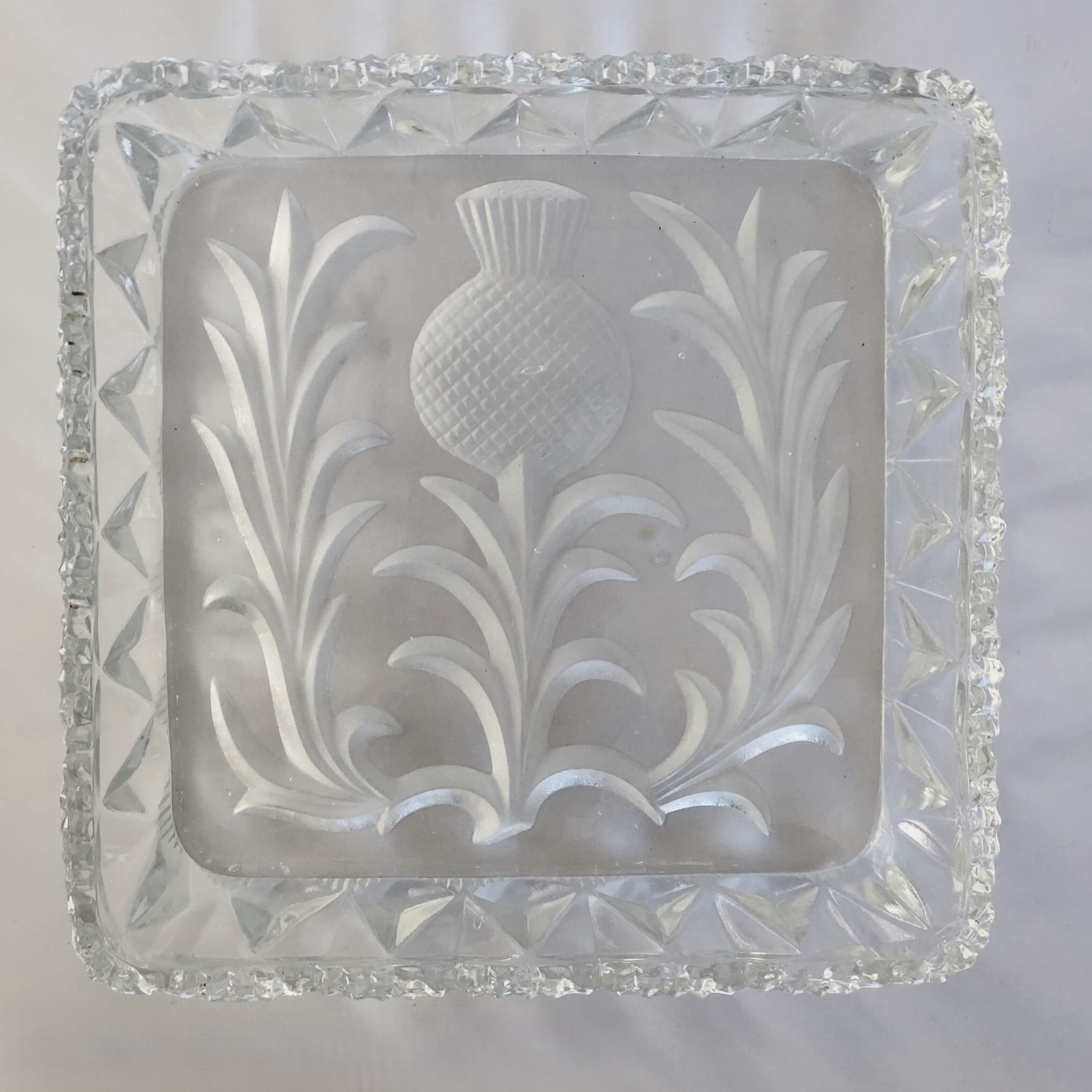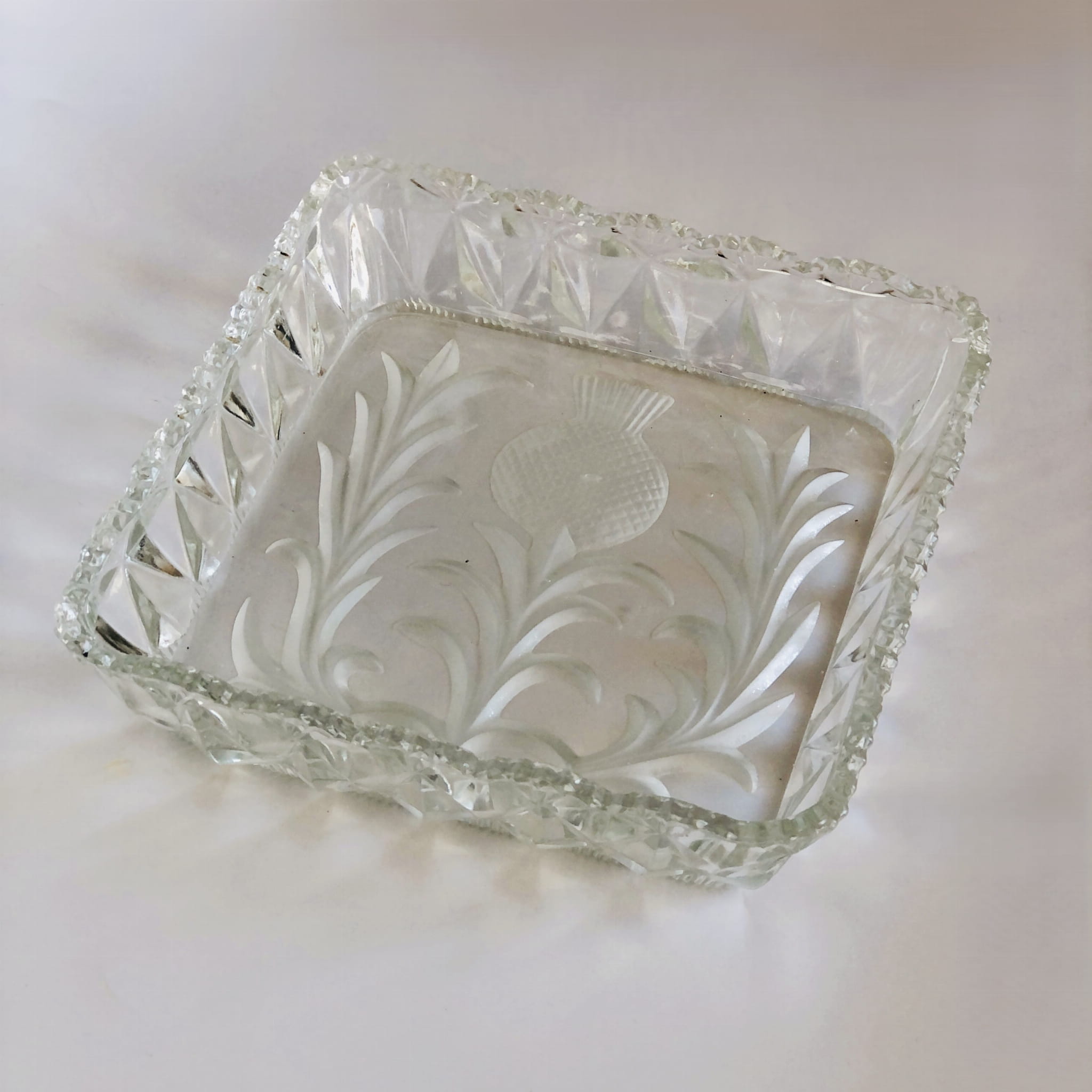 Miska o wymiarach 20x20cm, ząbkowany rant, zmatowiony wzór ostu na dnie misy.