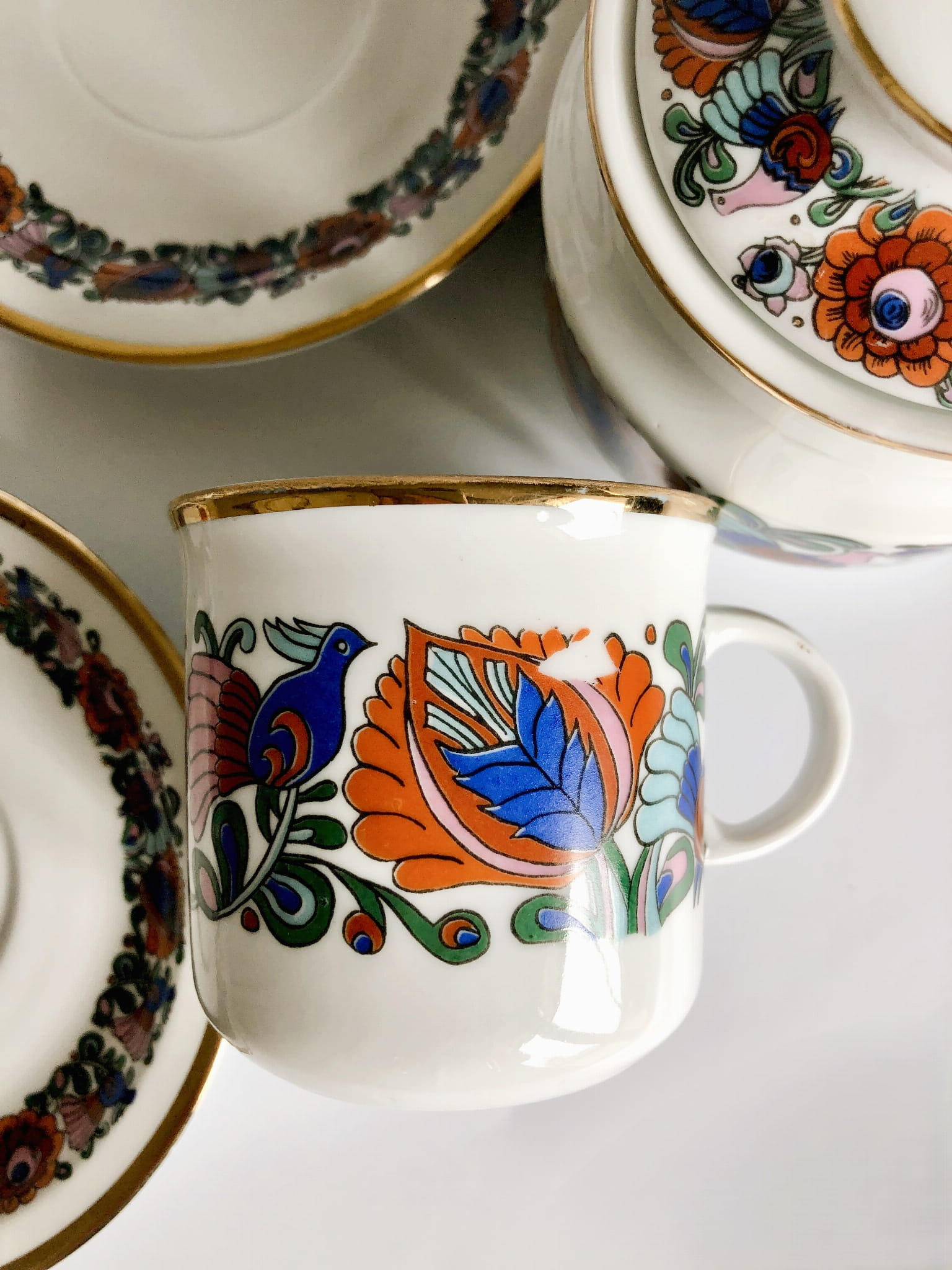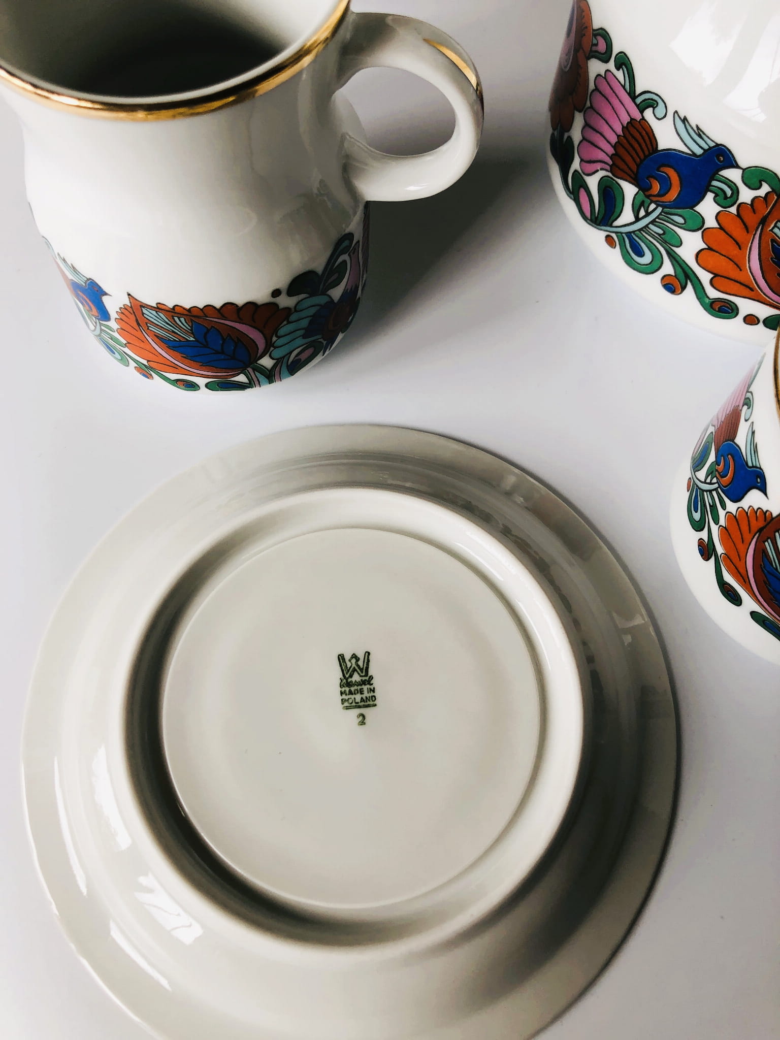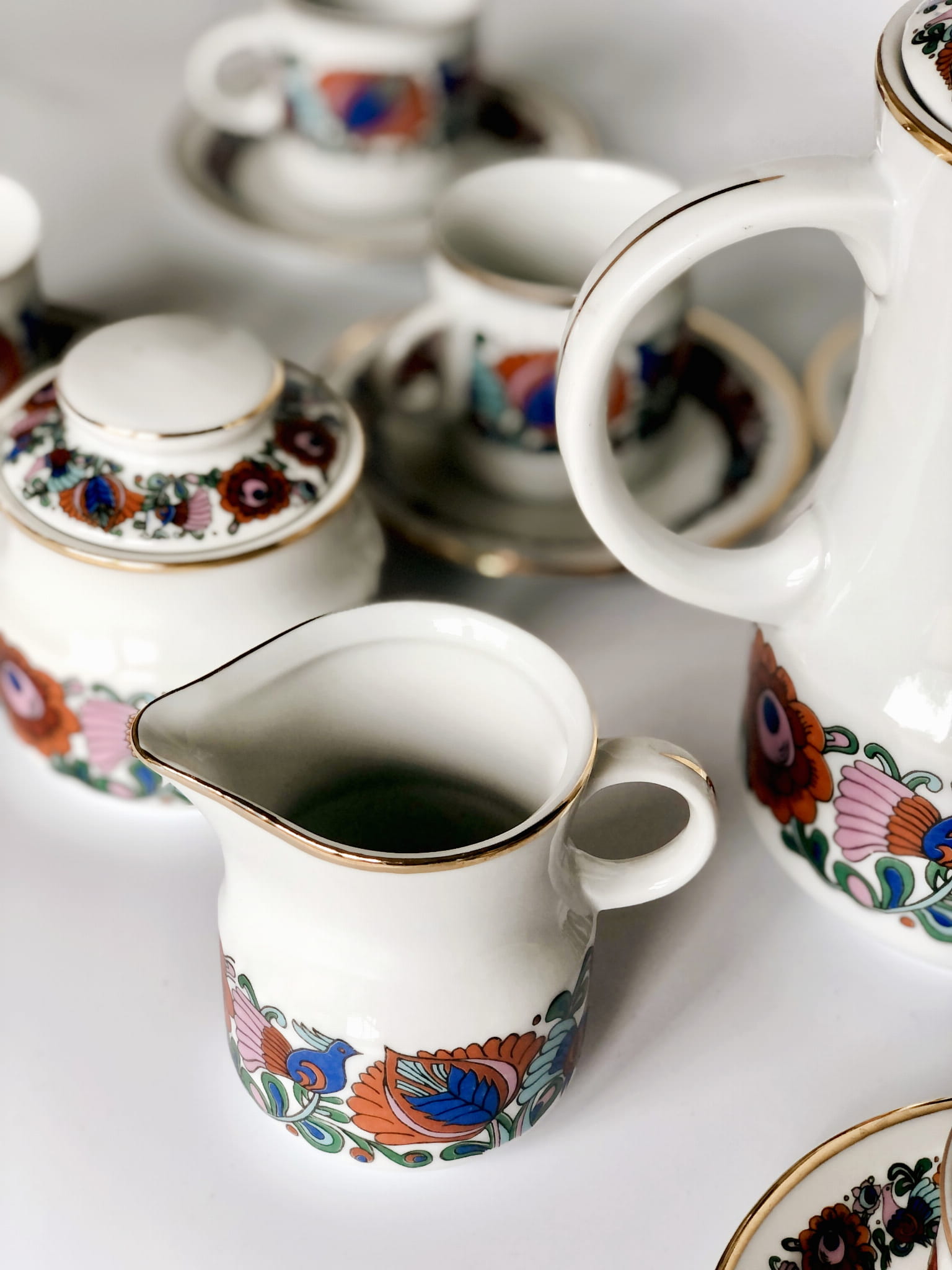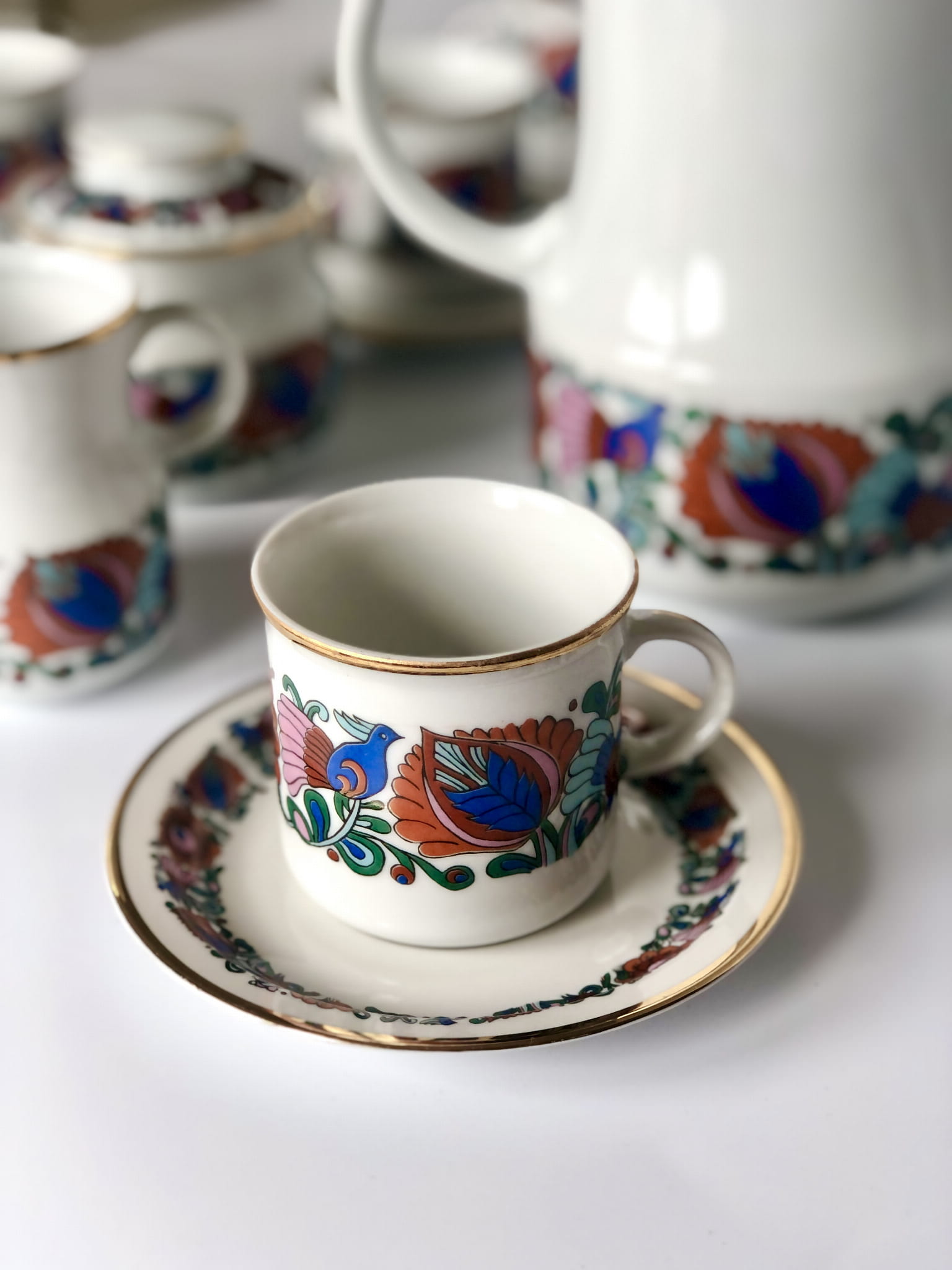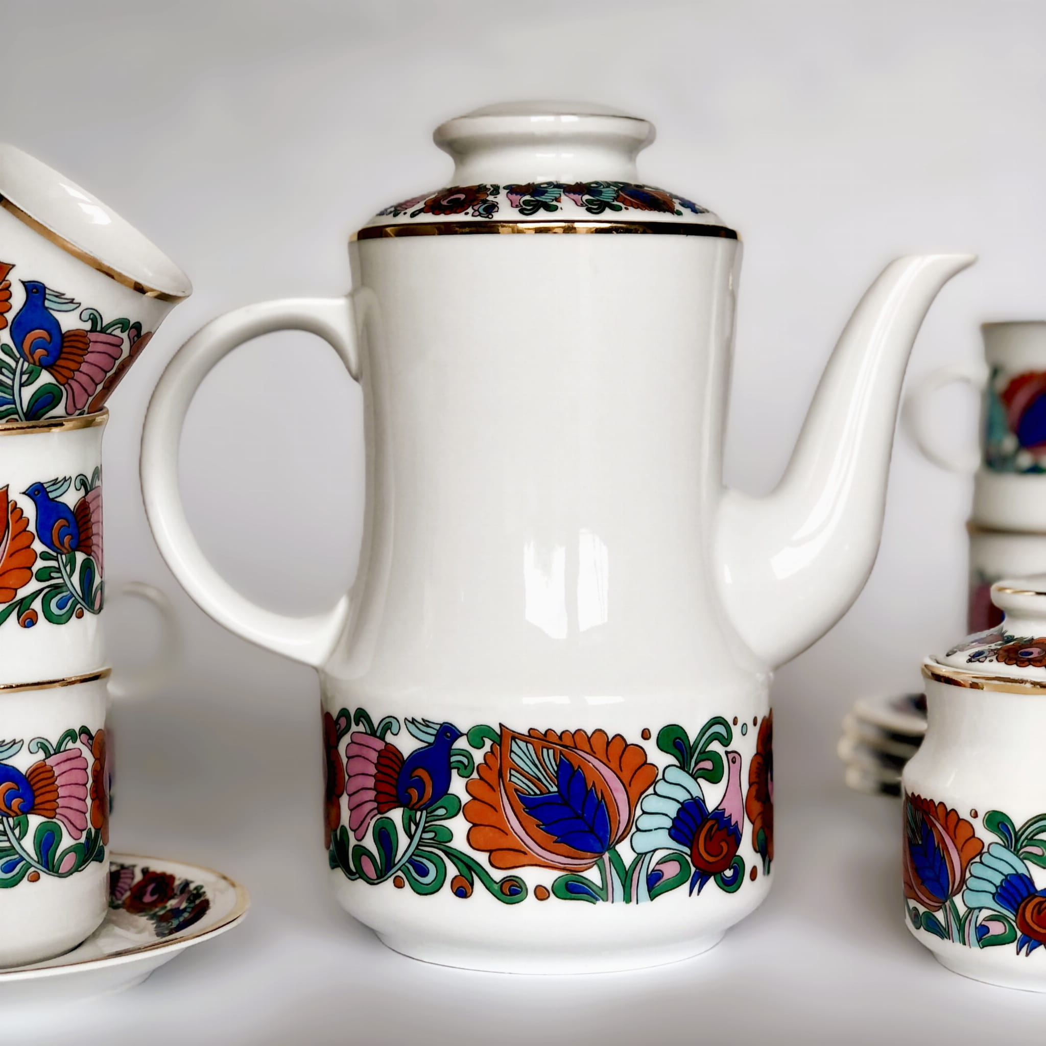 Serwis, porcelana szkliwiona, wzór inspirowany folkowymi motywami, kolorowe ptaki oraz kwiaty, ranty złocone.