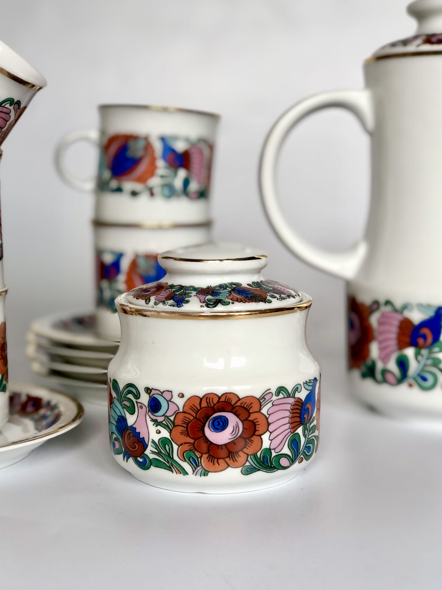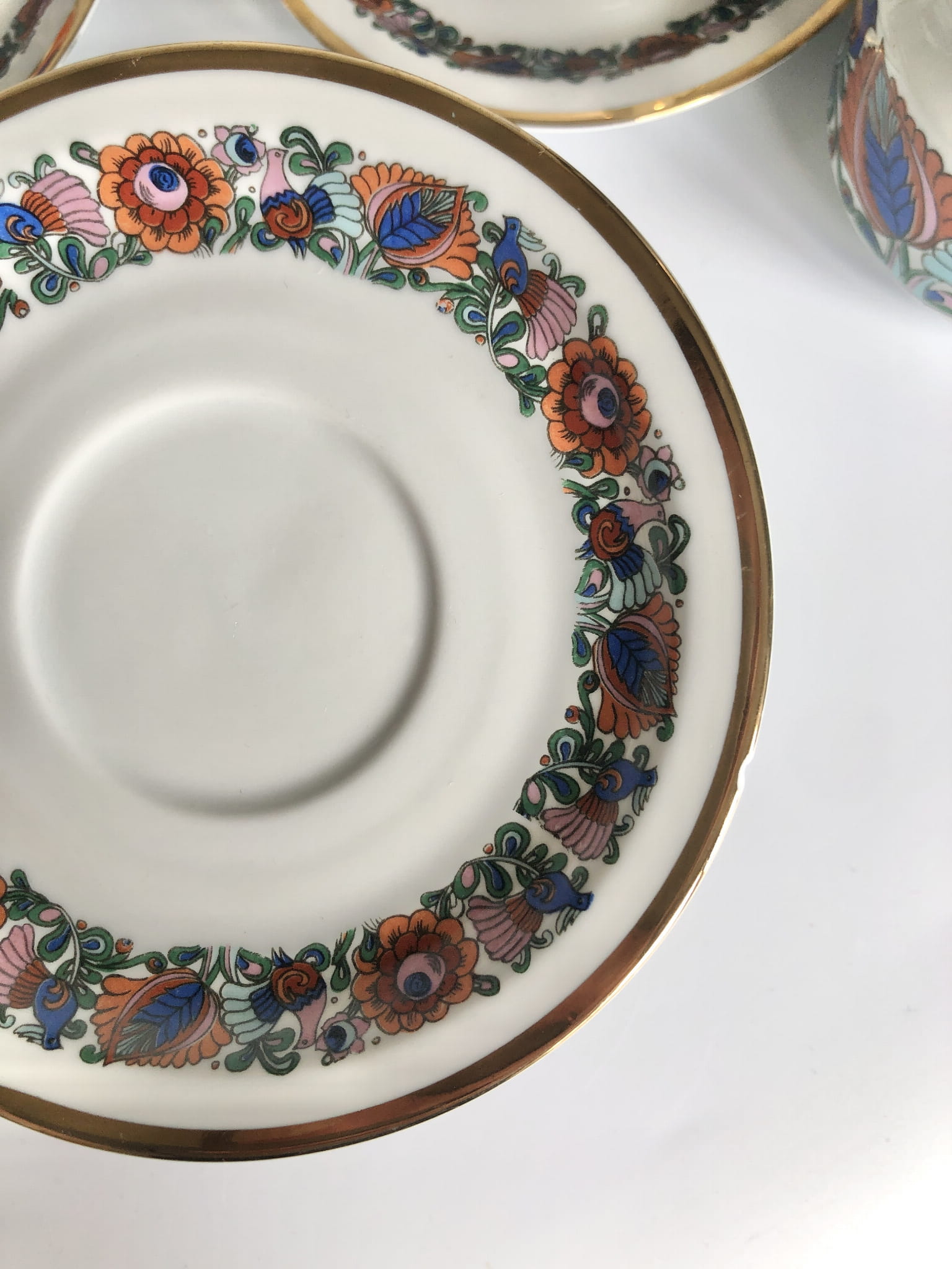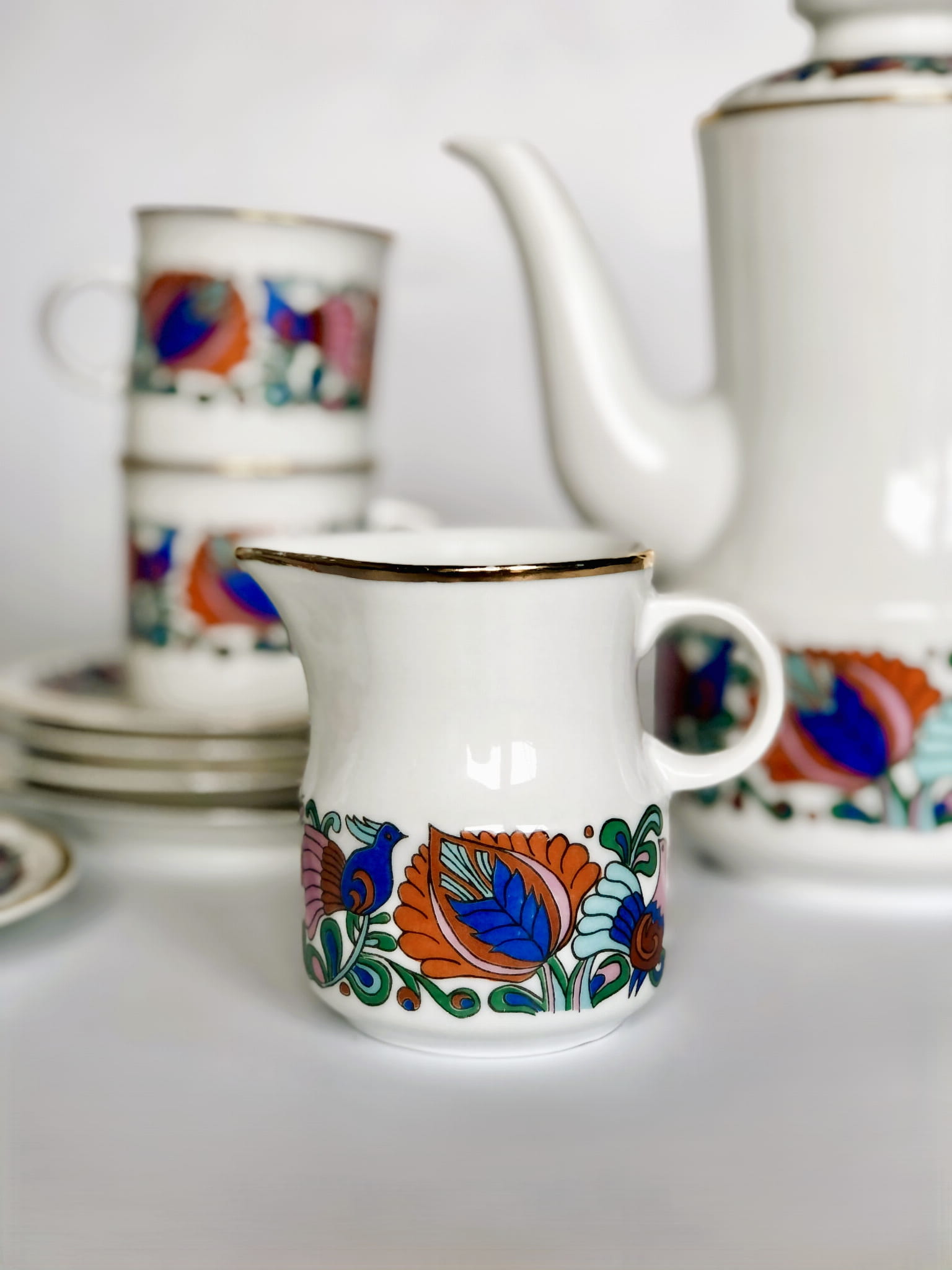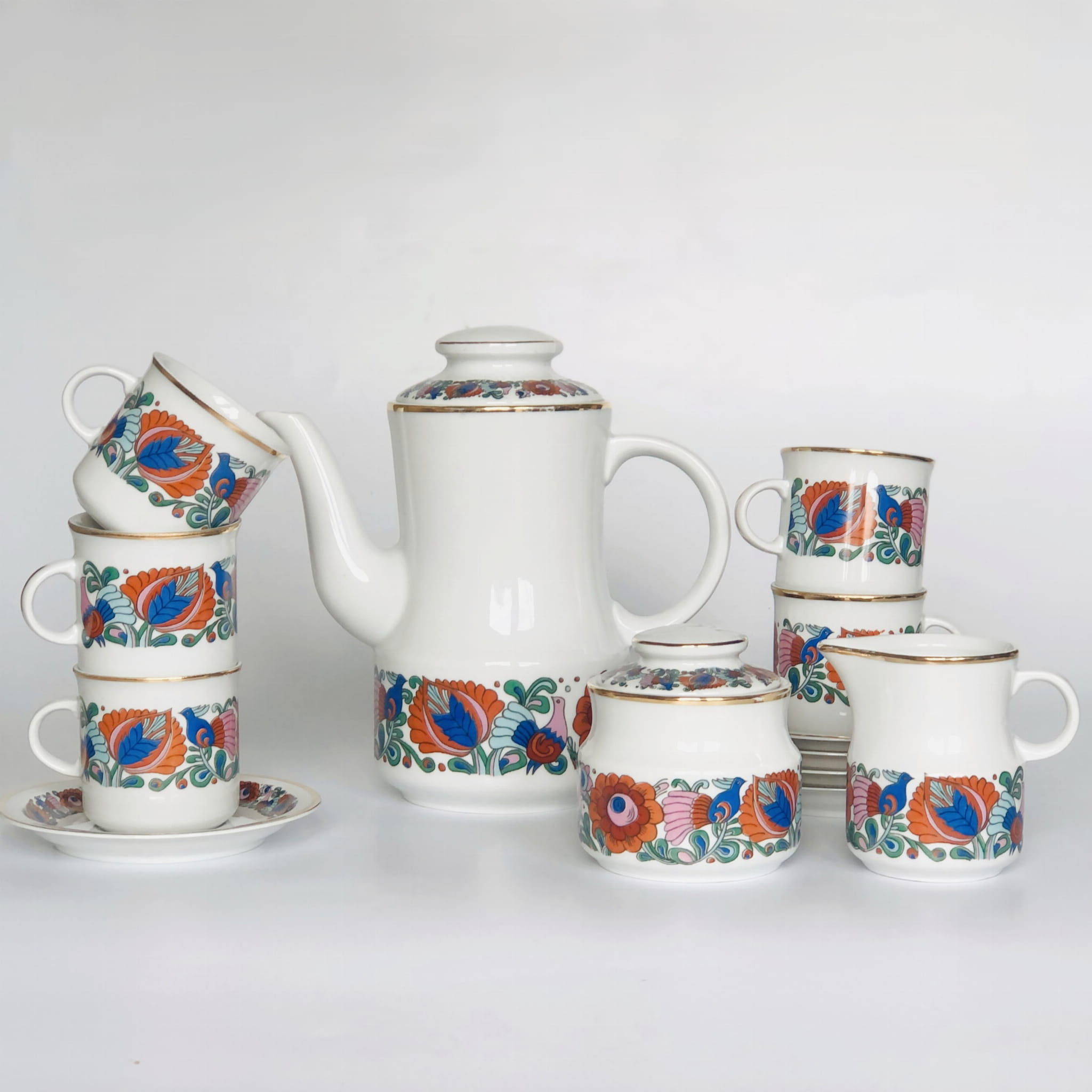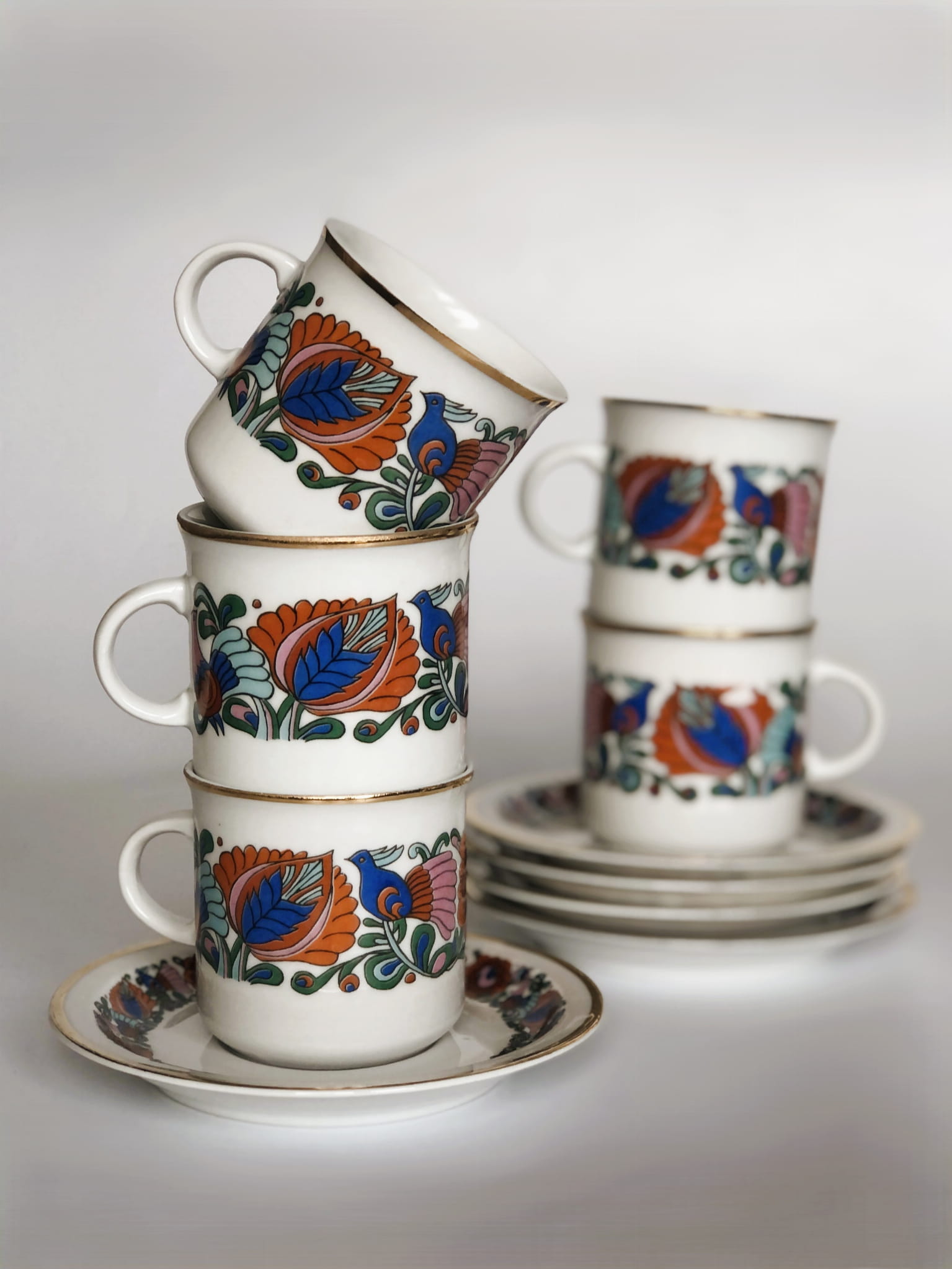 Serwis, porcelana szkliwiona, wzór inspirowany folkowymi motywami, kolorowe ptaki oraz kwiaty, ranty złocone.