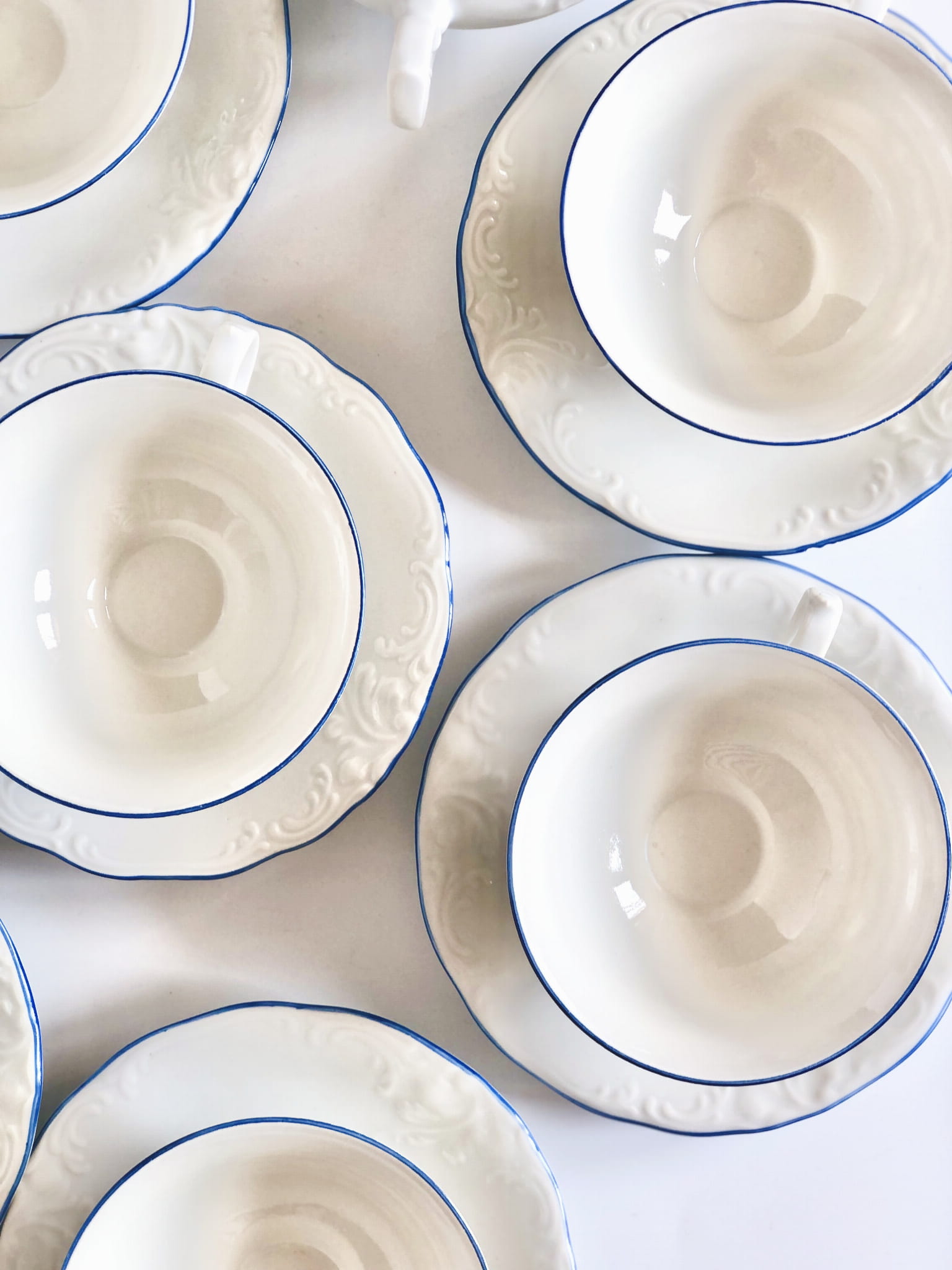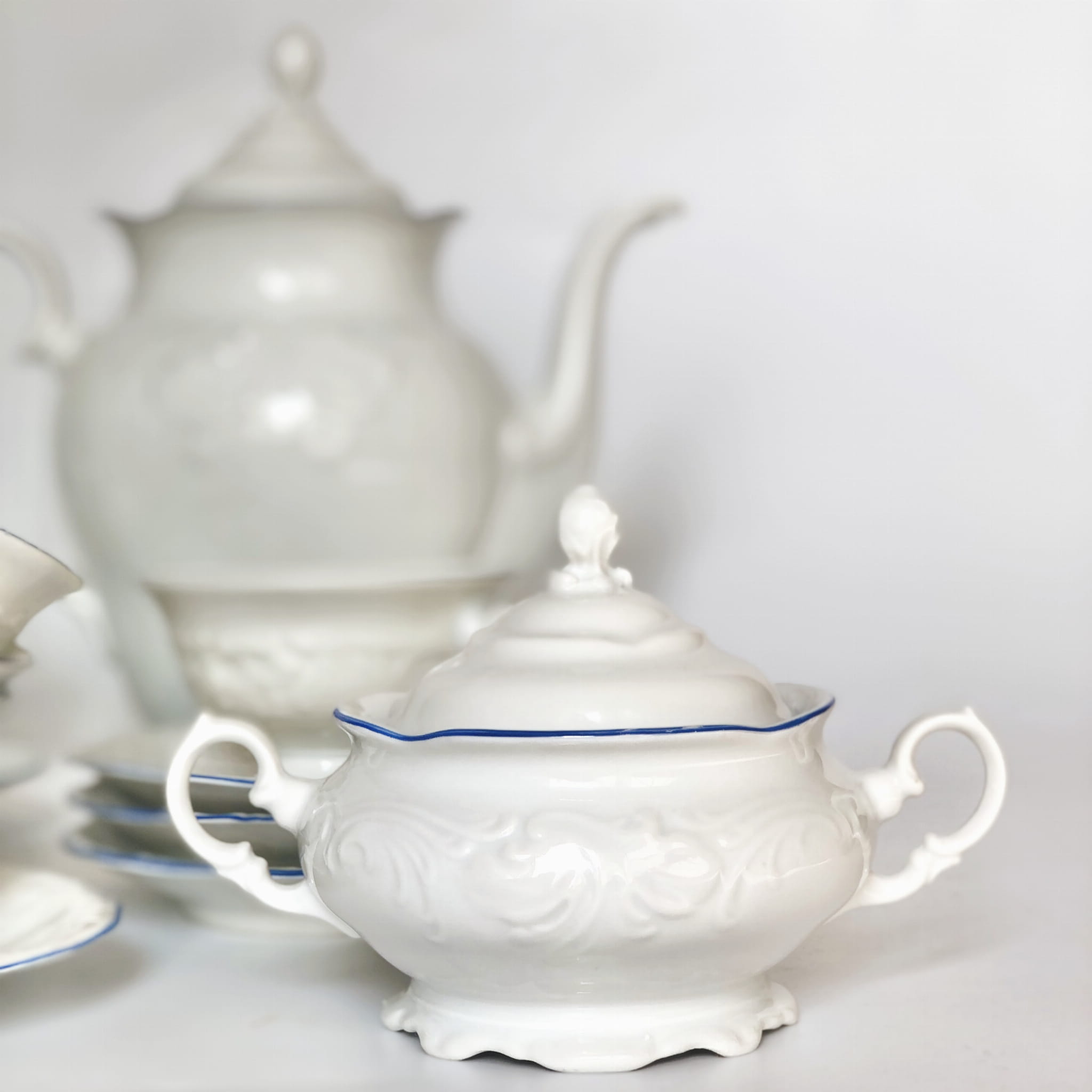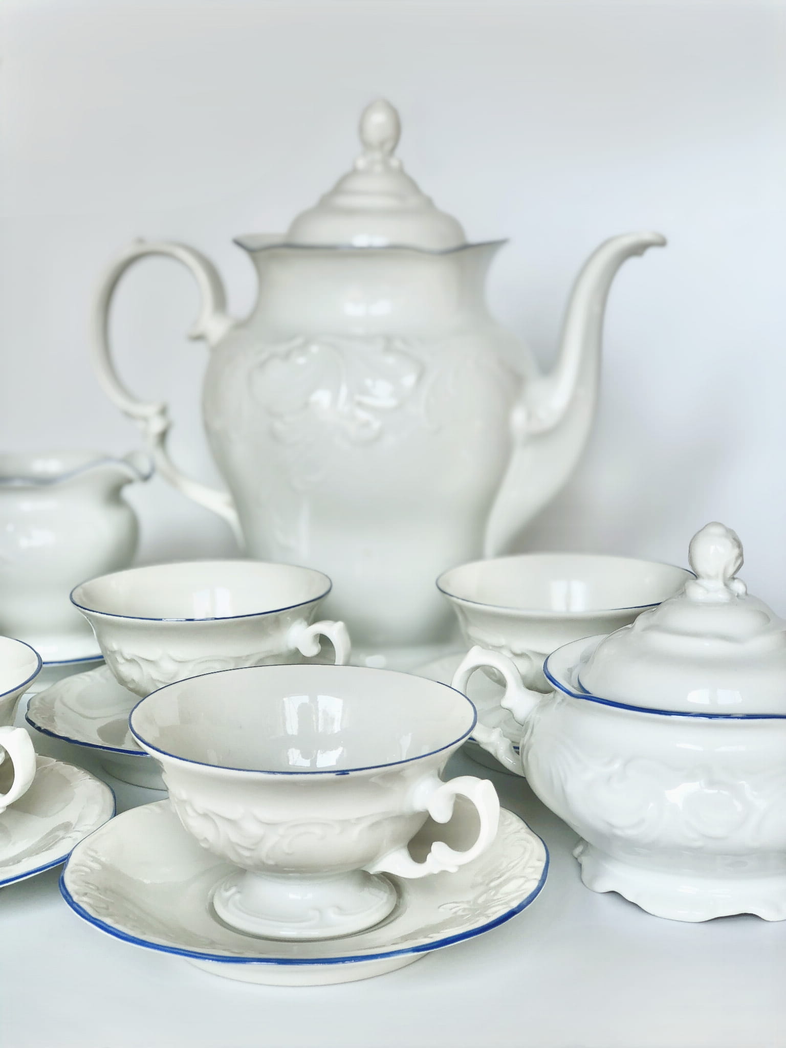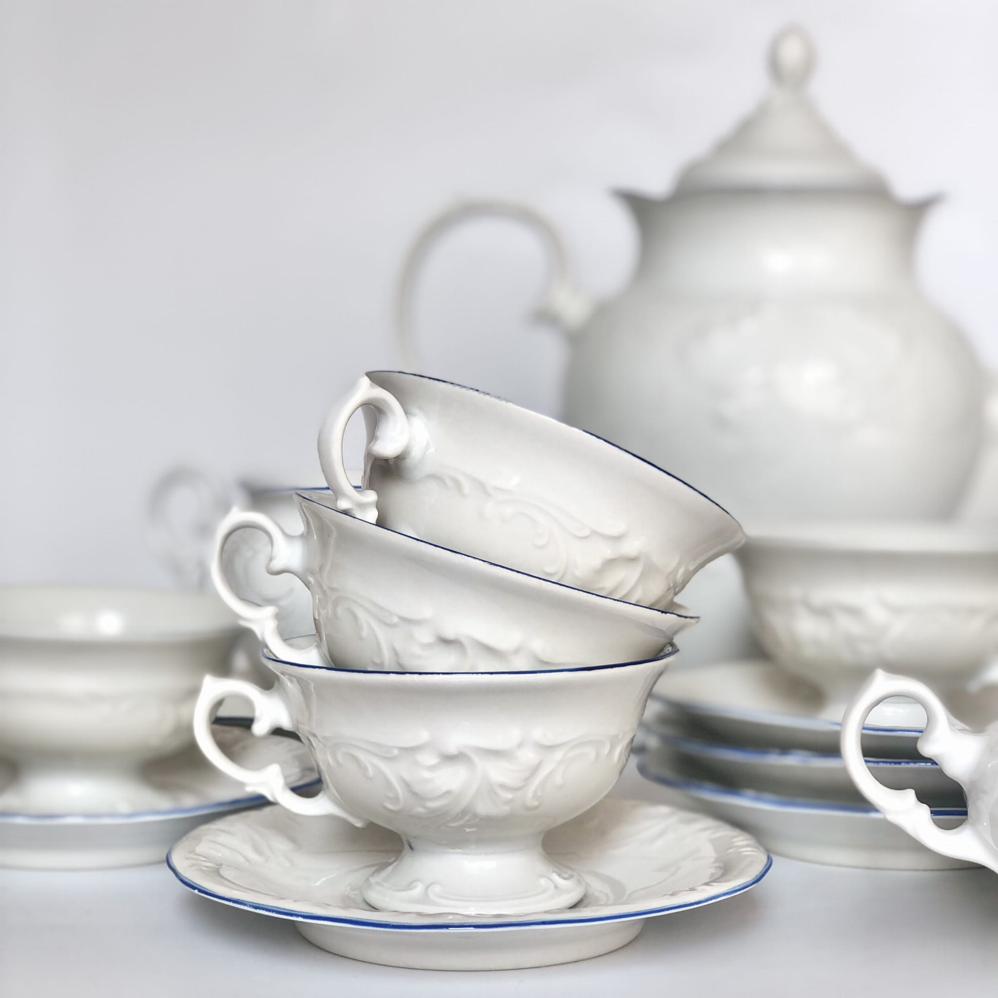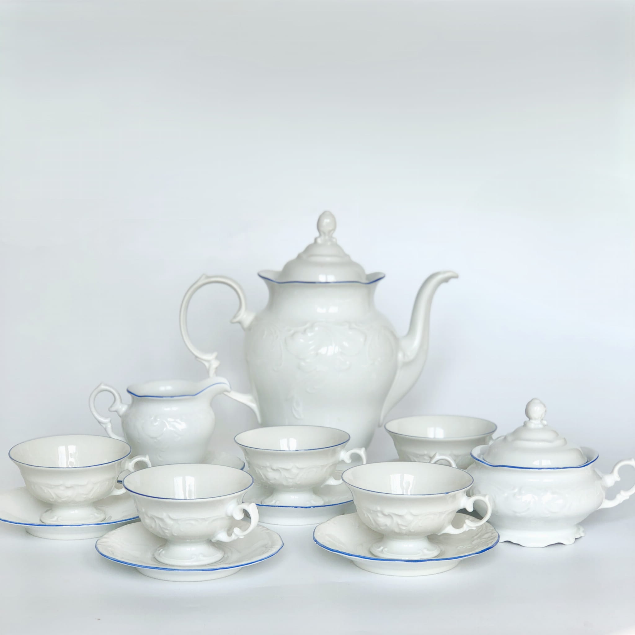 Zestaw wyważony dekoracyjnie, przez co bardzo elegancki. Lazurowy otok i subtelne tłoczenia nadają mu wyjątkowej prezencji.