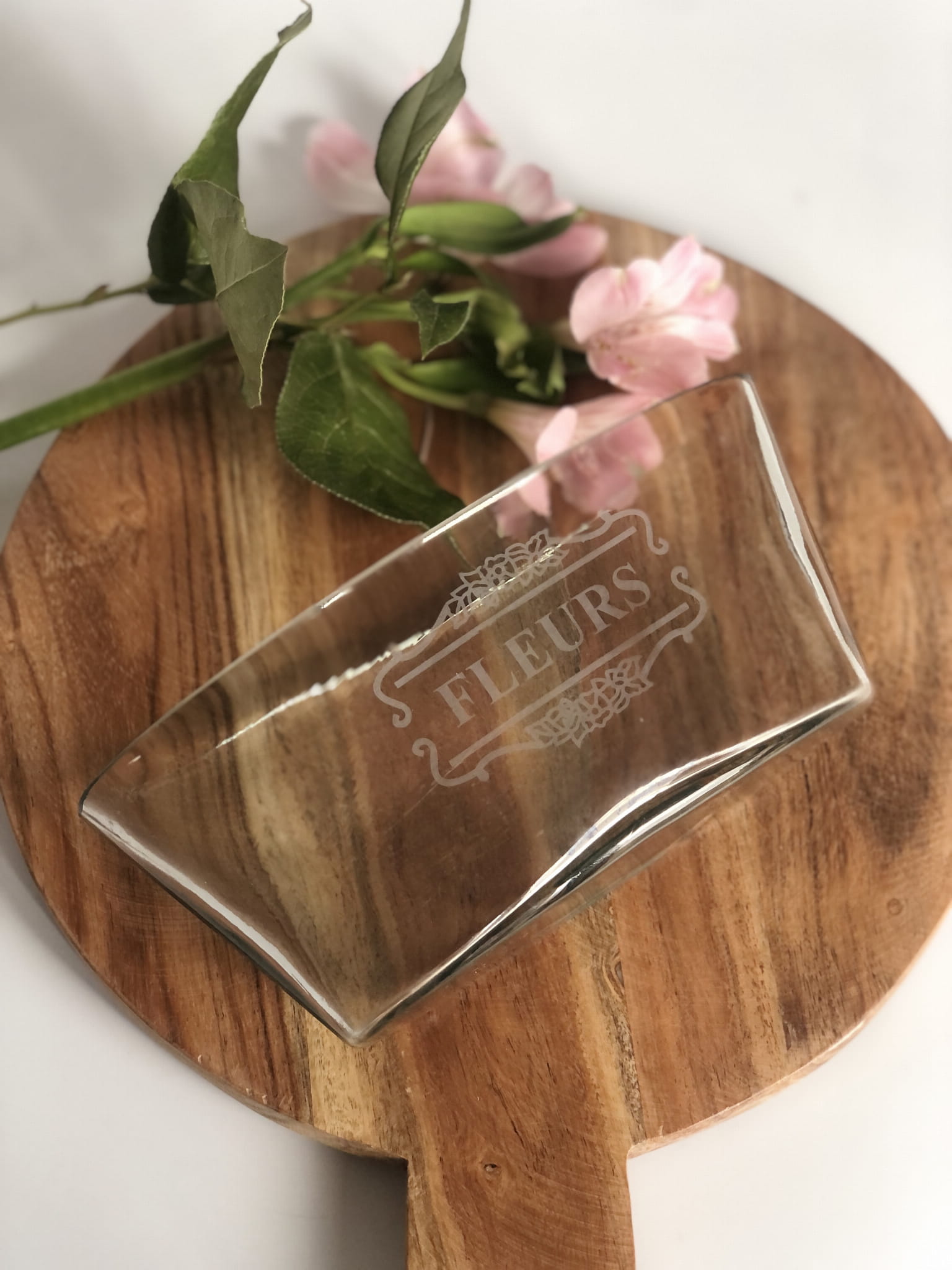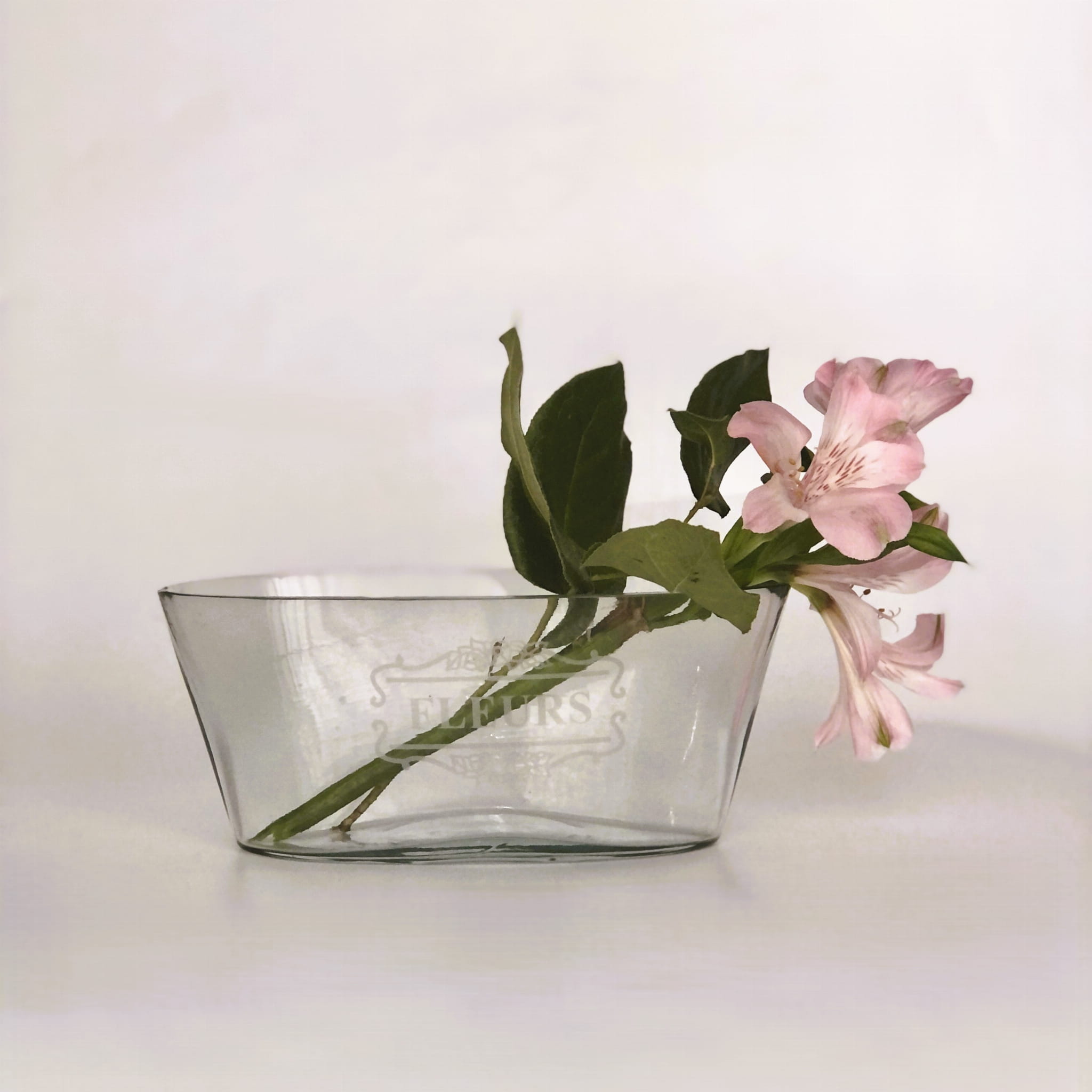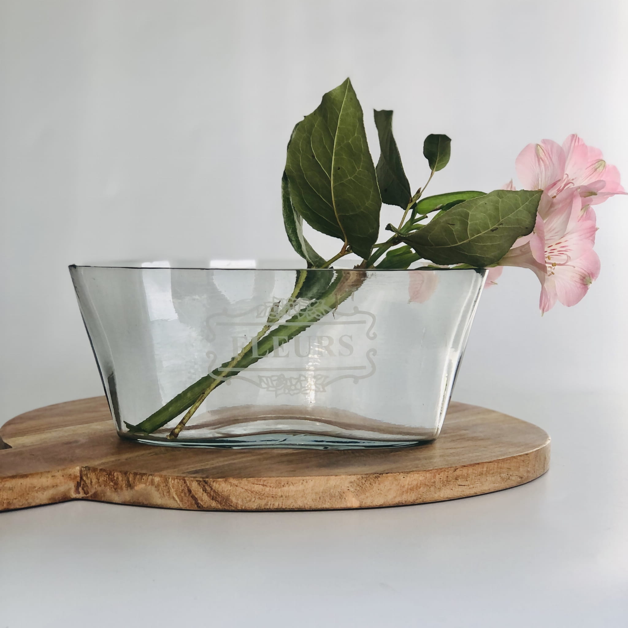 Stylowy, o ciekawym kształcie wazon. Posiada ozdobny napis "Fleurs". Wykonany z grubego szkła.
