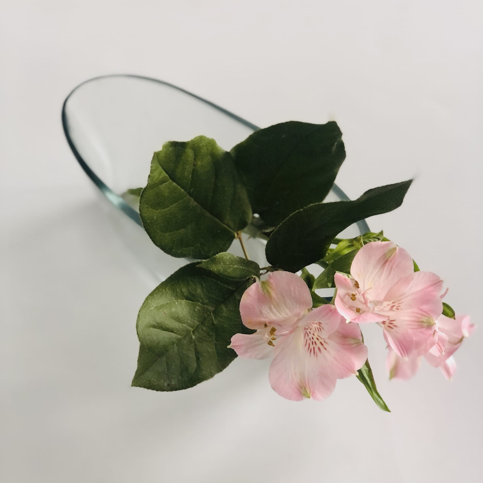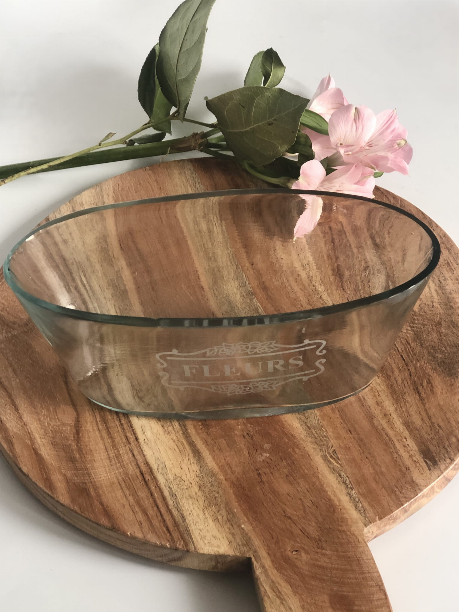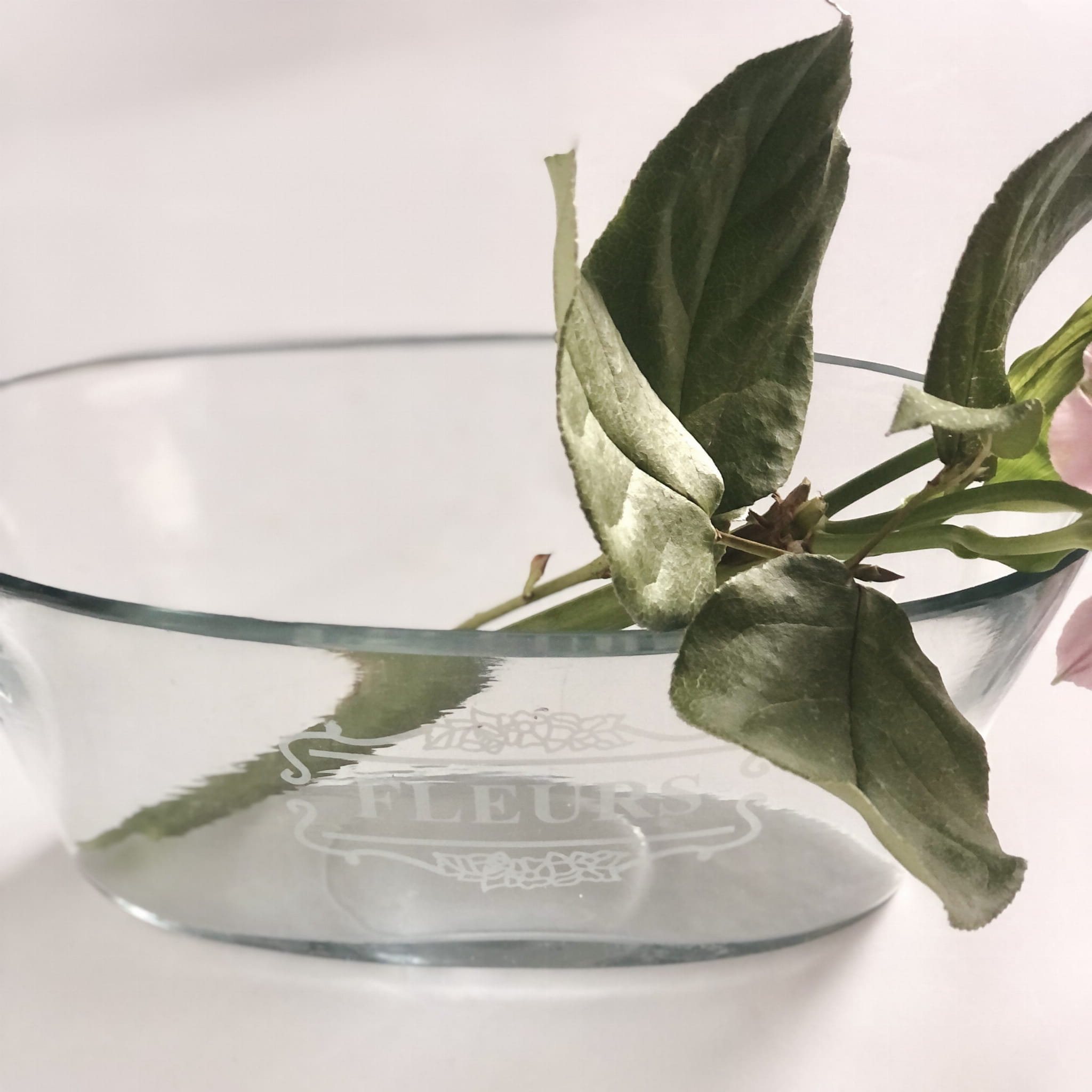 Stylowy, o ciekawym kształcie wazon. Posiada ozdobny napis "Fleurs". Wykonany z grubego szkła.