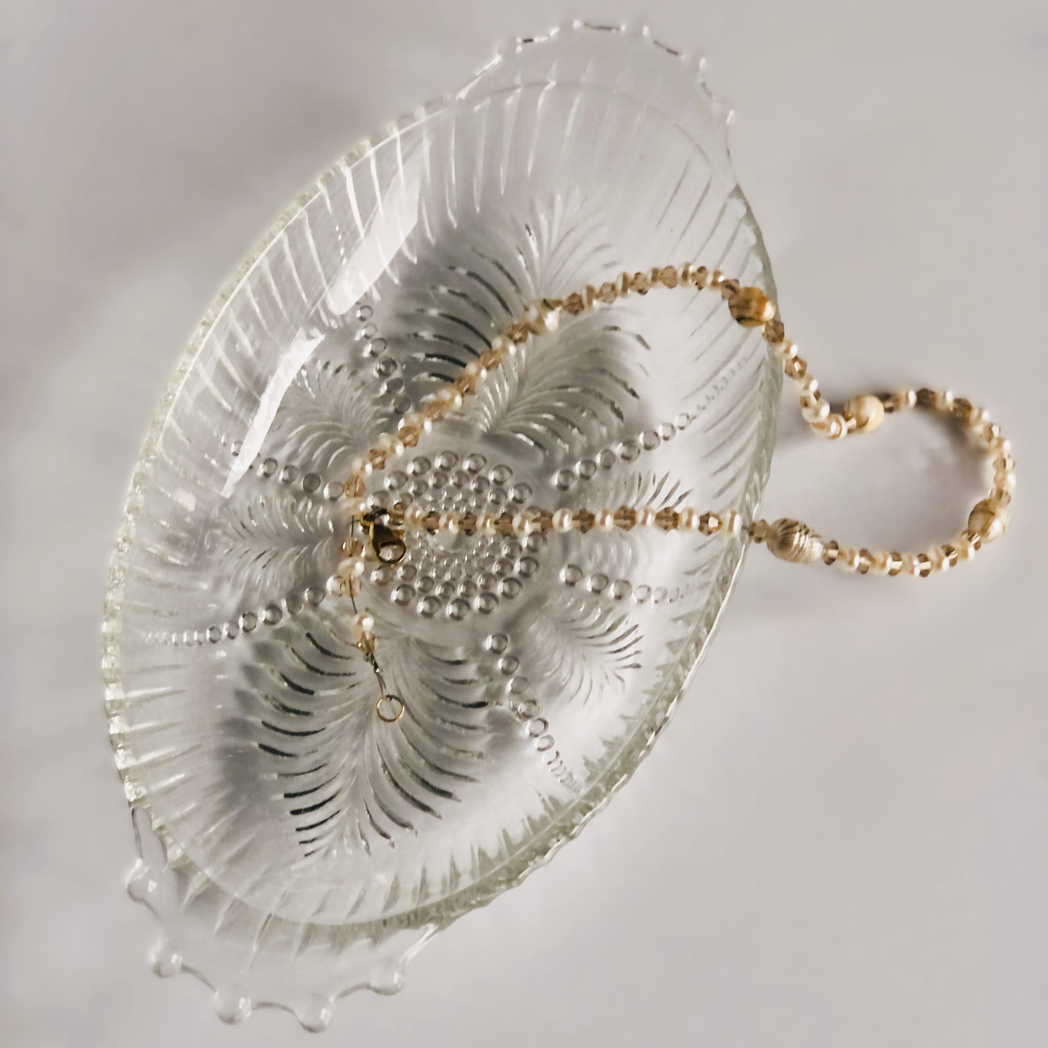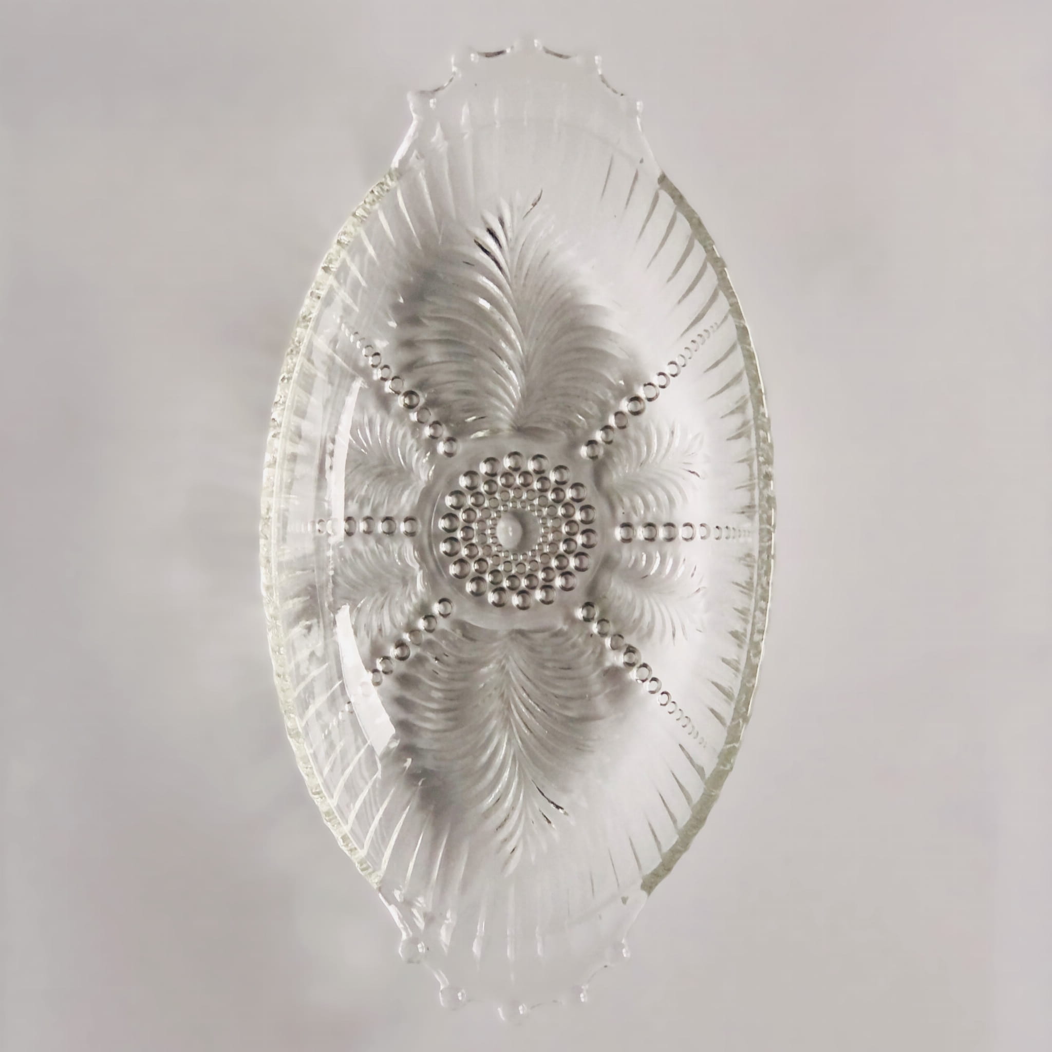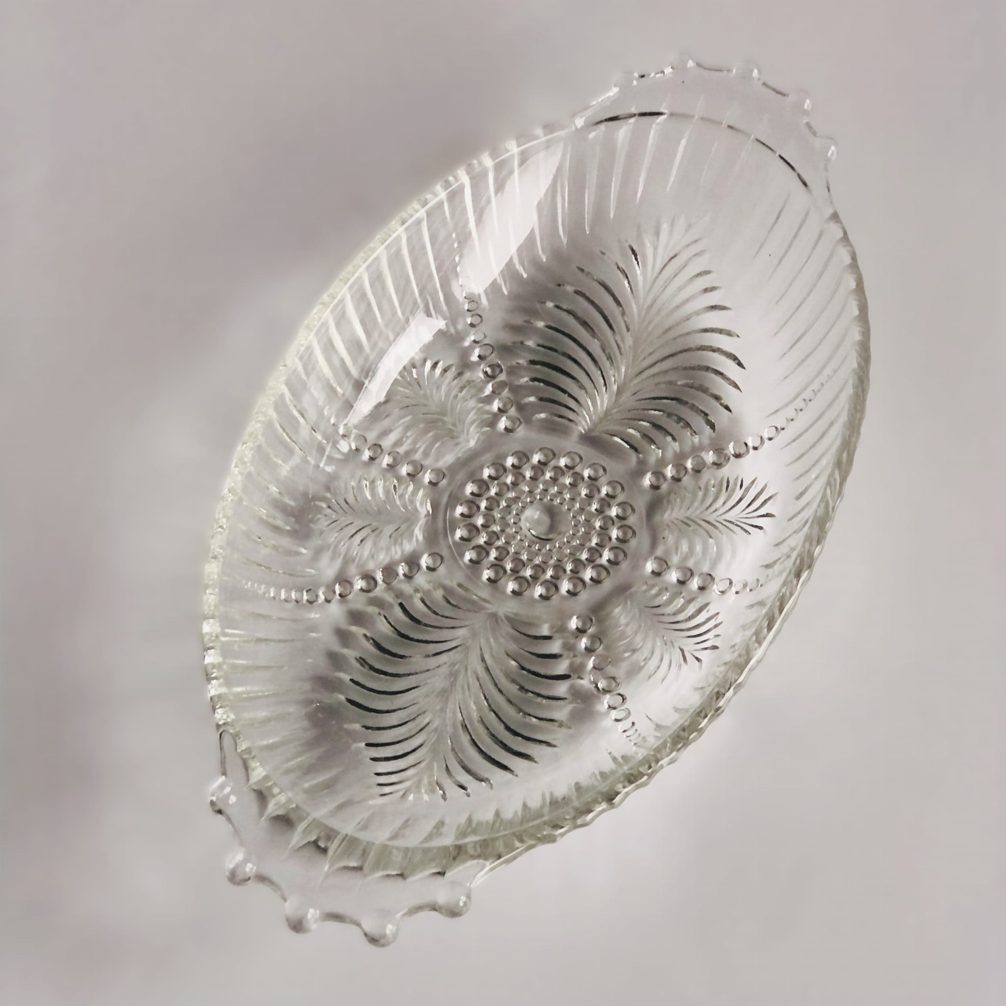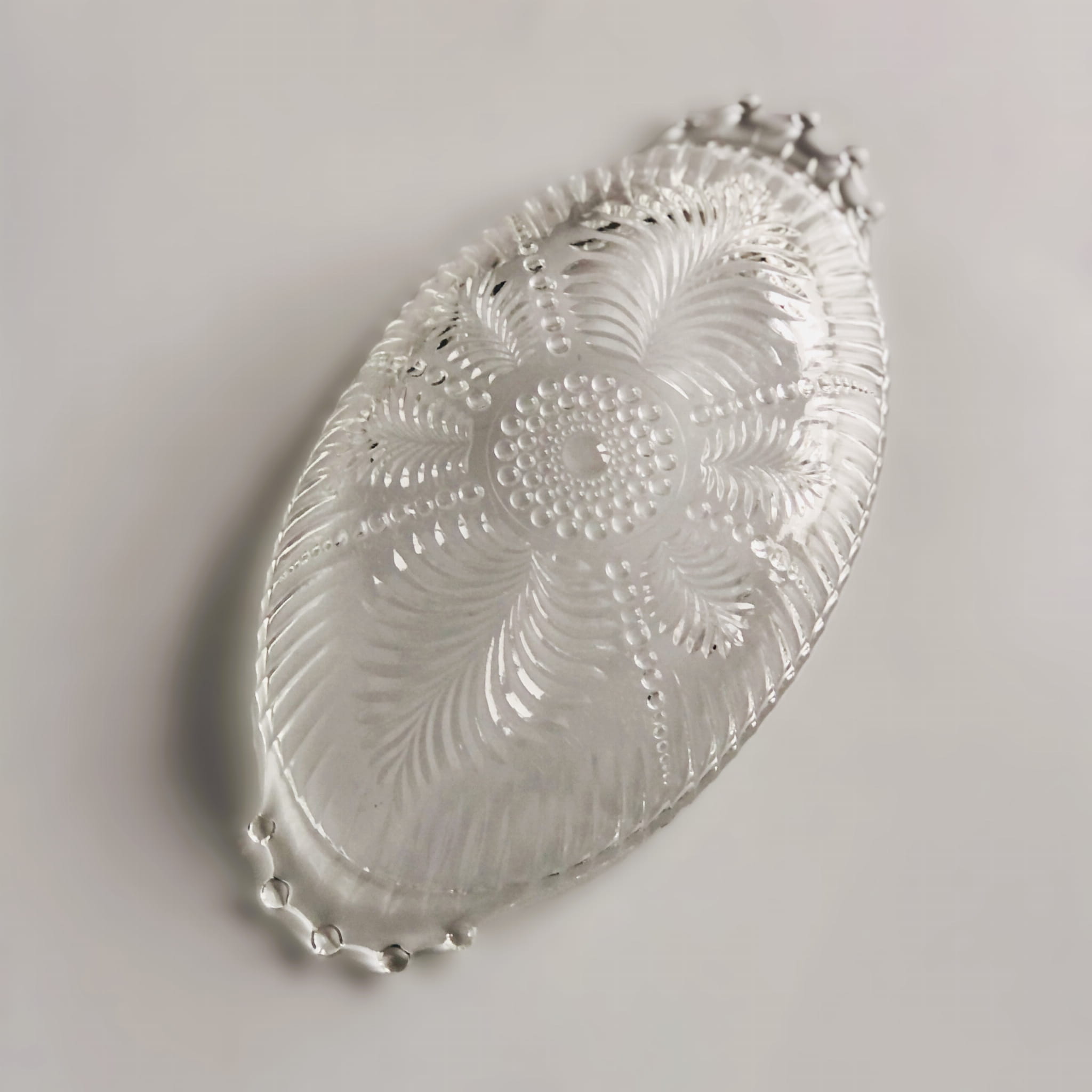 Mała, urocza miseczka ze szkła transparentnego, tłoczenia w kropki i liście paproci.