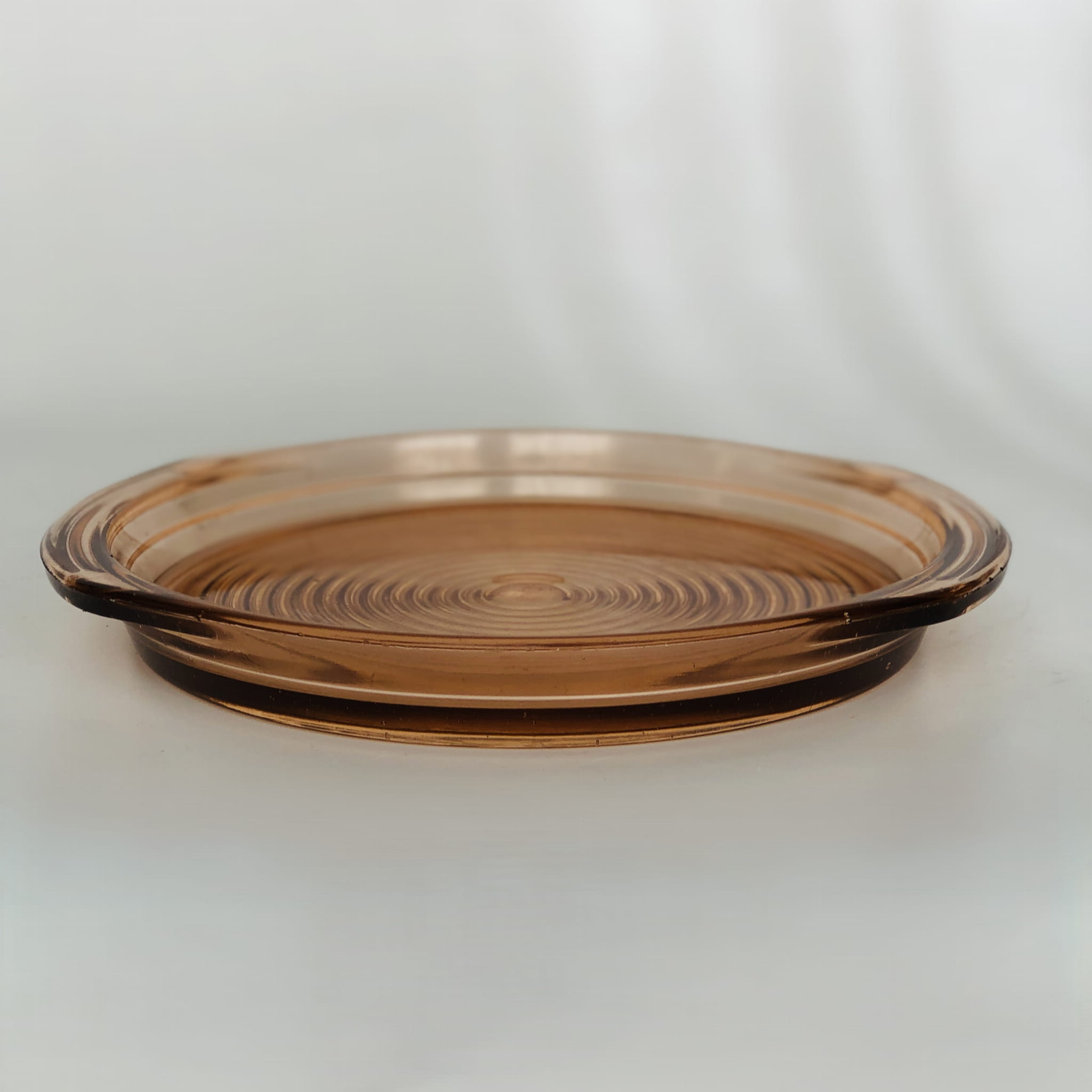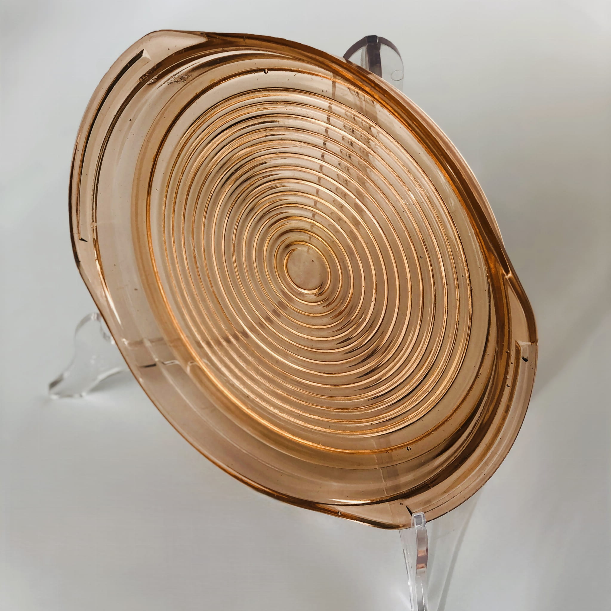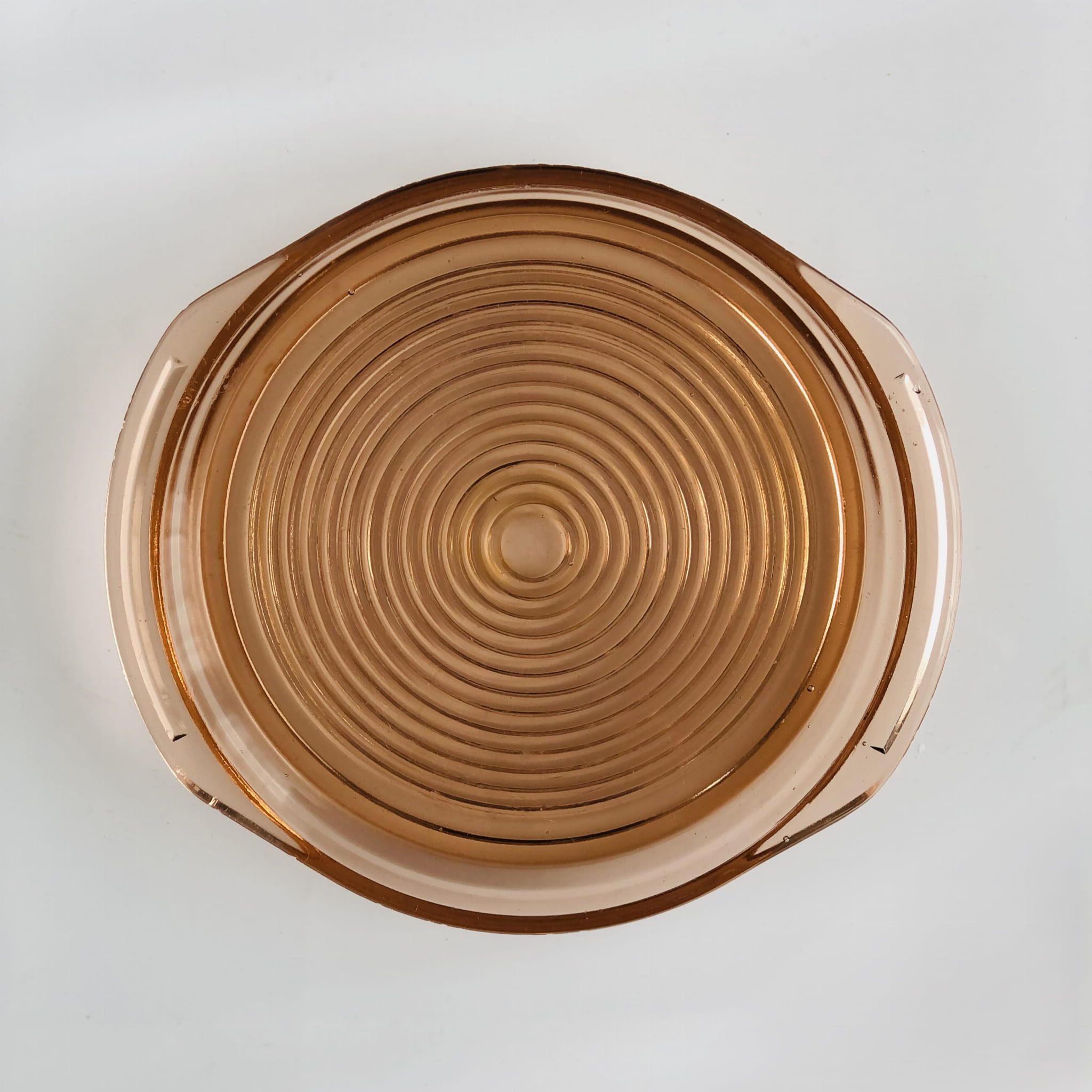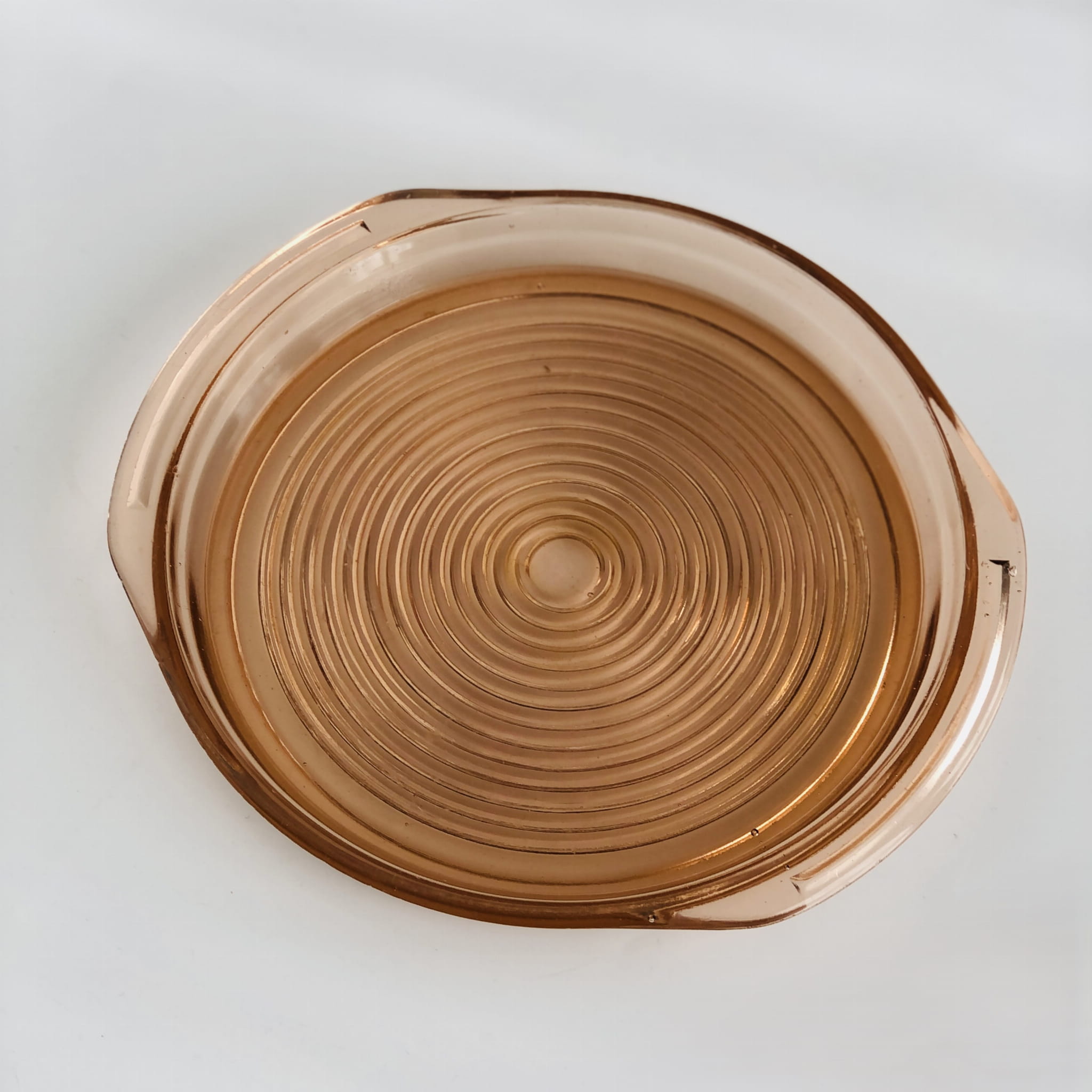 Naczynie z wyższym rantem, może służyć jako taca, talerz lub patera. Wykonane we Francji w latach 30-tych ze szkła rozalinowego.