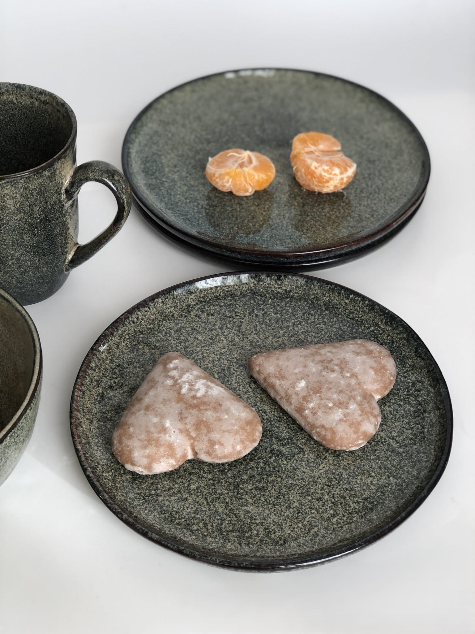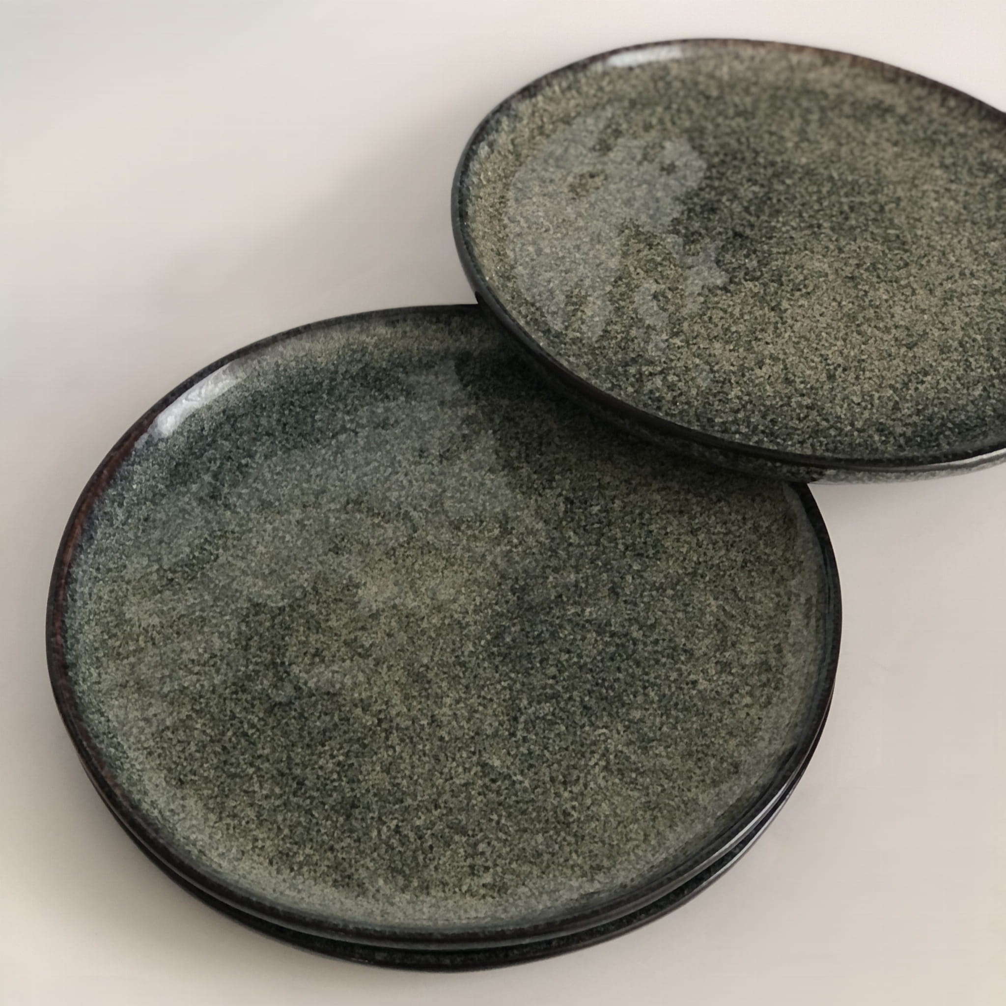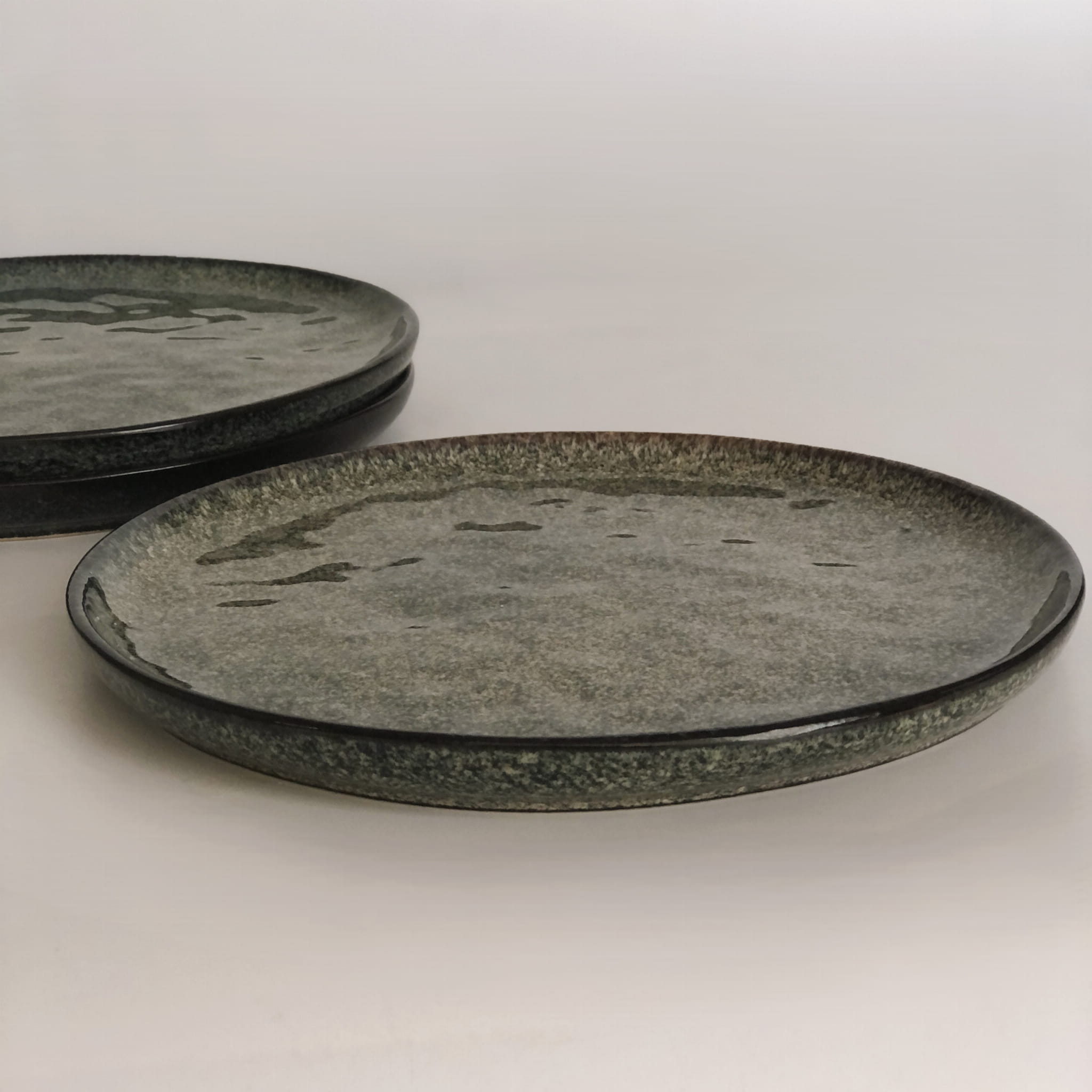 Talerz o minimalistycznej formie i surowej, stonowanej kolorystyce w naturalnym odcieniu szarości przeplatanym czernią i beżem.