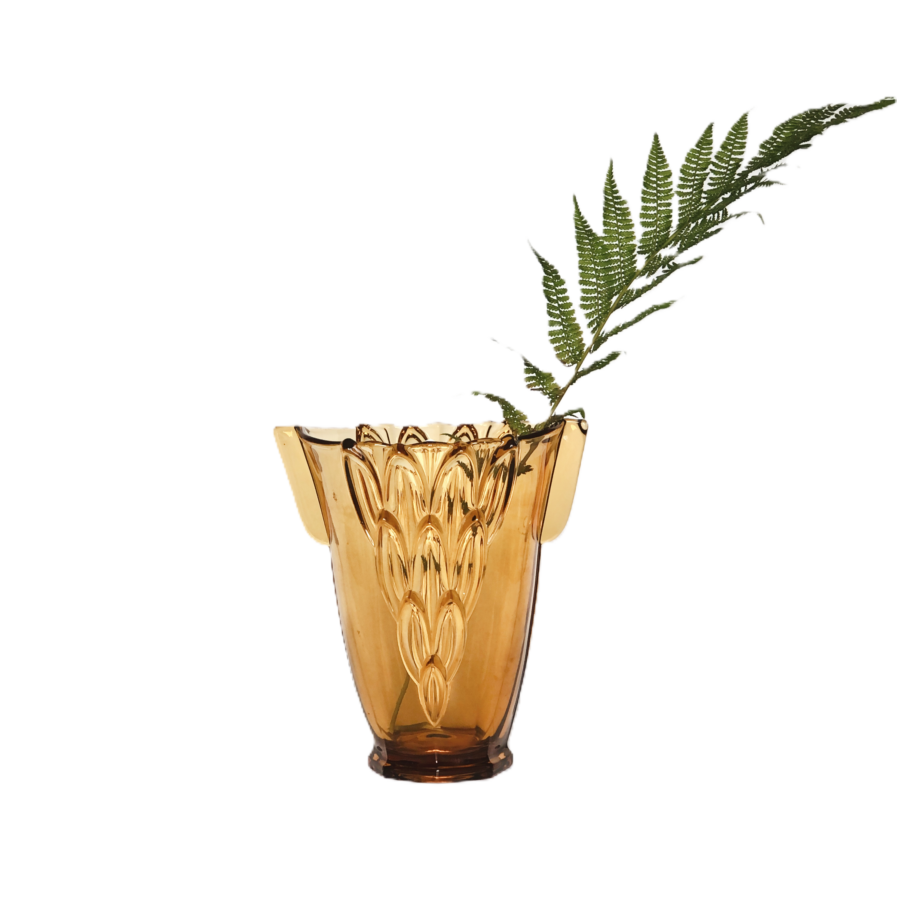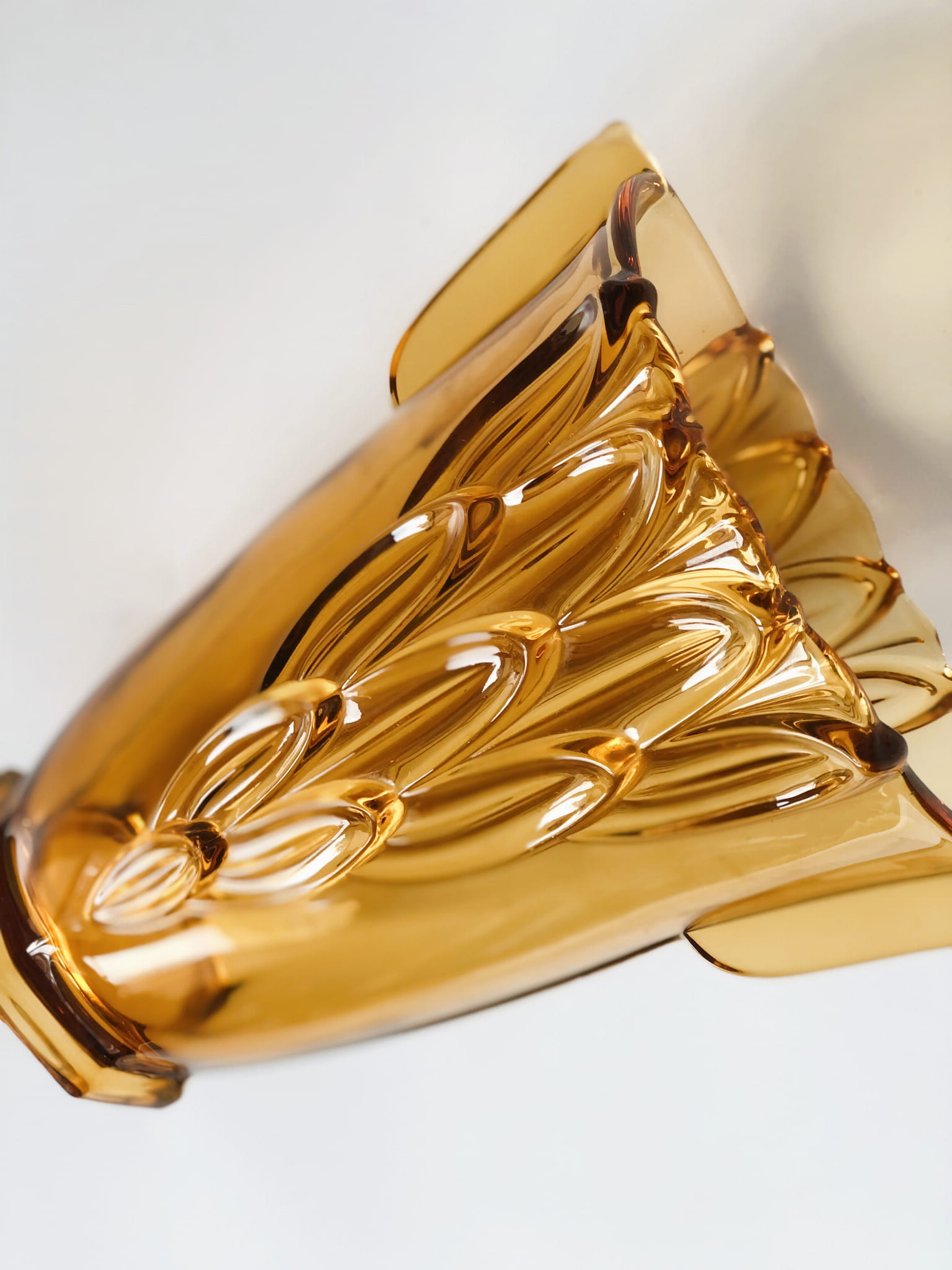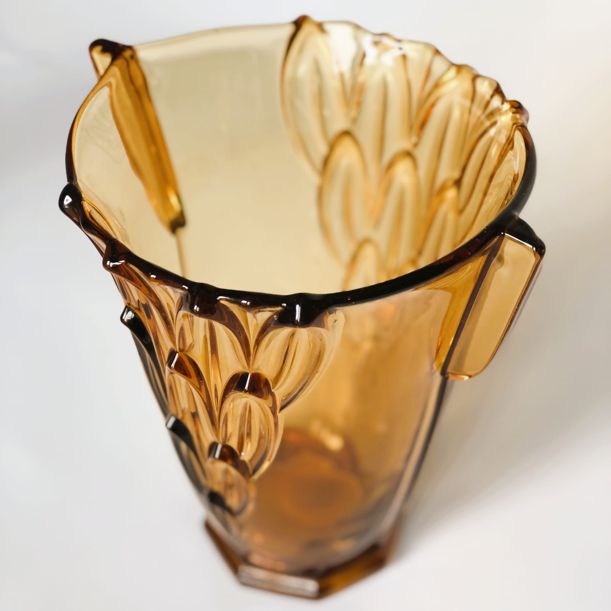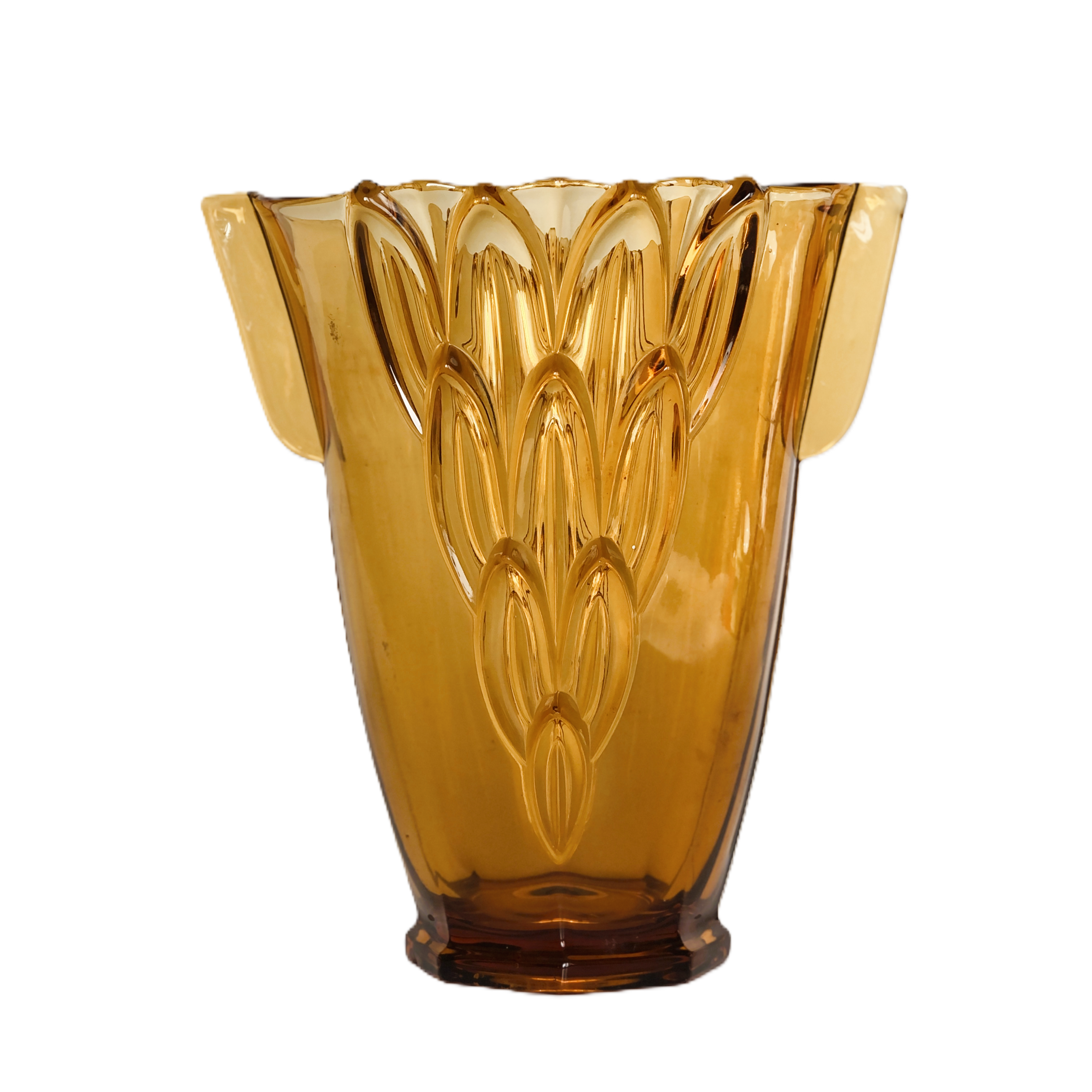 Duży wazon z kultowej serii w liście, w intensywnym kolorze bursztynowym. Nr  19116 w katalogu huty.