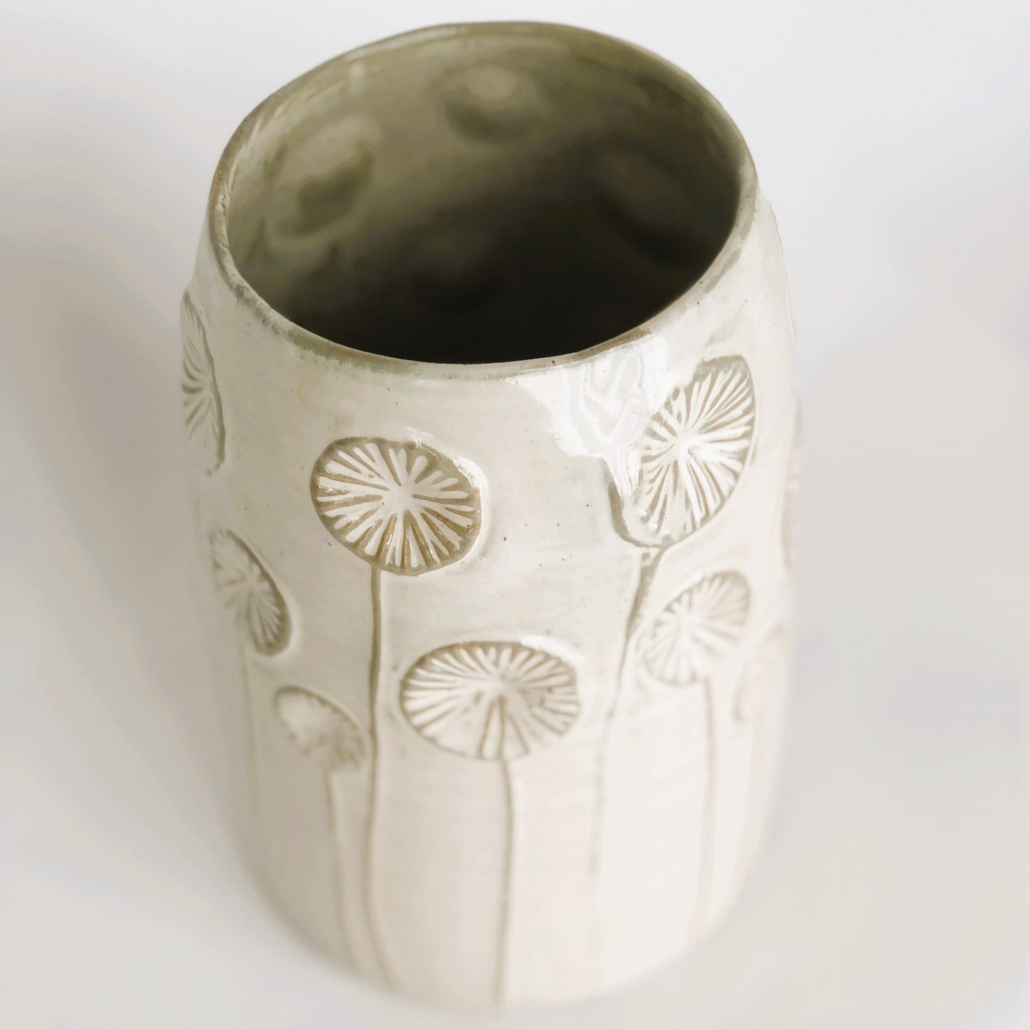 Wazon ceramiczny, ręcznie wykonany z delikatnymi dekorami roślinnymi. Szkliwienie w odcieniu beżowo - piaskowym.