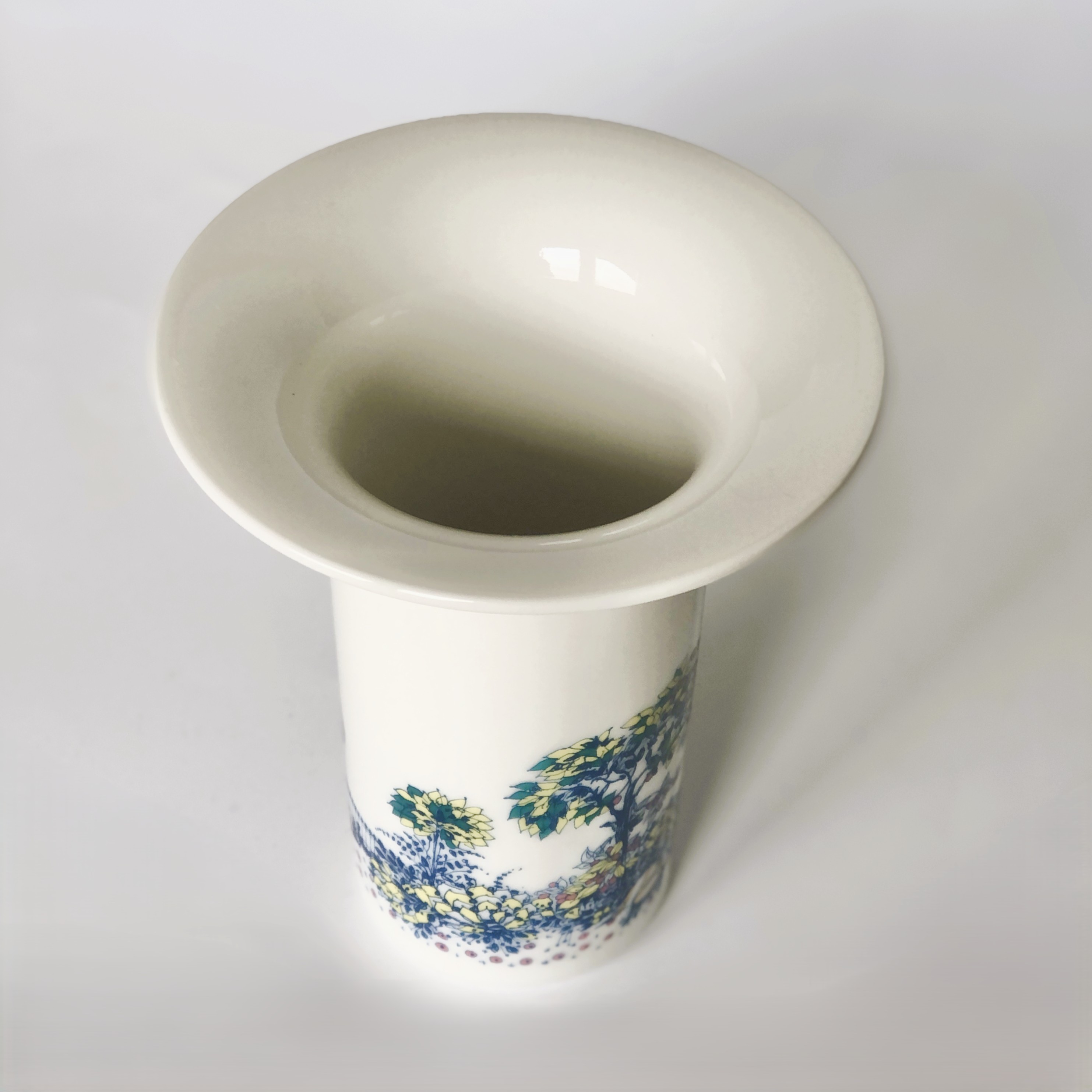 Wazon wykonany z szlachetnej białej porcelany, dekorowany delikatnymi malunkami w kolorach niebieskim, żółtym oraz złoceniami.