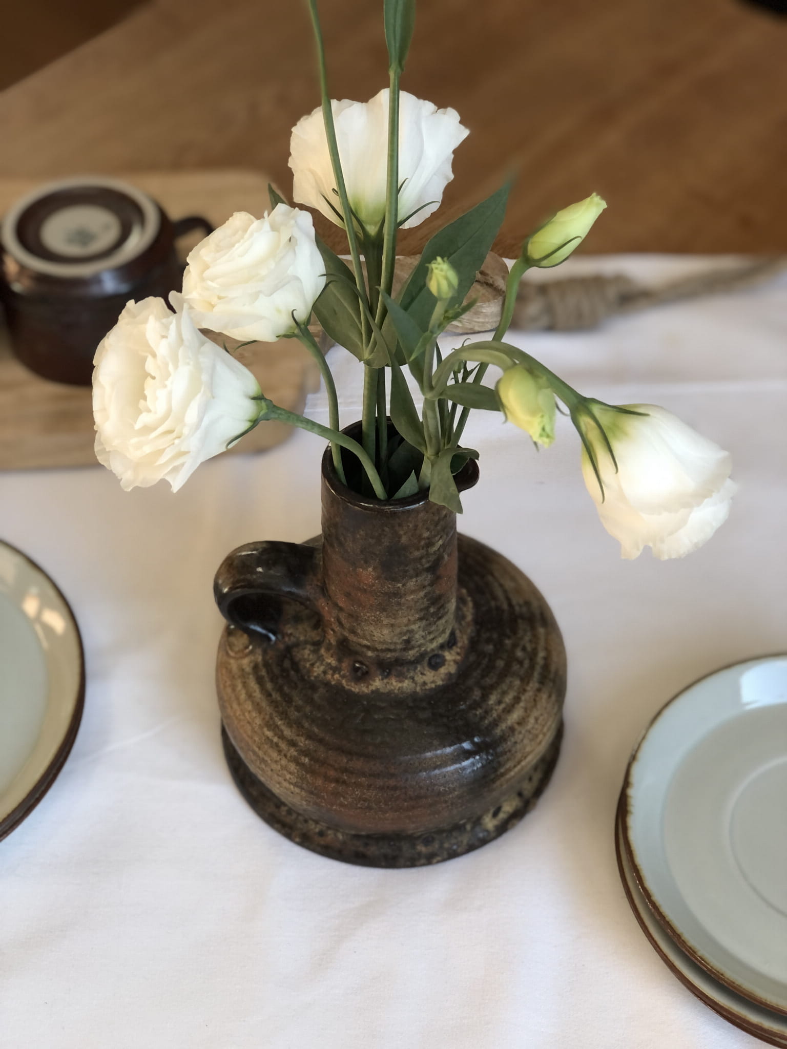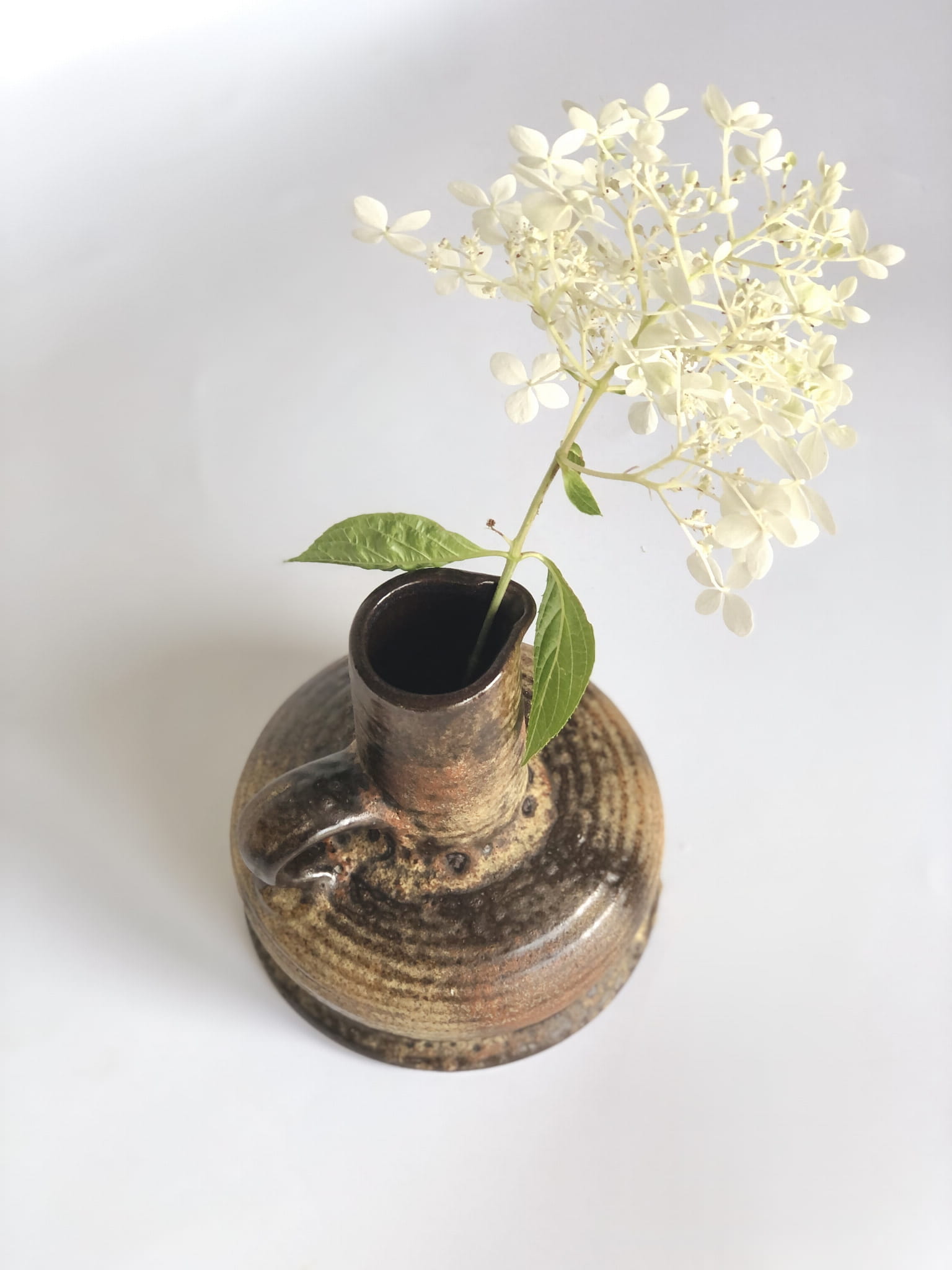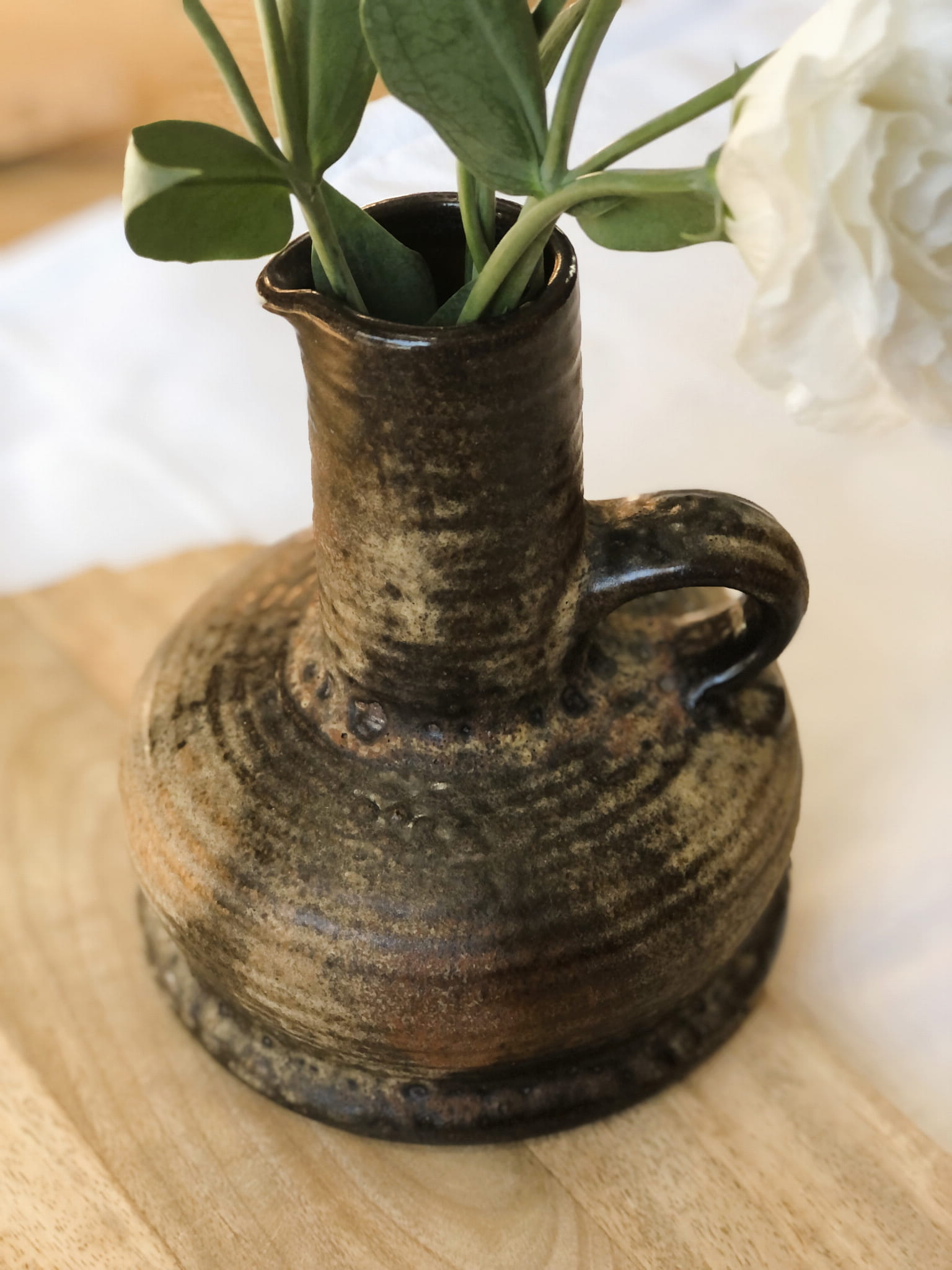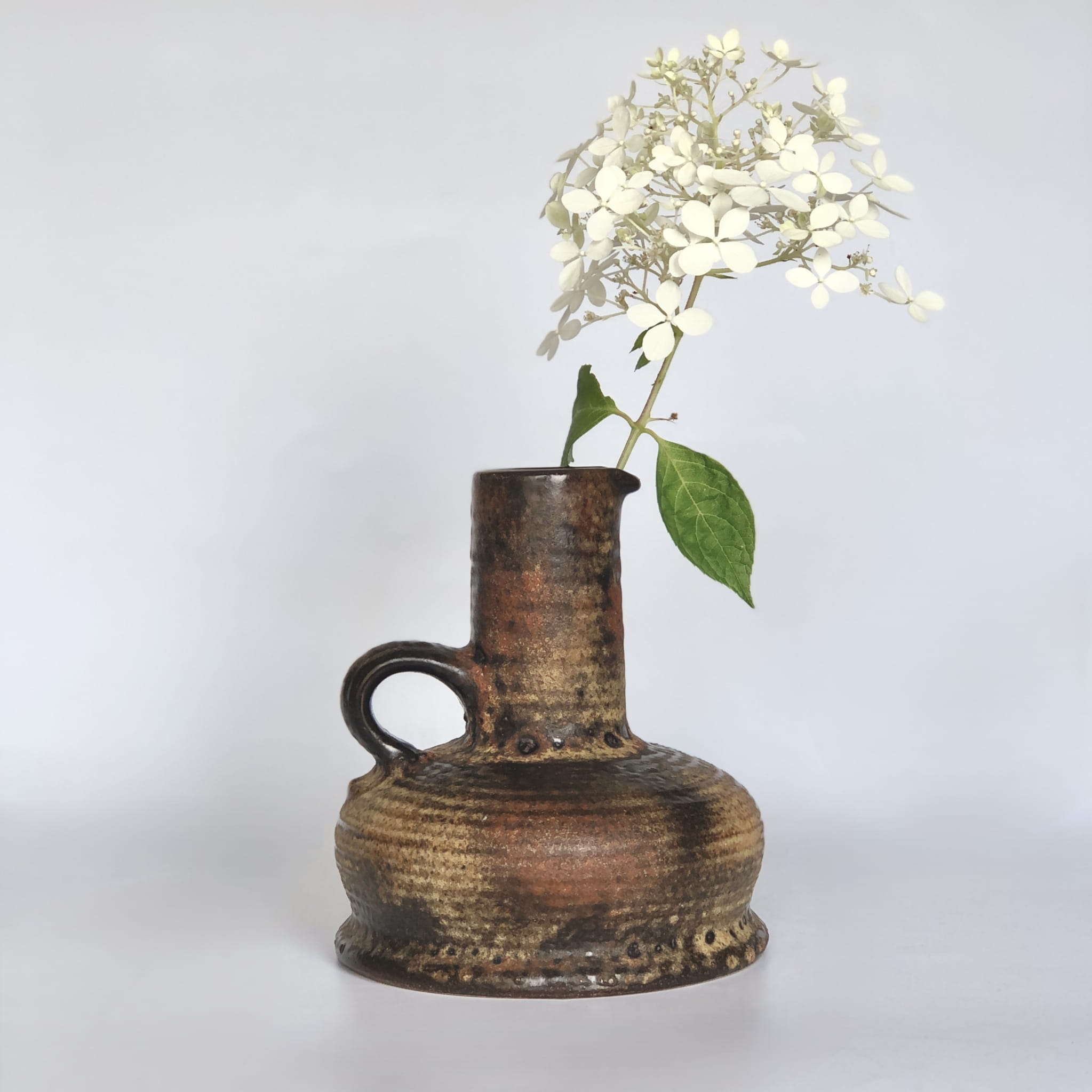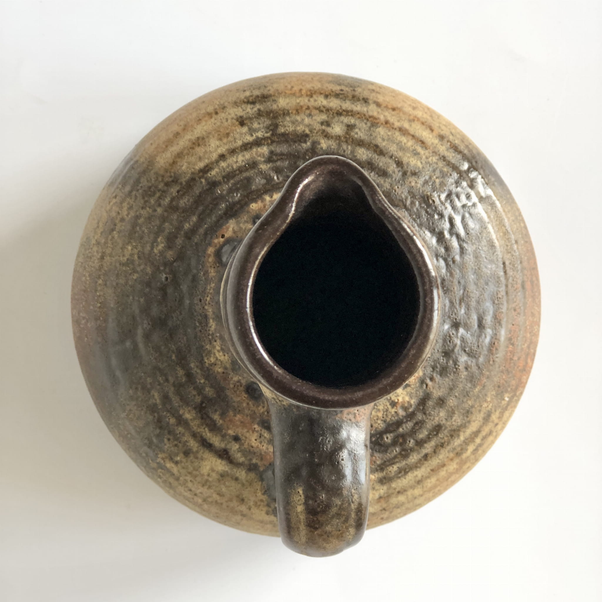 Szkliwienie w odcieniach brązu z mocnymi efektami przypalenia i pofałdowaną teksturą. Masywna forma z wyraźną podstawą, szyjką z dziubkiem oraz uchem.