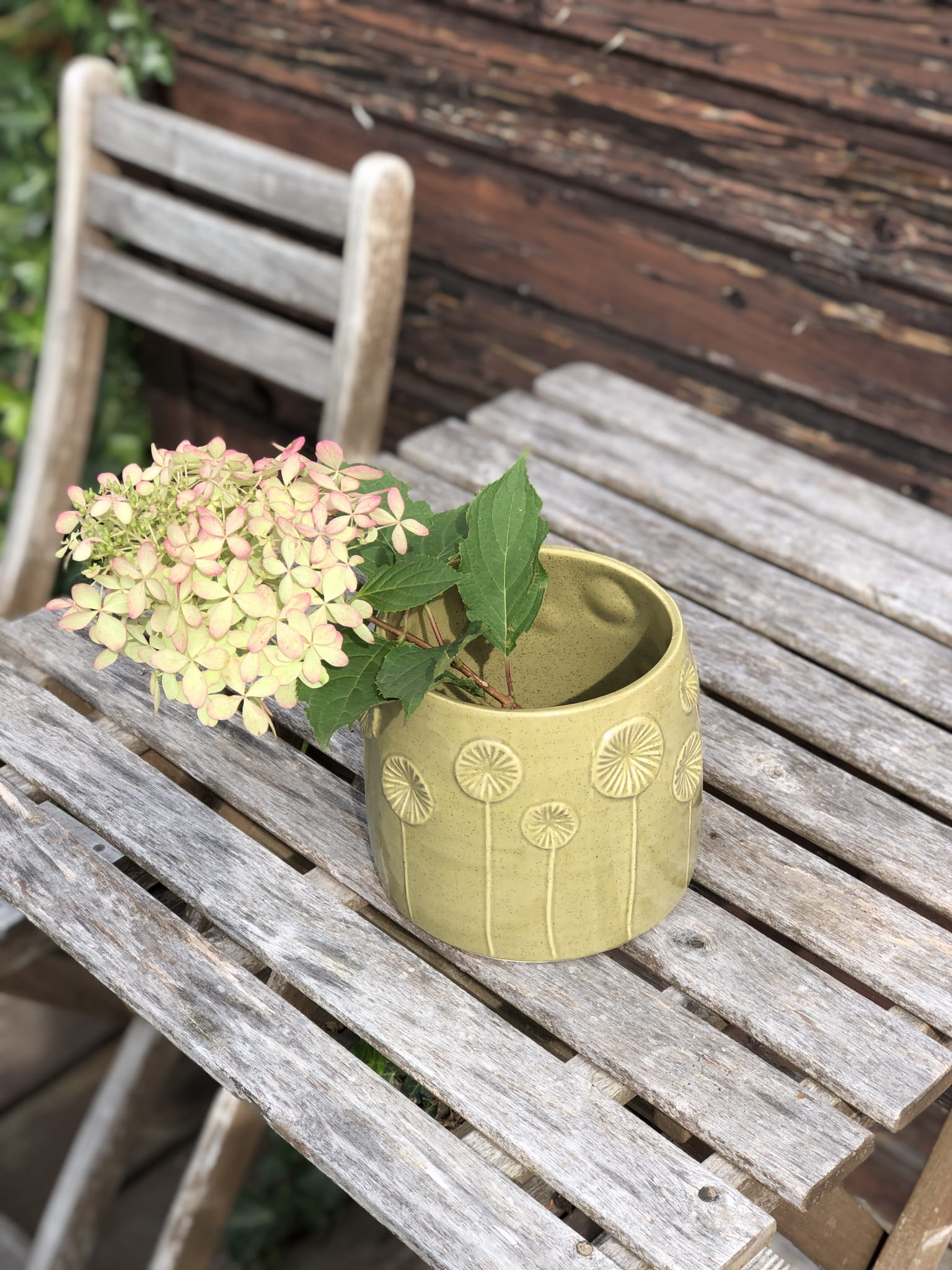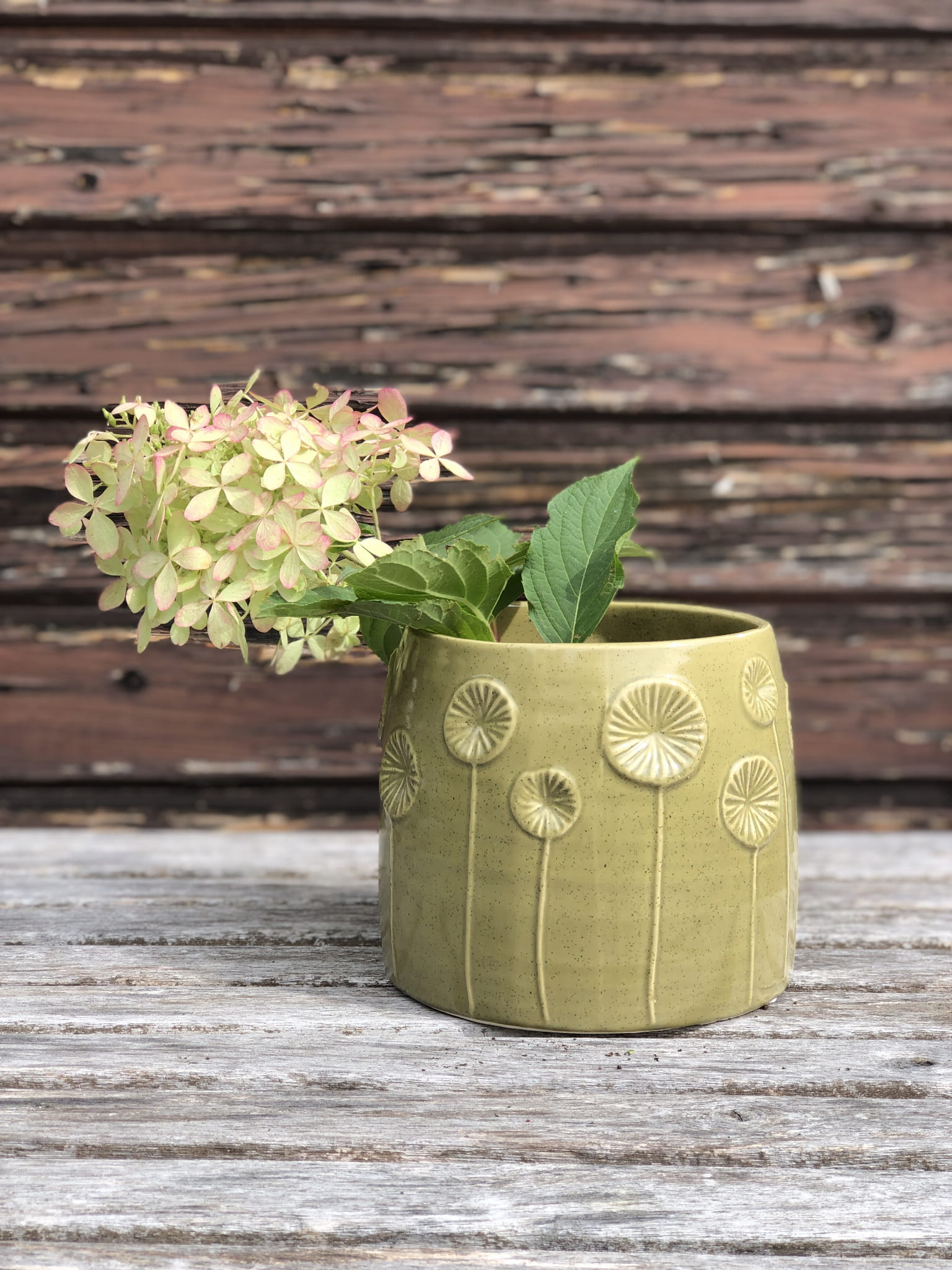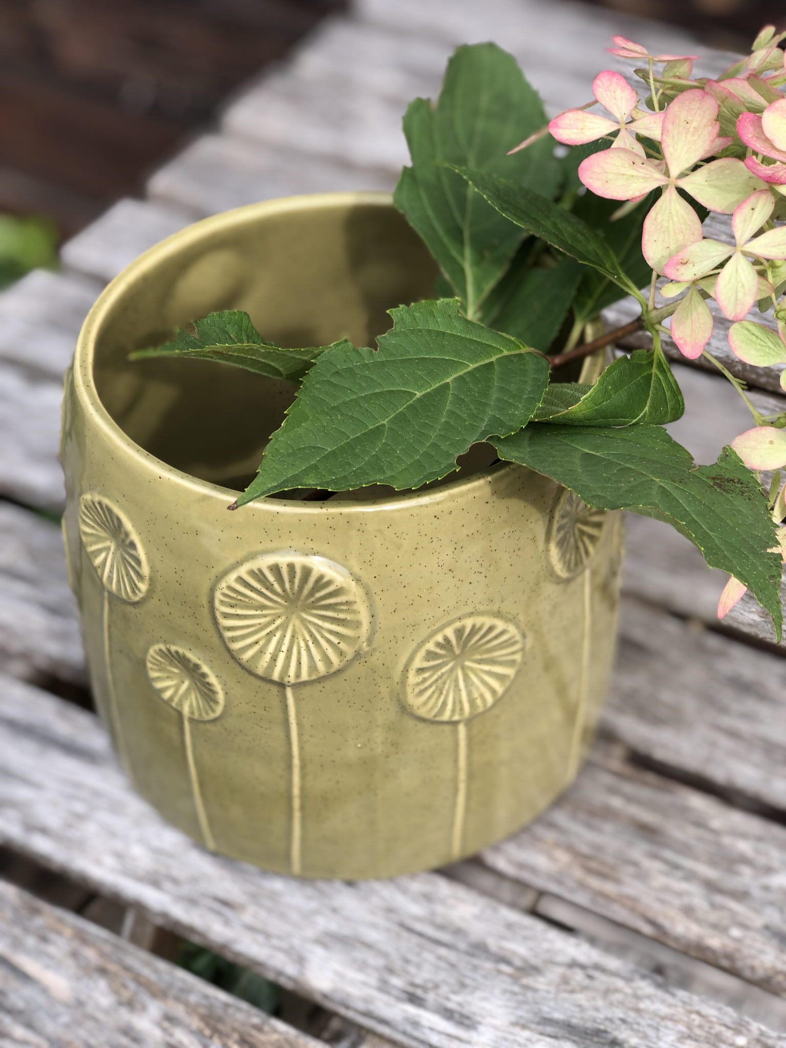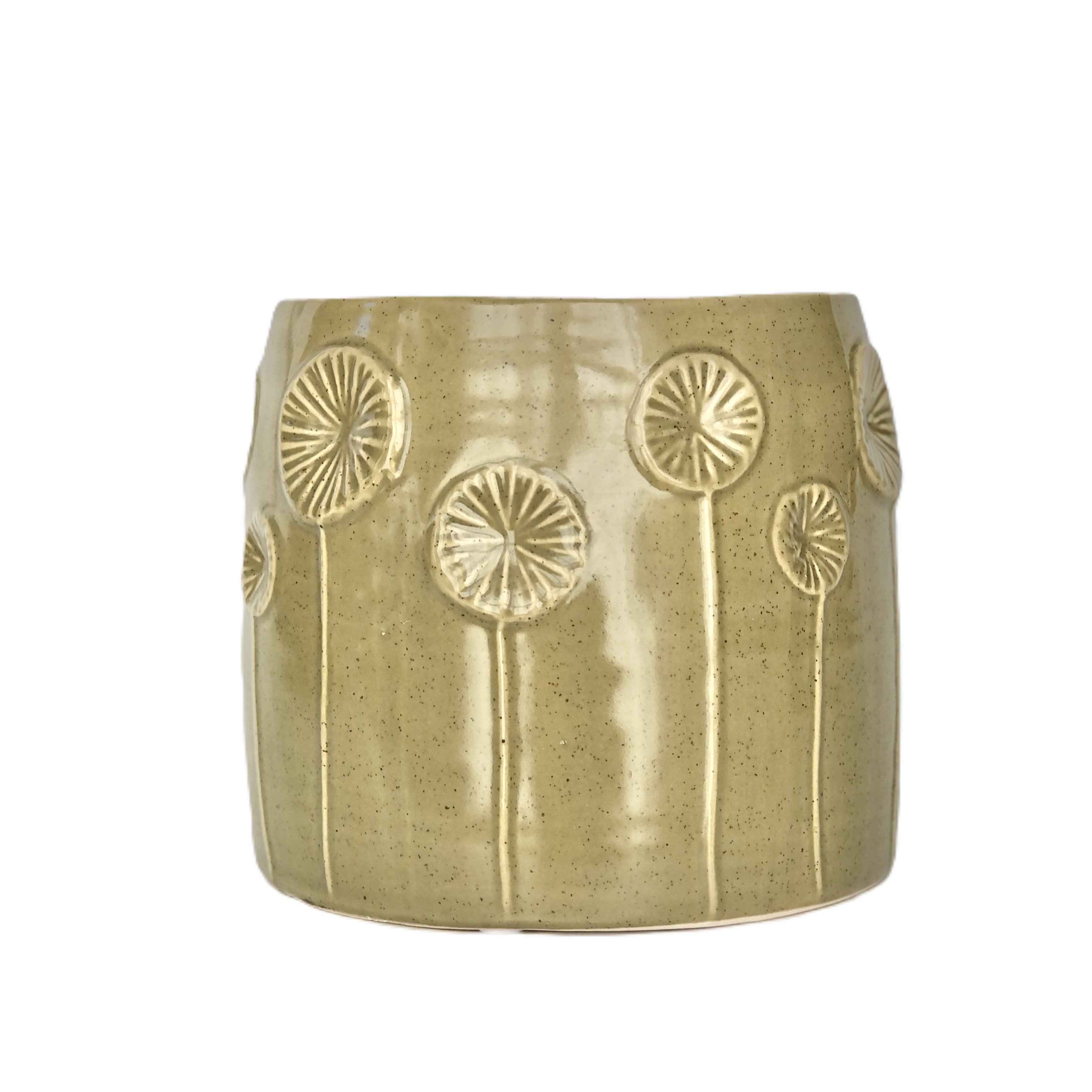 Wazon ceramiczny, ręcznie wykonany z delikatnymi dekorami roślinnymi. Szkliwienie w odcieniu jasnej zieleni.