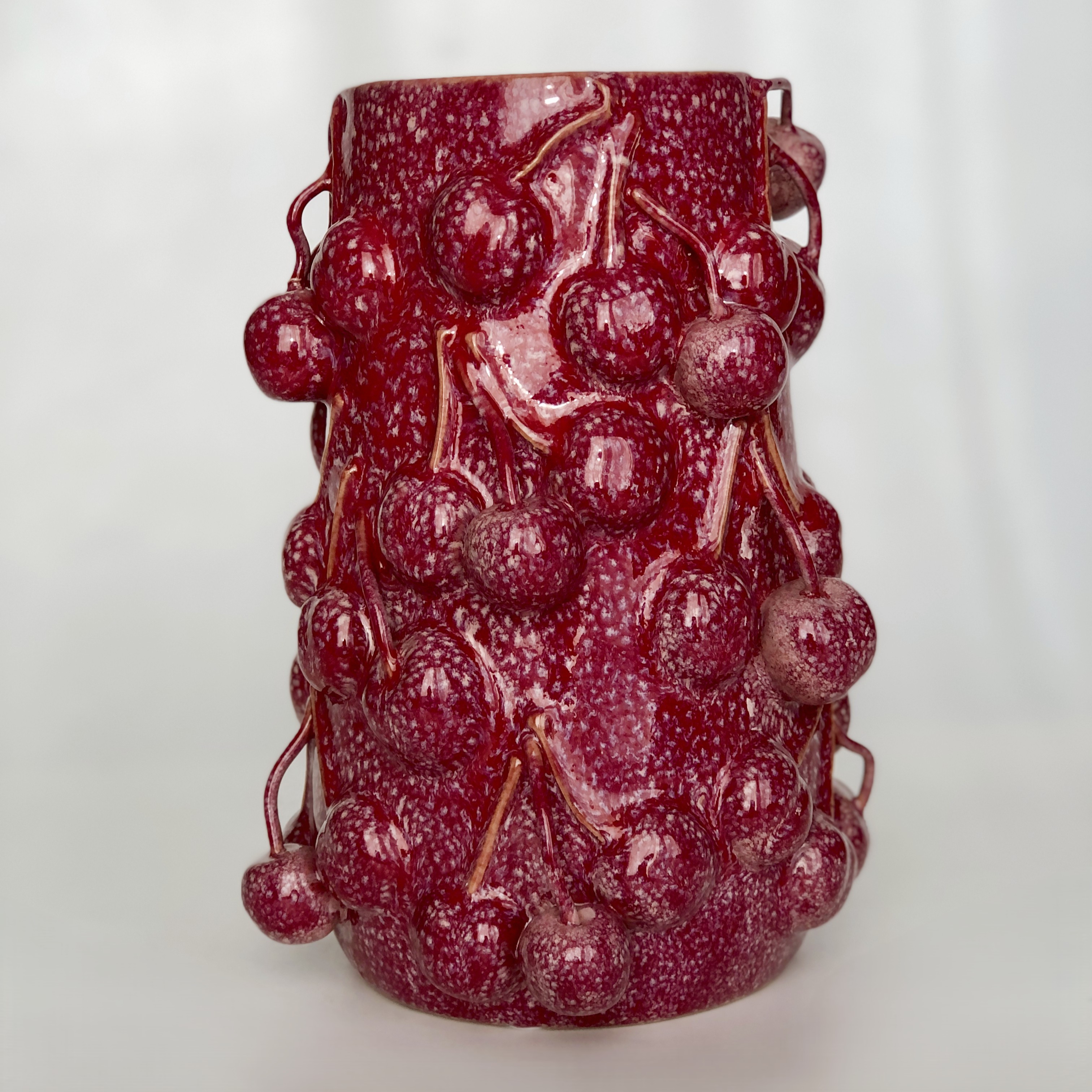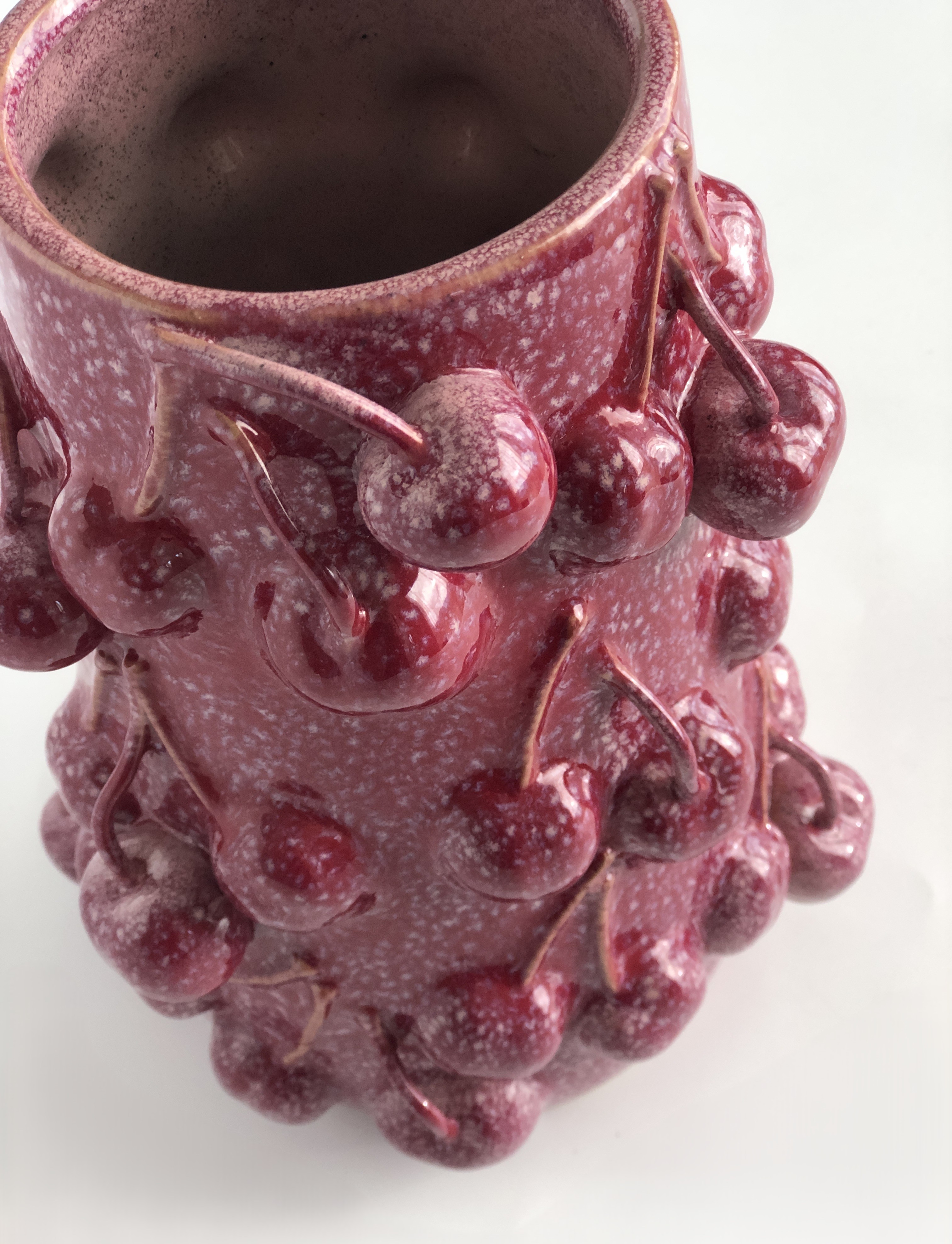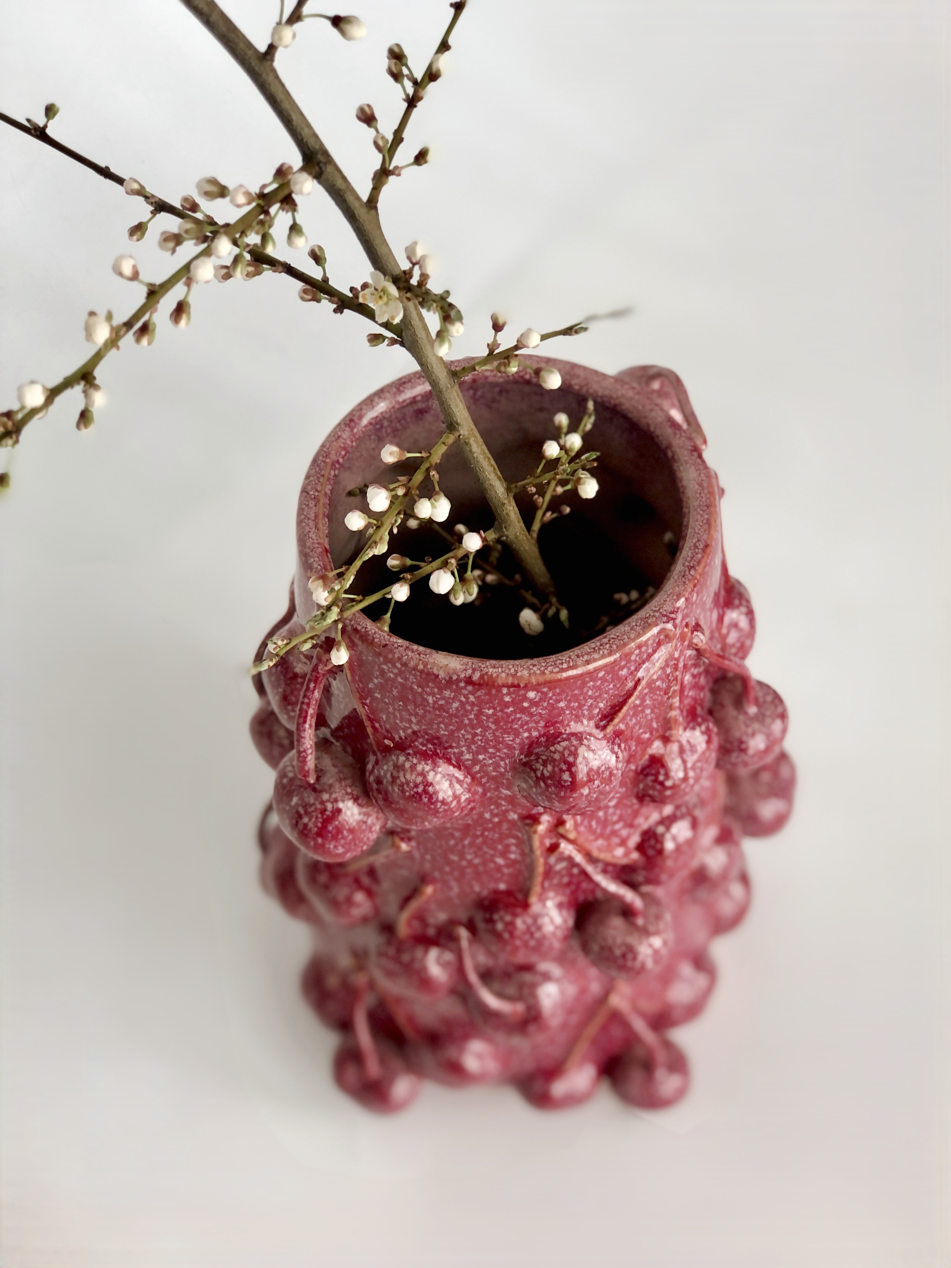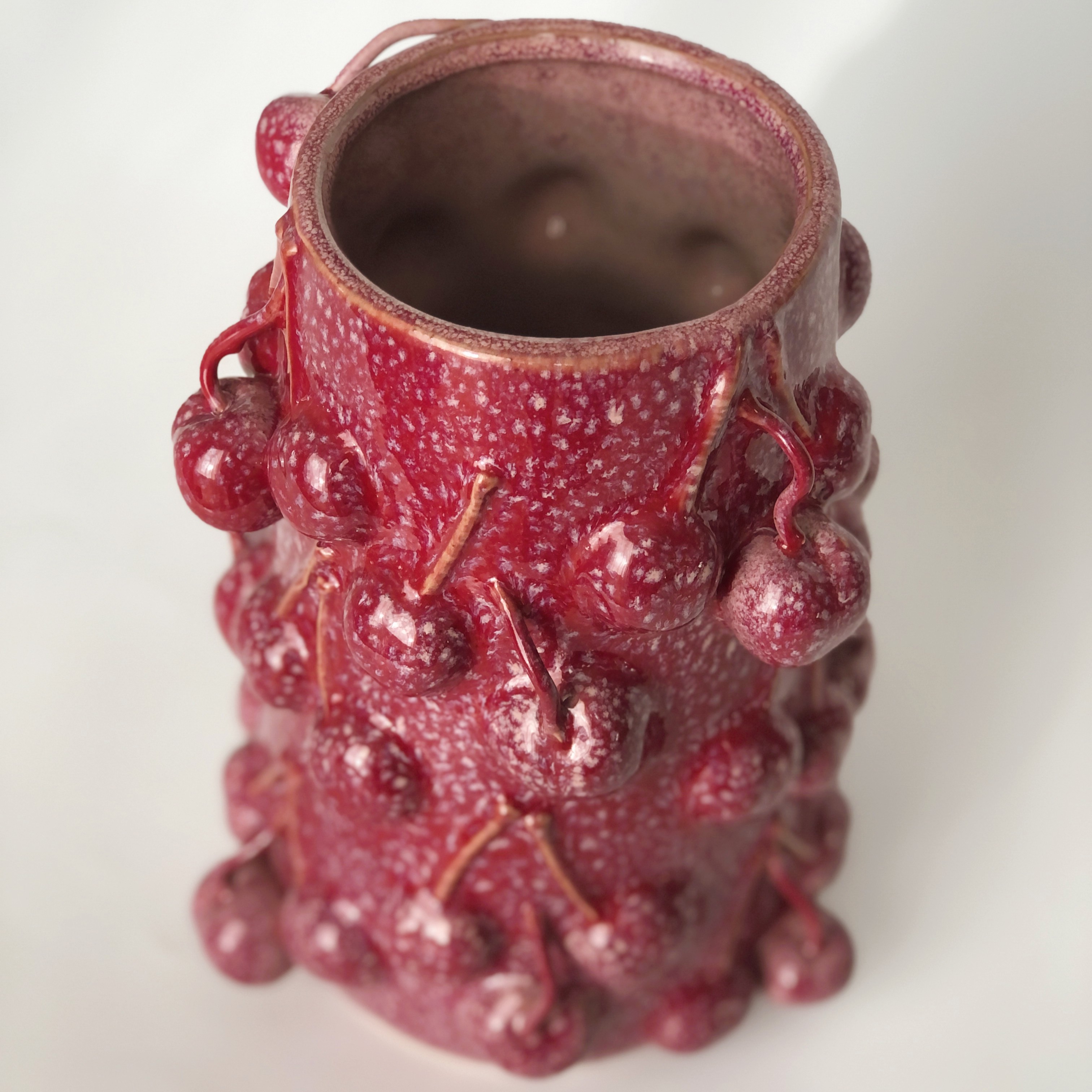 Wazon w nasyconym, soczystym kolorze wiśniowym. Udekorowany, misternie wykonanymi owocami wiśni.