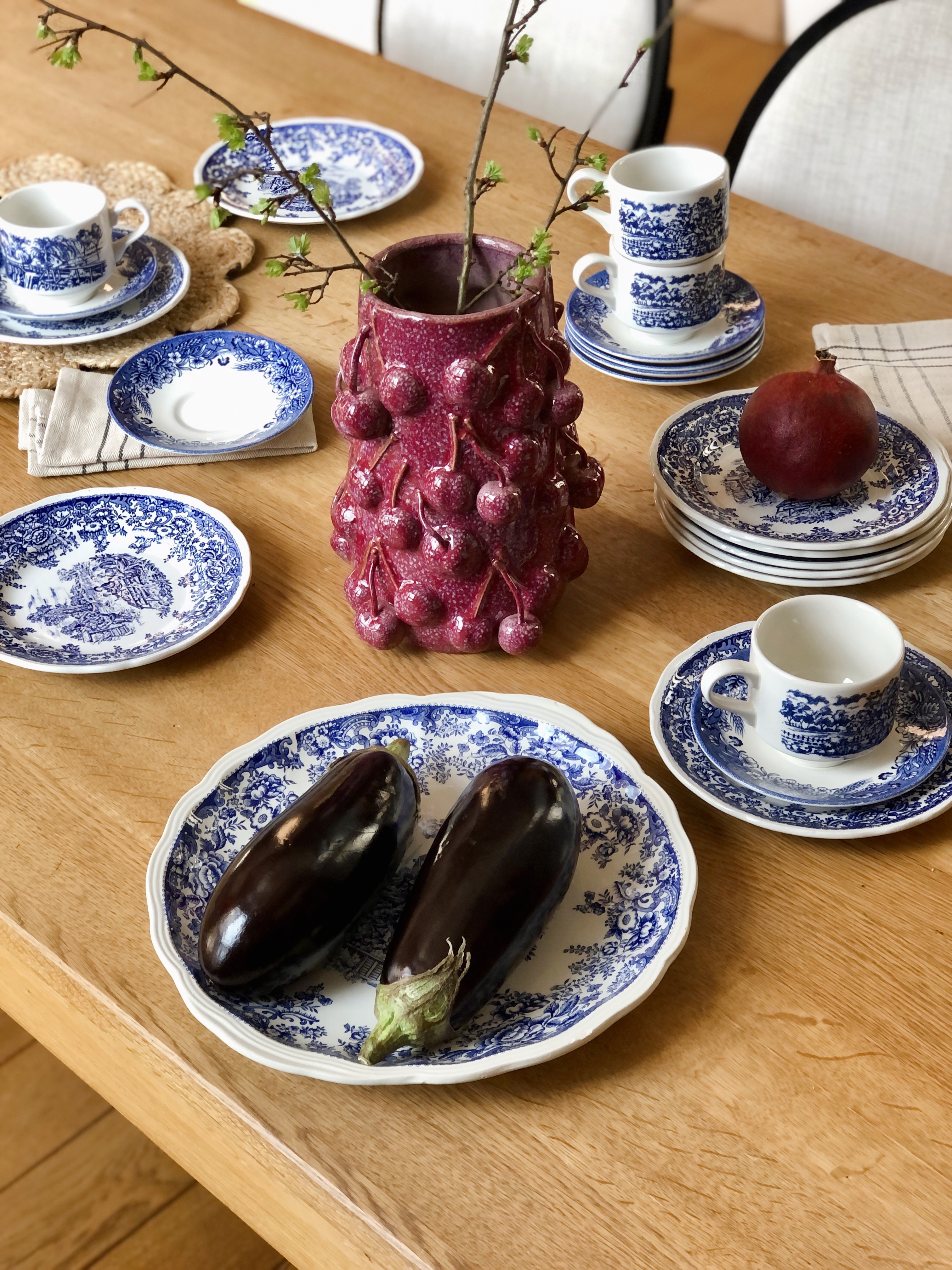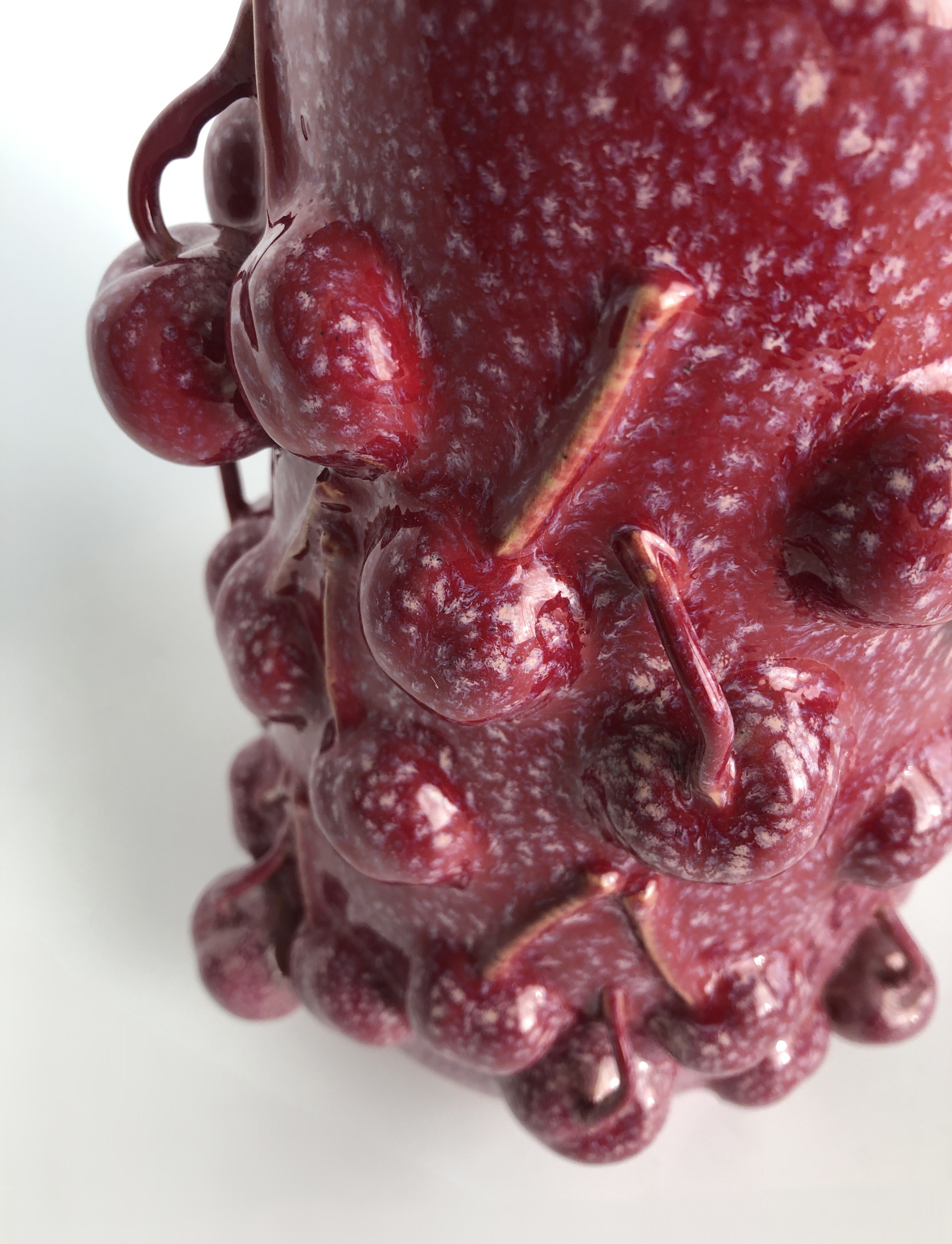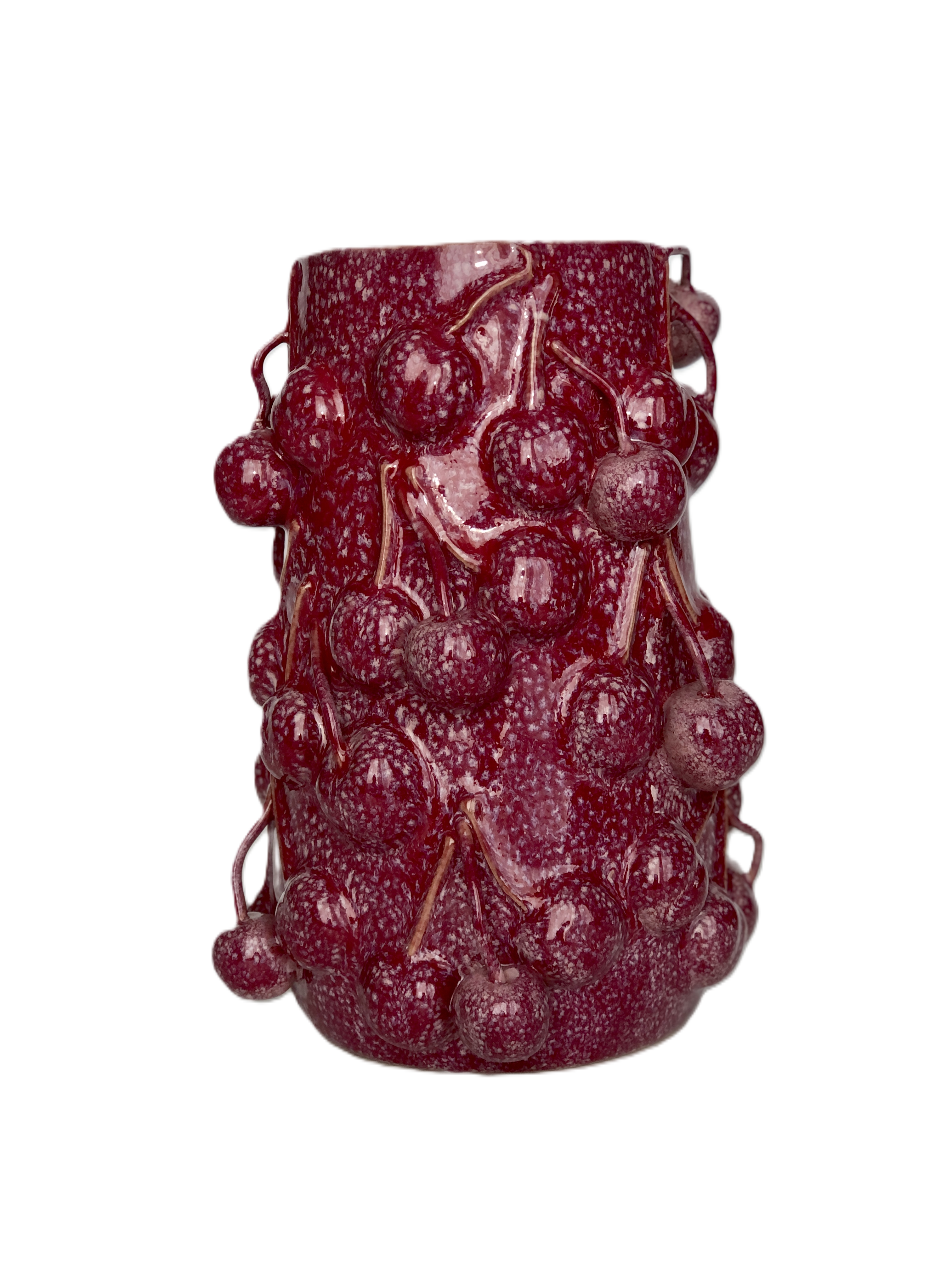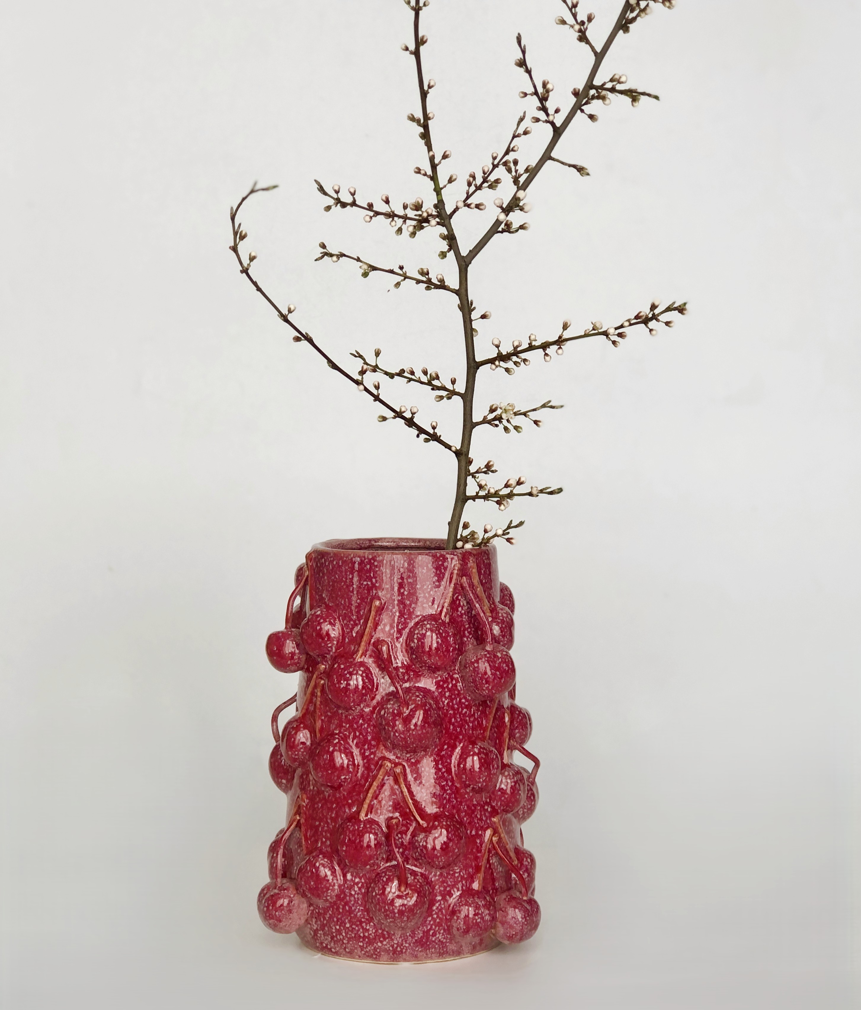 Wazon w nasyconym, soczystym kolorze wiśniowym. Udekorowany, misternie wykonanymi owocami wiśni.