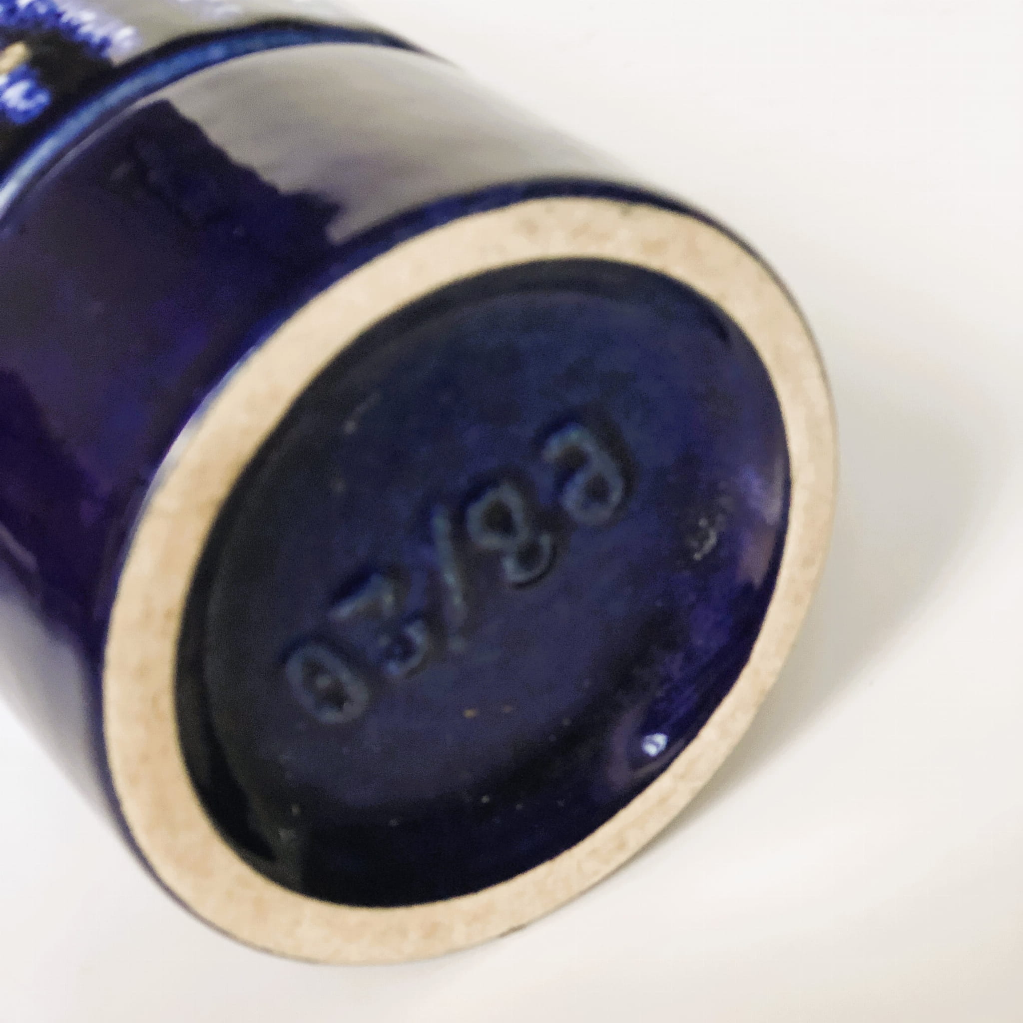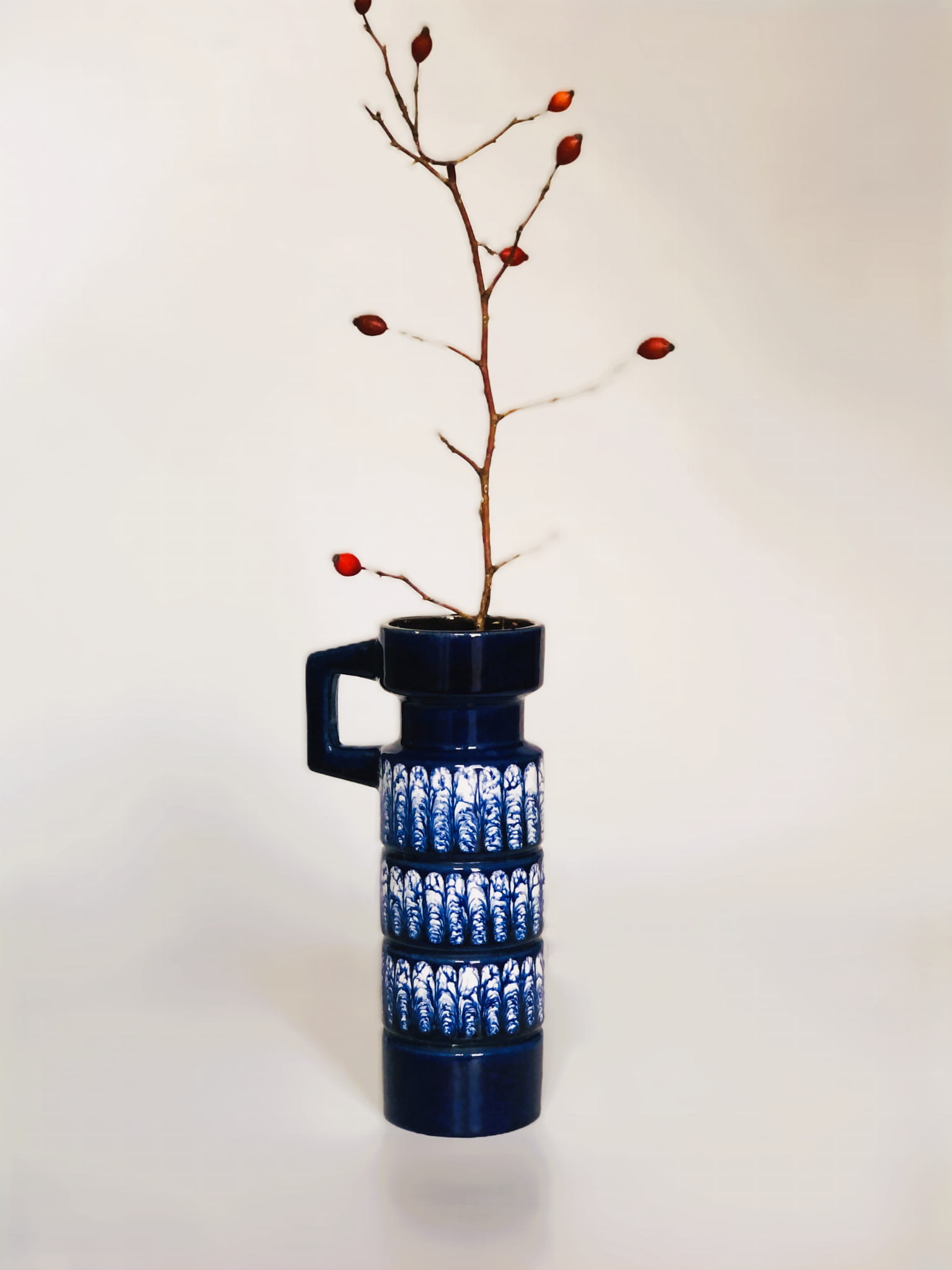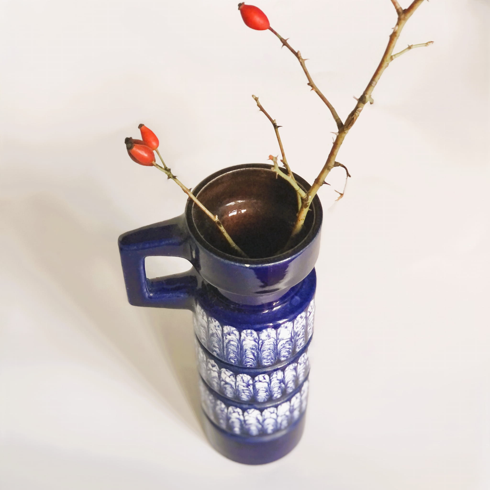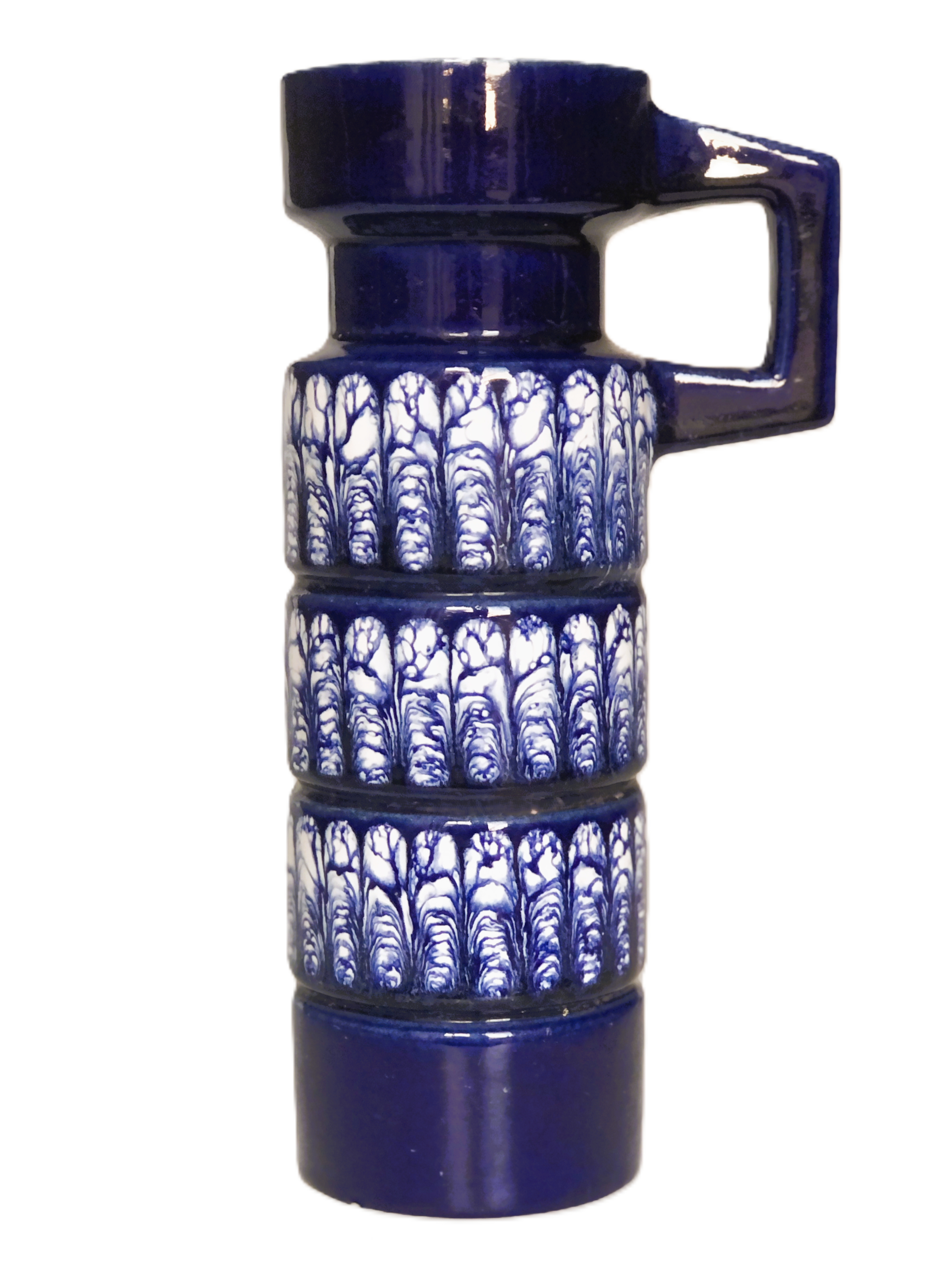 Wazon z geometrycznym uchwytem w nasyconym kobaltowym kolorze, styl zdobienia typu "fat lava"- typowy dla epoki modernizmu w Niemczech.