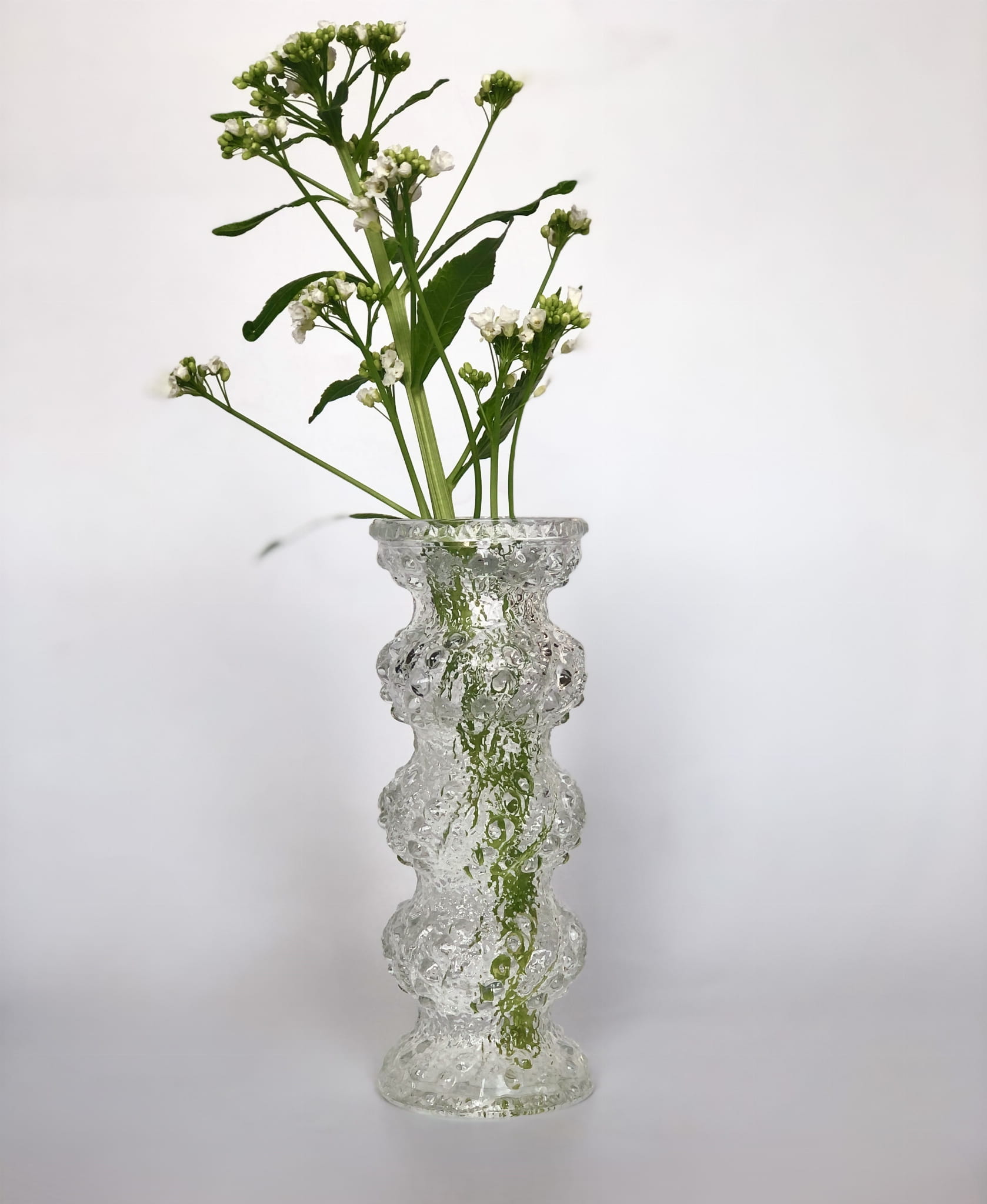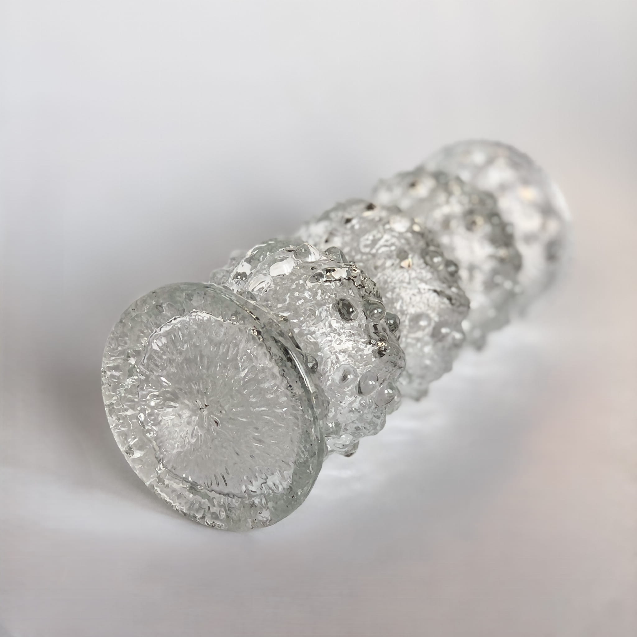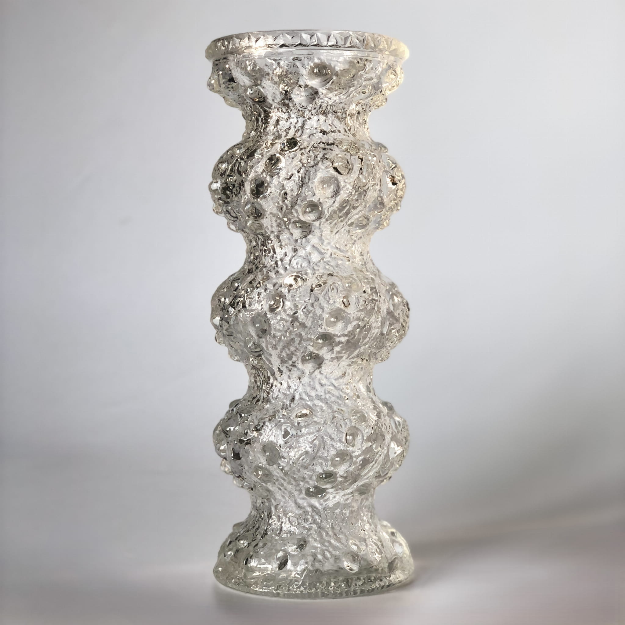 Wazon, który może służyć również jako świecznik. Przepiękny wzór z Huty Oberglas z Austrii, powstał w latach 60, XX wieku. Charakteryzuje się porowatą, mocno zaznaczoną strukturą oraz świetnym, organicznym designem.