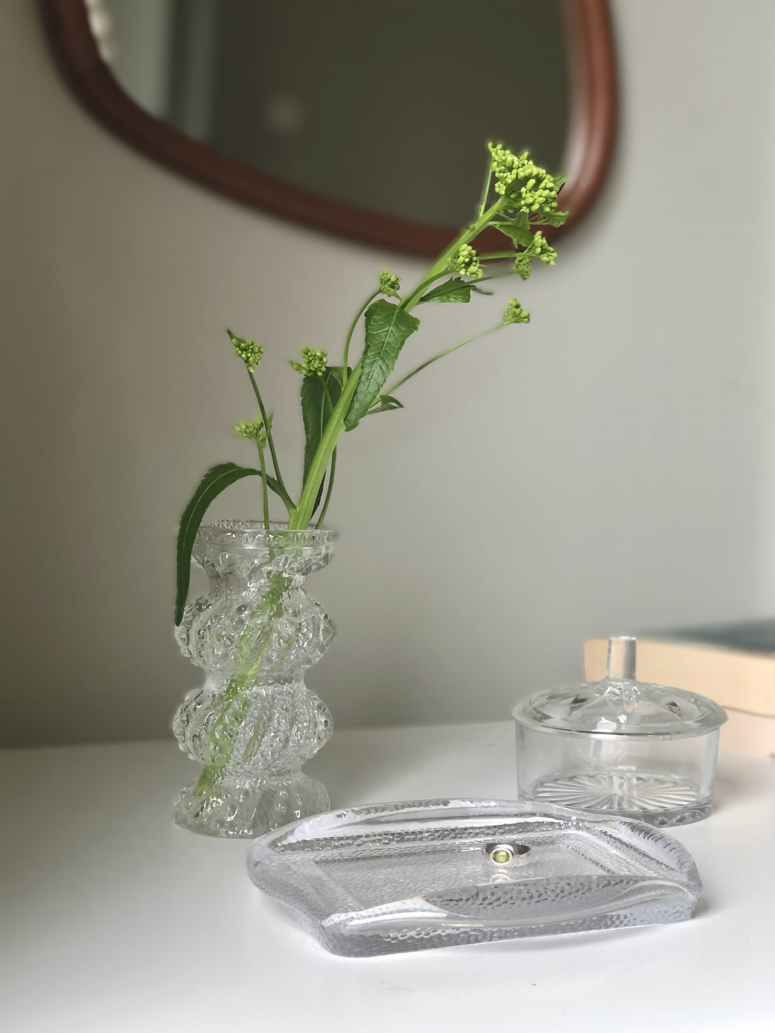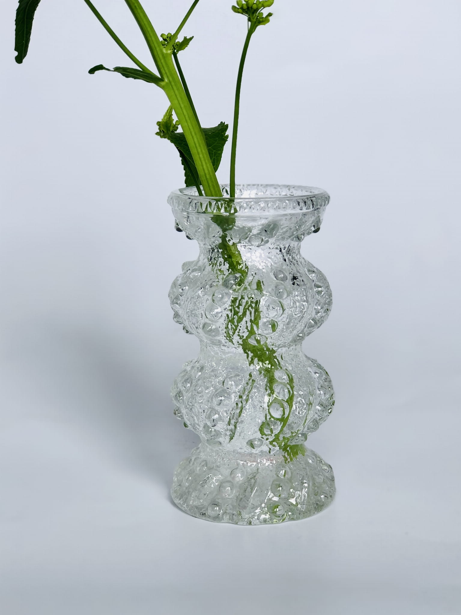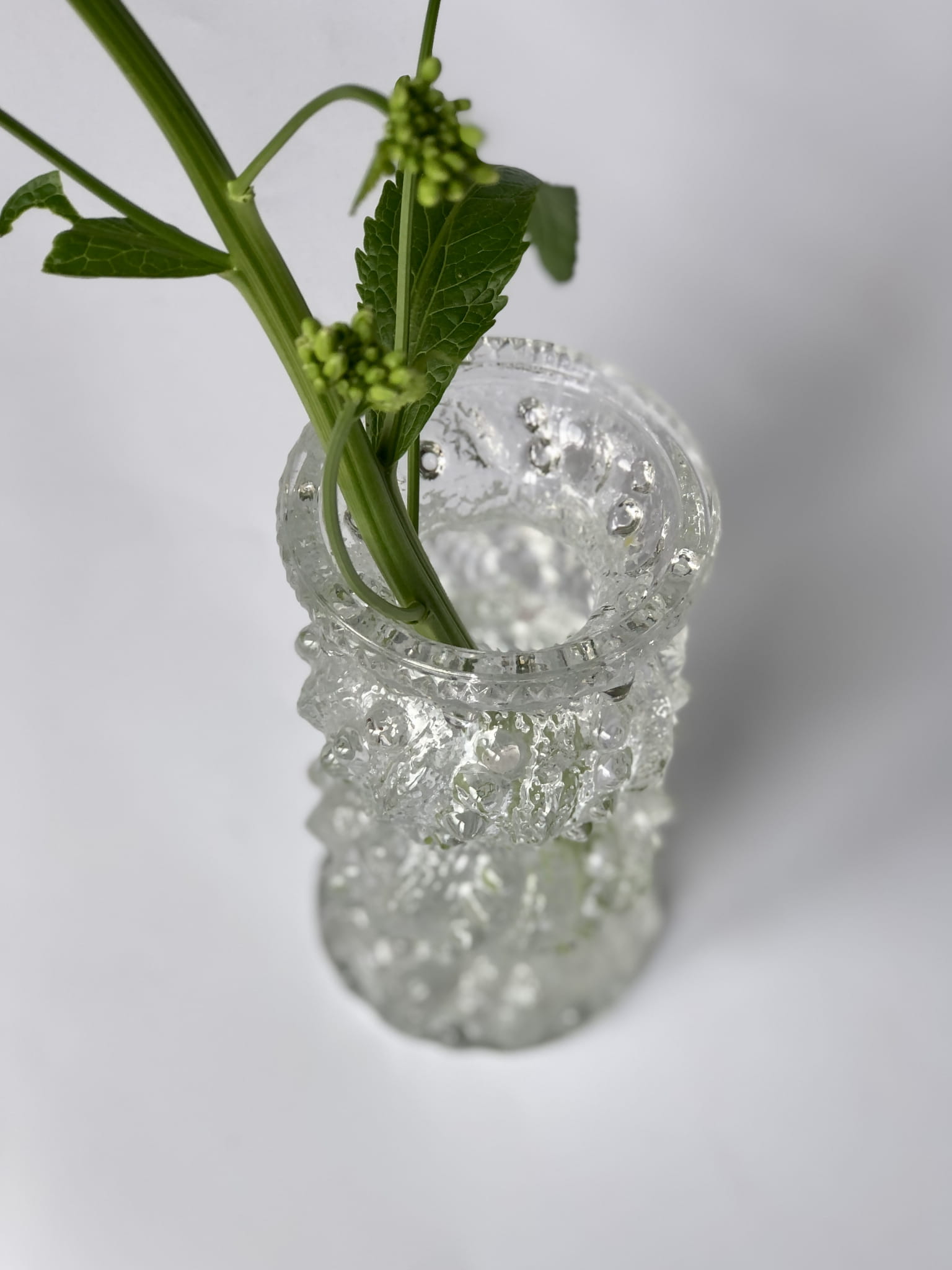 Wazon, który może służyć również jako świecznik. Przepiękny wzór z Huty Oberglas z Austrii, powstał w latach 60, XX wieku. Charakteryzuje się porowatą, mocno zaznaczoną strukturą oraz świetnym, organicznym designem.
