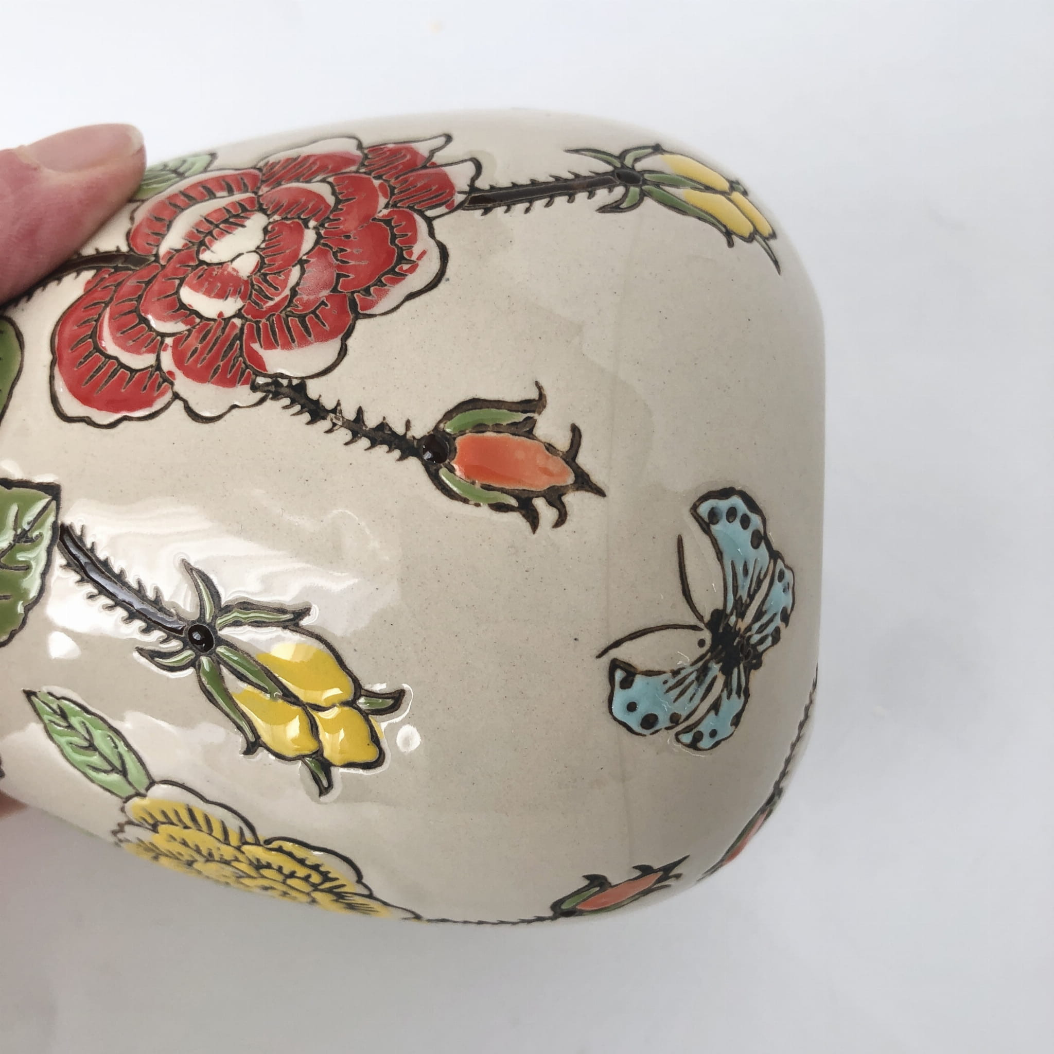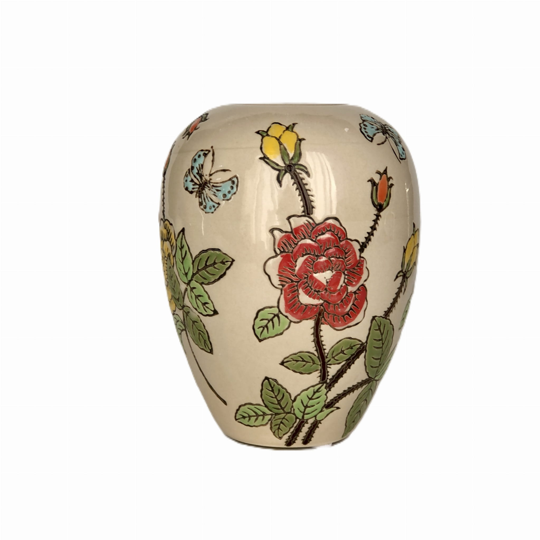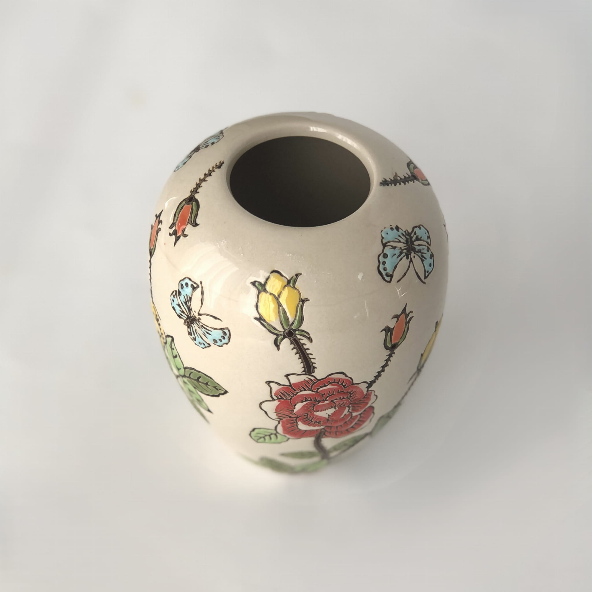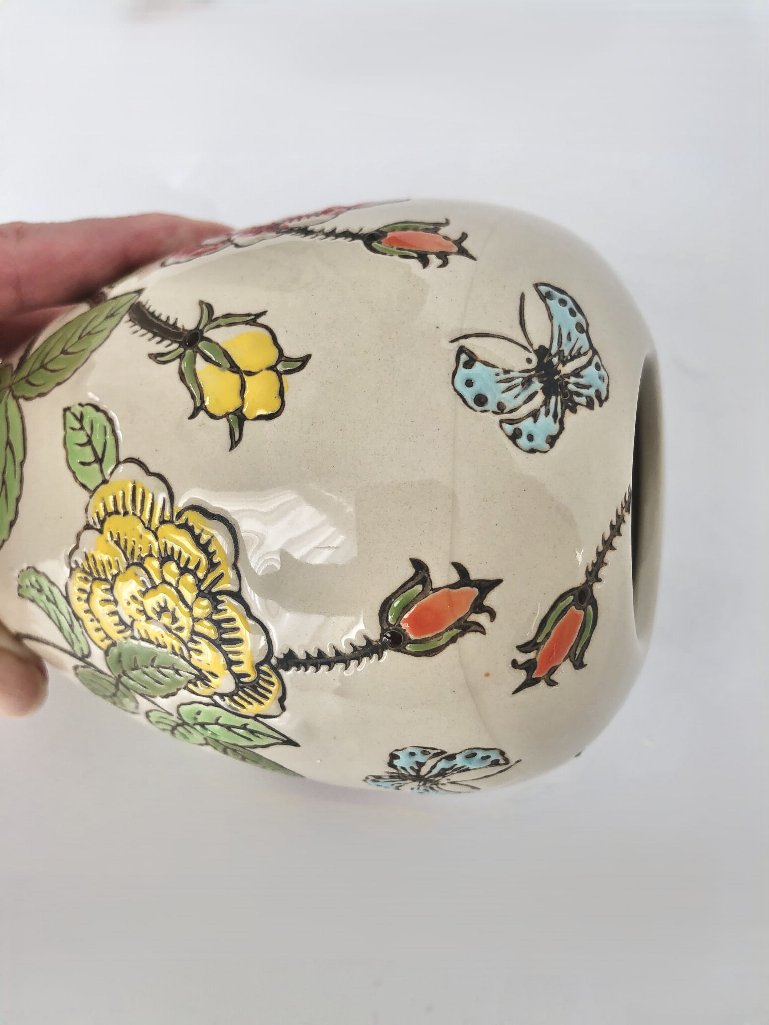 Wazon ceramiczny ręcznie malowany i szkliwiony w stylu vintage – kremowy z motywem kwiatów i motyli.