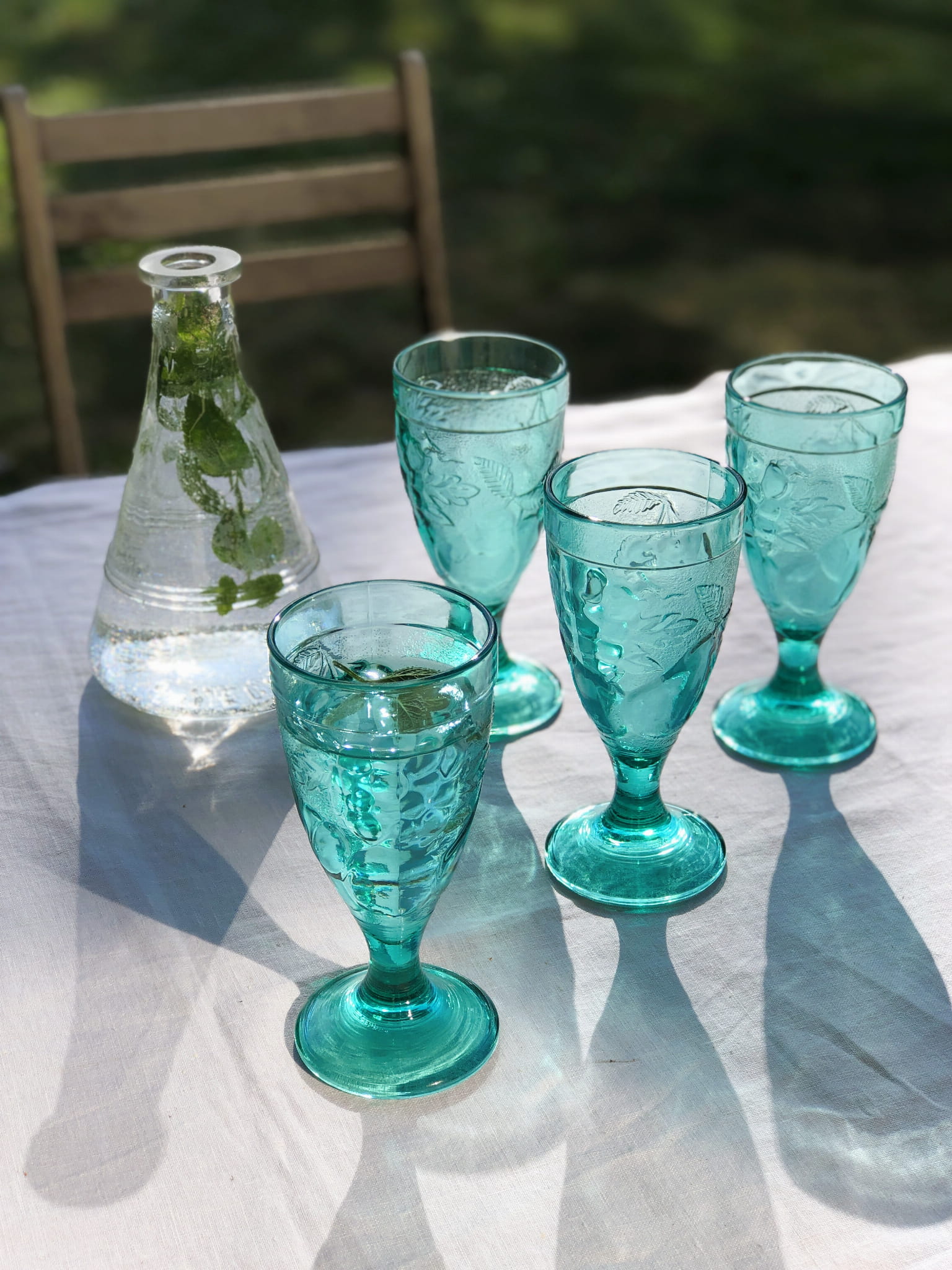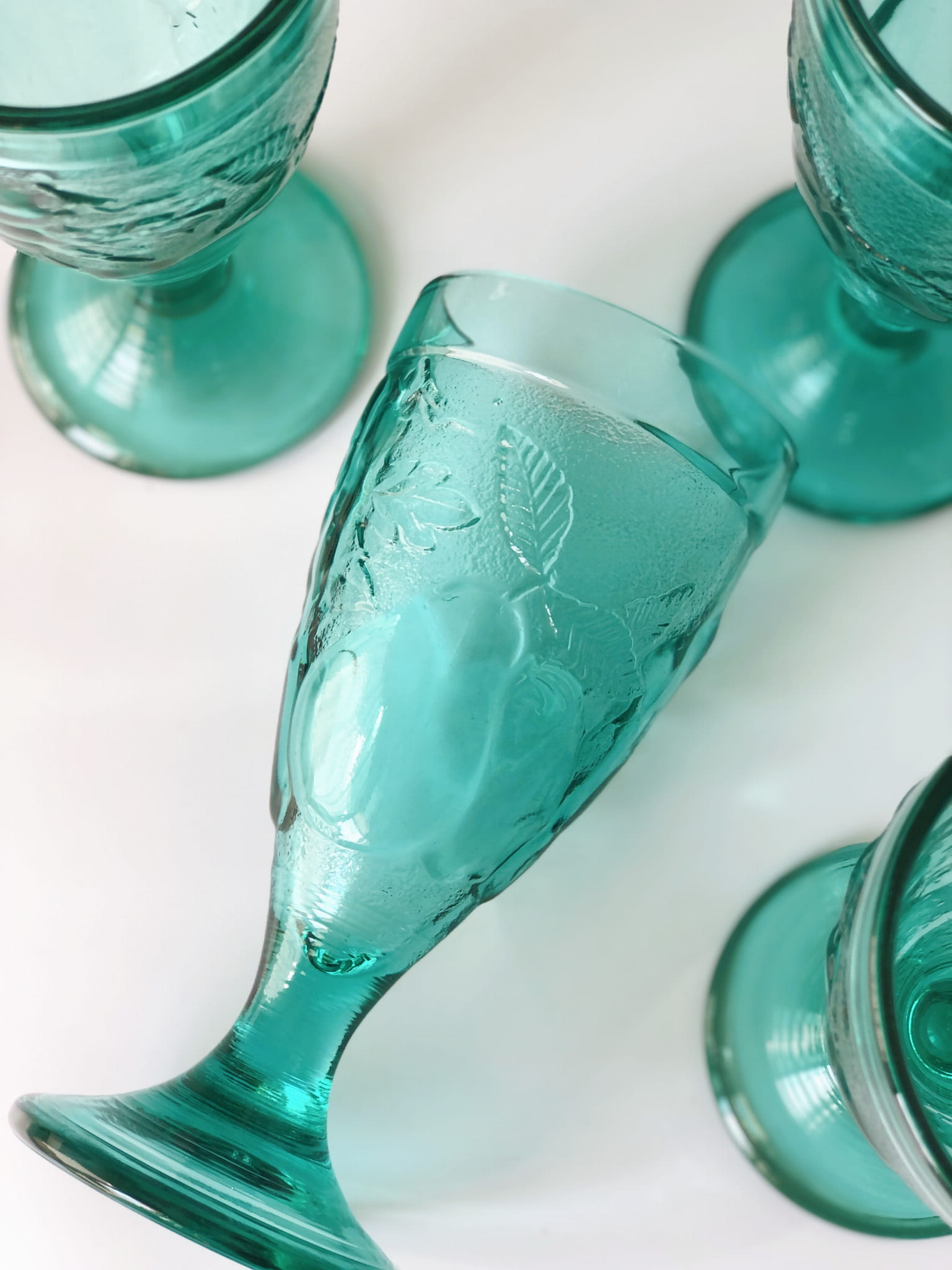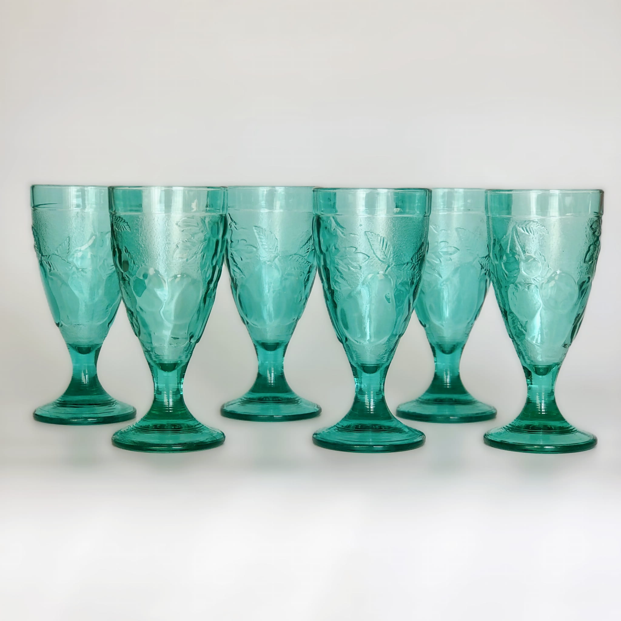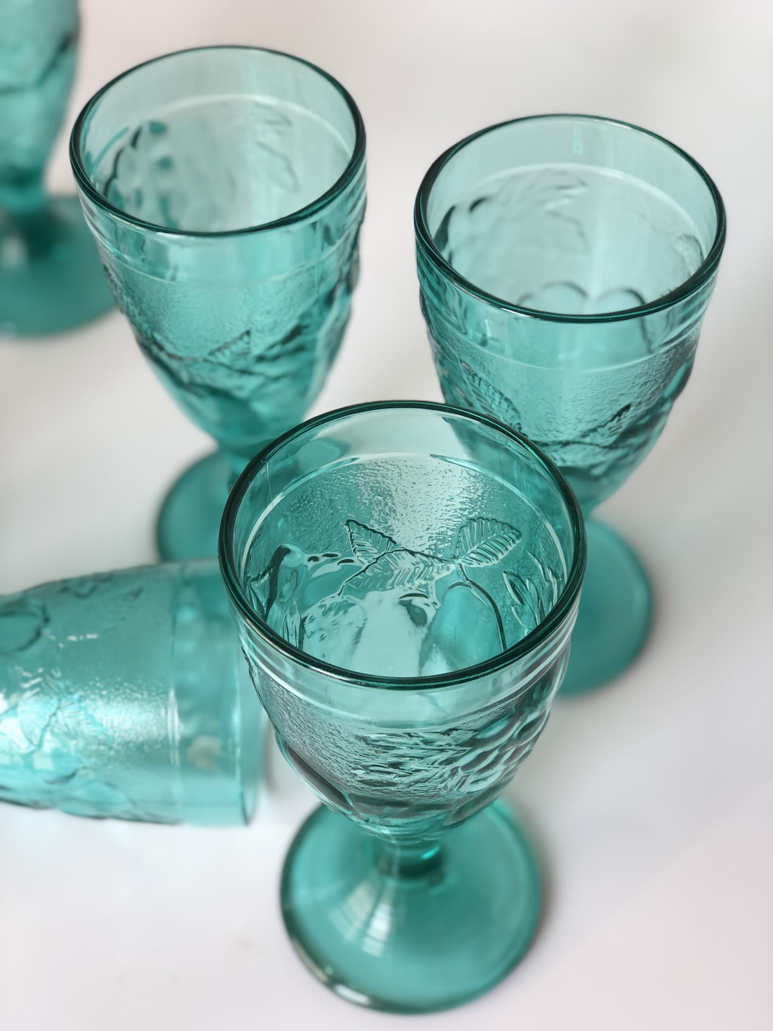 Kielichy wykonane we Francji w latach 70, z grubszego, turkusowego szkła w tłoczone owoce.