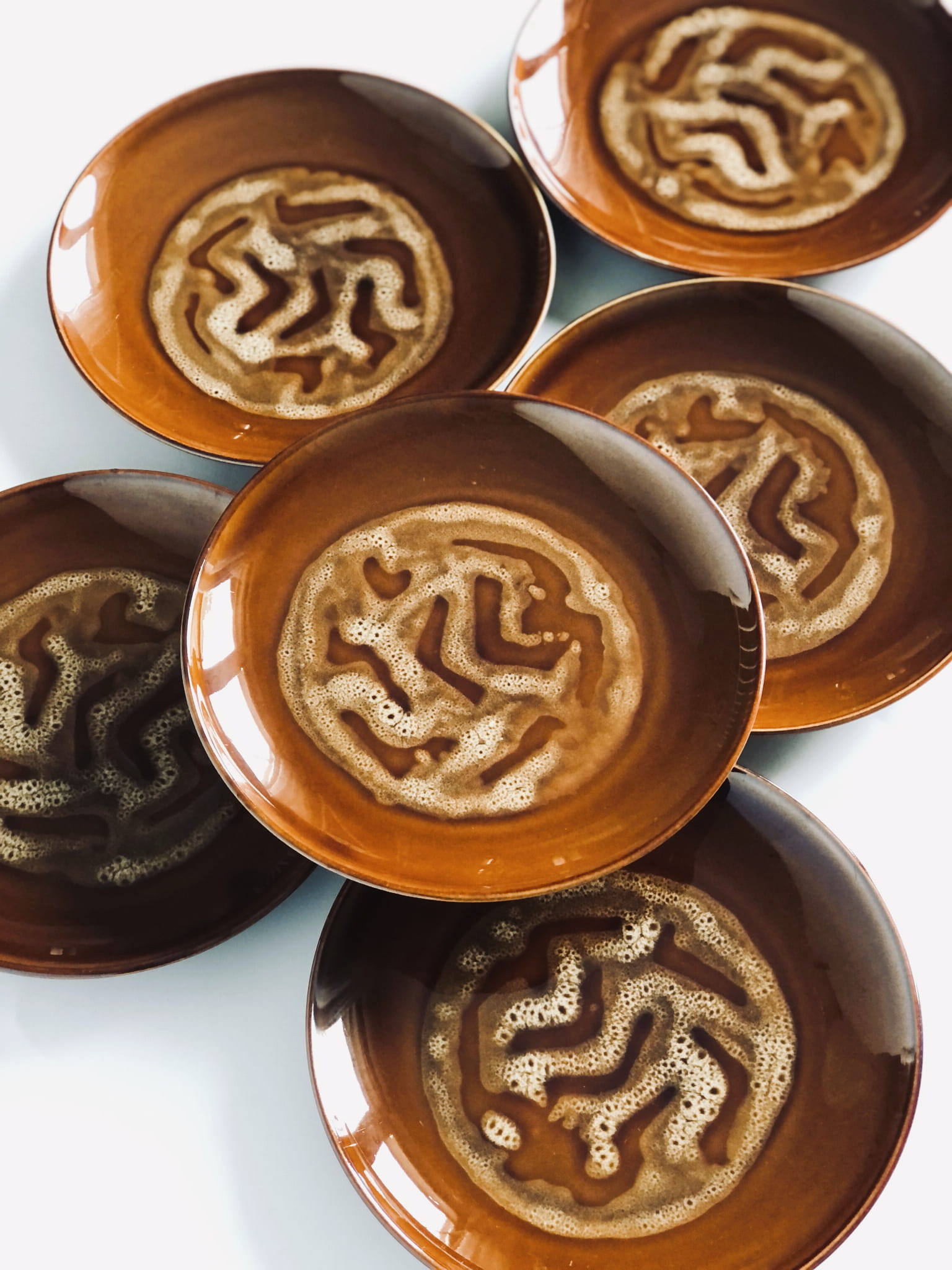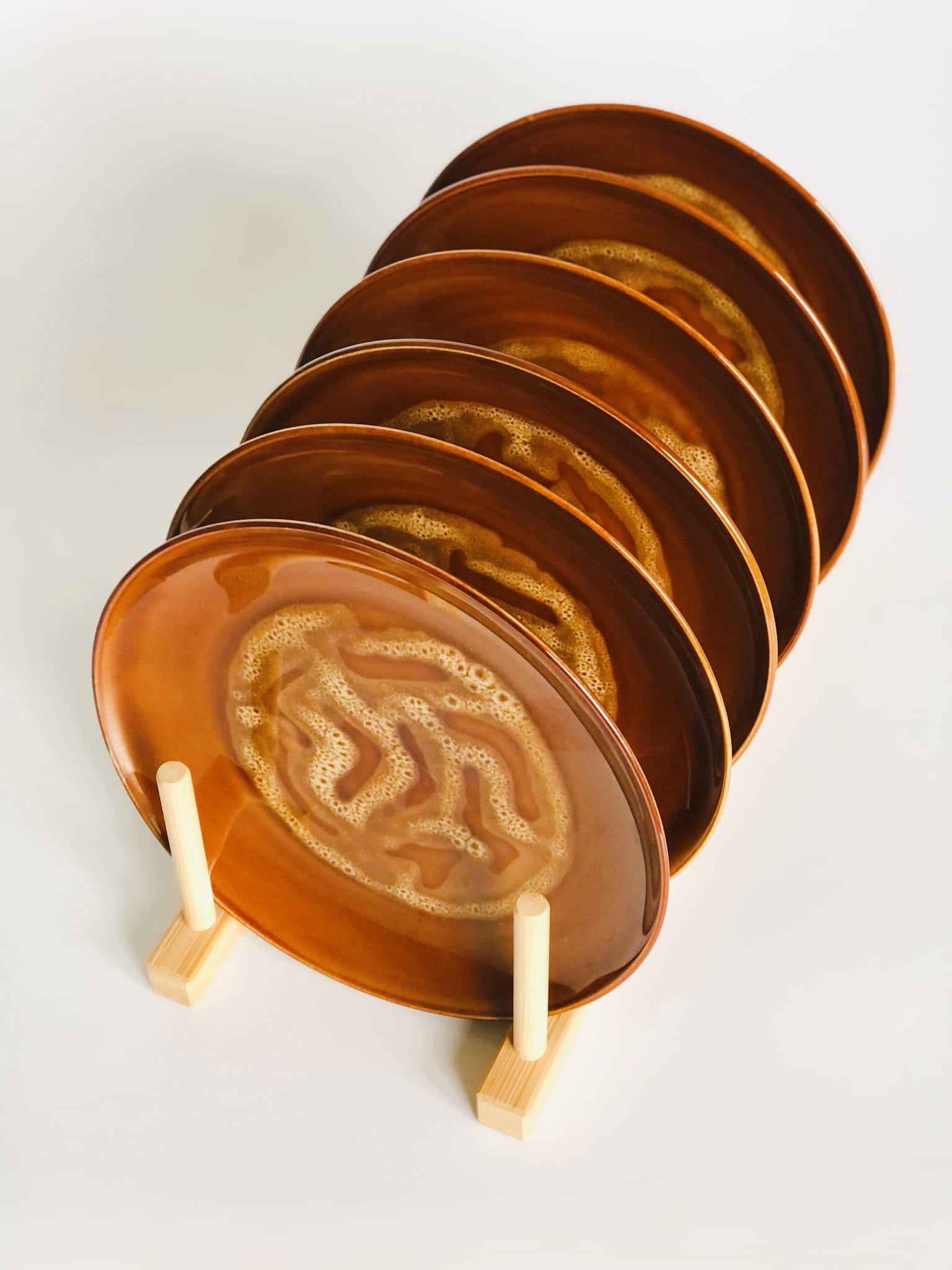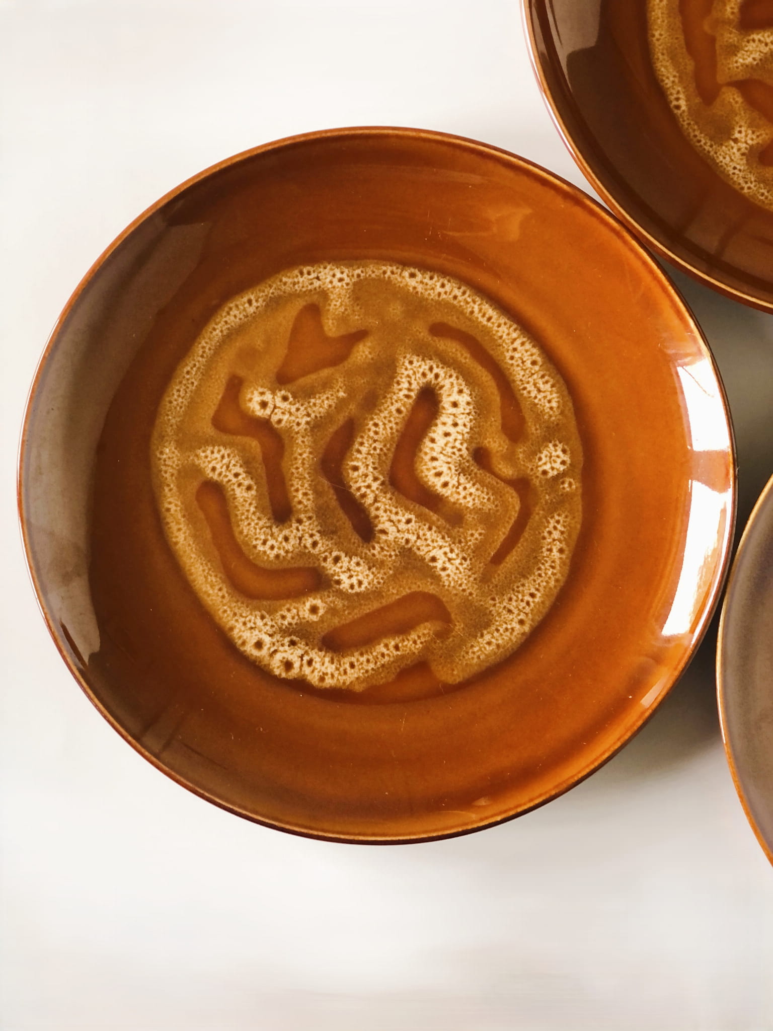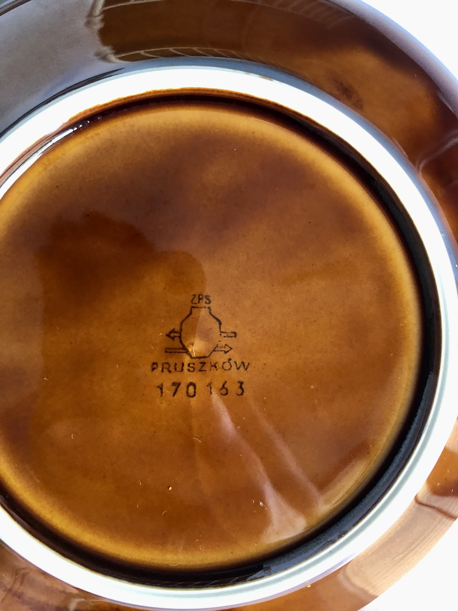 Talerze w bardzo oryginalnym szkliwieniu, tzw pikasiaki - ciepłe odcienie brązu z jasnymi abstrakcyjnymi smugami.