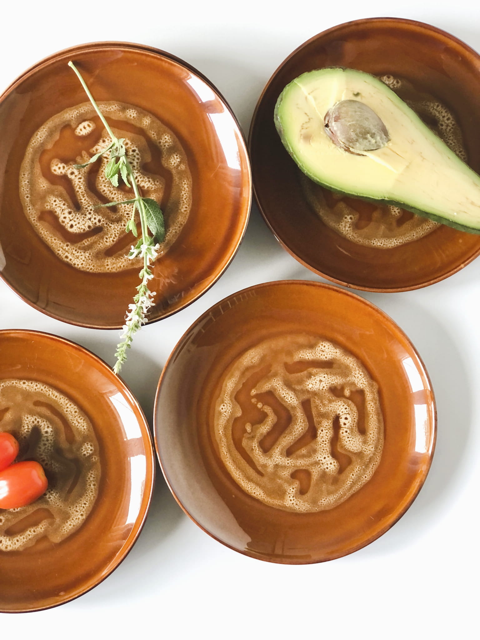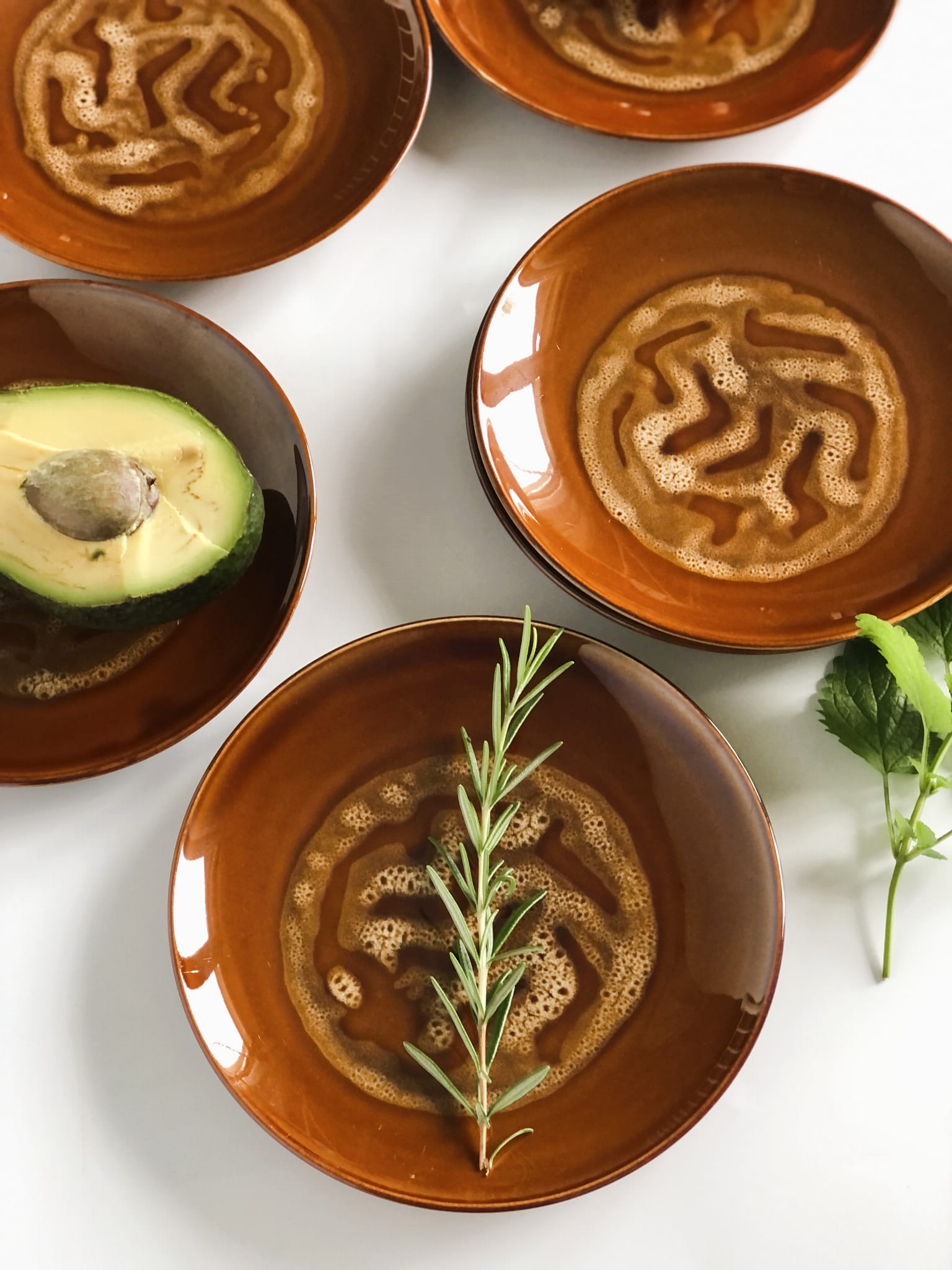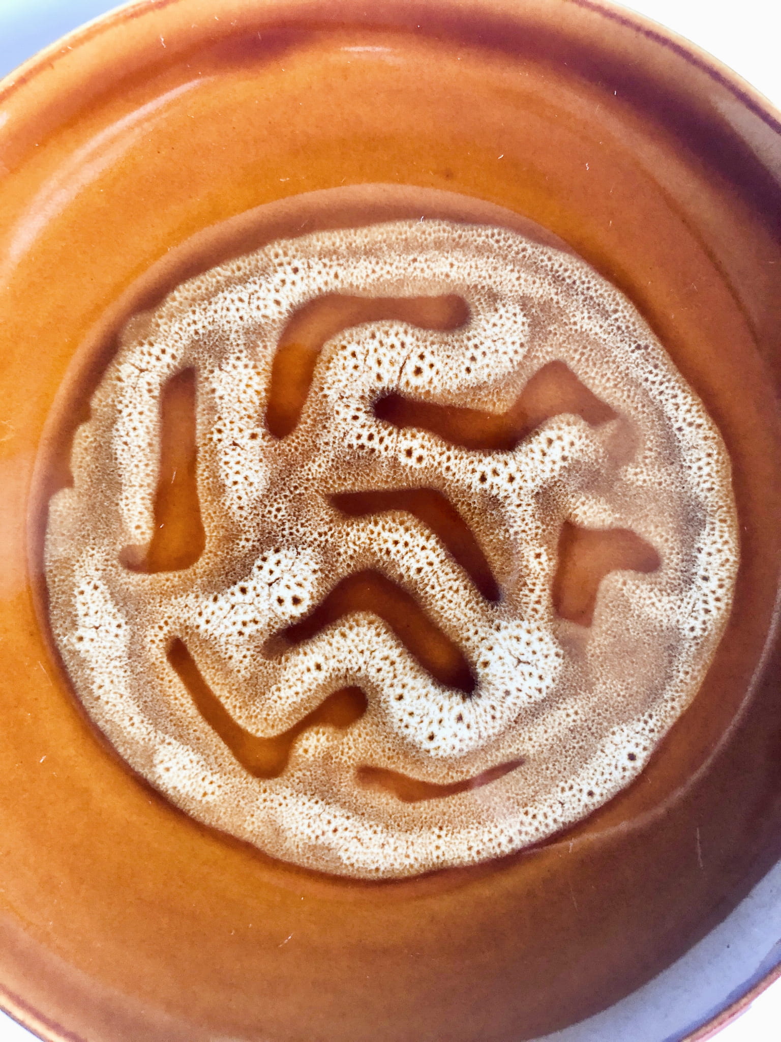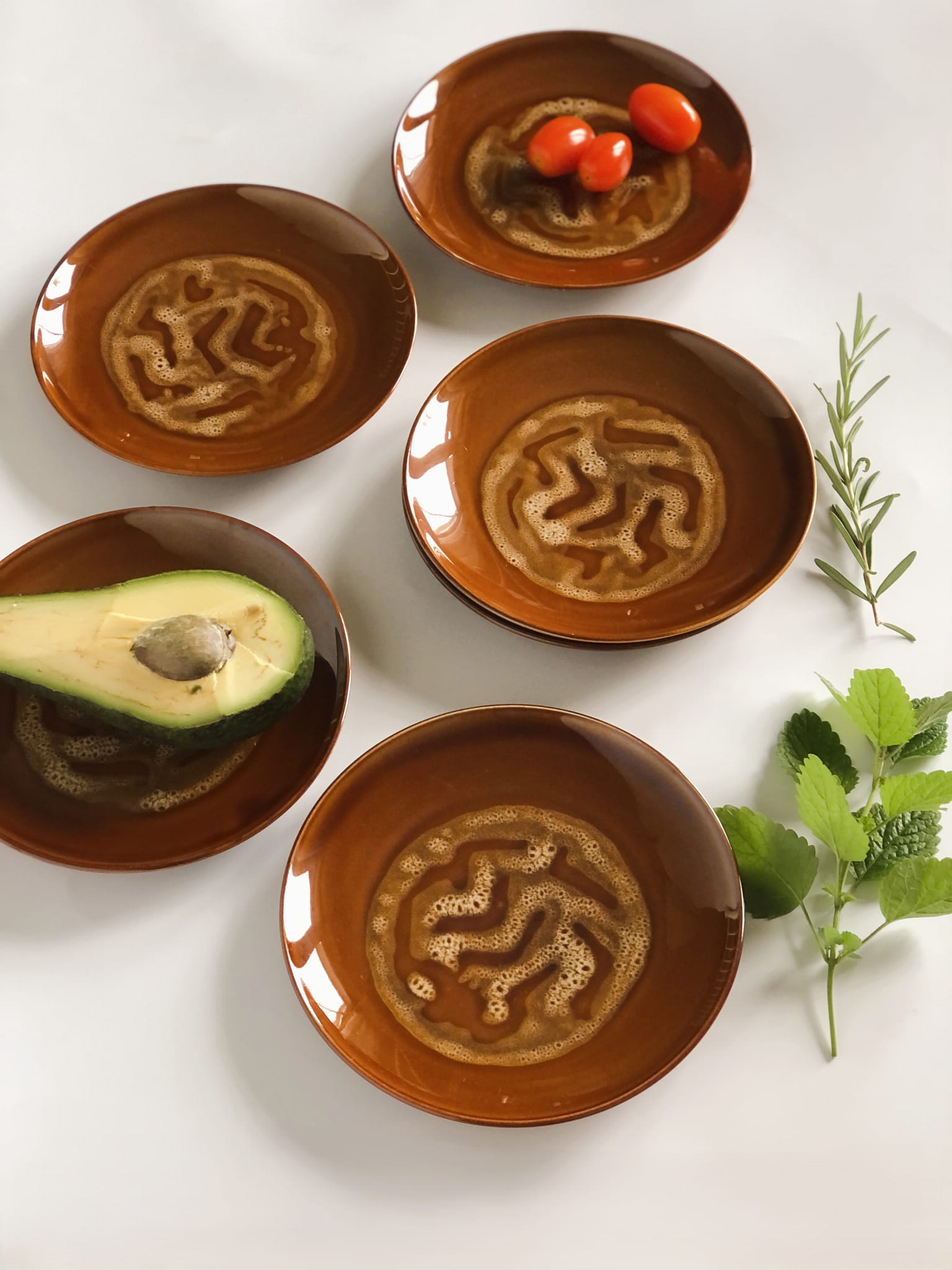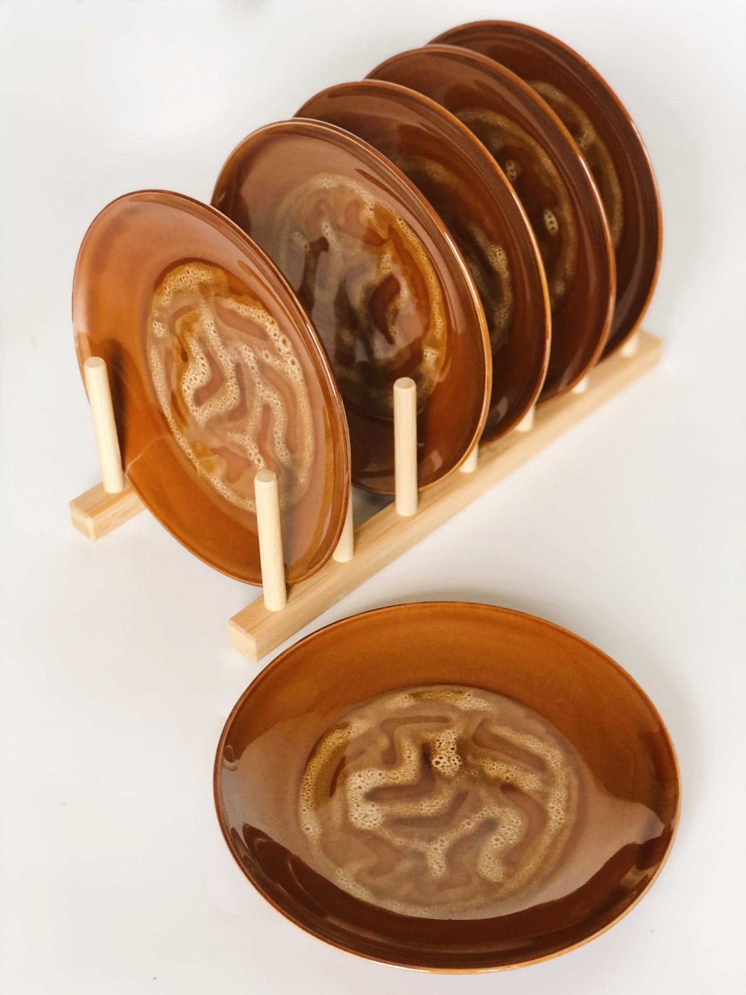 Talerze w bardzo oryginalnym szkliwieniu, tzw pikasiaki - ciepłe odcienie brązu z jasnymi abstrakcyjnymi smugami.