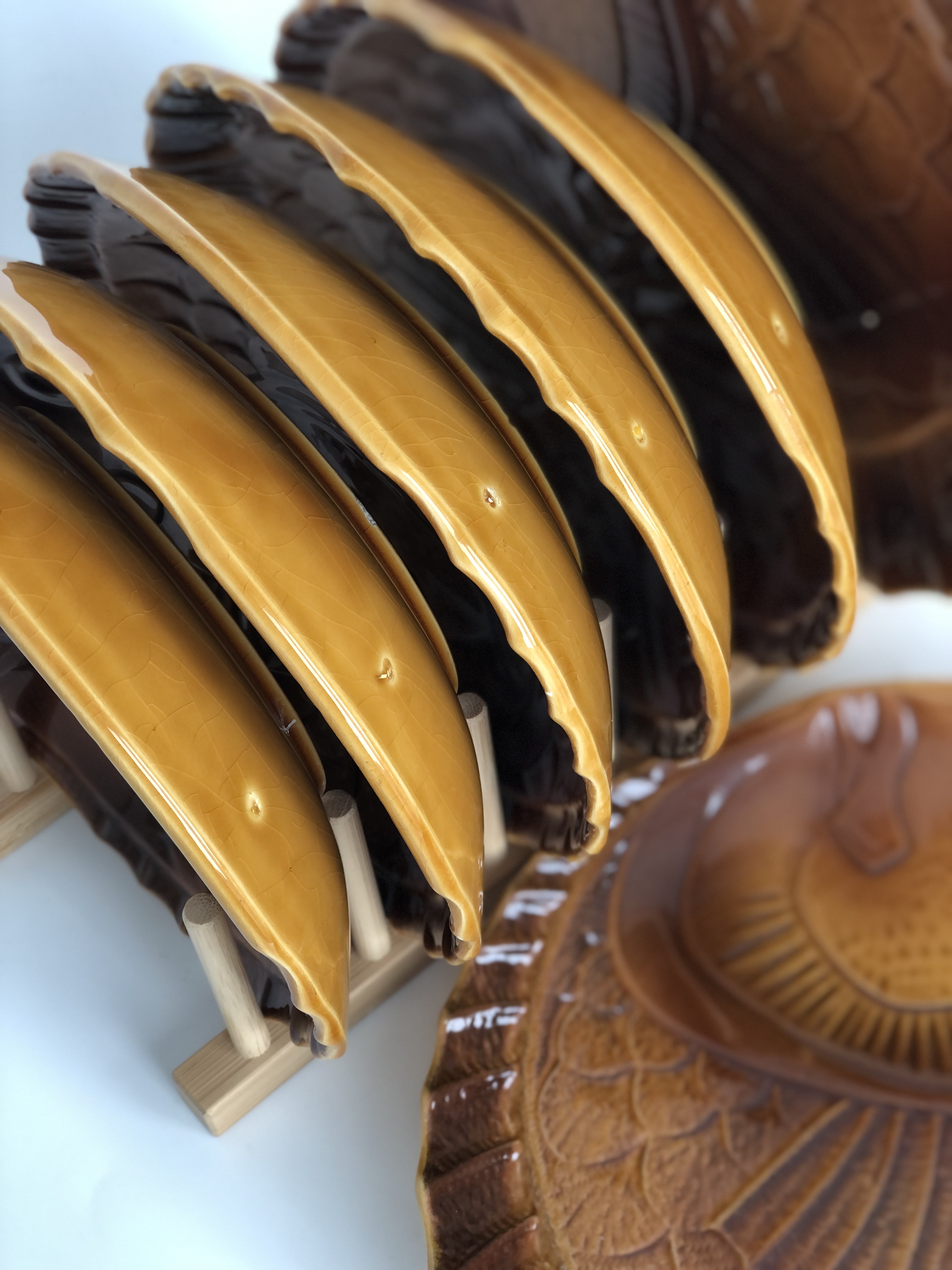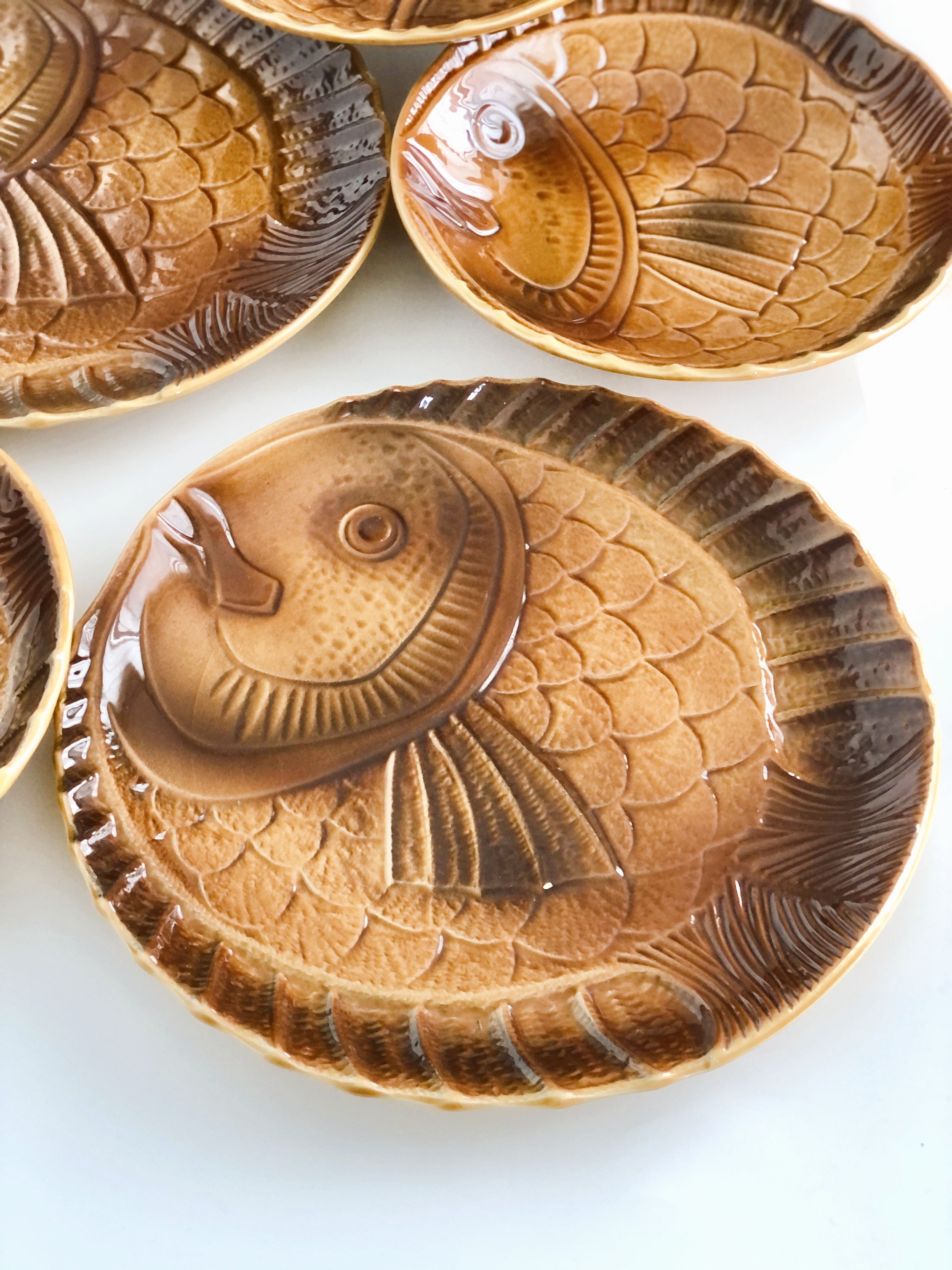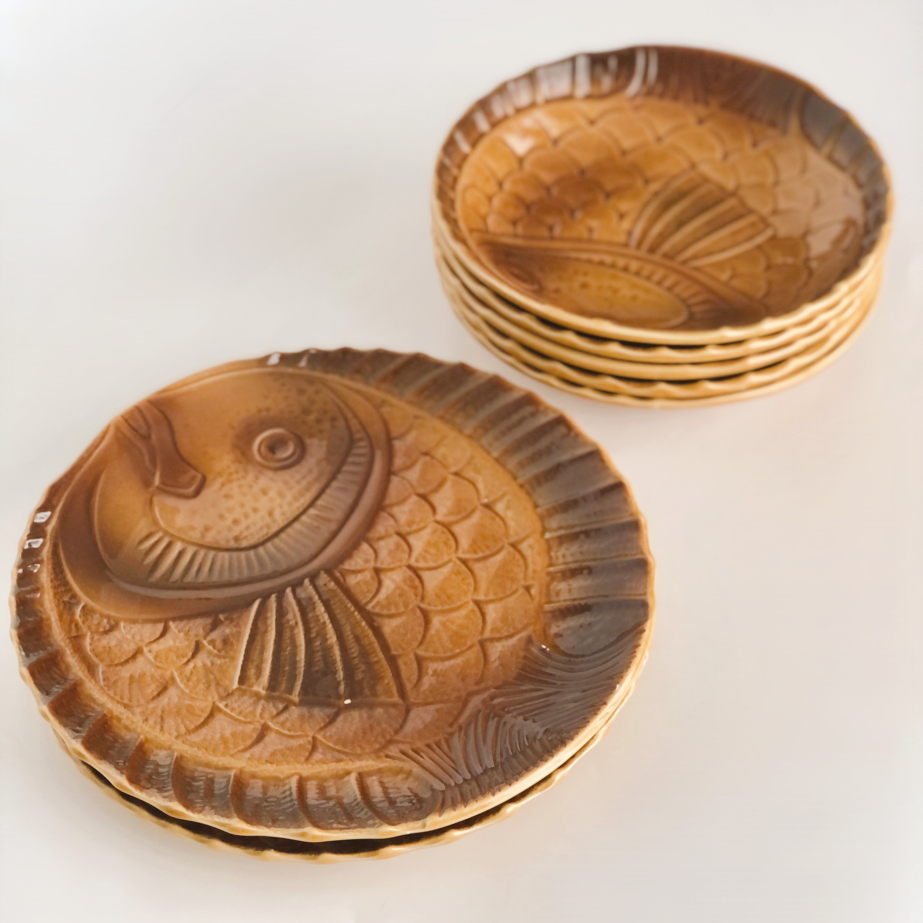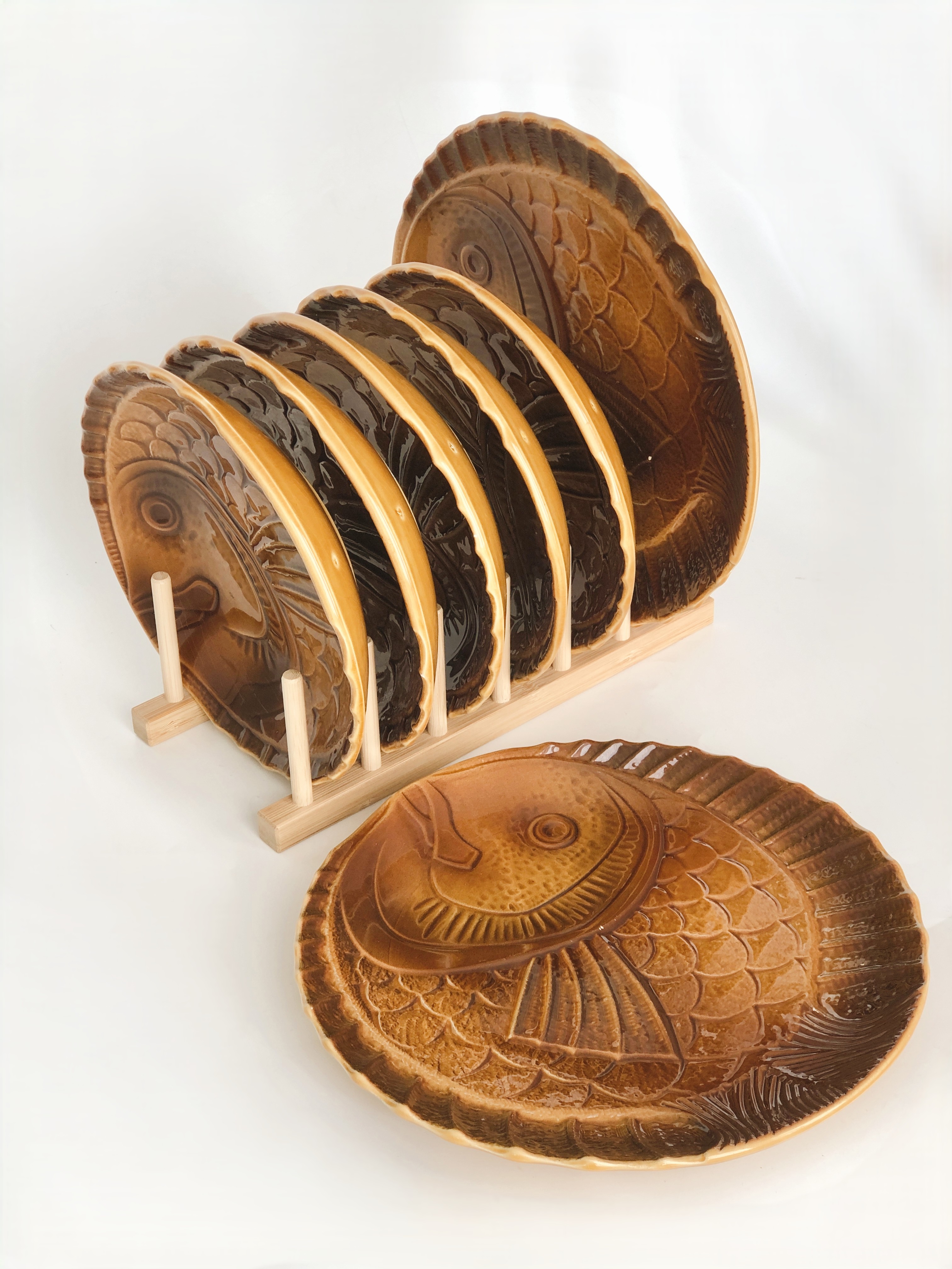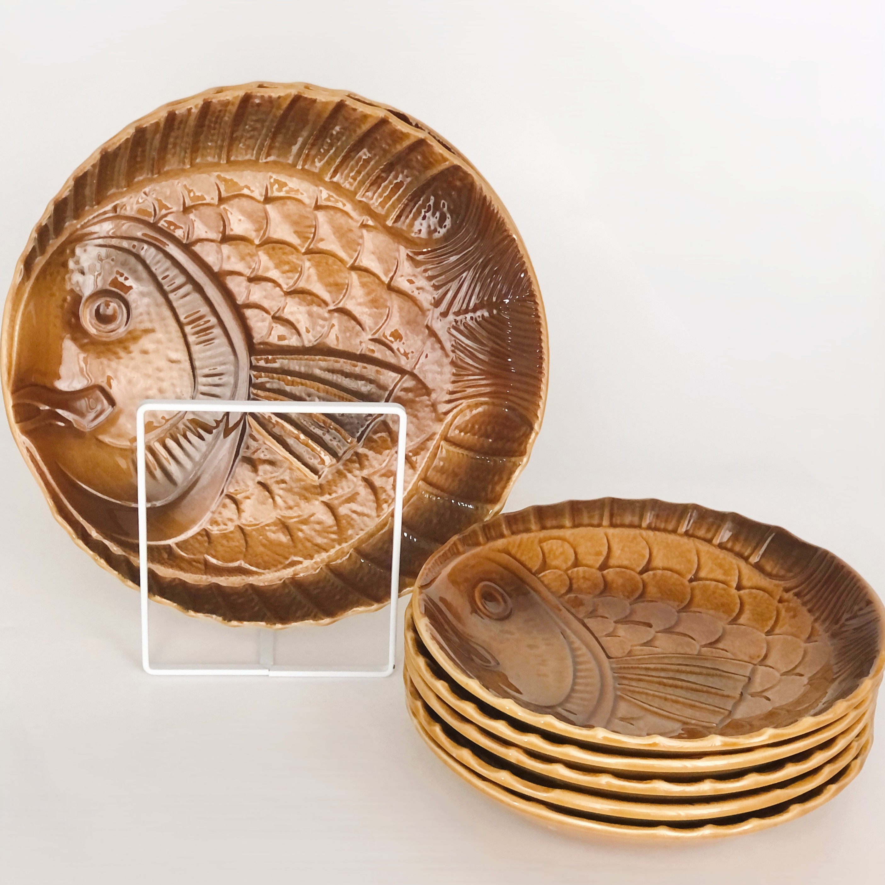 Ten ręcznie szkliwiony zestaw w odcieniach żółtej ochry z karmelowym i bursztynowym szkliwieniem zawiera 5 okrągłych, głębszych talerzy z podniesionym rantem oraz dwie większe patery. Uroczy relief ryby wypełnia całą powierzchnię talerzy.