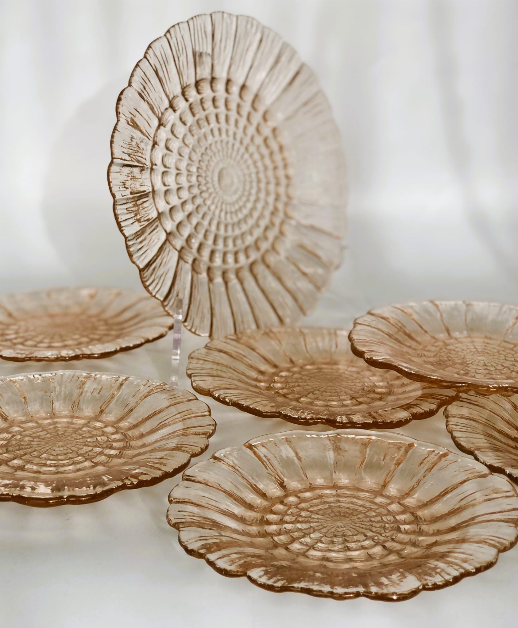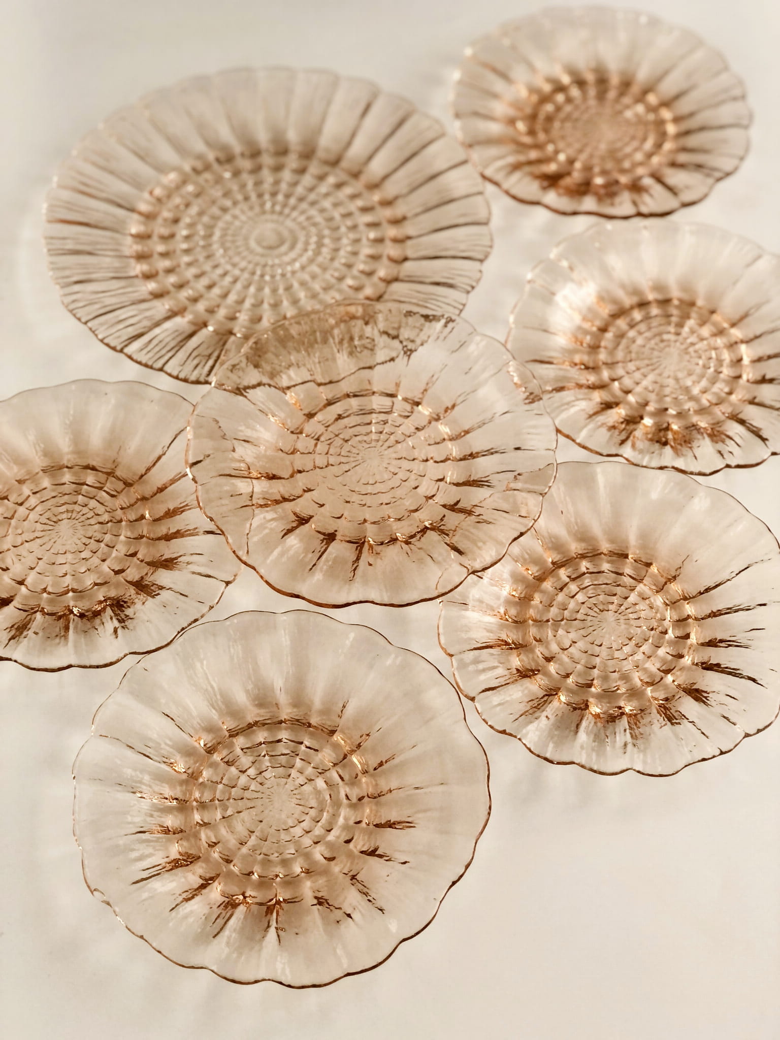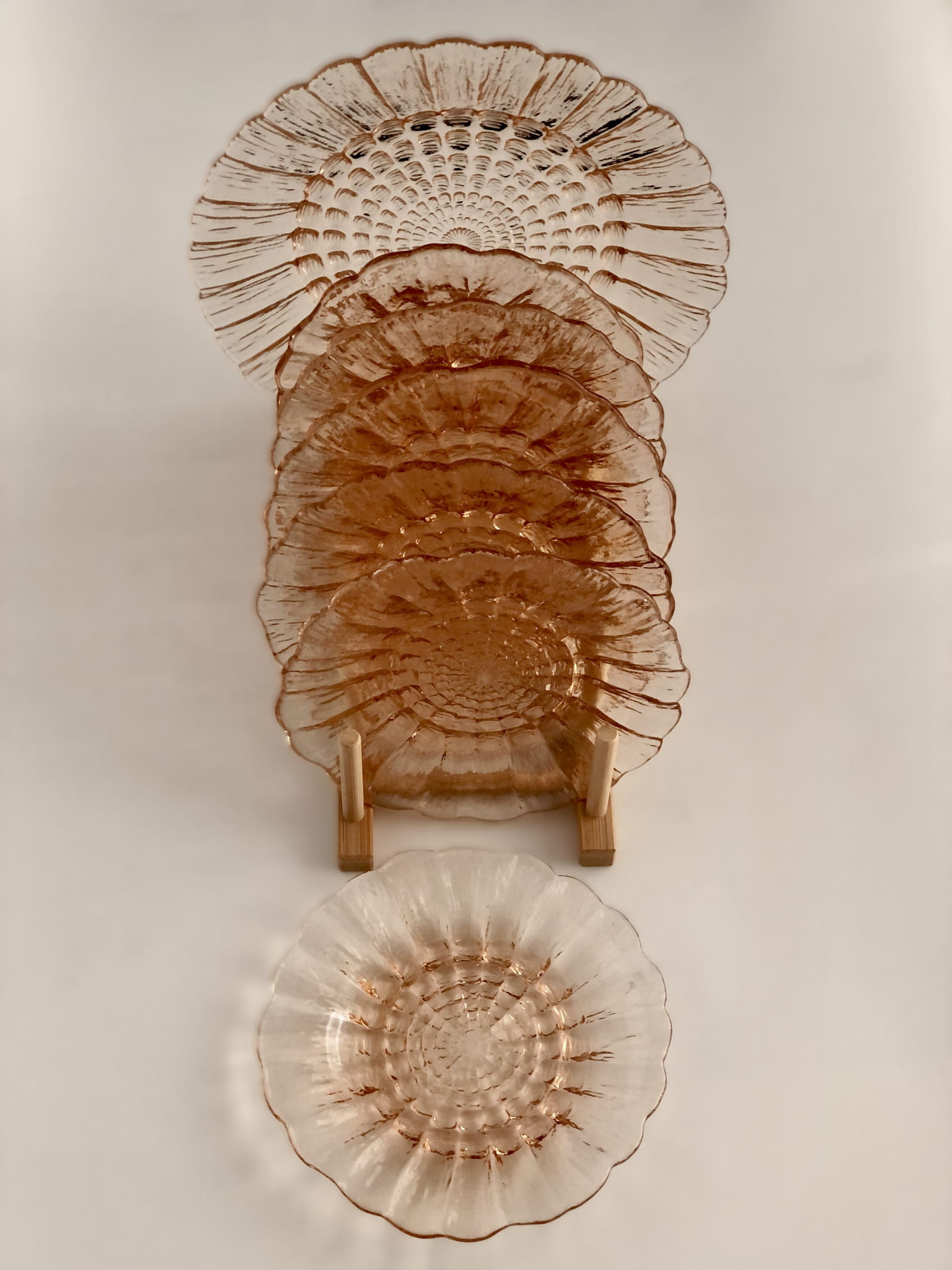 Przepiękny zestaw deserowy „Cora” patera i 6 talerzyków, Huta Ząbkowice. Kolor rozalinowy.
